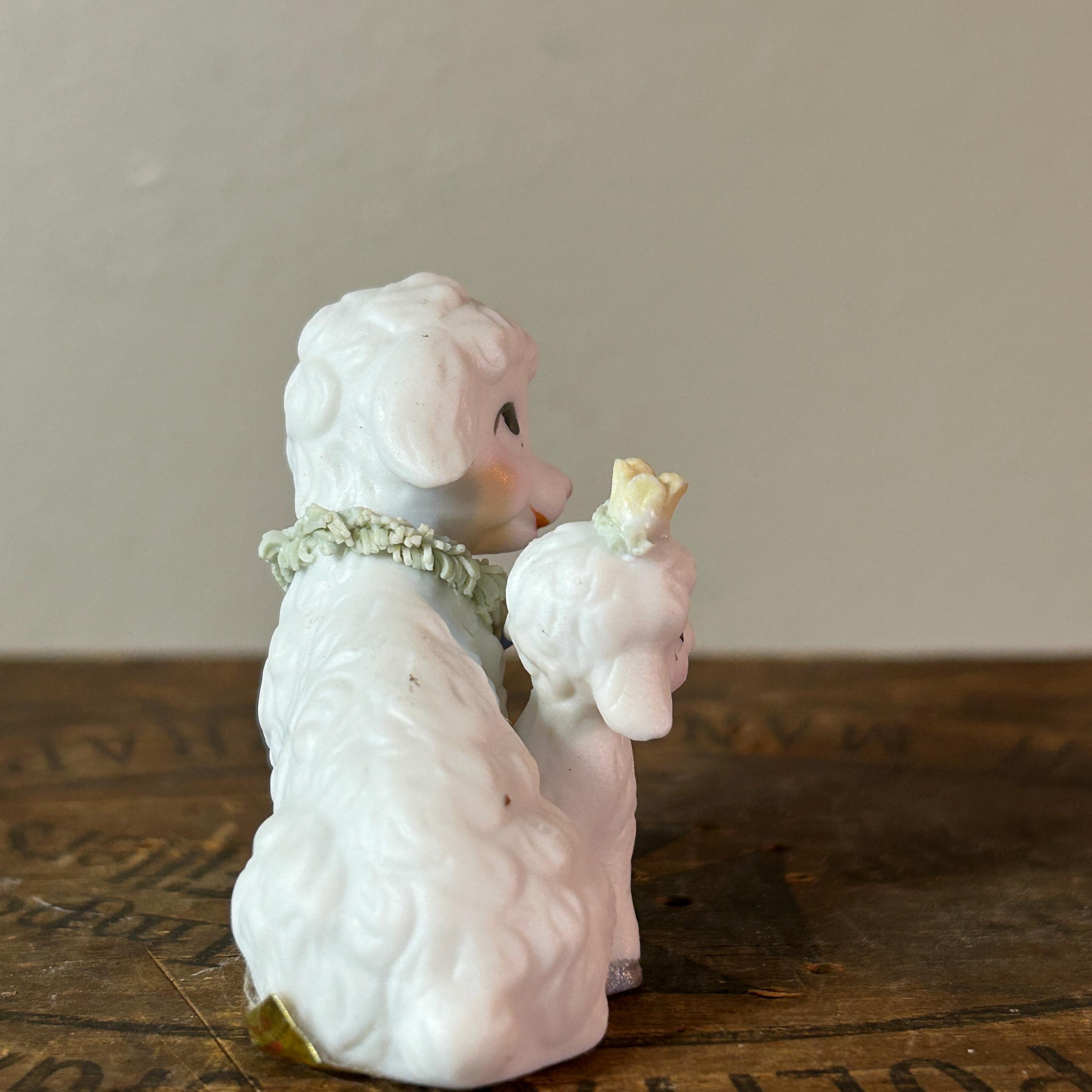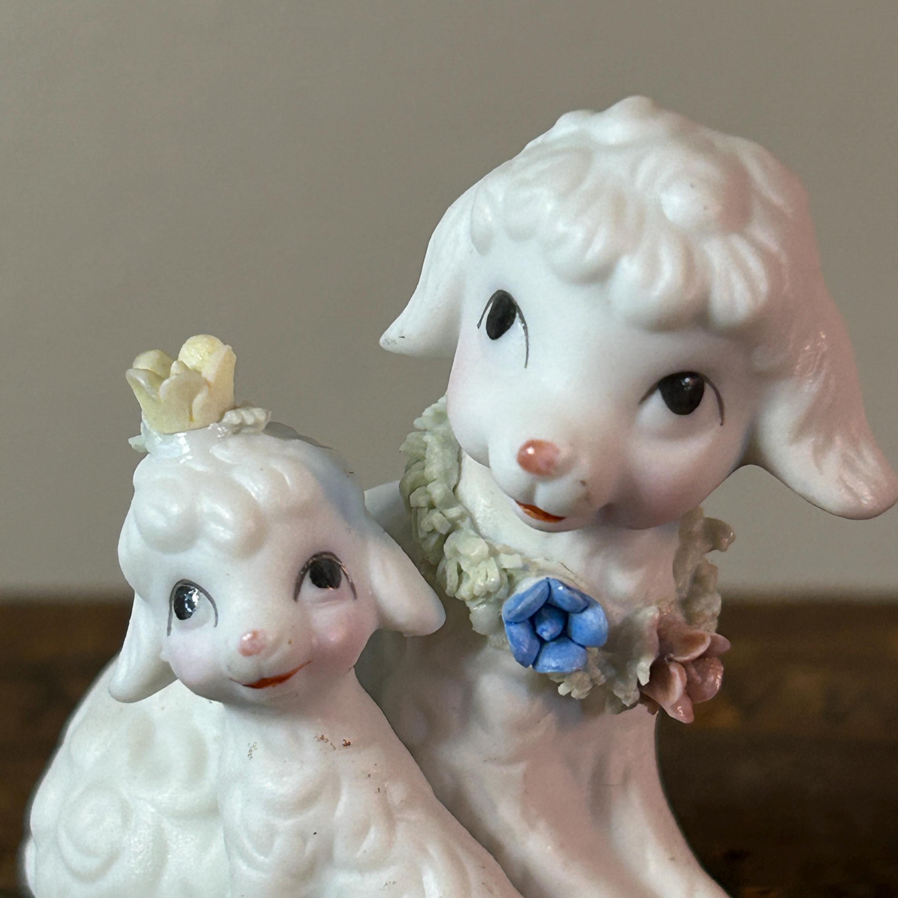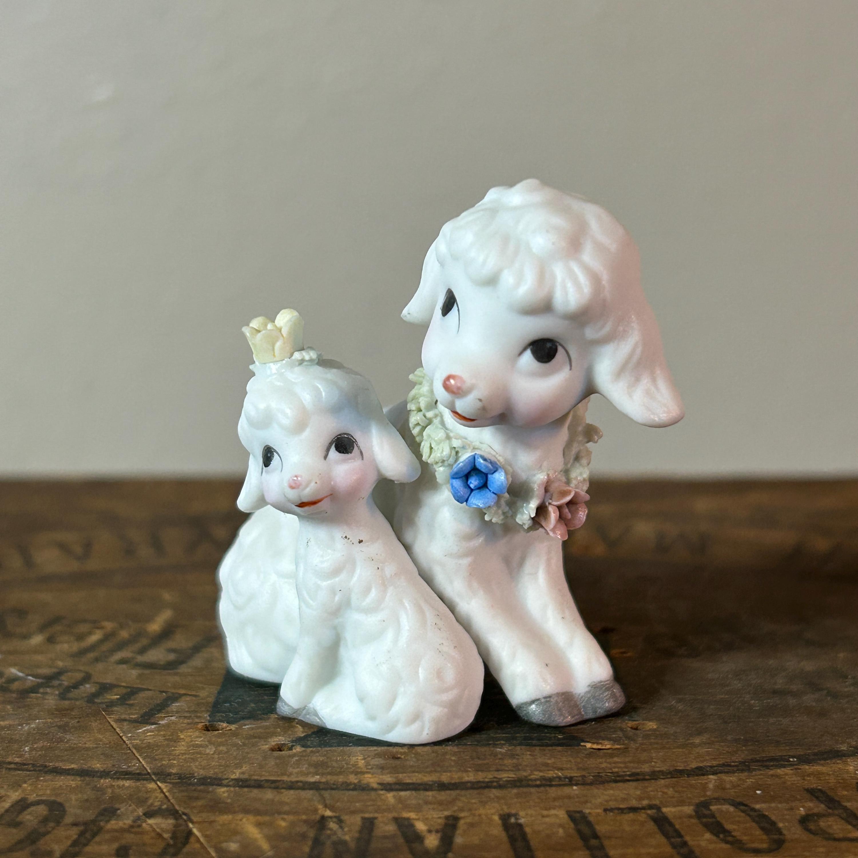 This adorable vintage Napco #9377 lamb pair is just precious. In matte bone china and excellent condition with no cracks or chips. Original Napco sticker still on bottom. Features Spring flowers around the neck and a crown of flowers on the little one's head. Perfect for your Easter decor, shadowbox, or printers drawer.