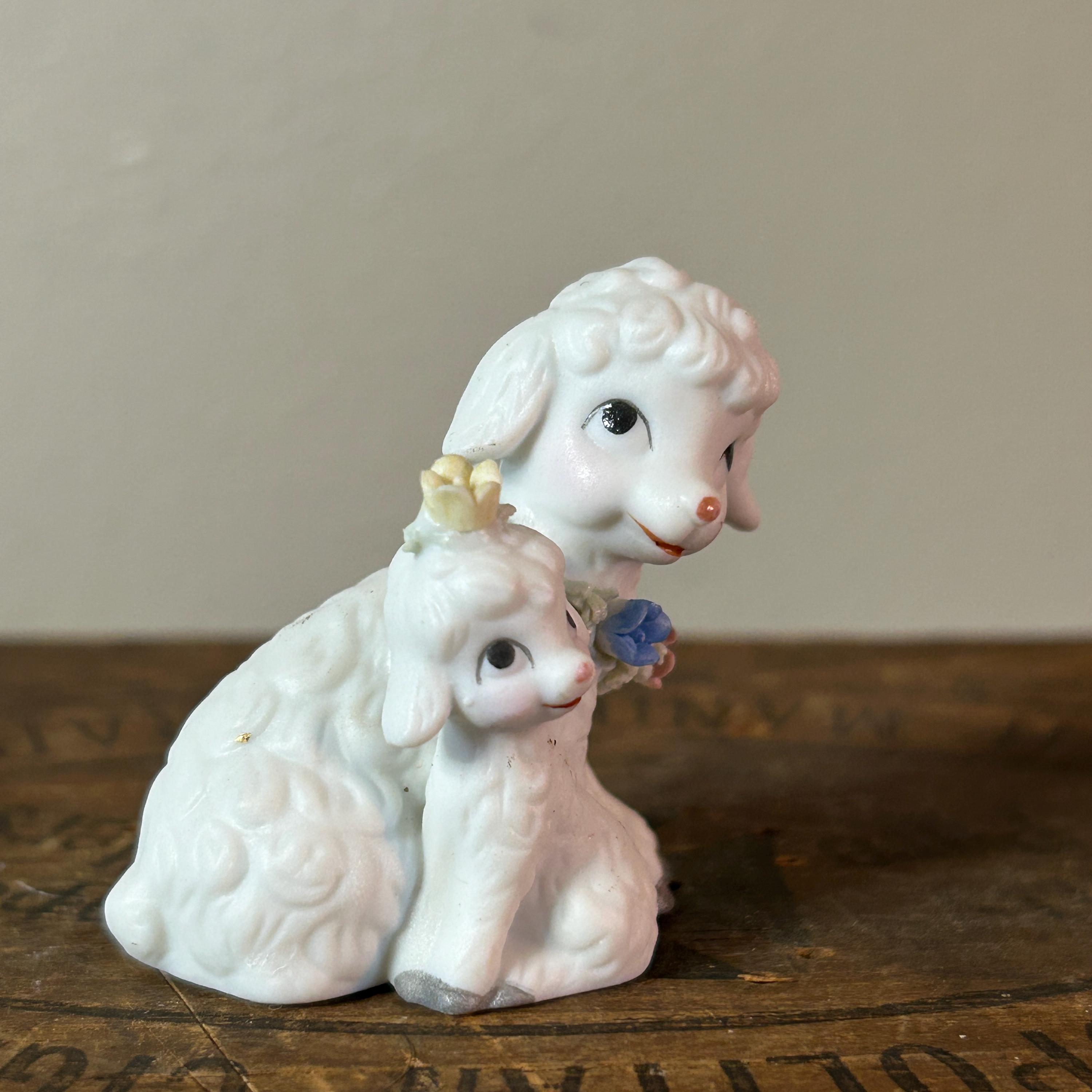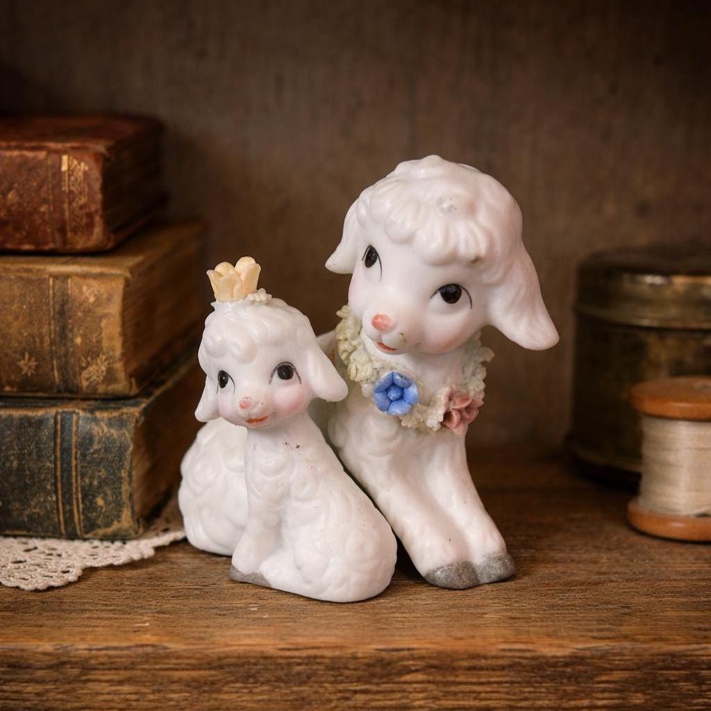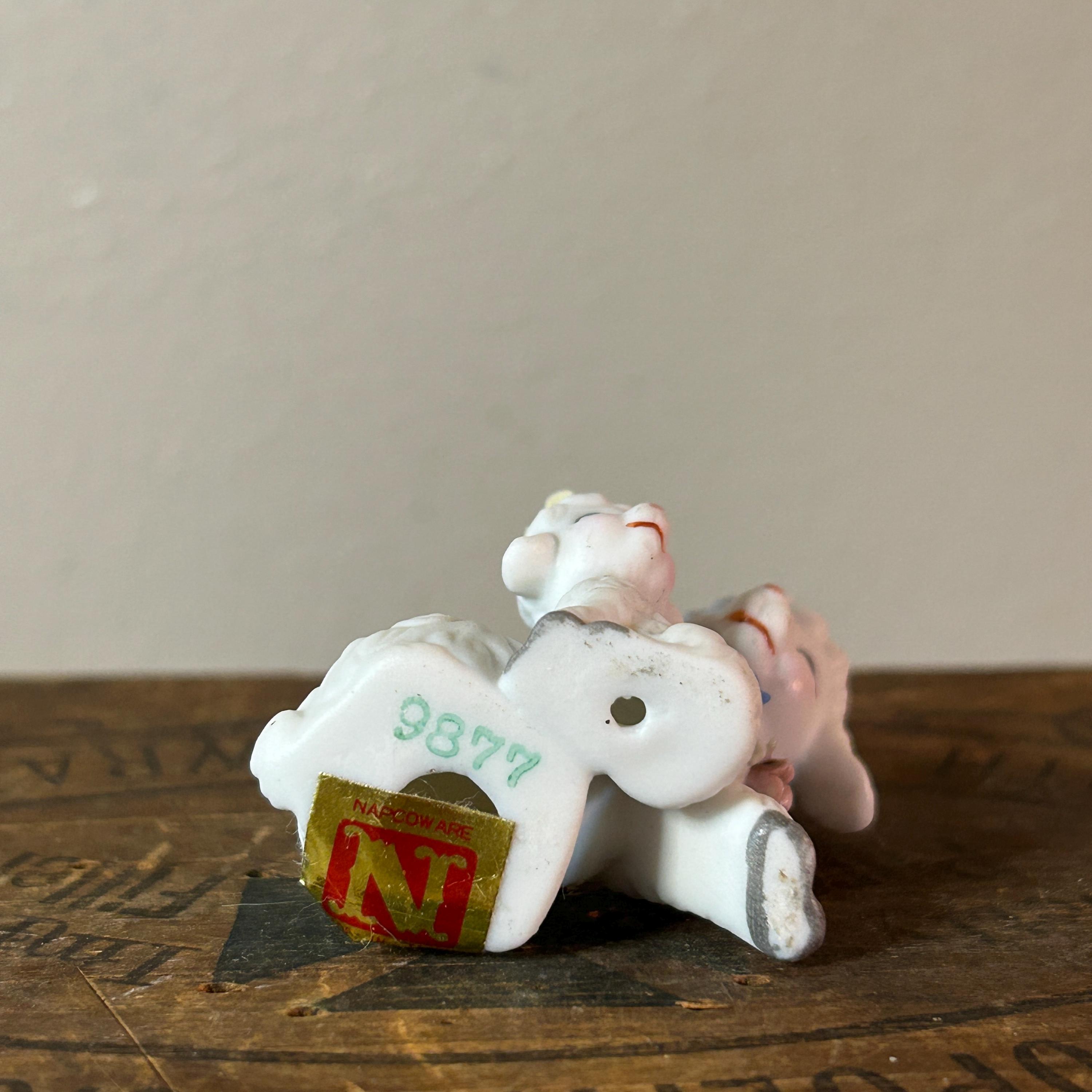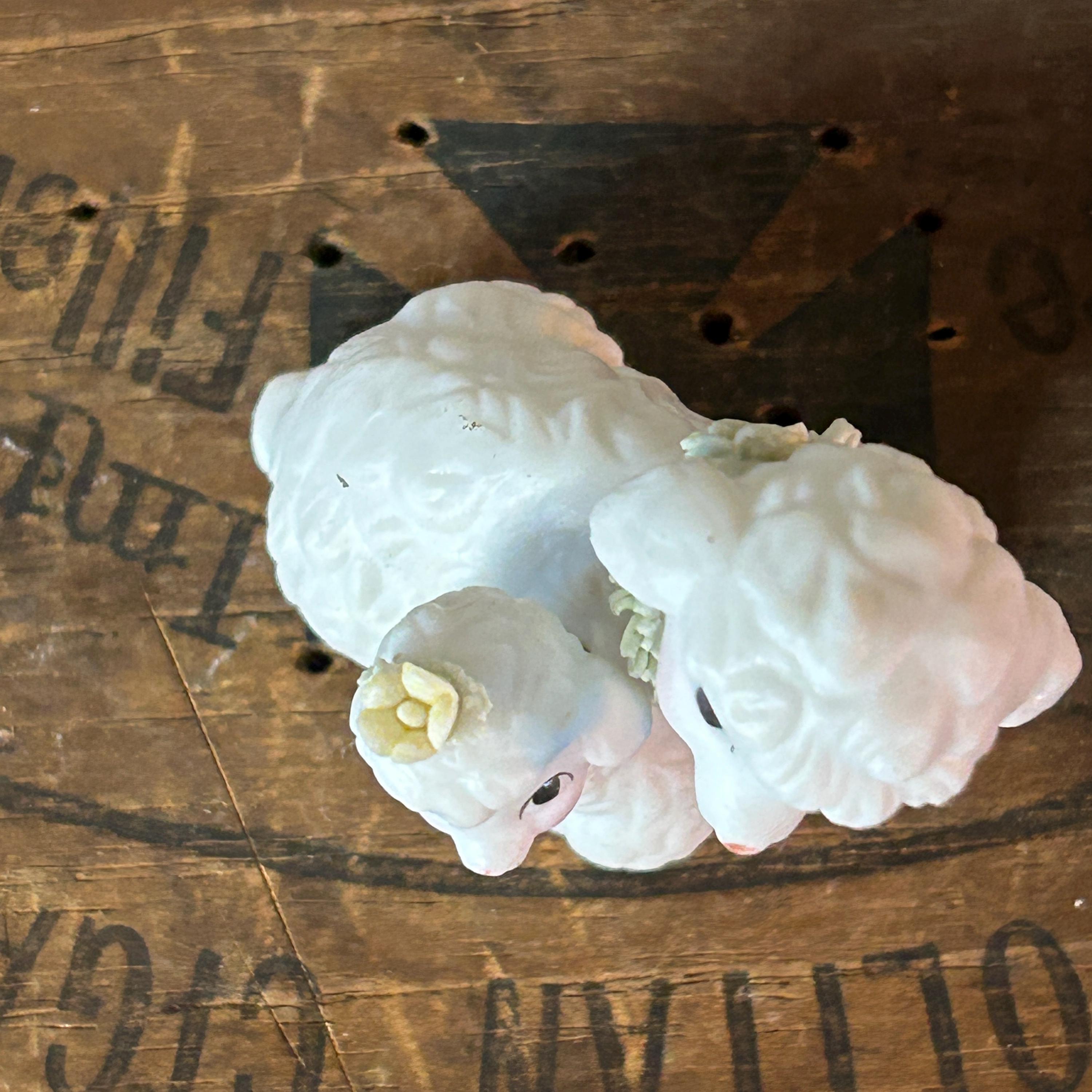 This adorable vintage Napco #9377 lamb pair is just precious. In matte bone china and excellent condition with no cracks or chips. Original Napco sticker still on bottom. Features Spring flowers around the neck and a crown of flowers on the little one's head. Perfect for your Easter decor, shadowbox, or printers drawer.
