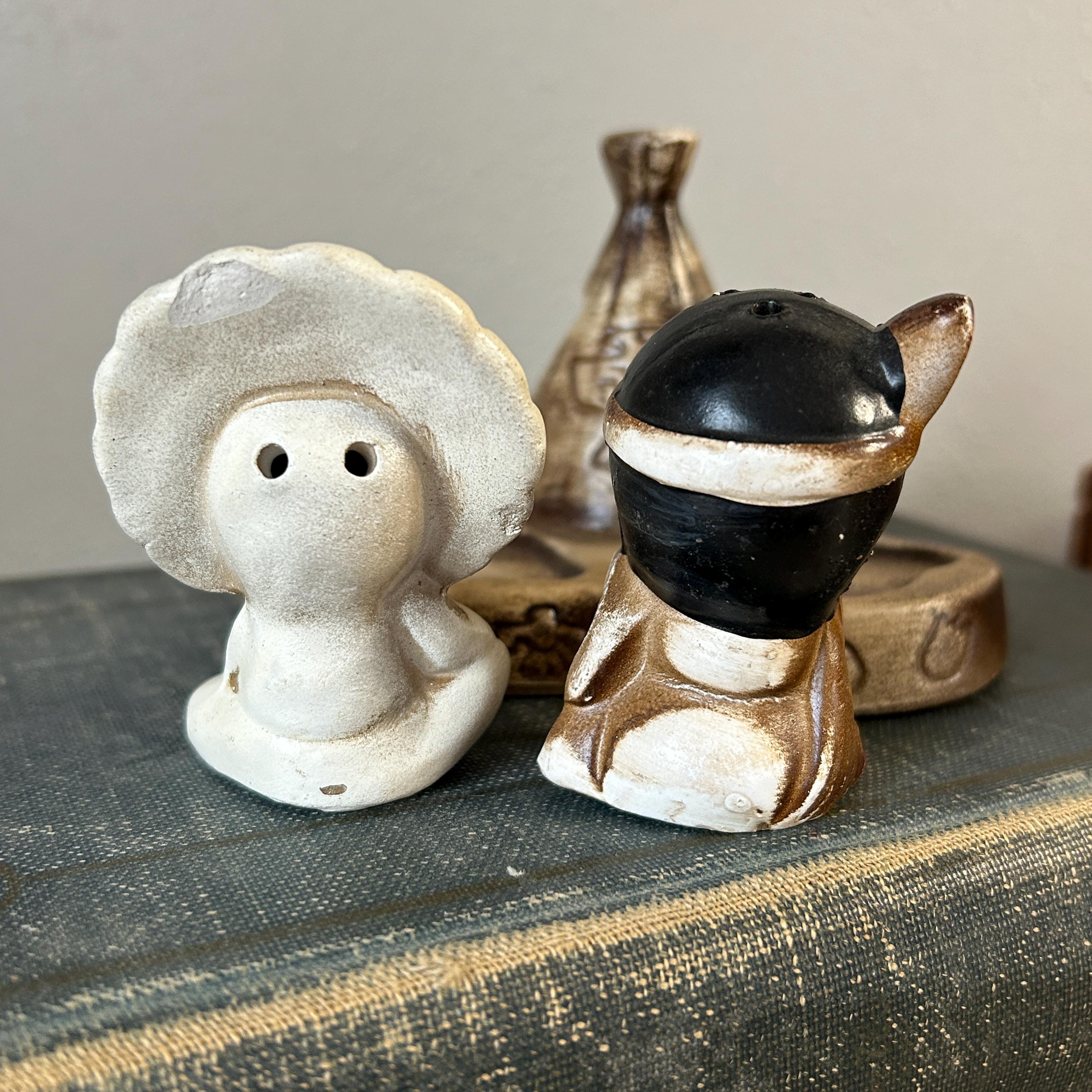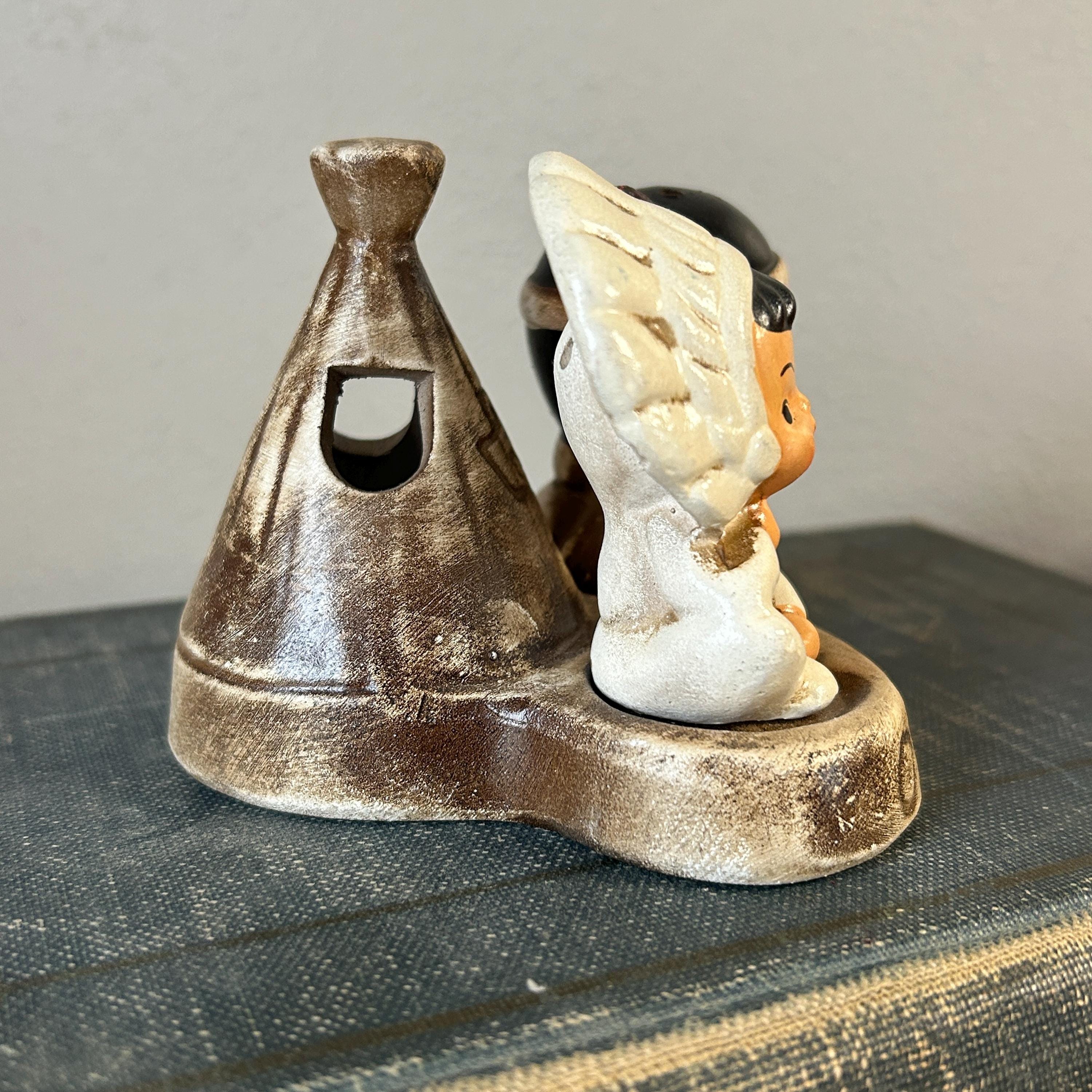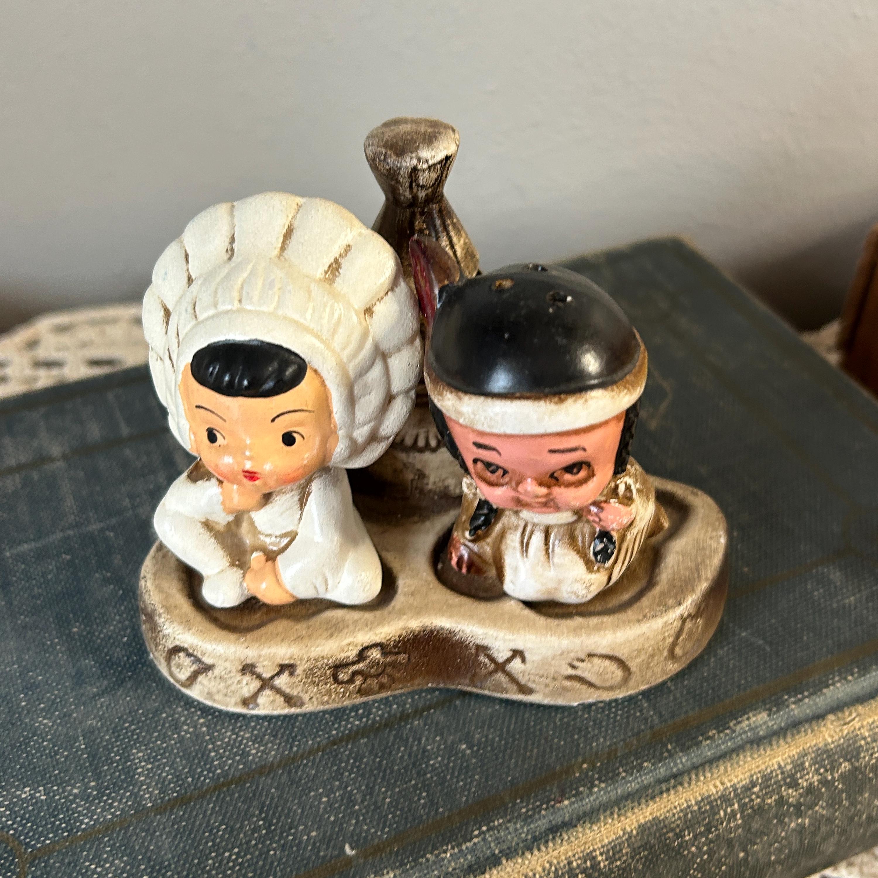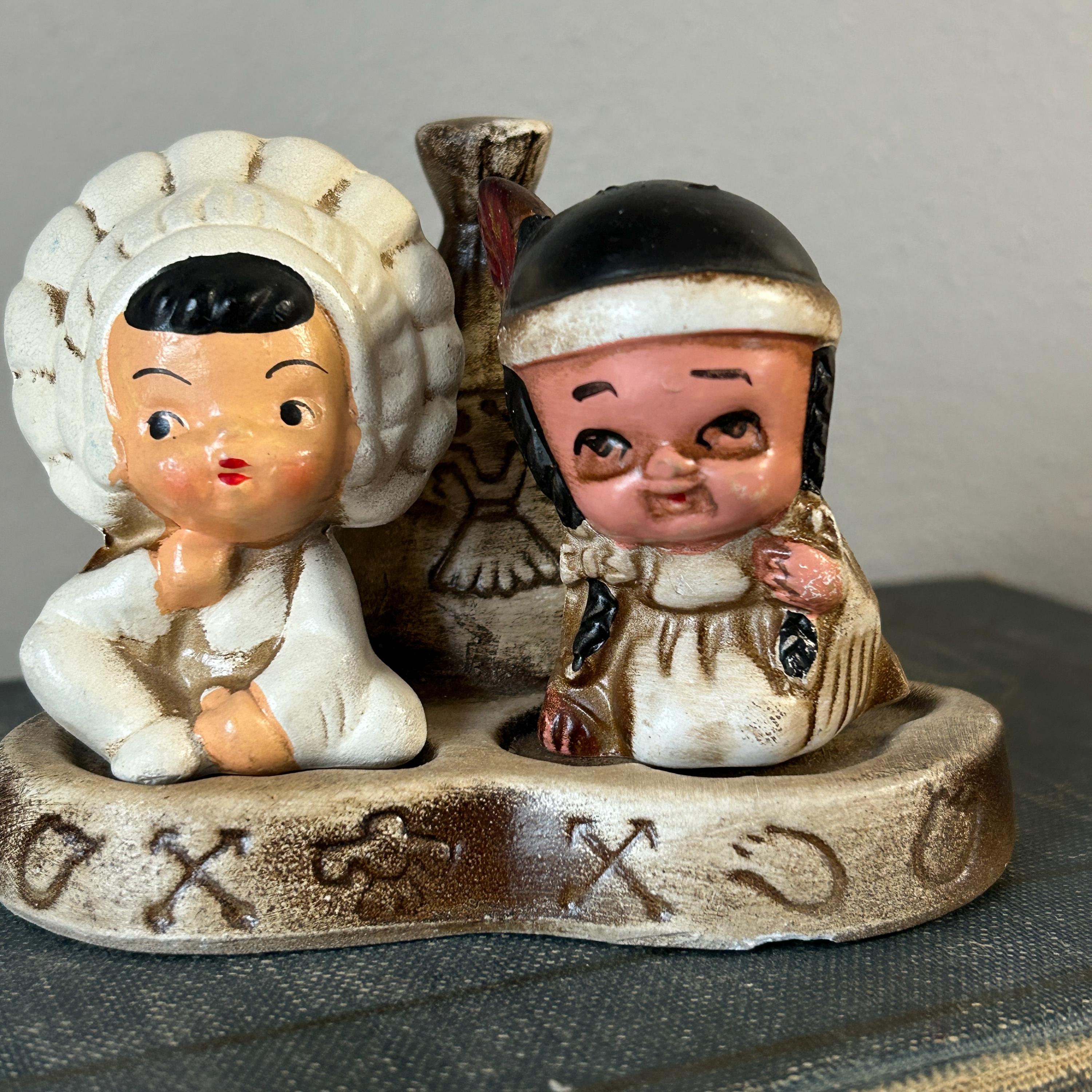 This adorable little pair sits on a teepee base with holes for toothpicks. In excellent condition with no chips or cracks. A small chip on bottom of base, but does not show when displaye.d A beautiful piece to add to your collection. 3 piece set. Measures 4 1/4" x 3 1/2" assembled.