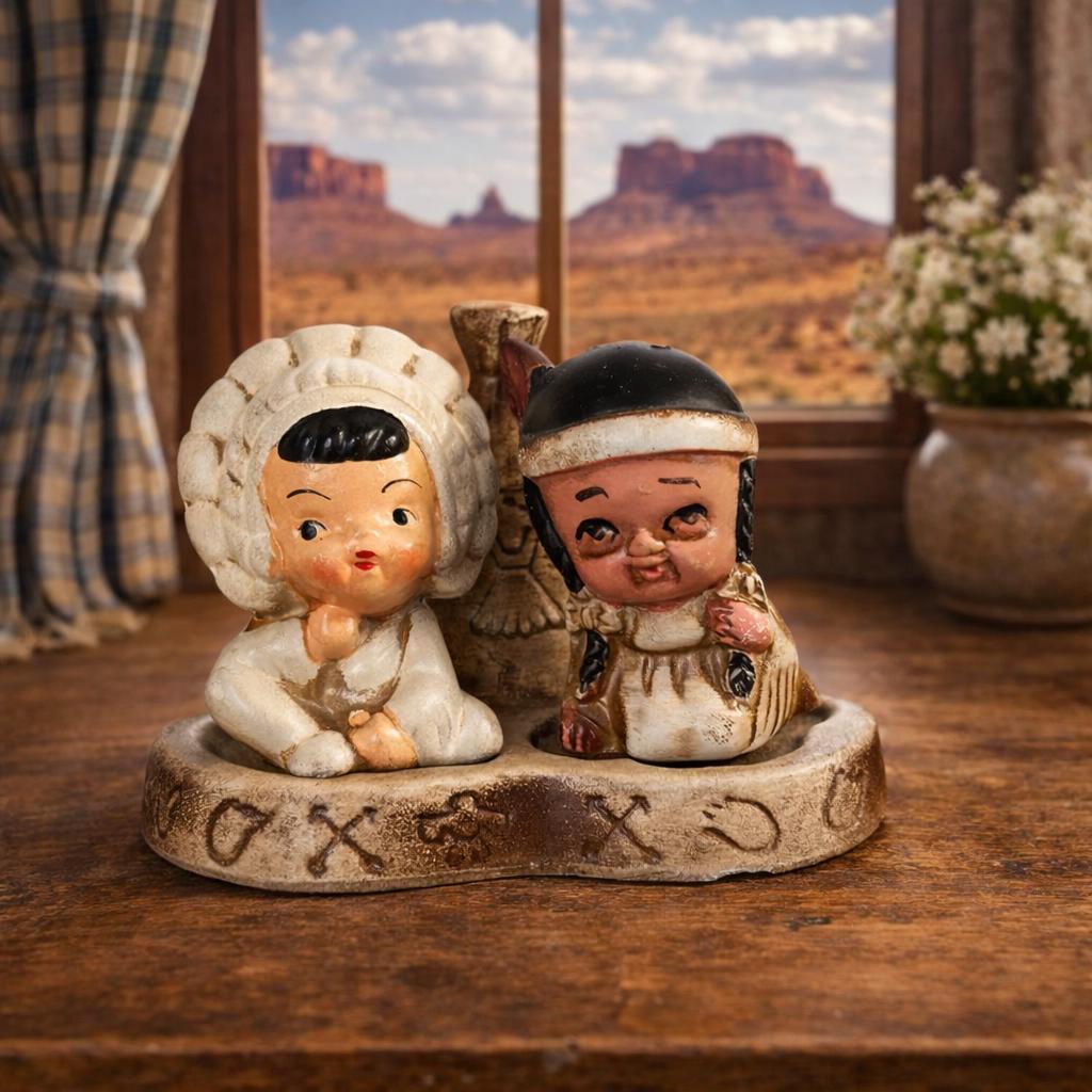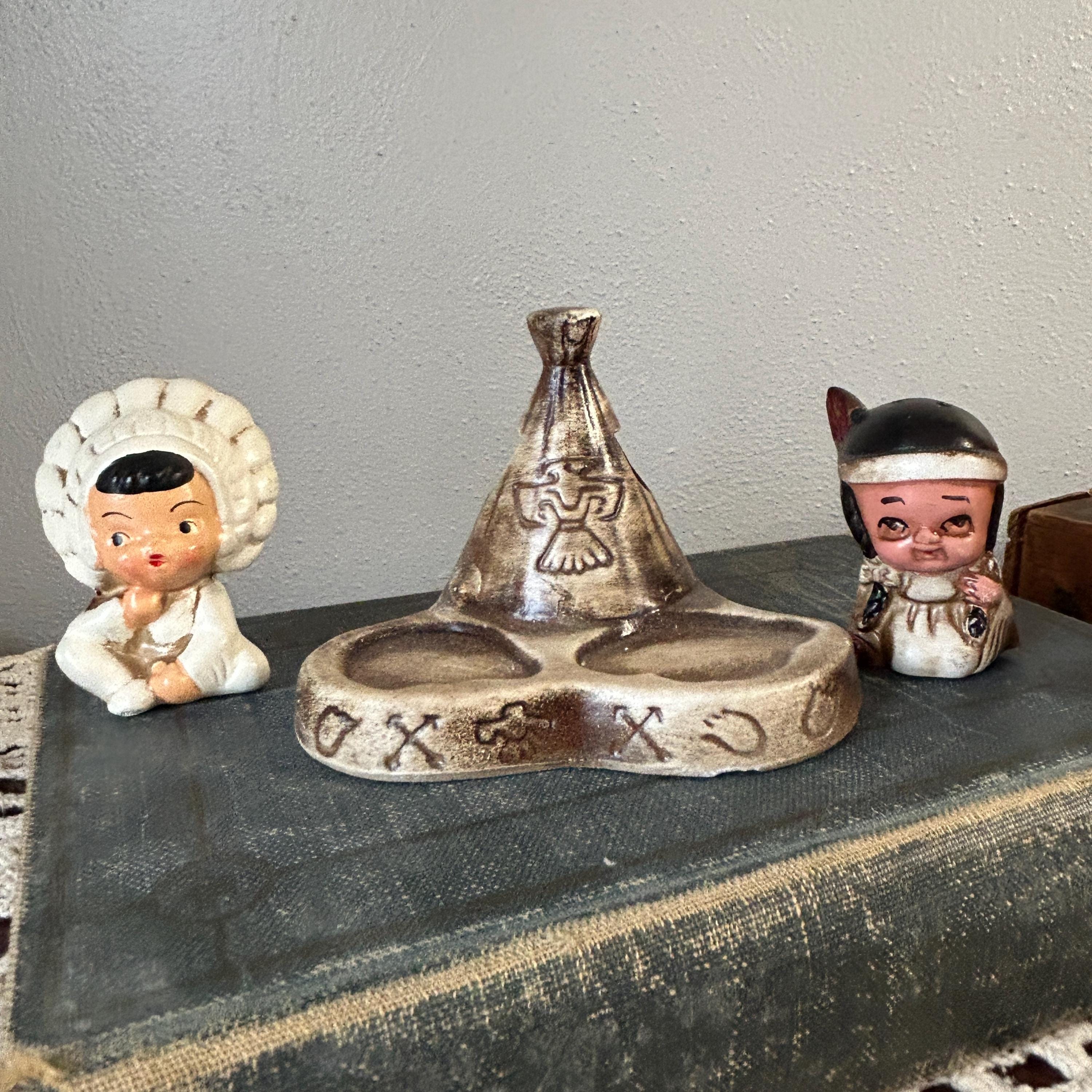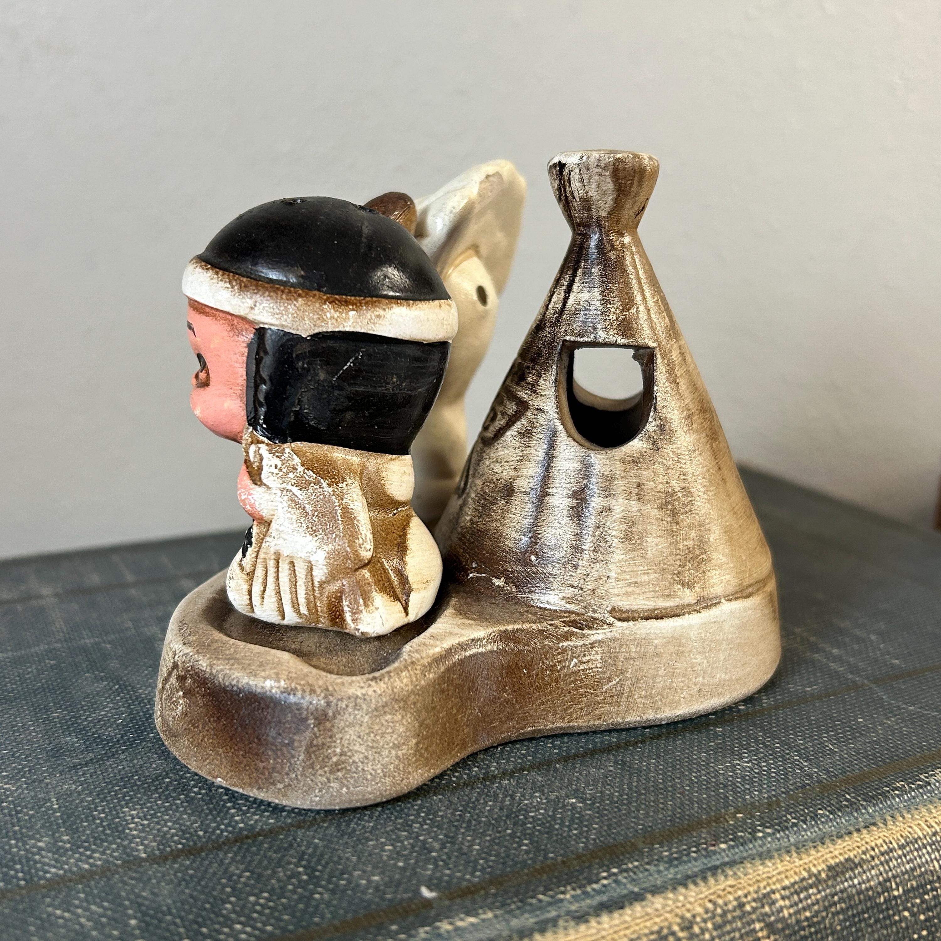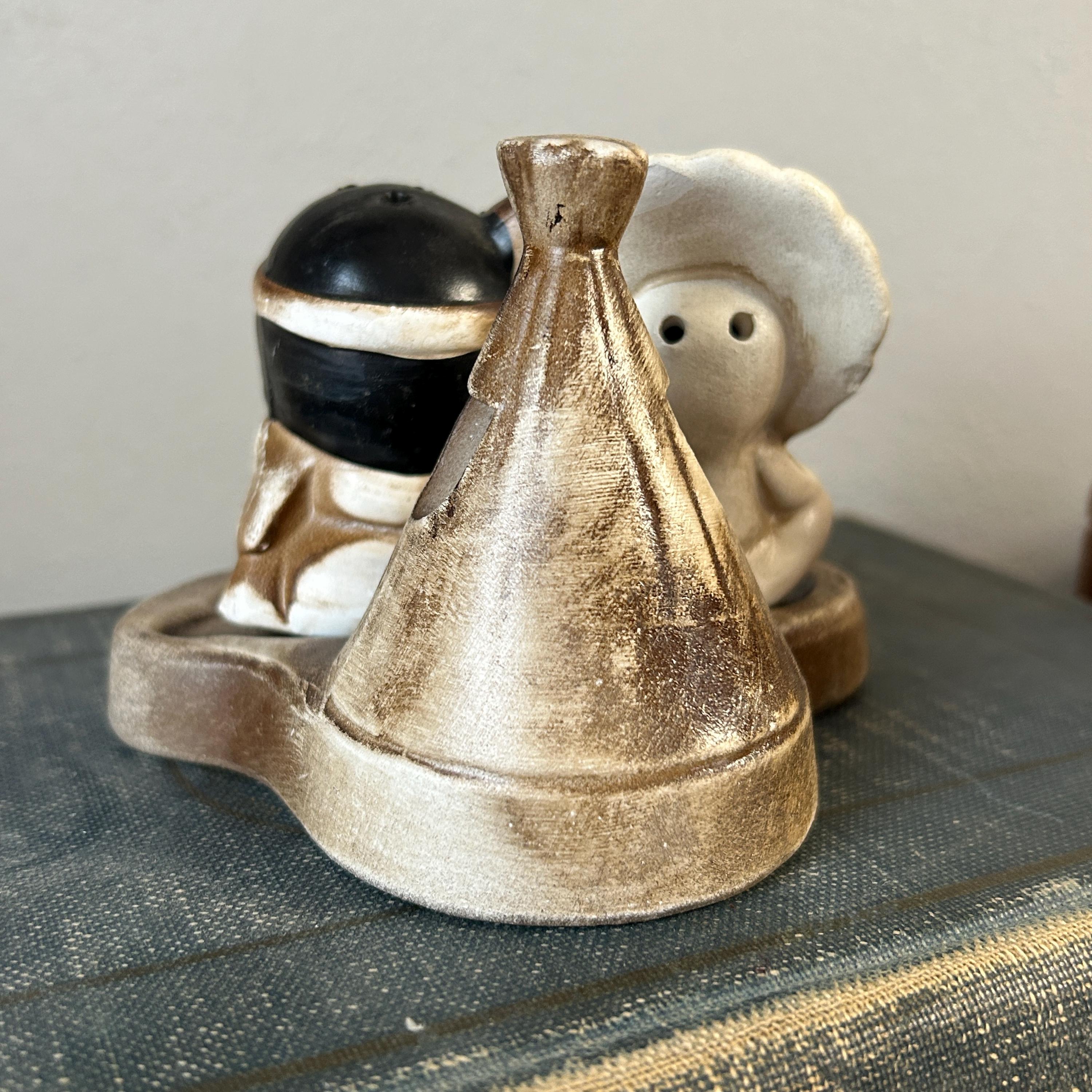 This adorable little pair sits on a teepee base with holes for toothpicks. In excellent condition with no chips or cracks. A small chip on bottom of base, but does not show when displaye.d A beautiful piece to add to your collection. 3 piece set. Measures 4 1/4" x 3 1/2" assembled.