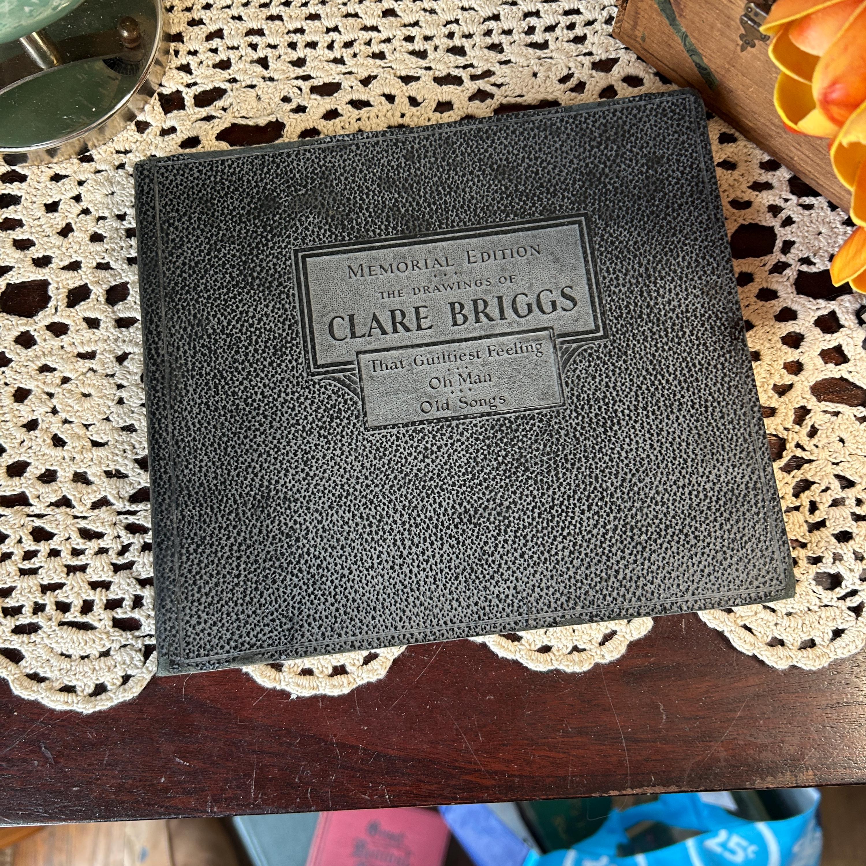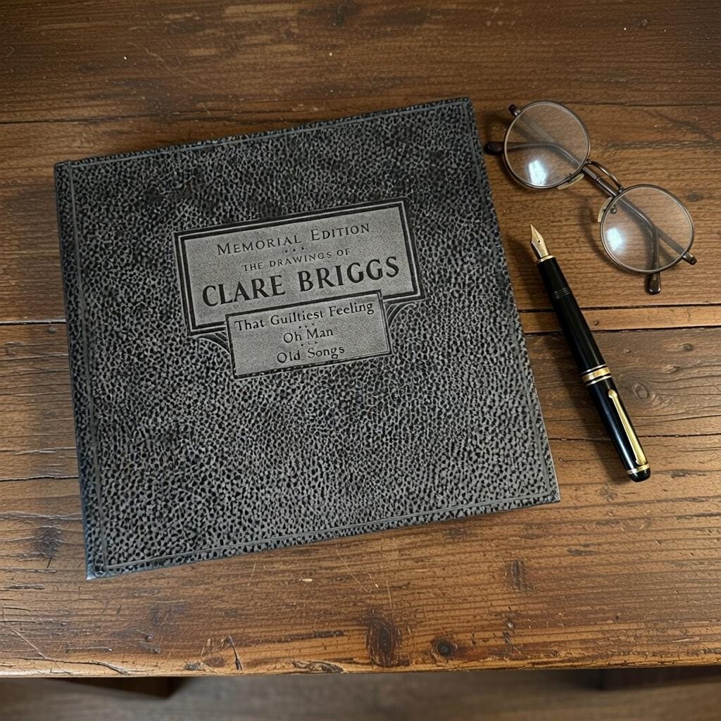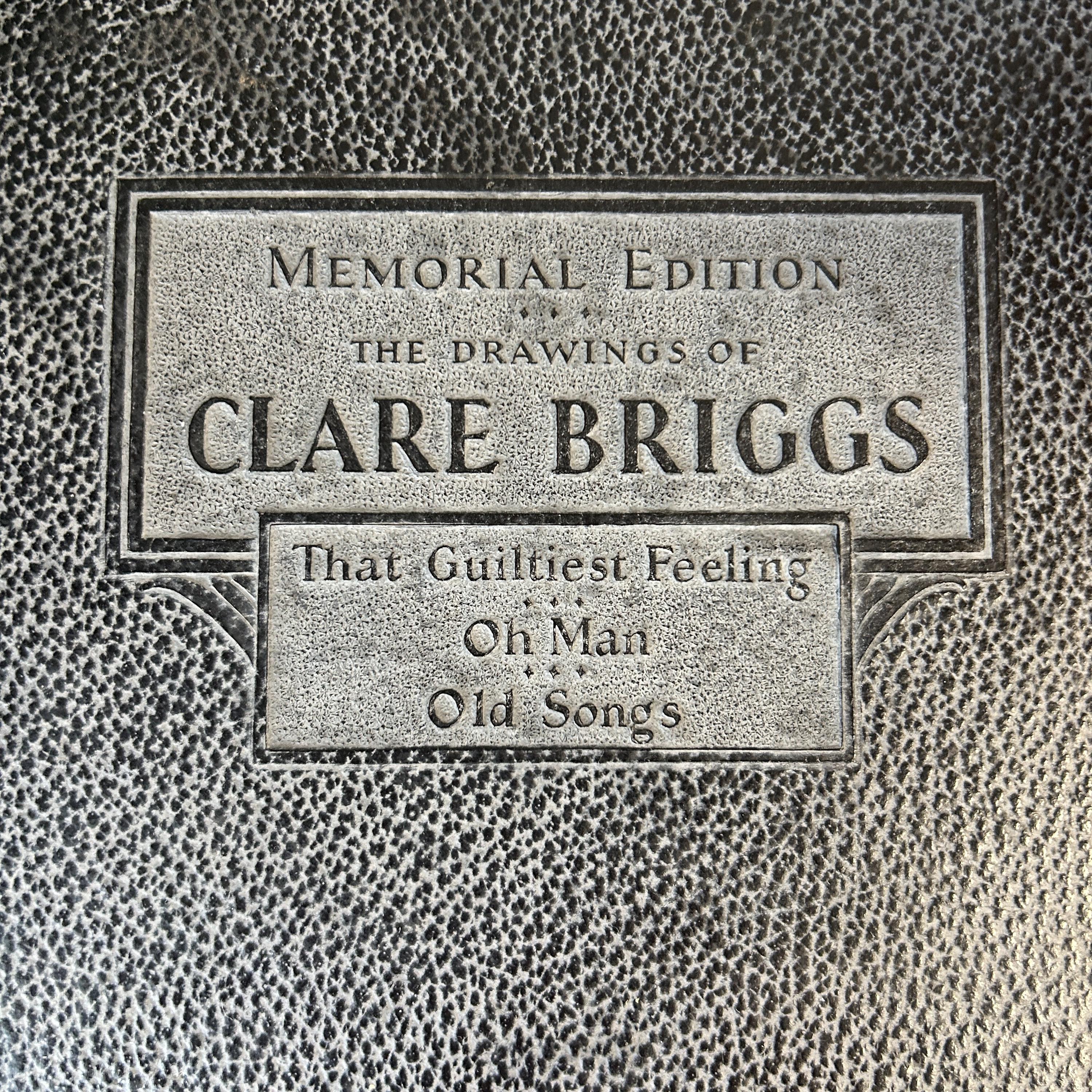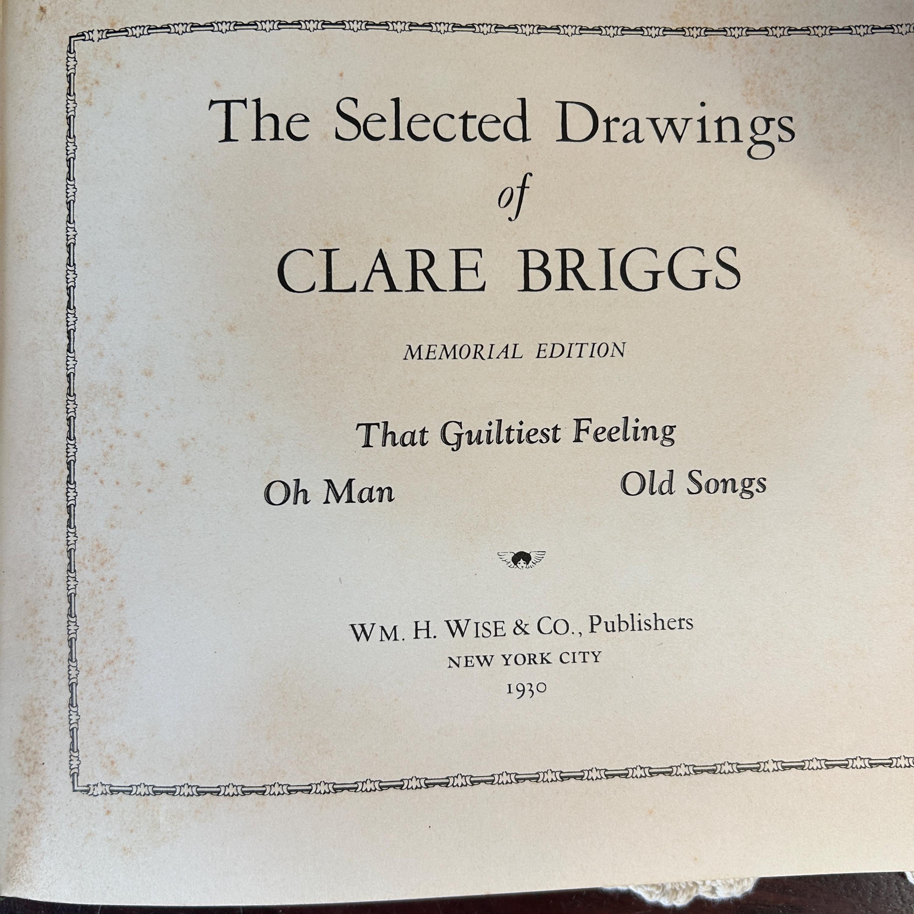 "Memorial Edition, The Drawings of Clare Briggs," published in 1930. Clare Briggs (1875-1930) was a popular American cartoonist known for his slice-of-life comics depicting everyday family situations and the humorous aspects of American life. This memorial edition was published shortly after his death and features a collection of his drawings. The cover also lists some of his well-known comic strip titles, including "That Guiltiest Feeling," "Oh Man," and "Old Songs." These strips captured common human experiences and emotions, contributing to Briggs' wide appeal during his career.