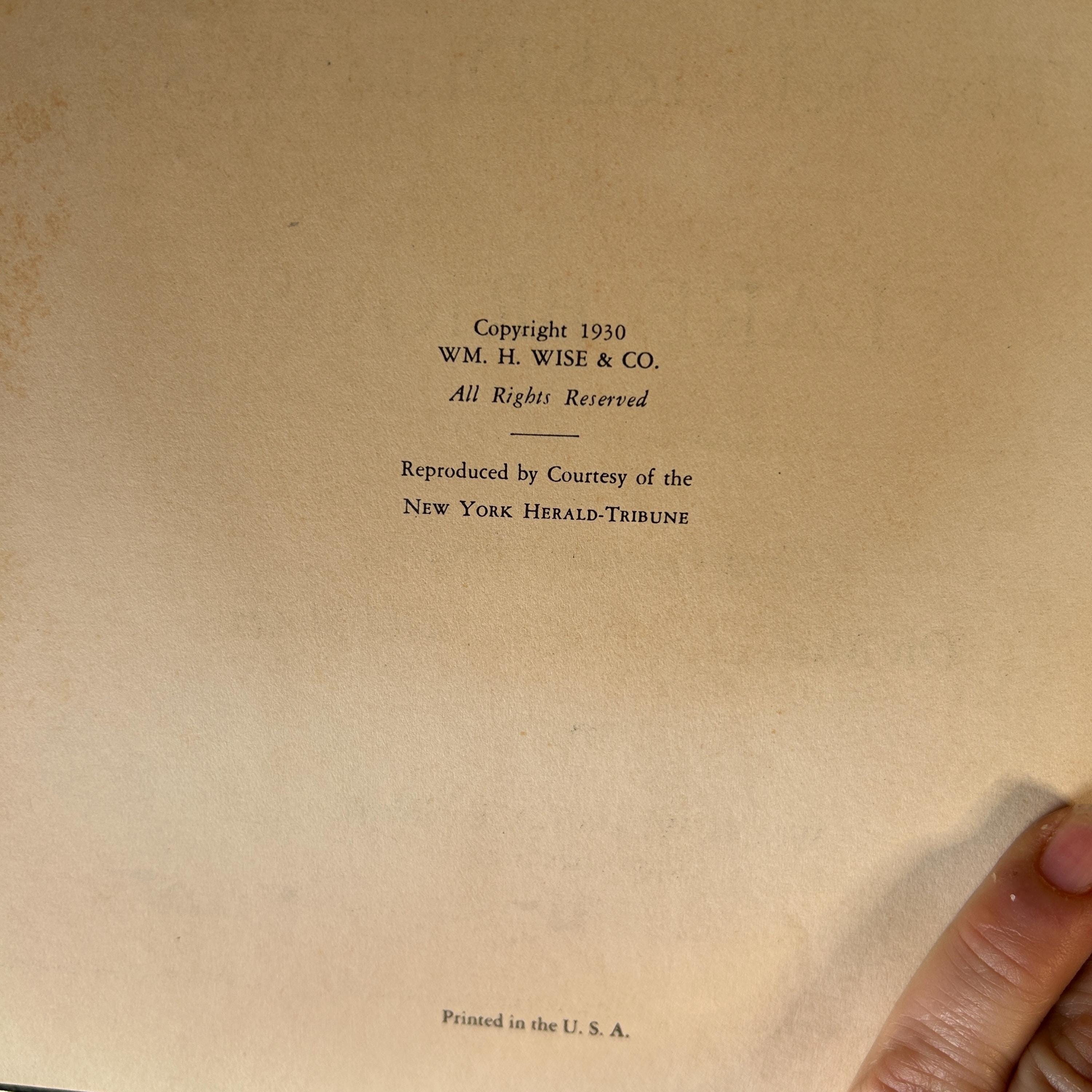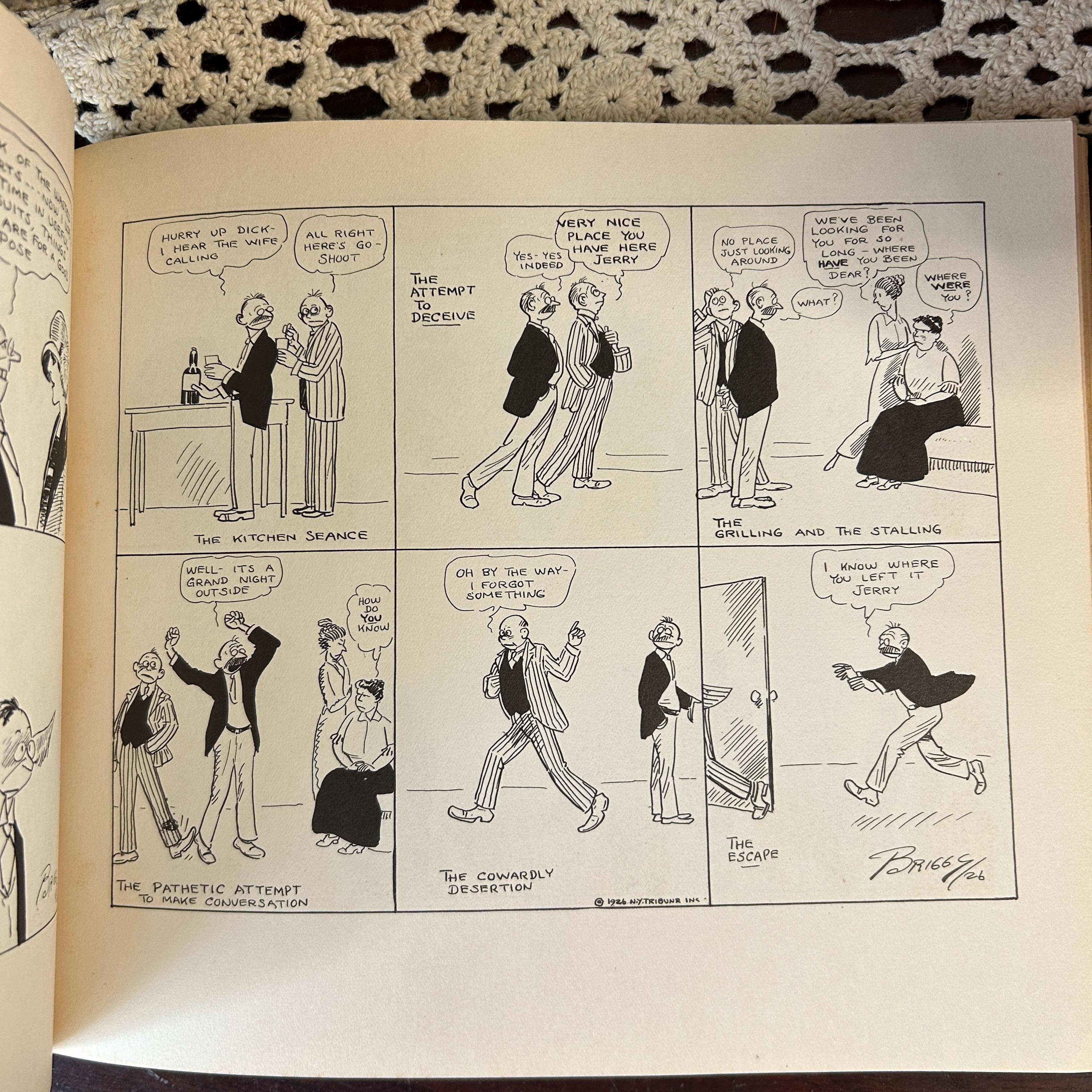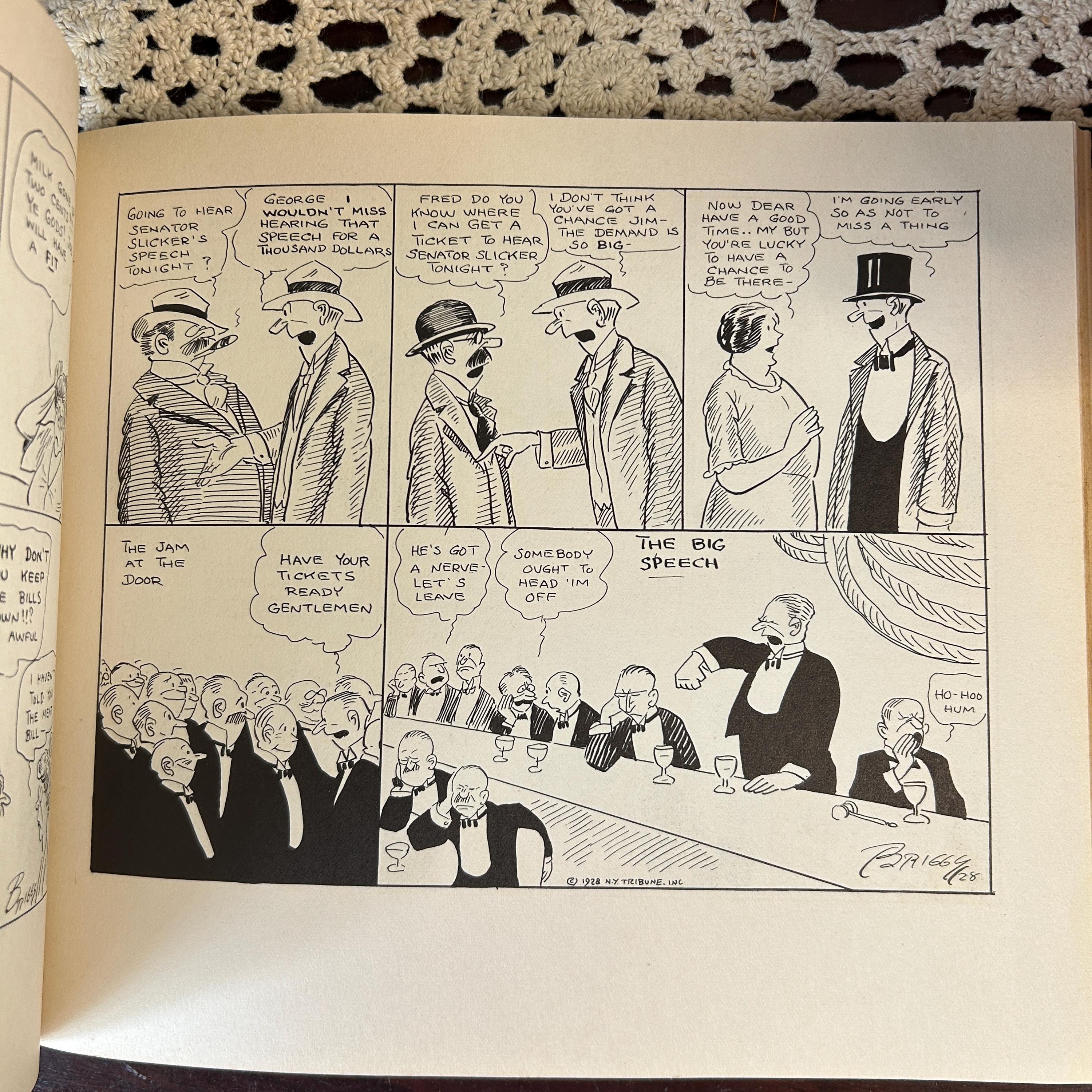 "Memorial Edition, The Drawings of Clare Briggs," published in 1930. Clare Briggs (1875-1930) was a popular American cartoonist known for his slice-of-life comics depicting everyday family situations and the humorous aspects of American life. This memorial edition was published shortly after his death and features a collection of his drawings. The cover also lists some of his well-known comic strip titles, including "That Guiltiest Feeling," "Oh Man," and "Old Songs." These strips captured common human experiences and emotions, contributing to Briggs' wide appeal during his career.