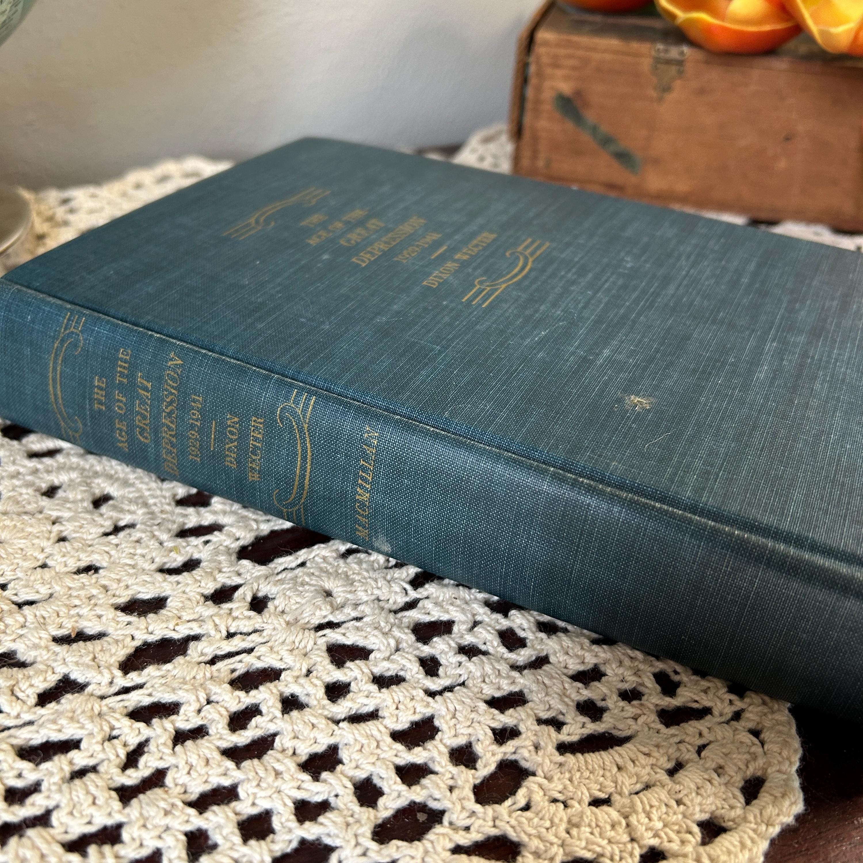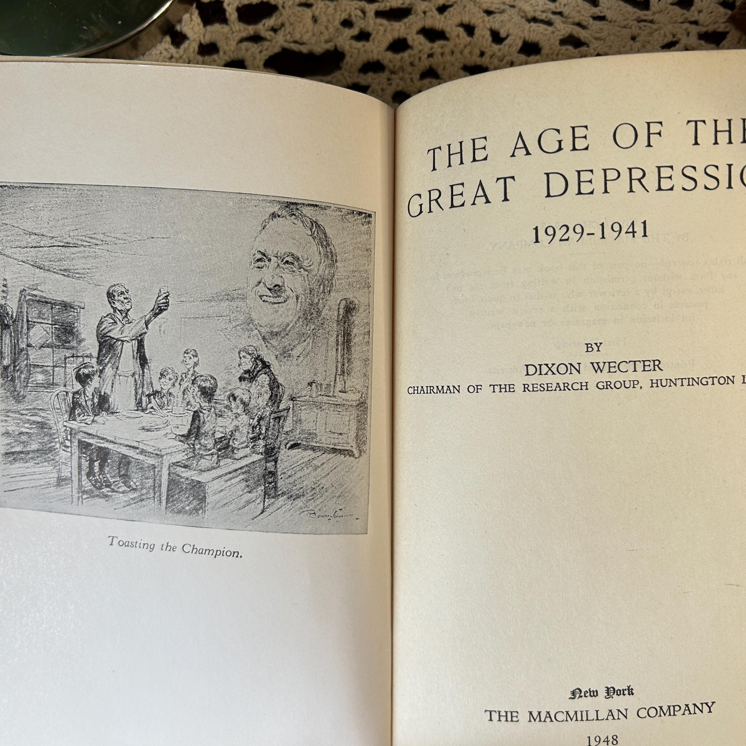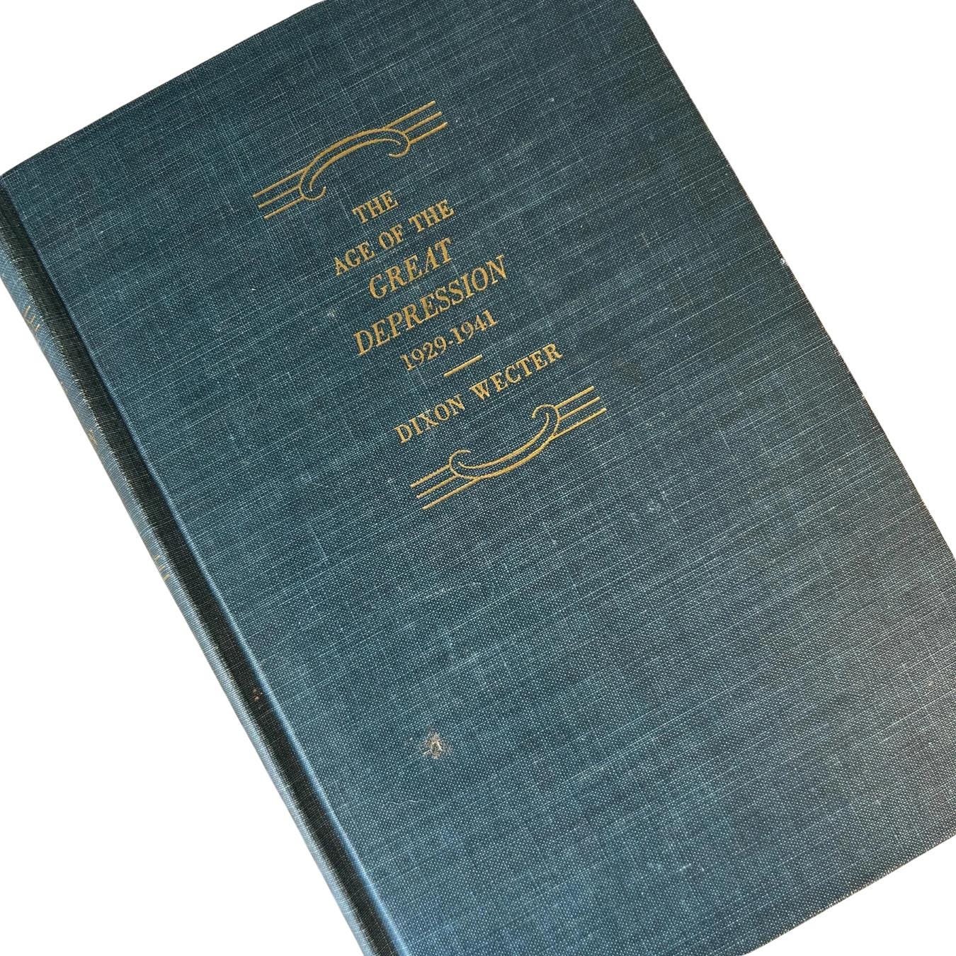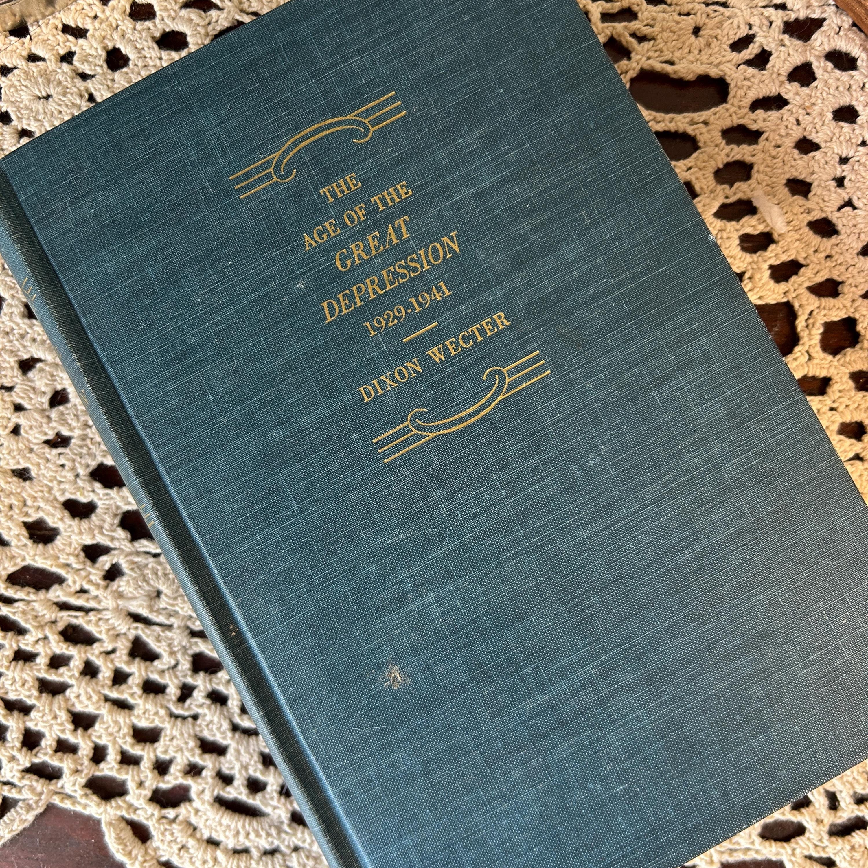 This First Printing 1948 of Dixon Wecter's 'The Age of the Great Depression' is in excellent condition. Very little wear on cover. Binding and pages intact and complete. A rare find and an excellent addition to any collecton. 362 pp. Measures 8 1/2" x 6" x 1 1/4". A beautiful greenish blue cloth cover.