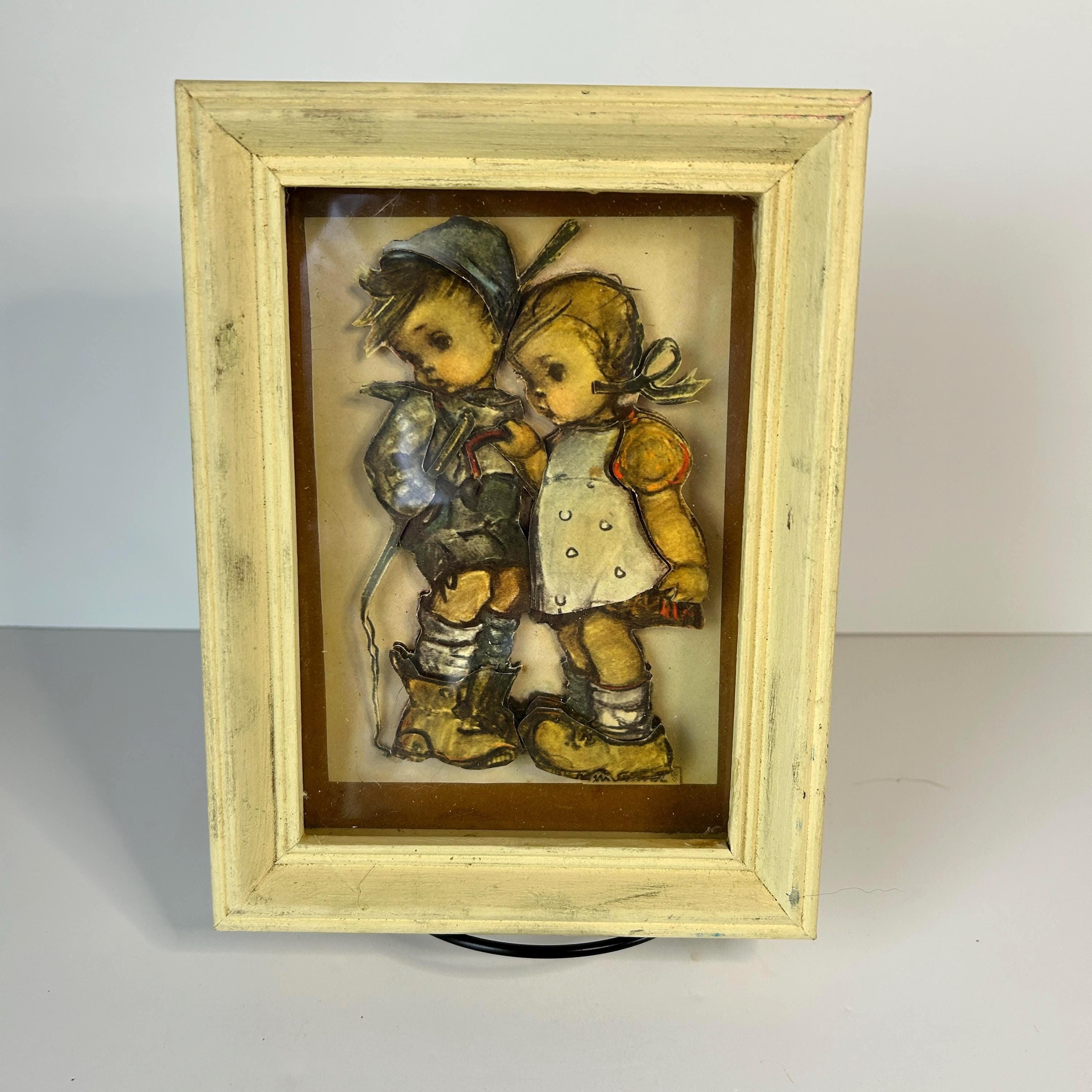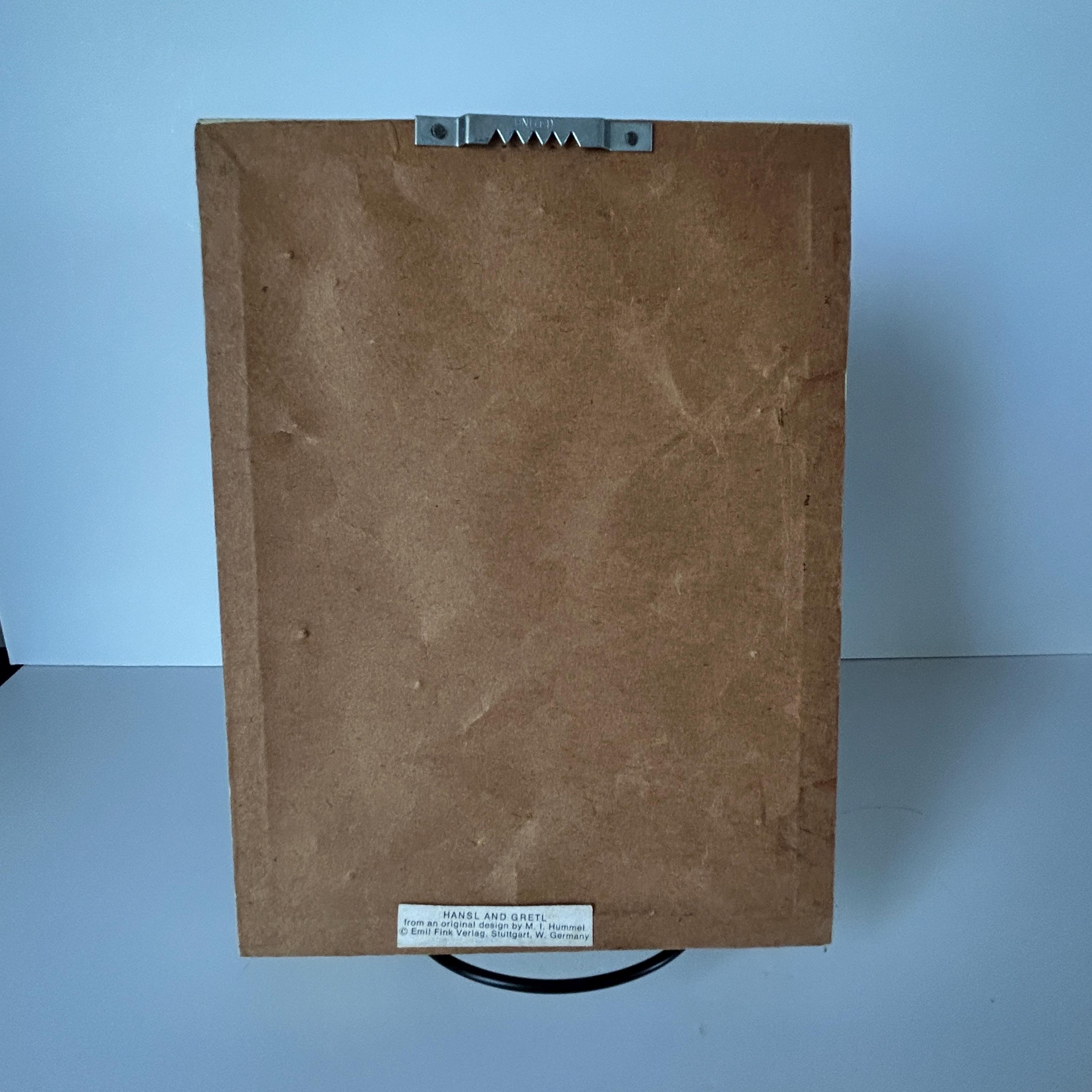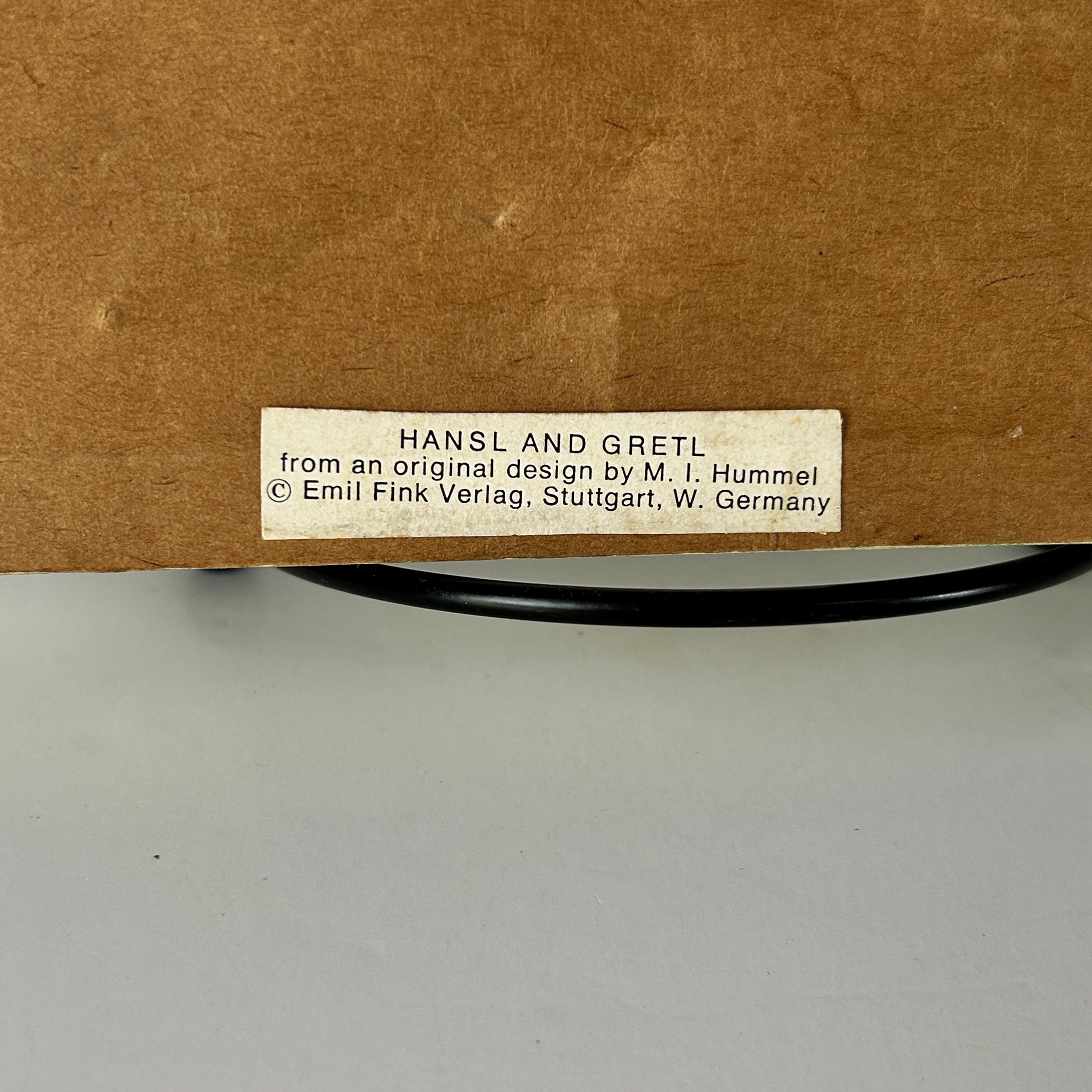 Comes ready to hang. Though vintage, it is in great condition. Original tag on bottom of back of frame. Reads: Hansl and Gretl from an original design by M.I. Hummel Copyright Emil Fink Verlag, Stuttgart, W. Germany