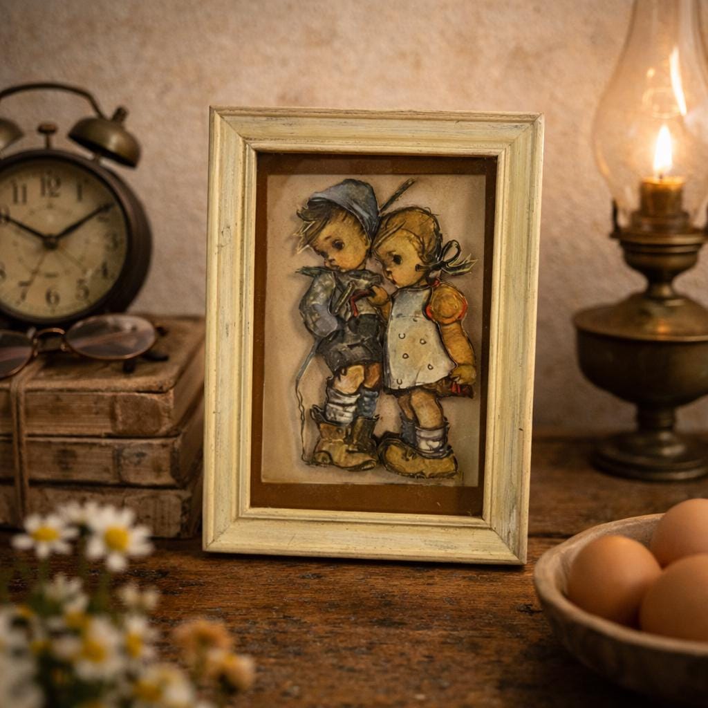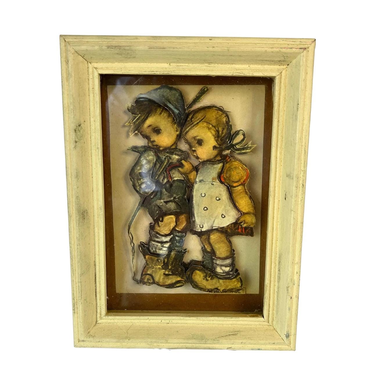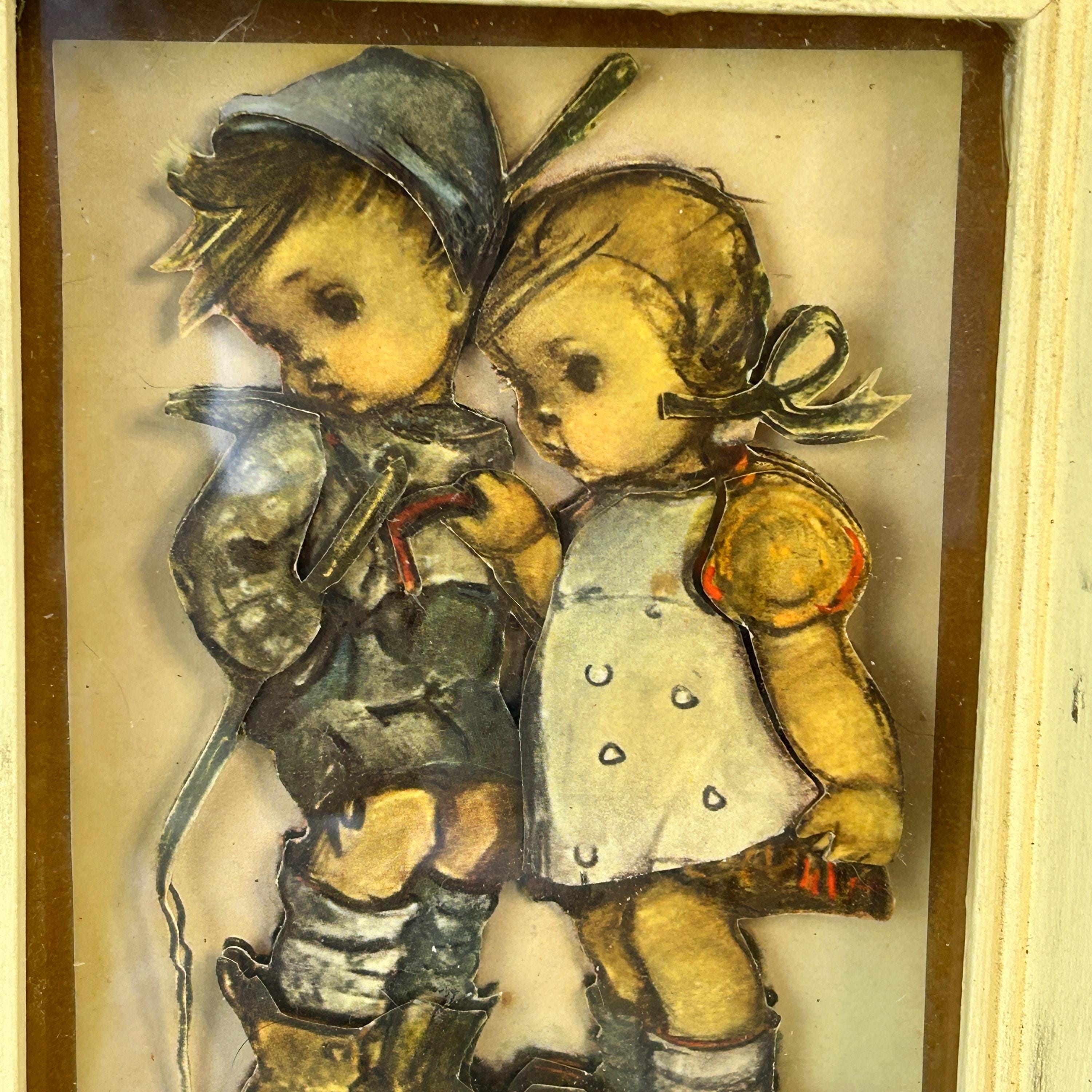 Comes ready to hang. Though vintage, it is in great condition. Original tag on bottom of back of frame. Reads: Hansl and Gretl from an original design by M.I. Hummel Copyright Emil Fink Verlag, Stuttgart, W. Germany