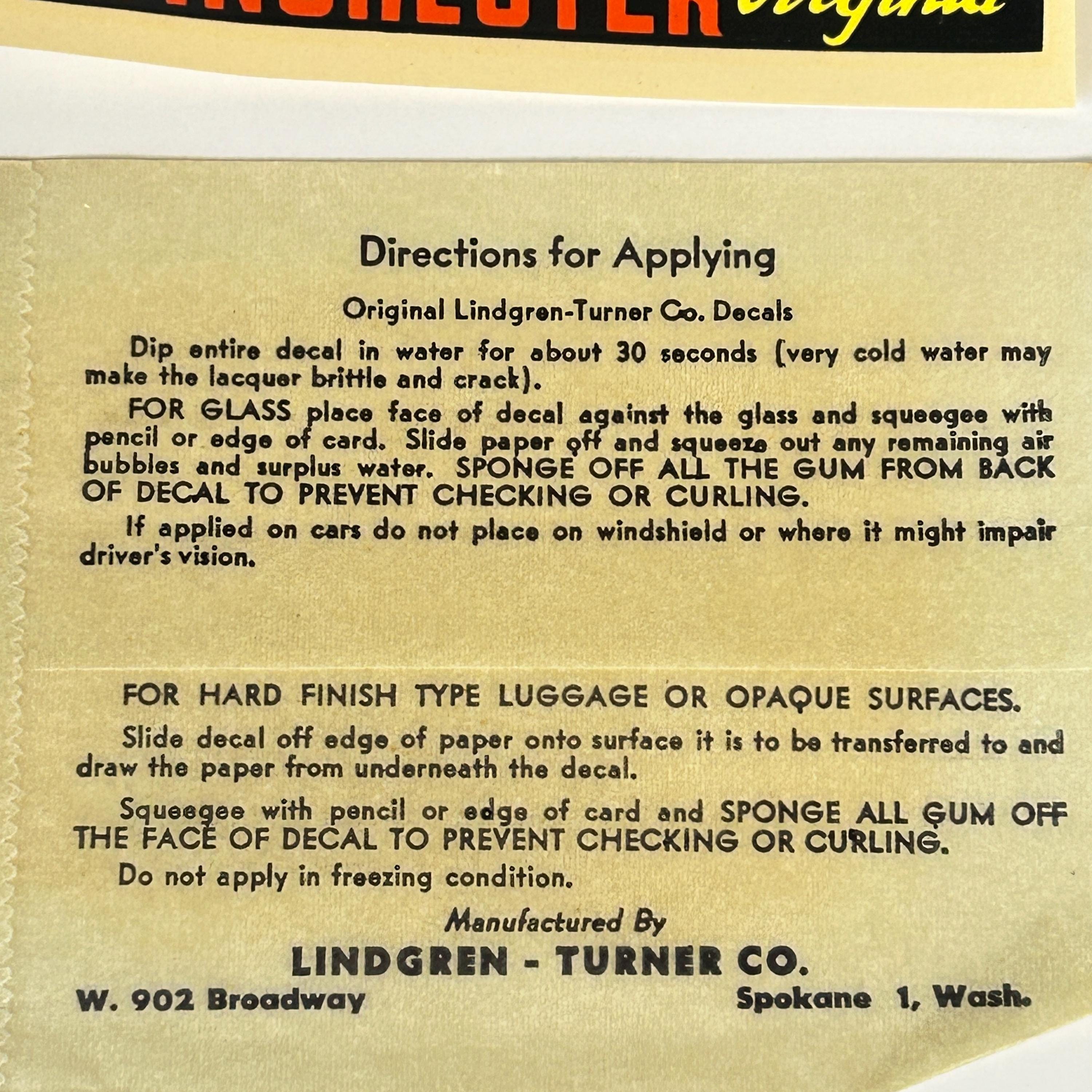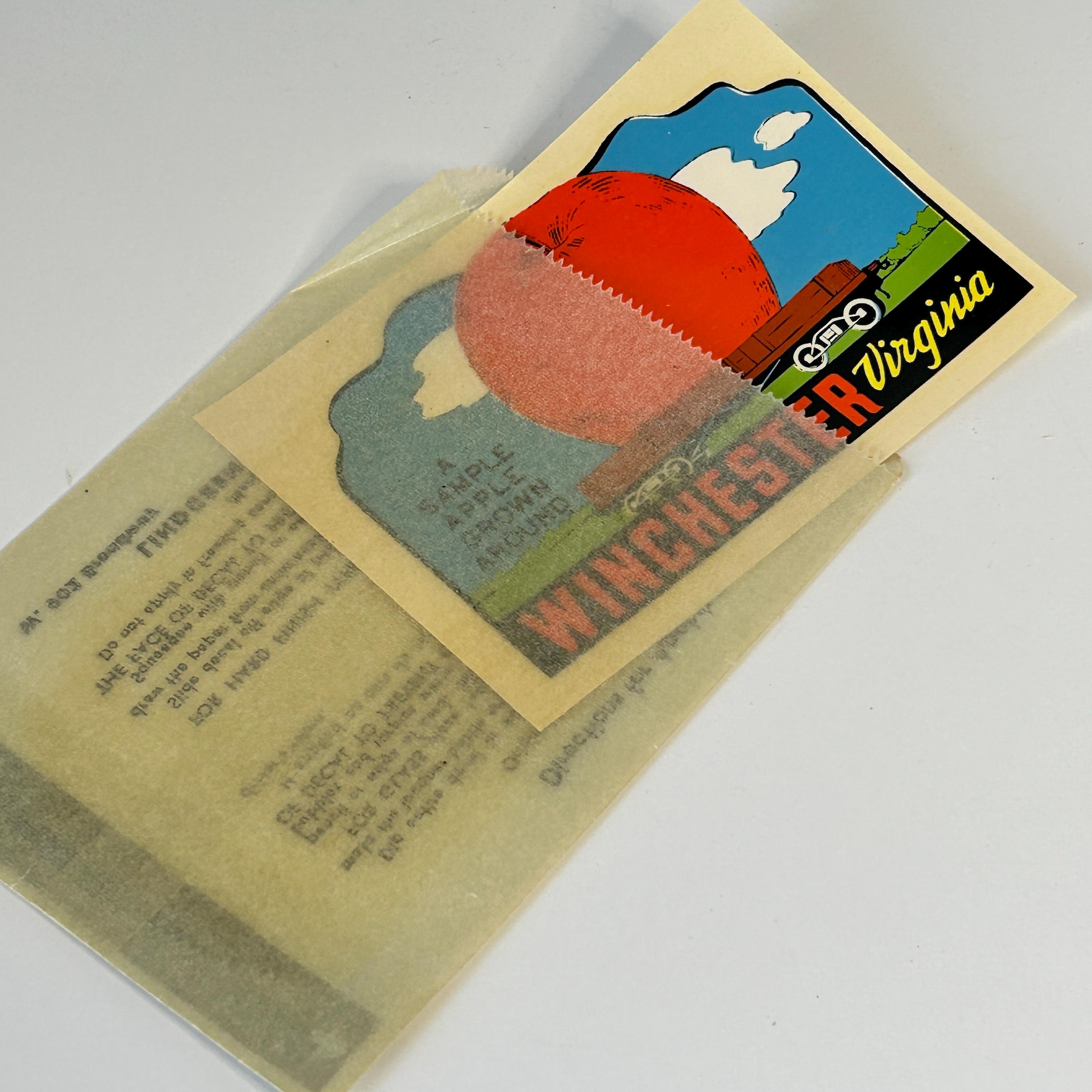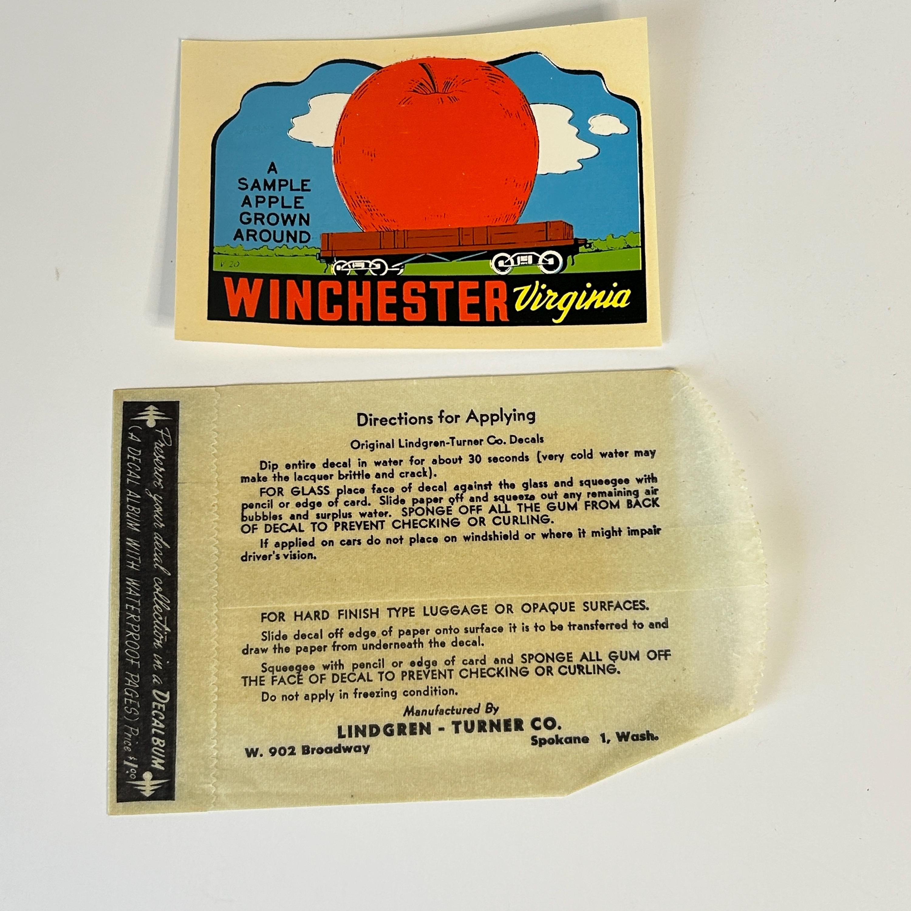Water slide decal from the 50s-70s. A great souvenir from Winchester, Virginia. Easily applied to glass, luggage, or opaque surfaces. Comes in original wax paper sleeve with directions for applying.