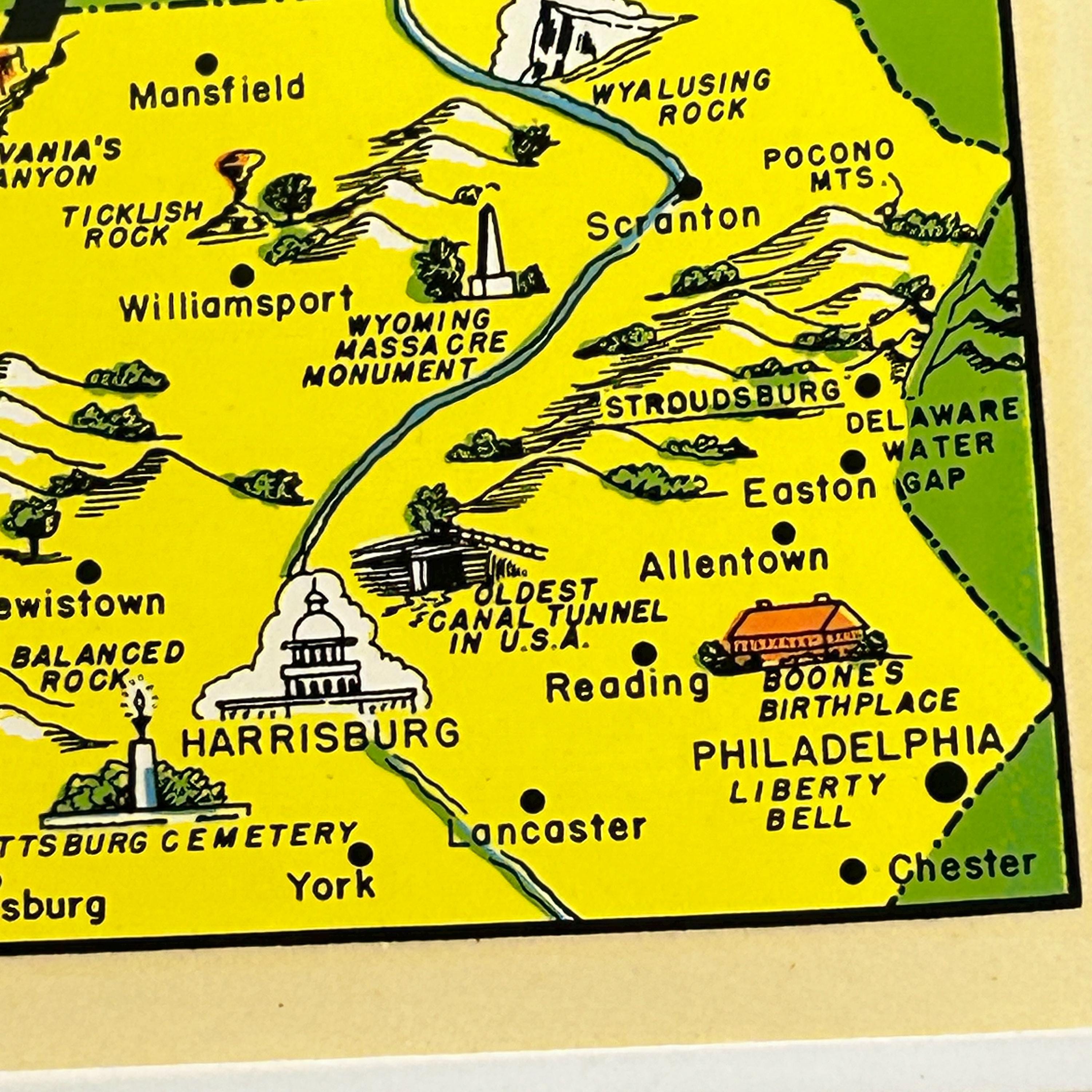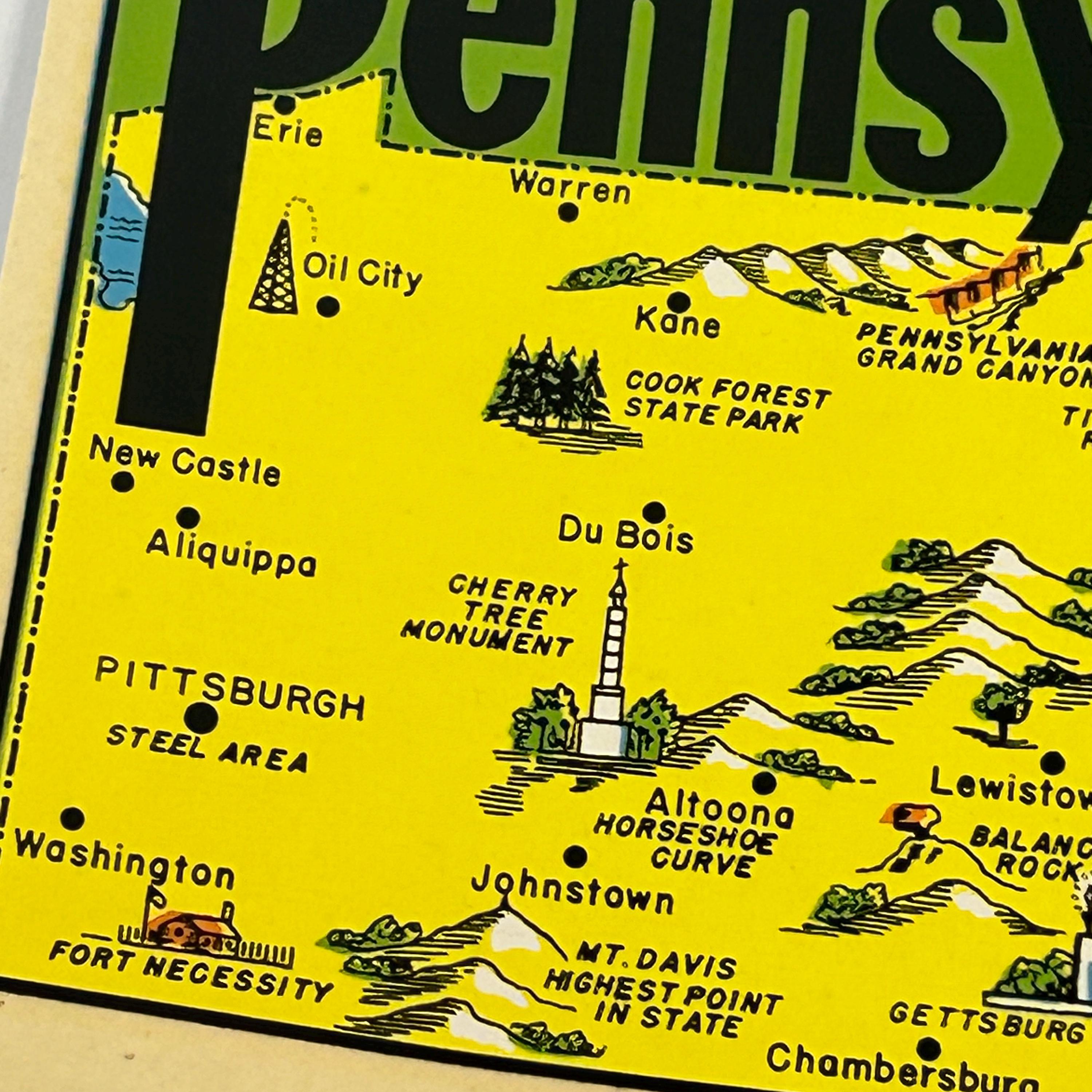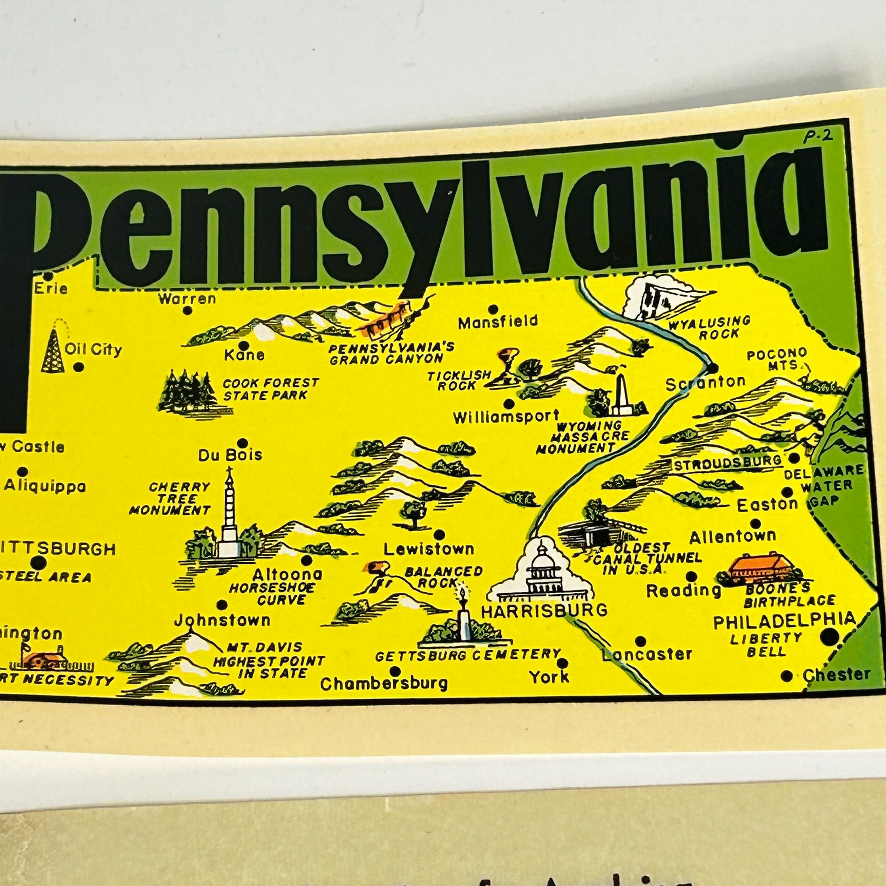 Decal measures 4 1/4" x 3". Features cities such as Philadelphia, Pittsburgh, Harrisburg and some state scenic sites.