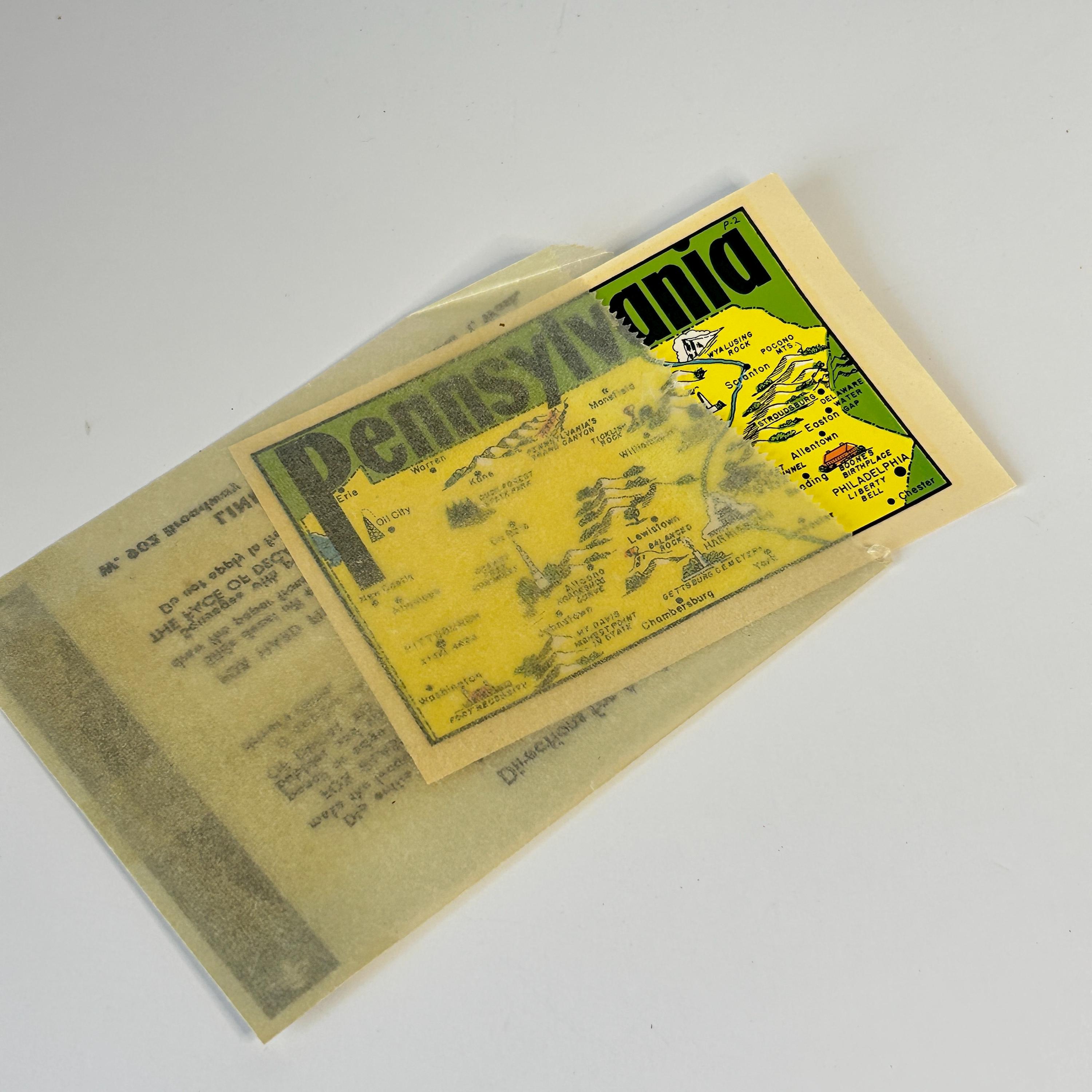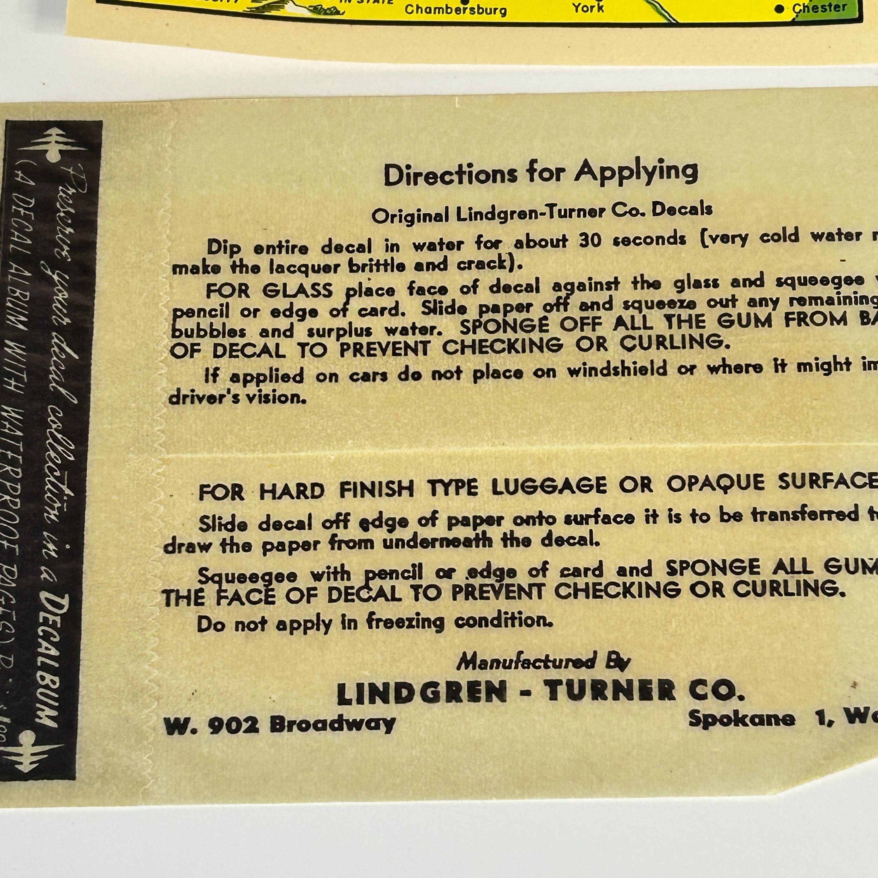 Water slide decal from the 50s-70s. A great souvenir from Pennsylvania. Easily applied to glass, luggage, or opaque surfaces. Comes in original wax paper sleeve with directions for applying.