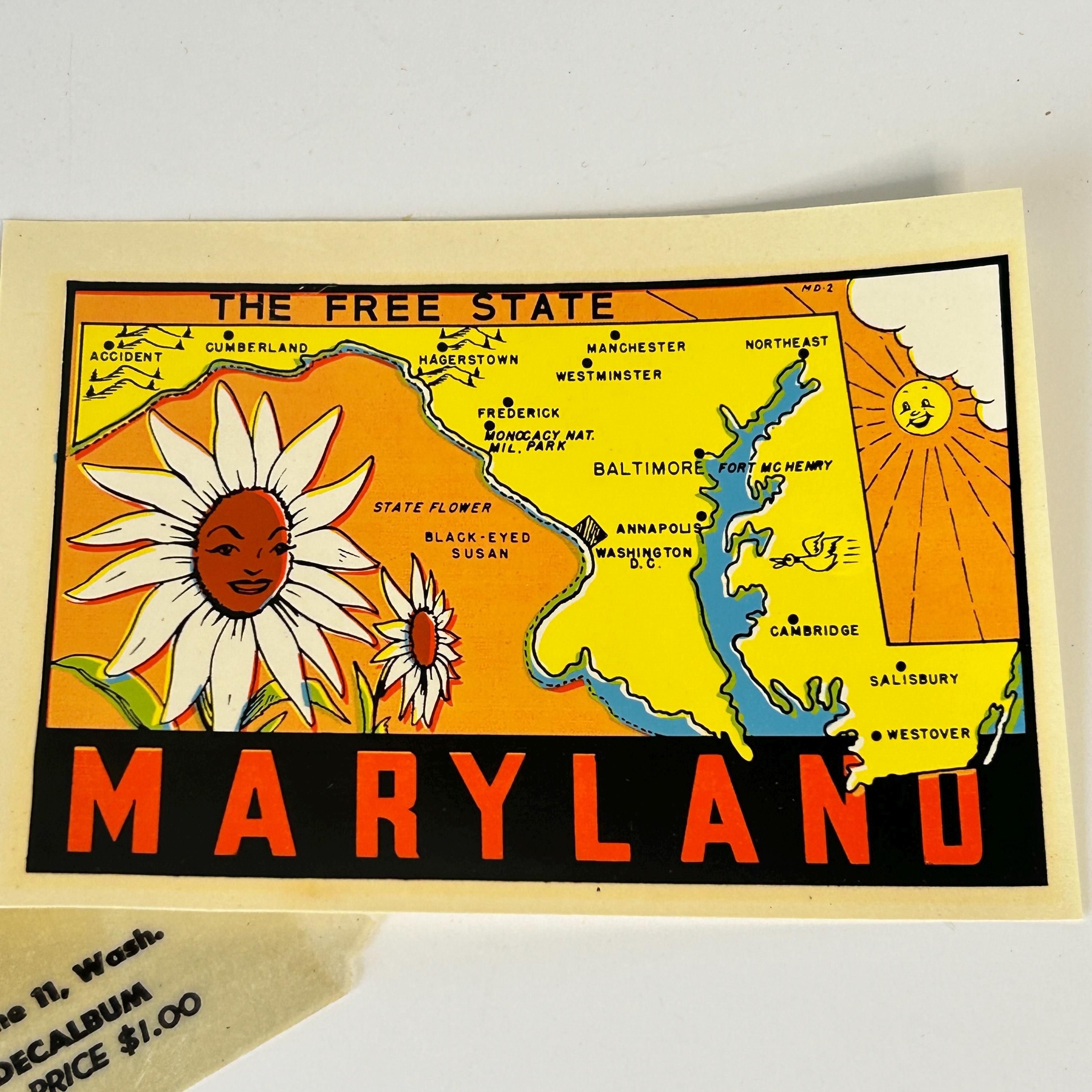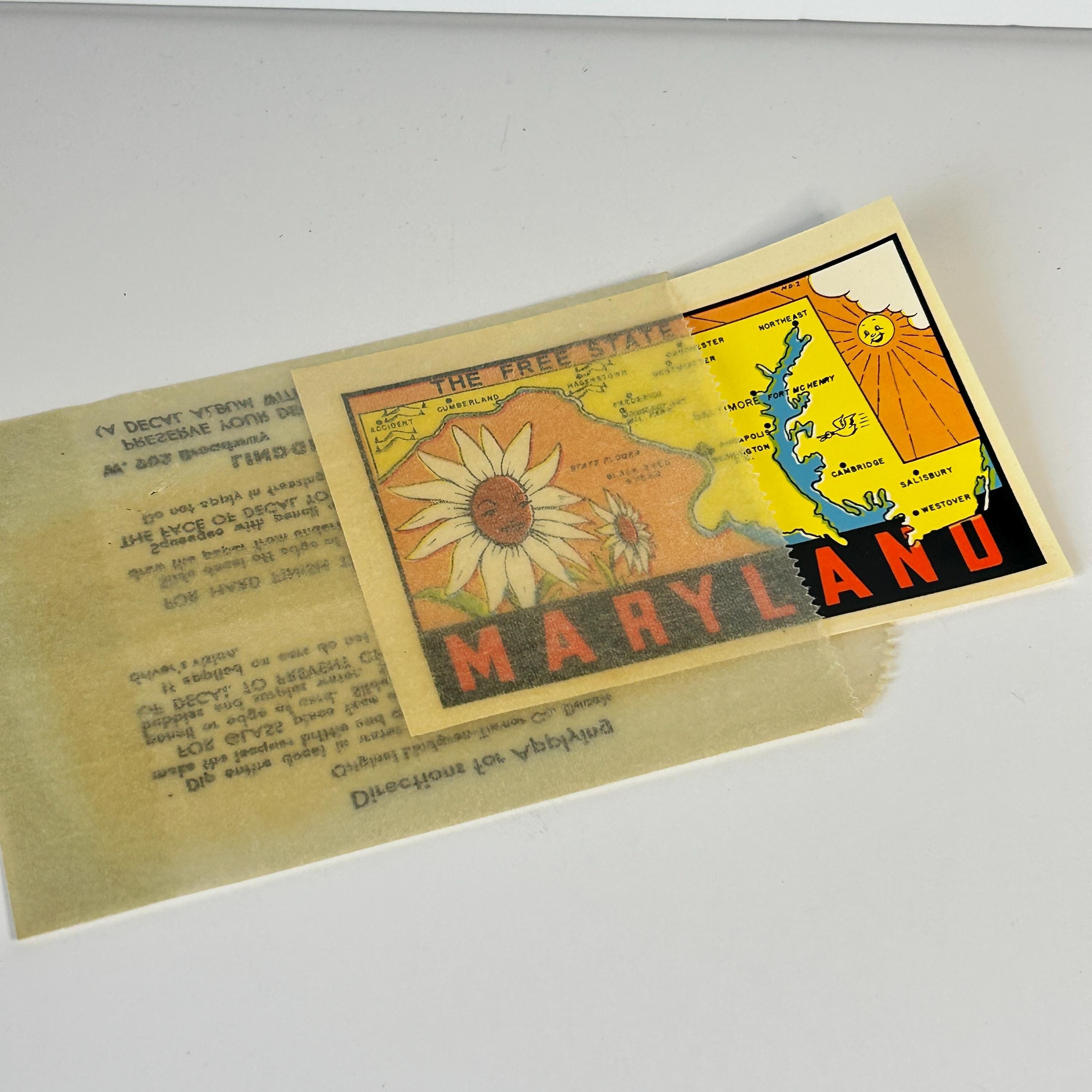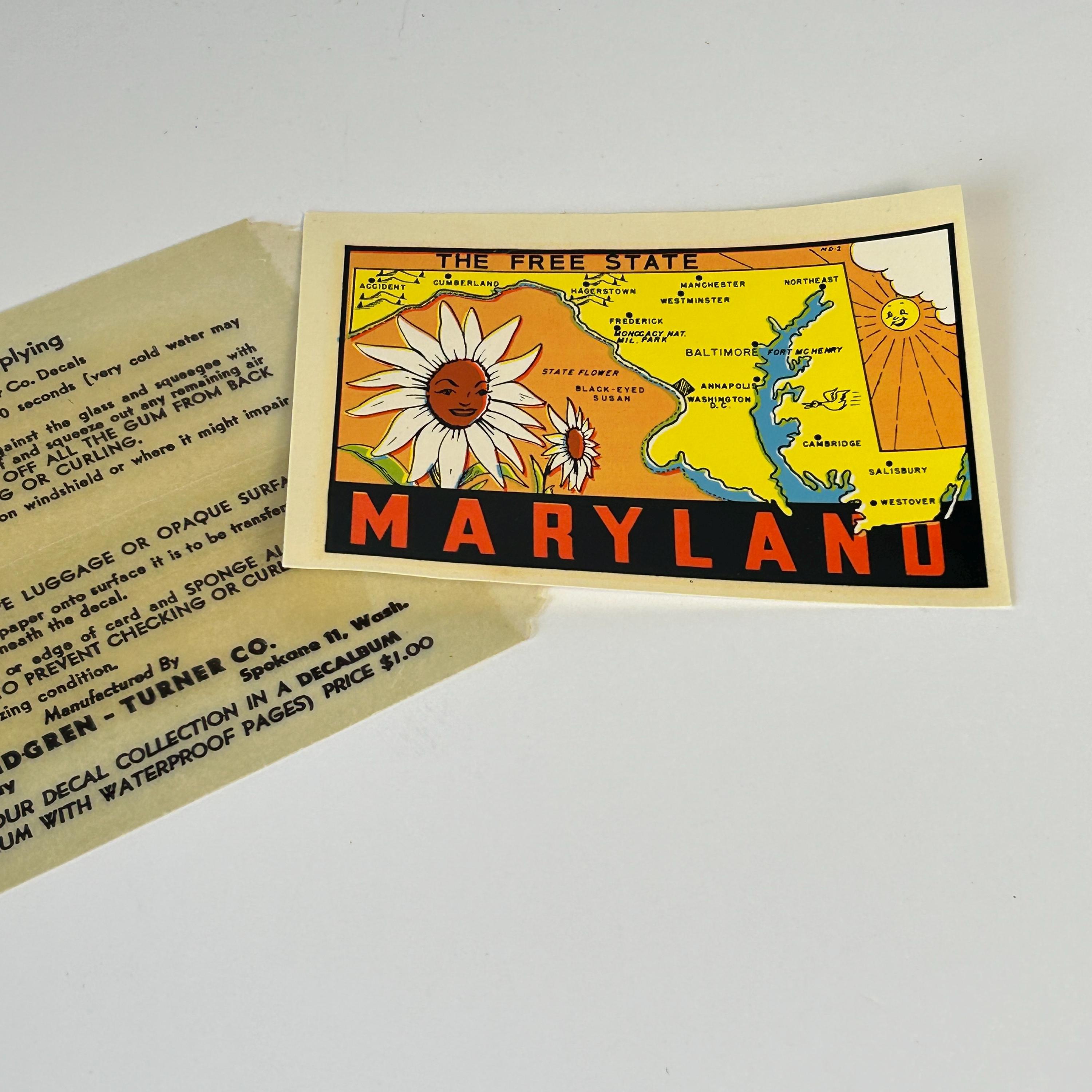 Water slide decal from the 50s-70s. A great souvenir from Maryland. Easily applied to glass, luggage, or opaque surfaces. Comes in original wax paper sleeve with directions for applying.