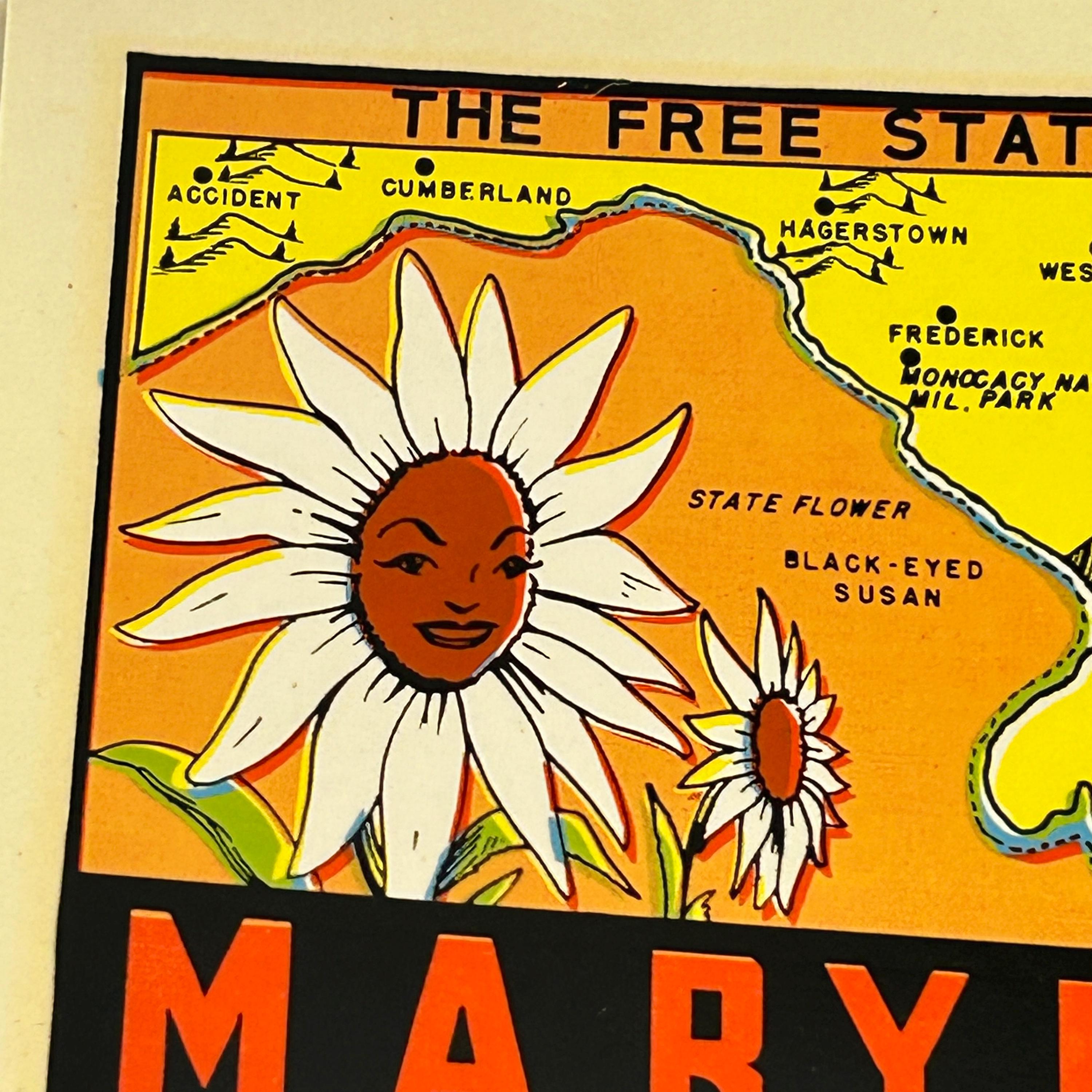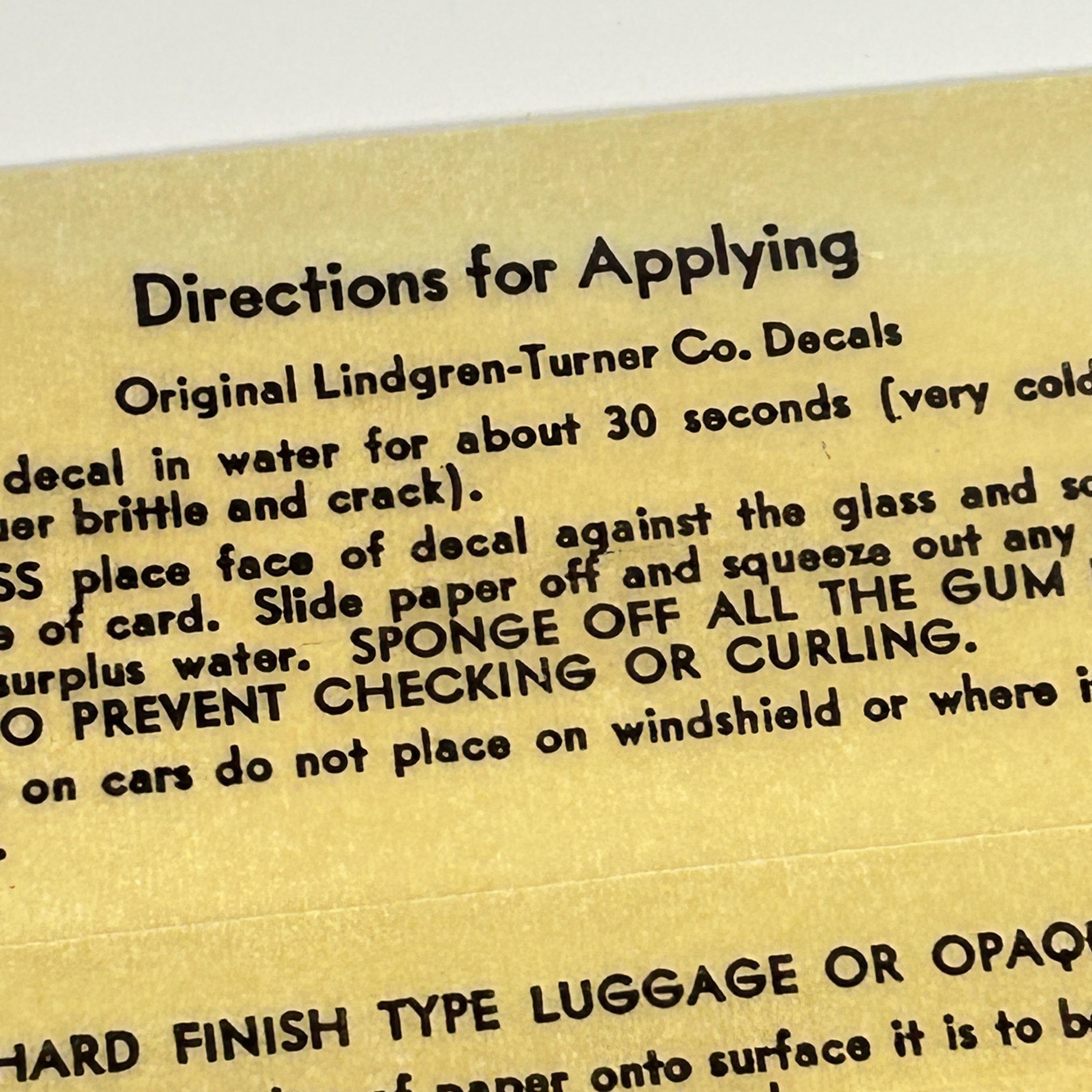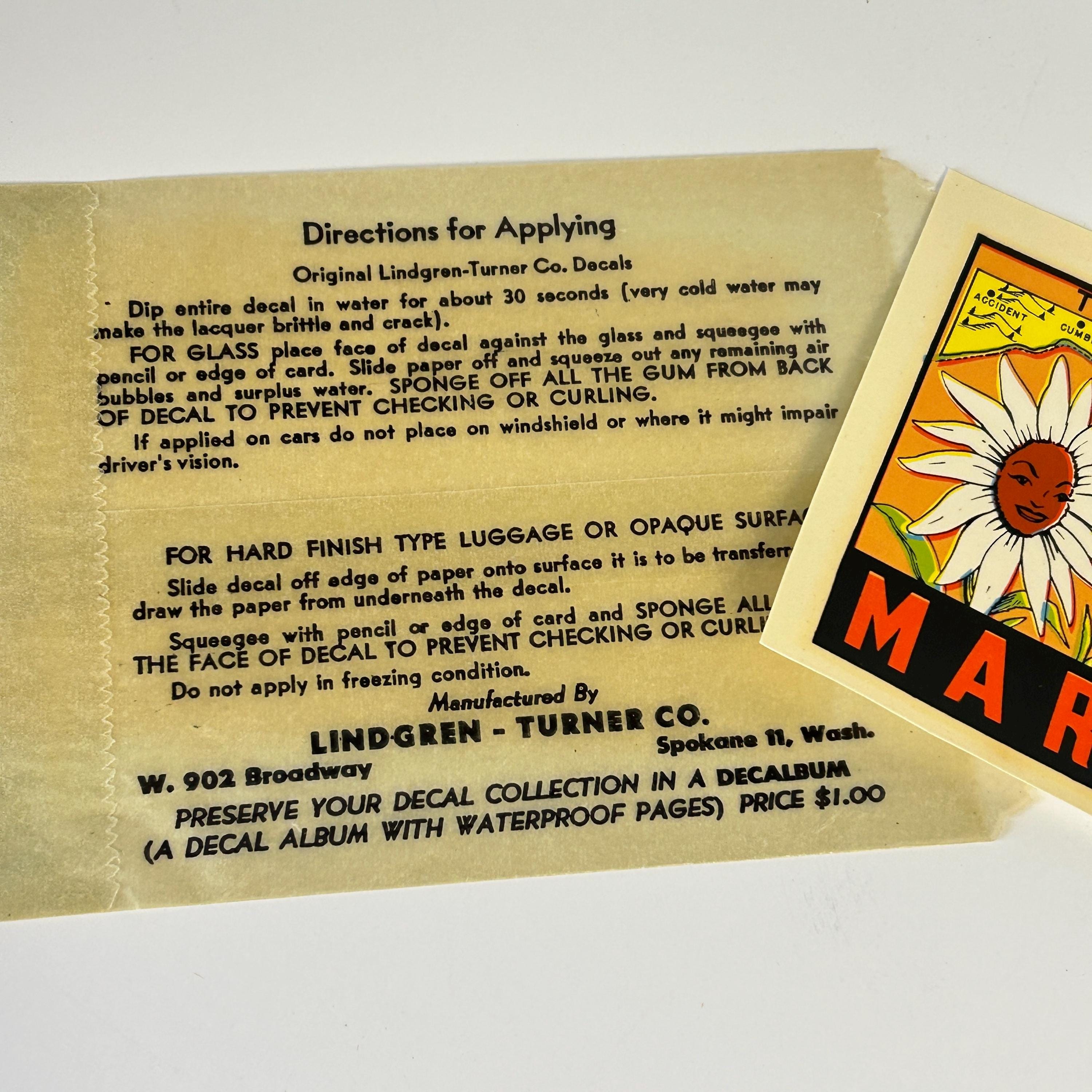Water slide decal from the 50s-70s. A great souvenir from Maryland. Easily applied to glass, luggage, or opaque surfaces. Comes in original wax paper sleeve with directions for applying.