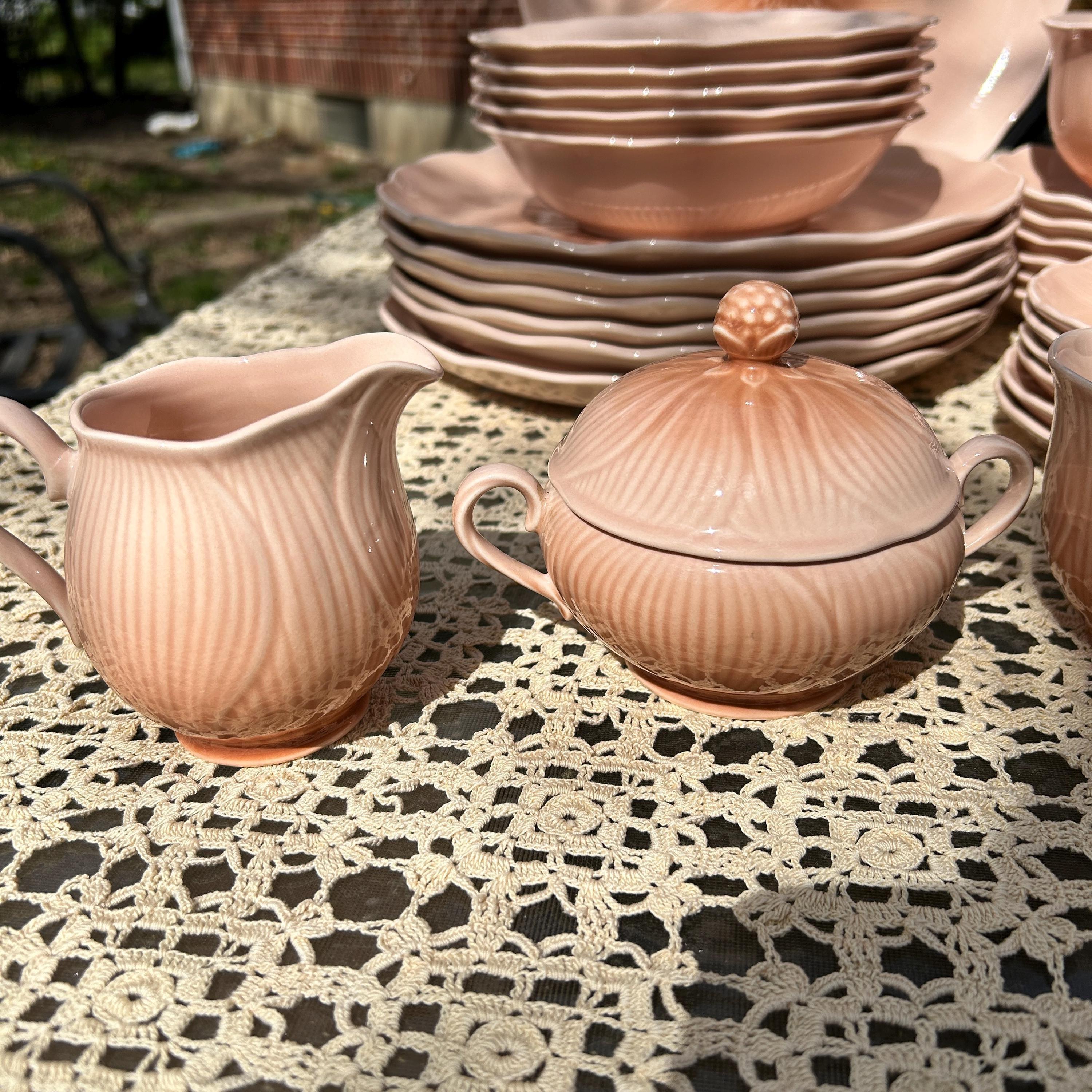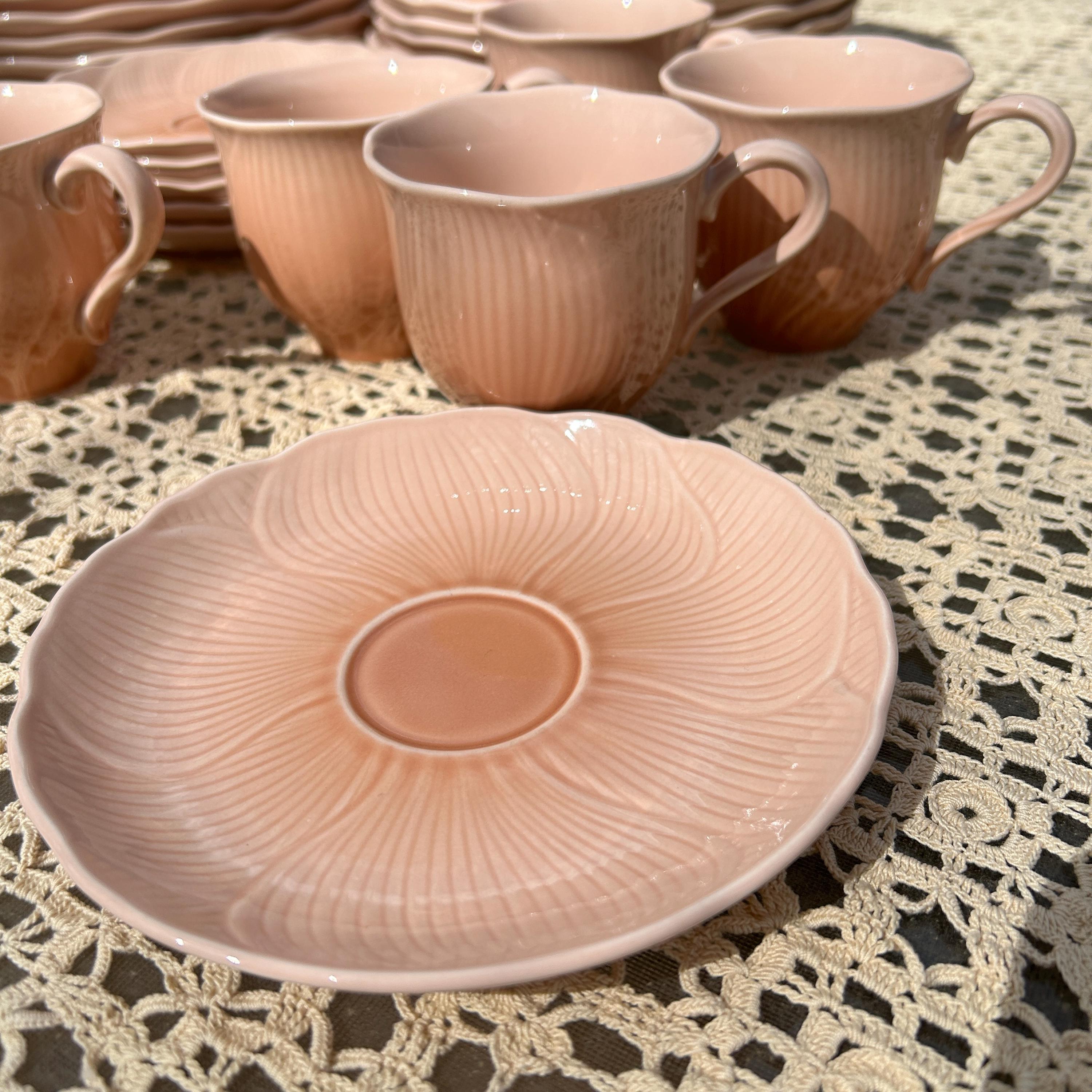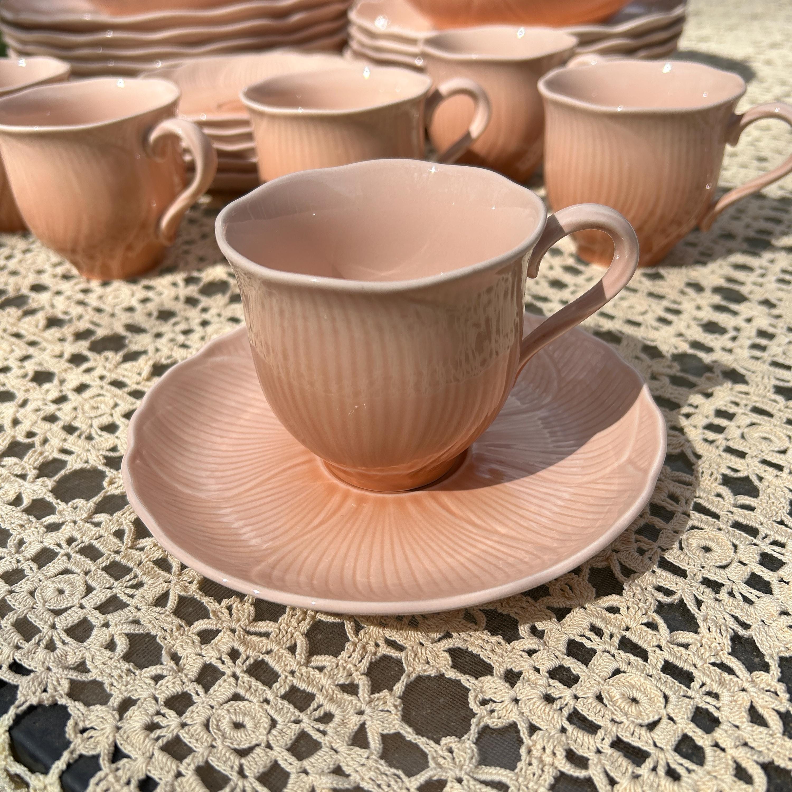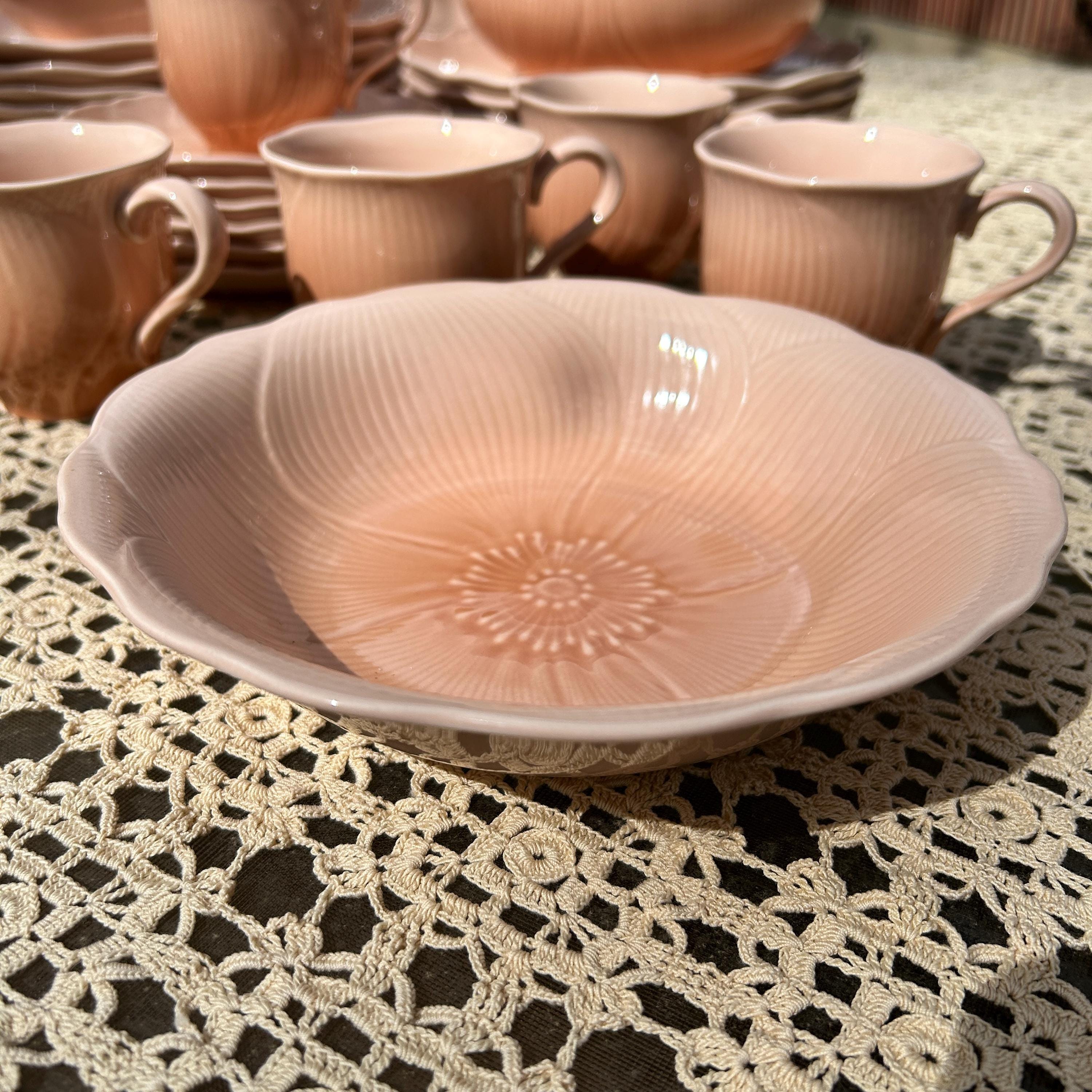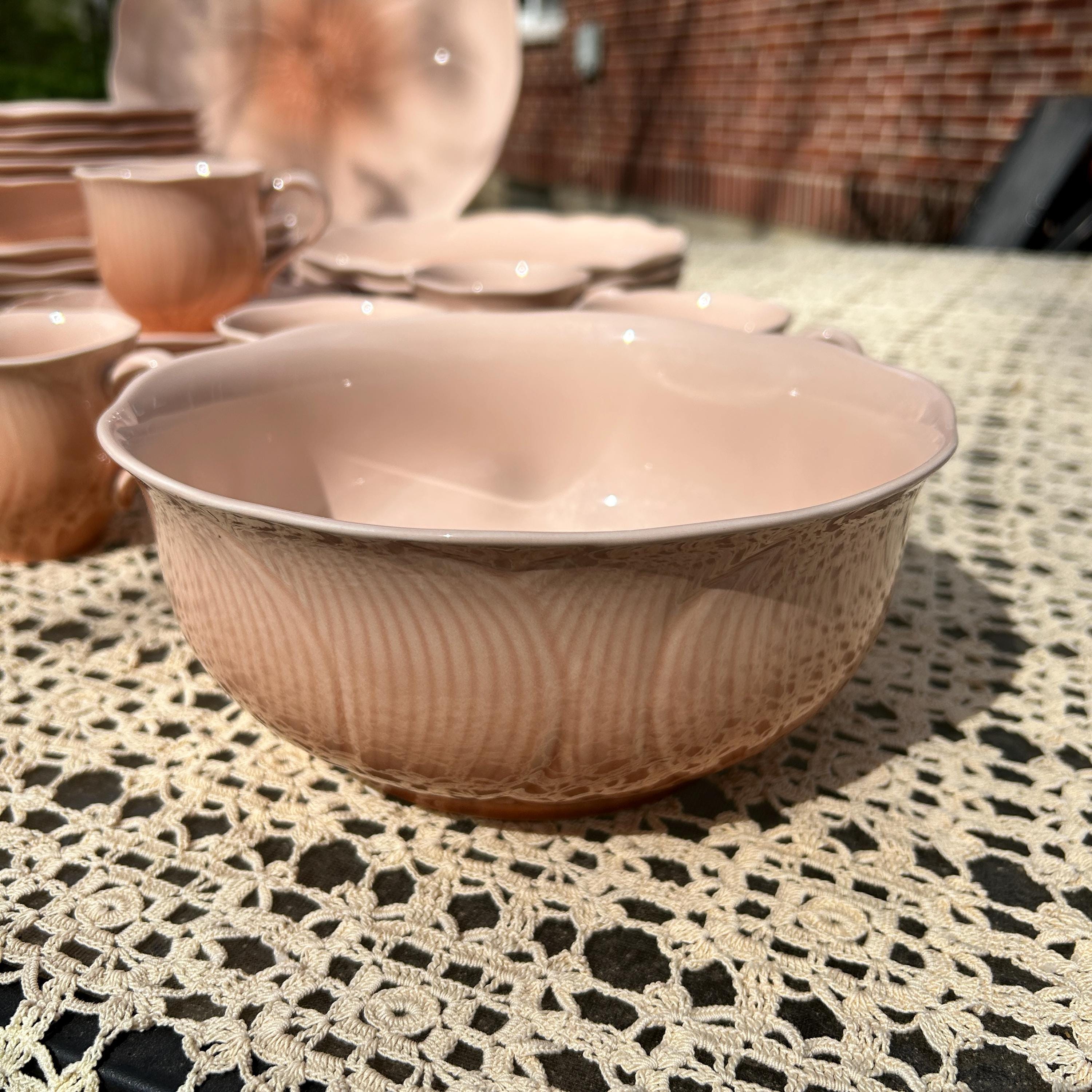 The pattern features an embossed floral design with a shaded pink/peach color. Beautiful for a bridal shower, dinner party, tea party, baby shower, etc. Rare findings and one of a kind patterns.