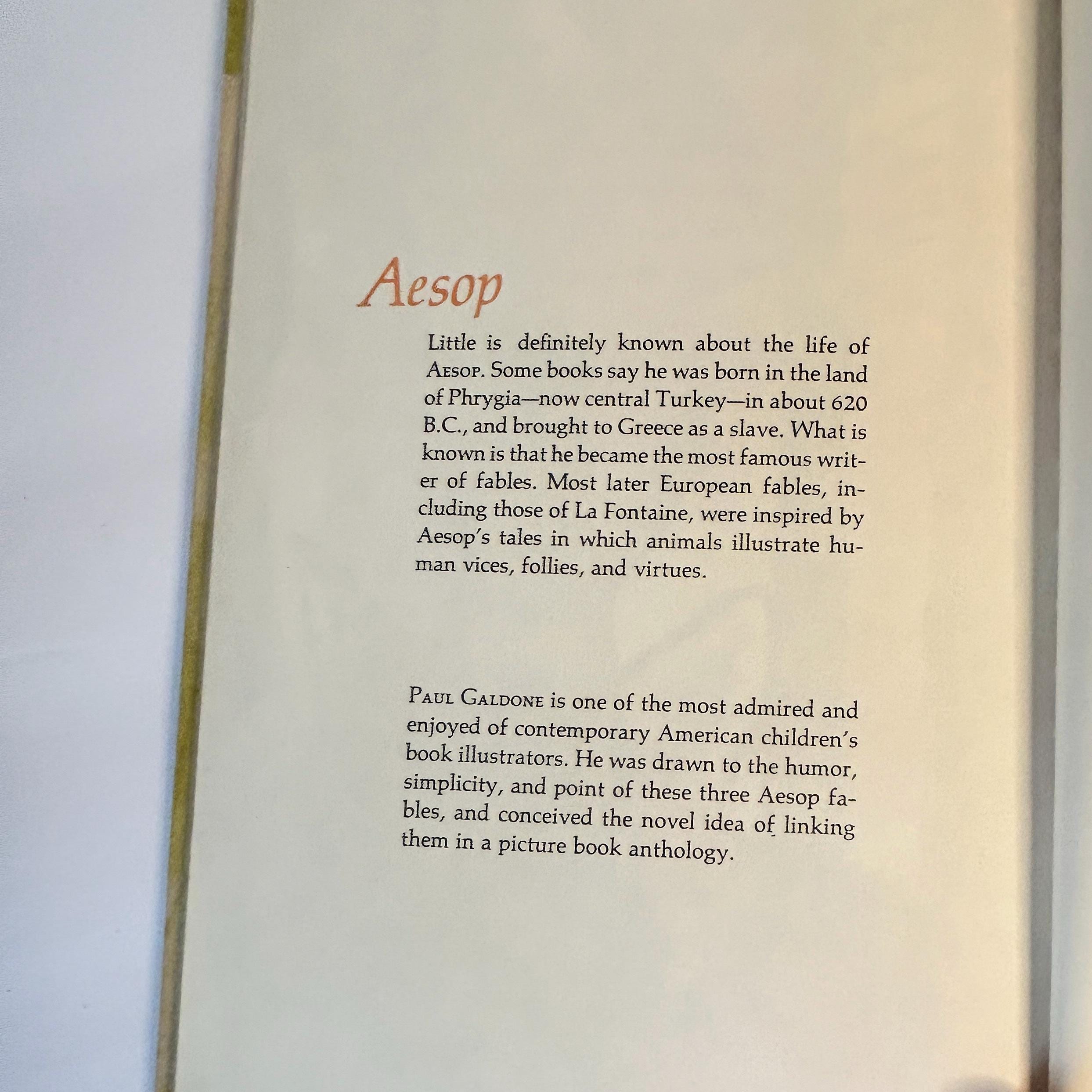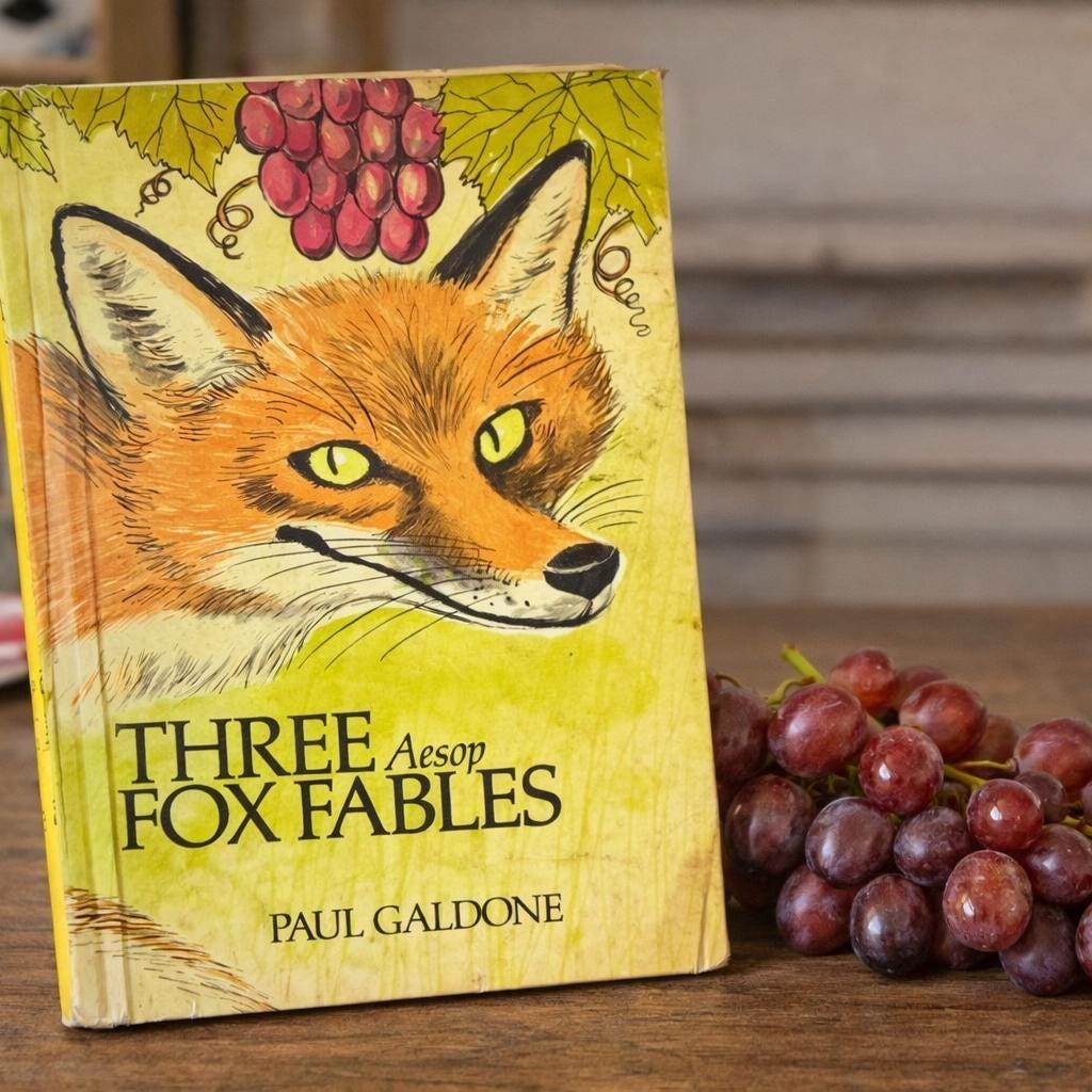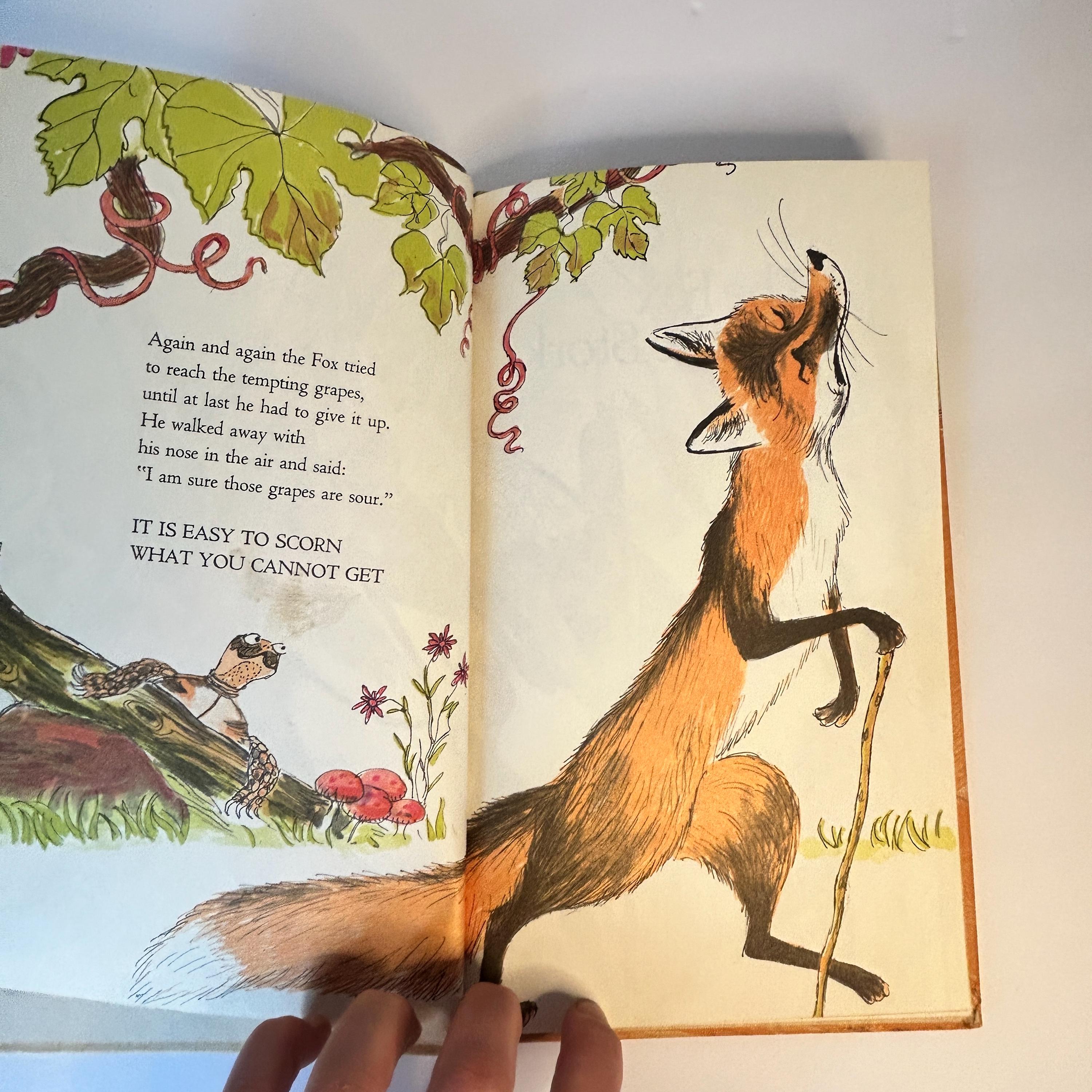 The author/illustrator has cleverly linked three events in the life of a thoroughly untrustworthy Fox (sour grapes, trickery, and flattery) and shows that Fox isn't as smart as he thinks he is.