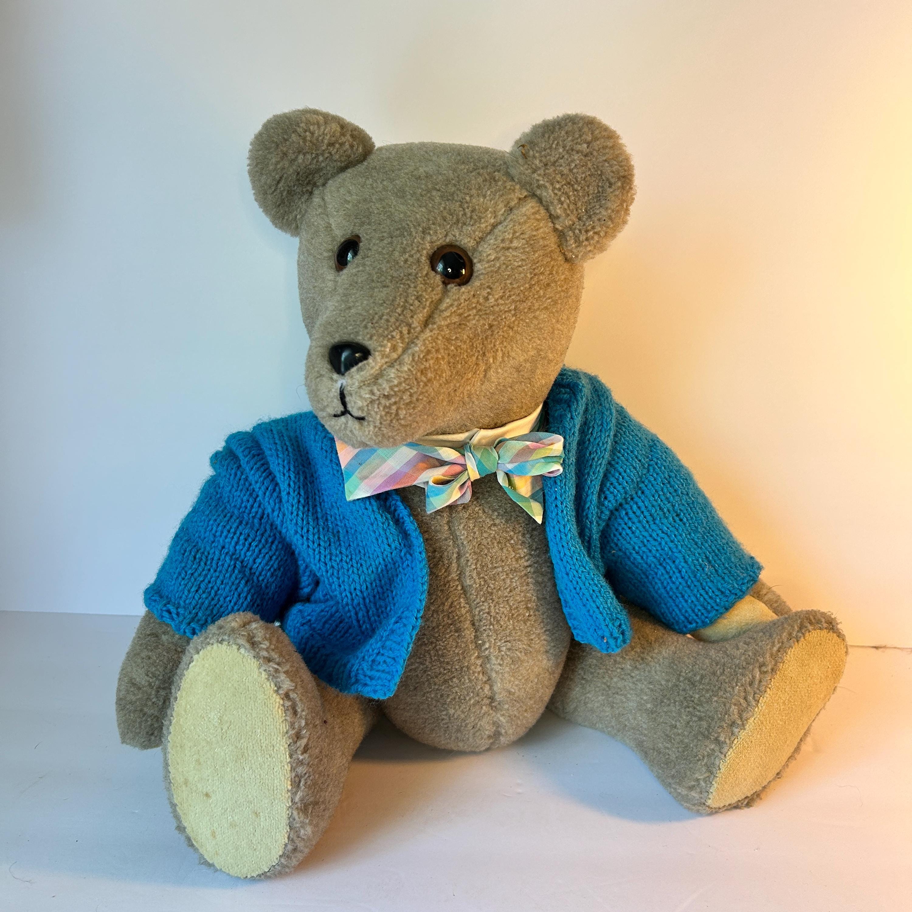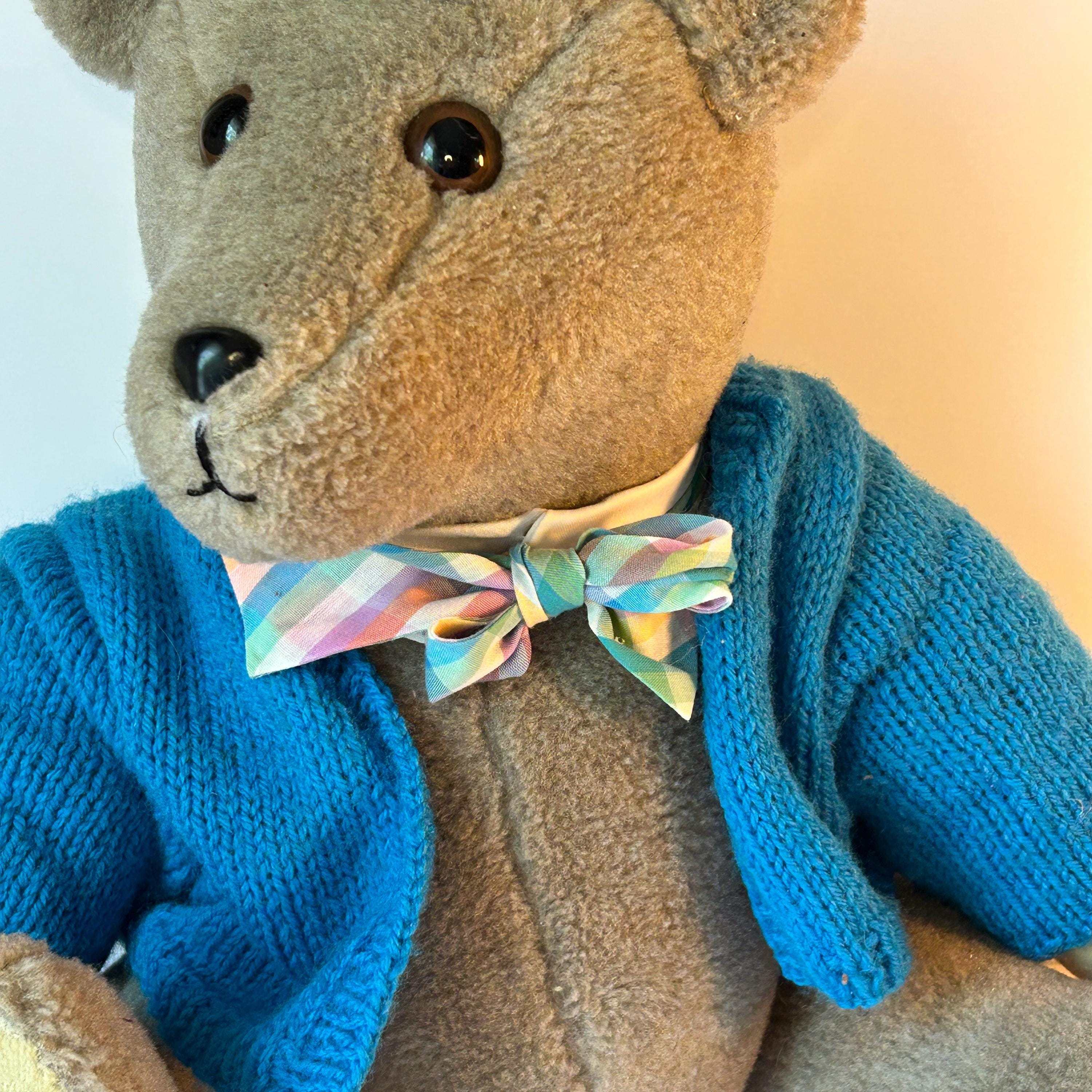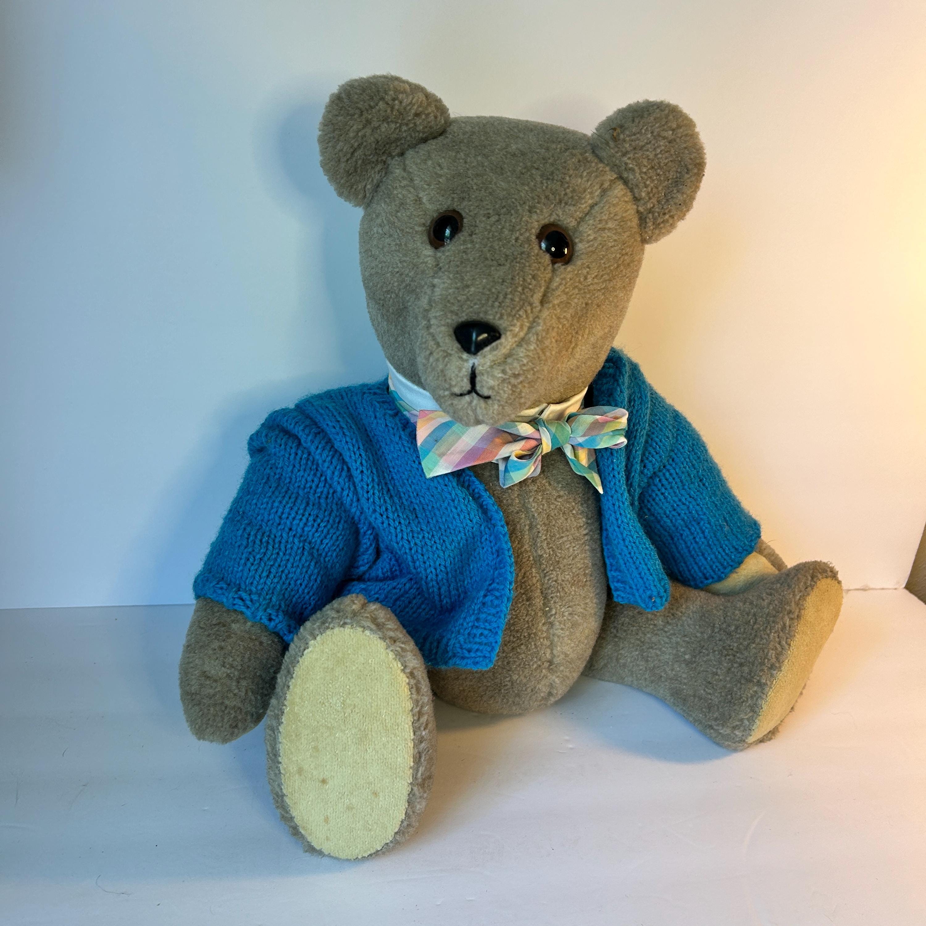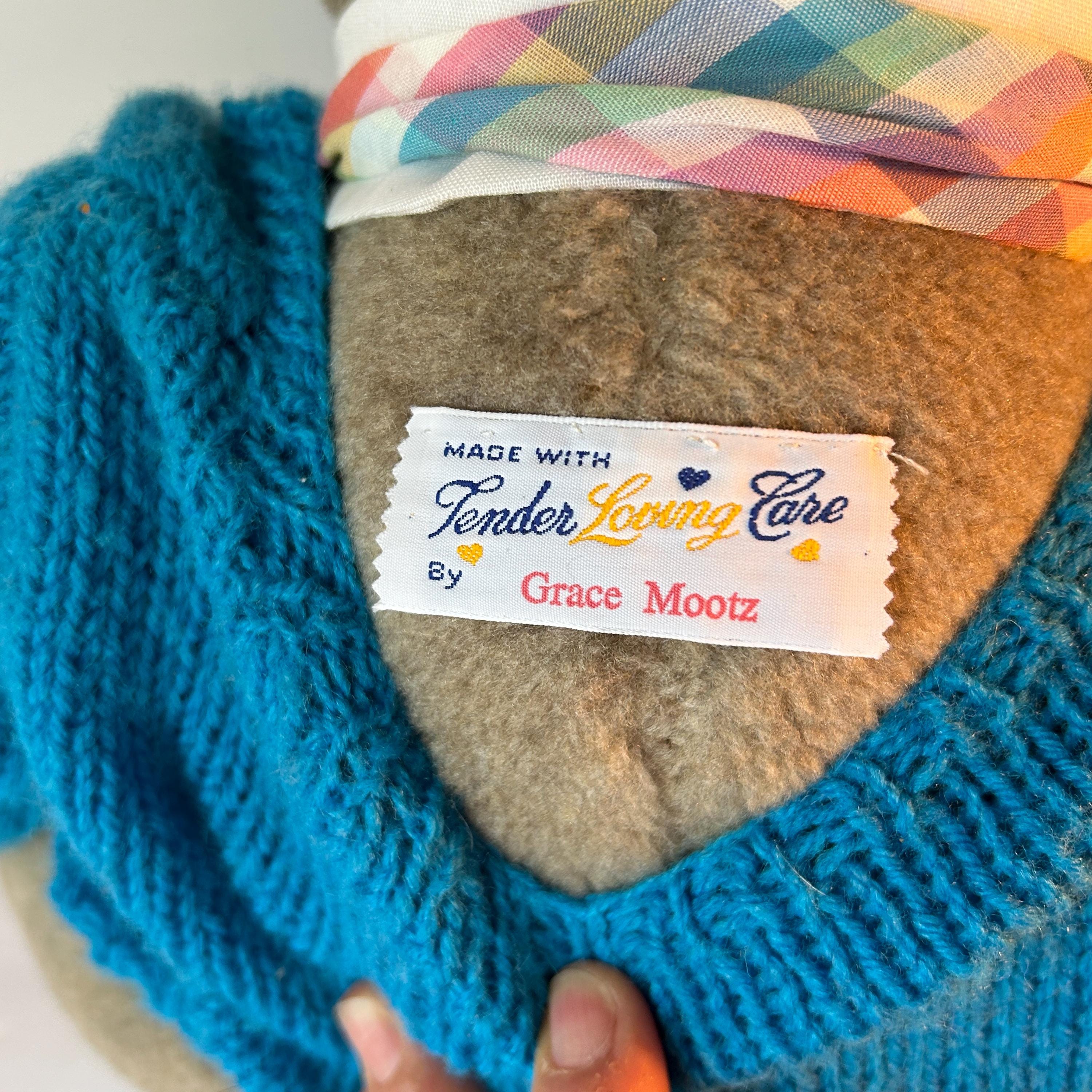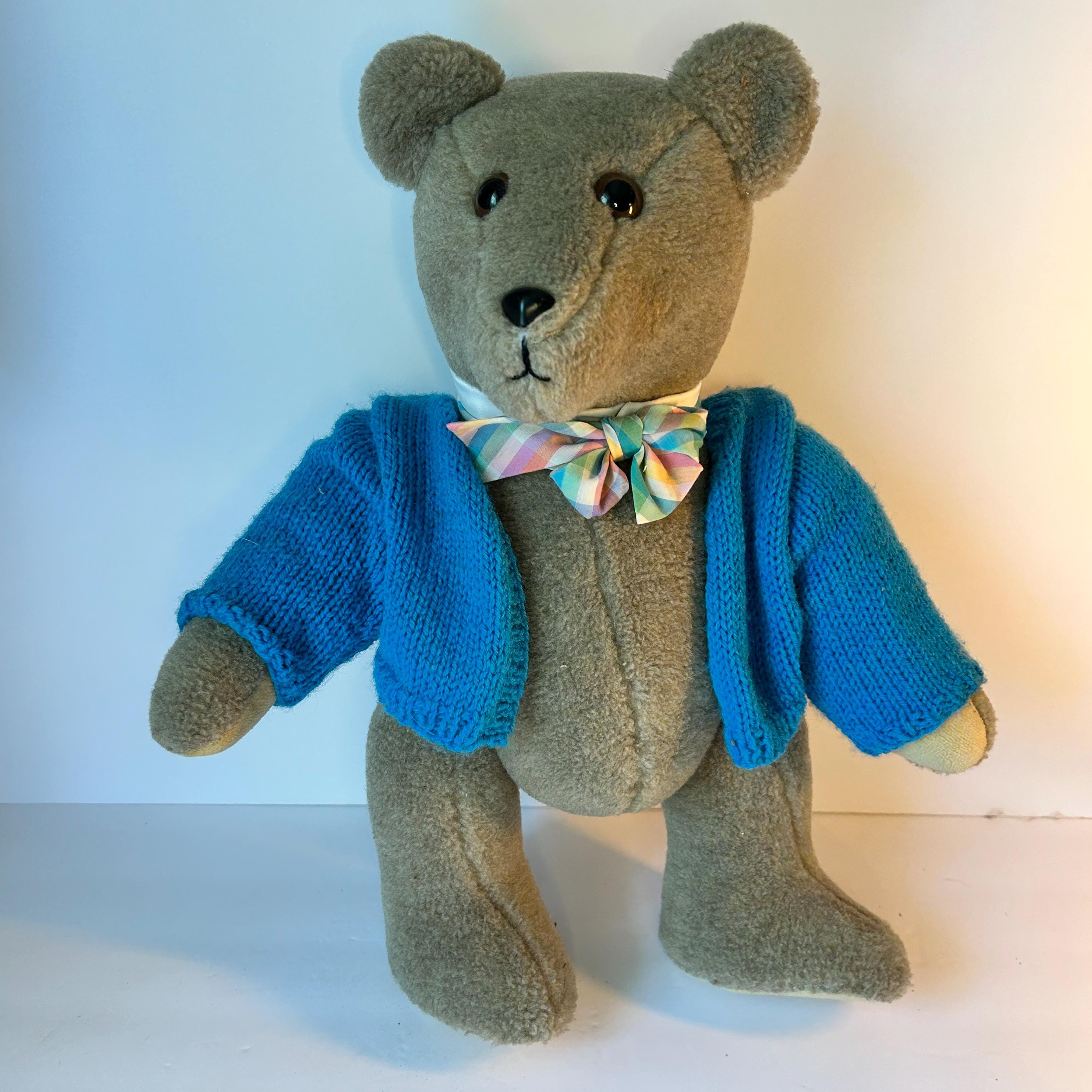 This sweet teddy bear was handmade by Grace Mootz and is in excellent condition. He wears a hand-knitted blue sweater and a white collar with plaid bowtie. So much time must have gone into making this sweet bear. He needs a loving home. Standing, he measures 17" tall and weighs just under two pounds.