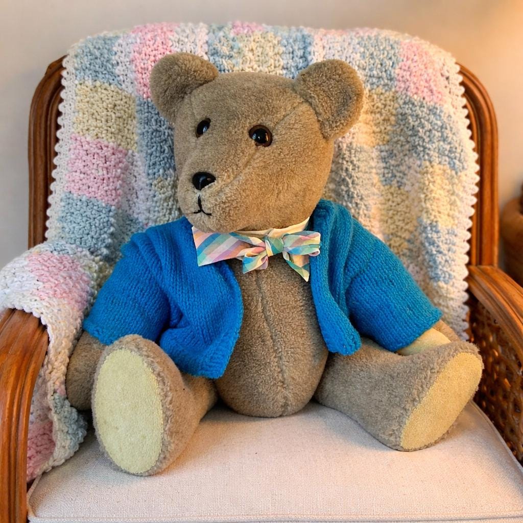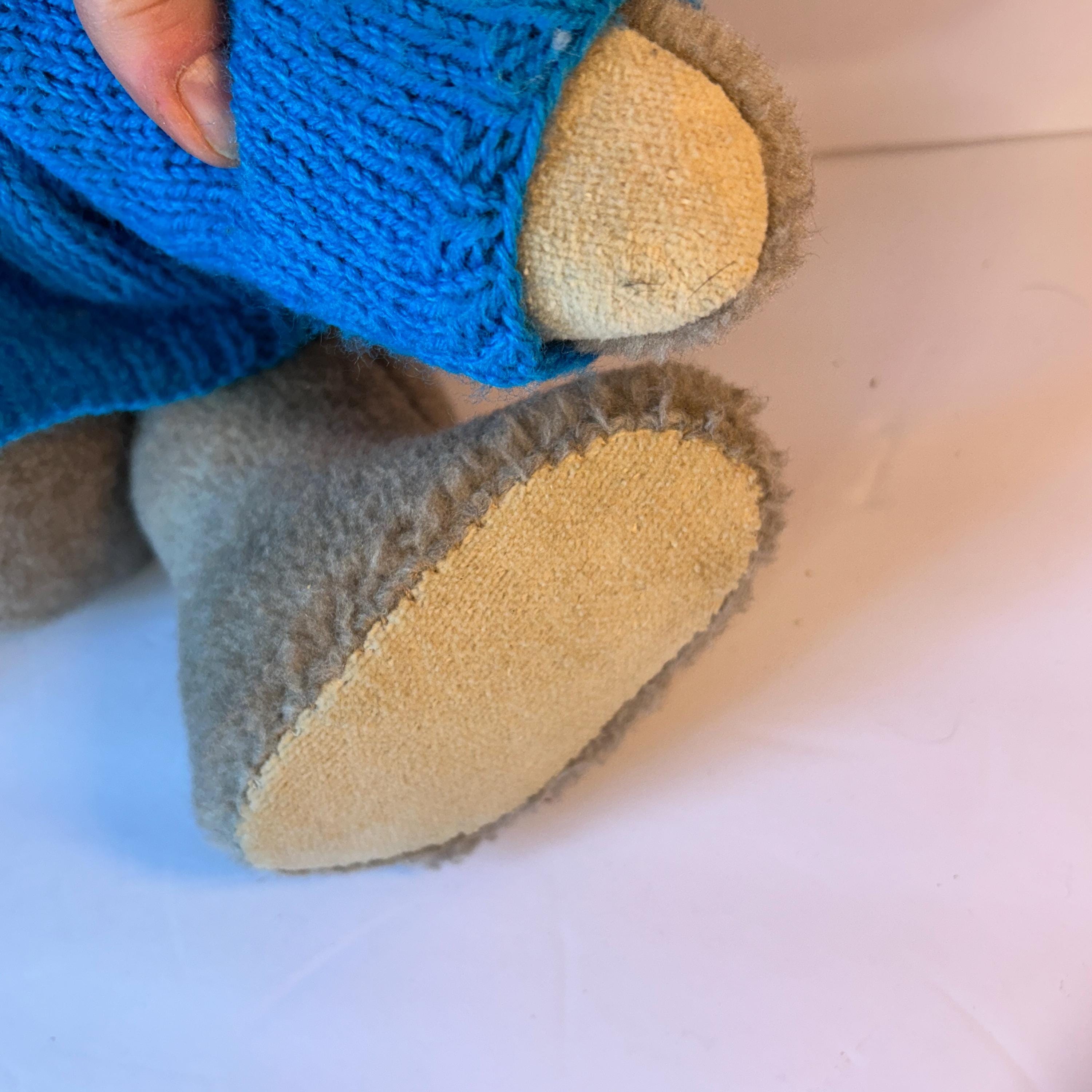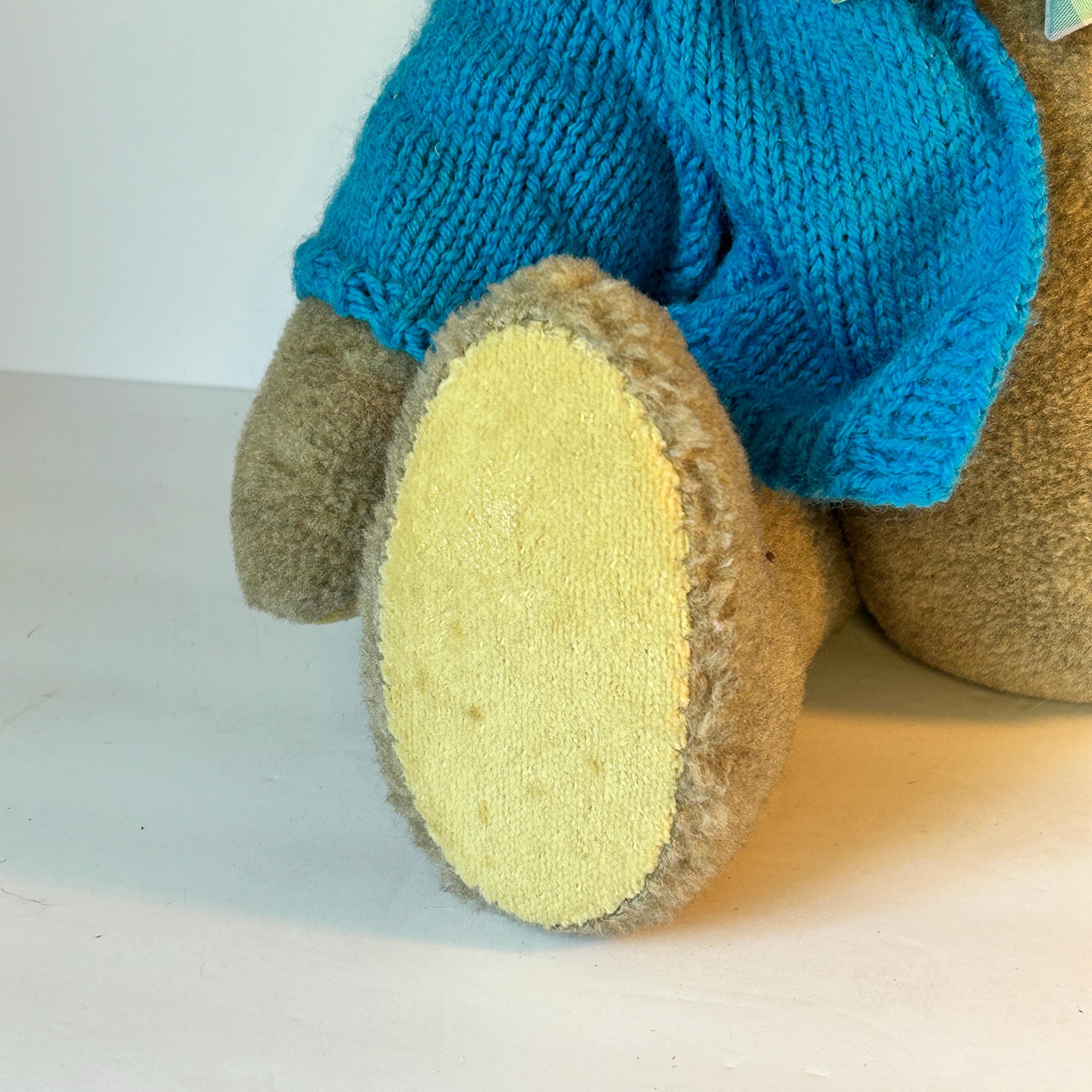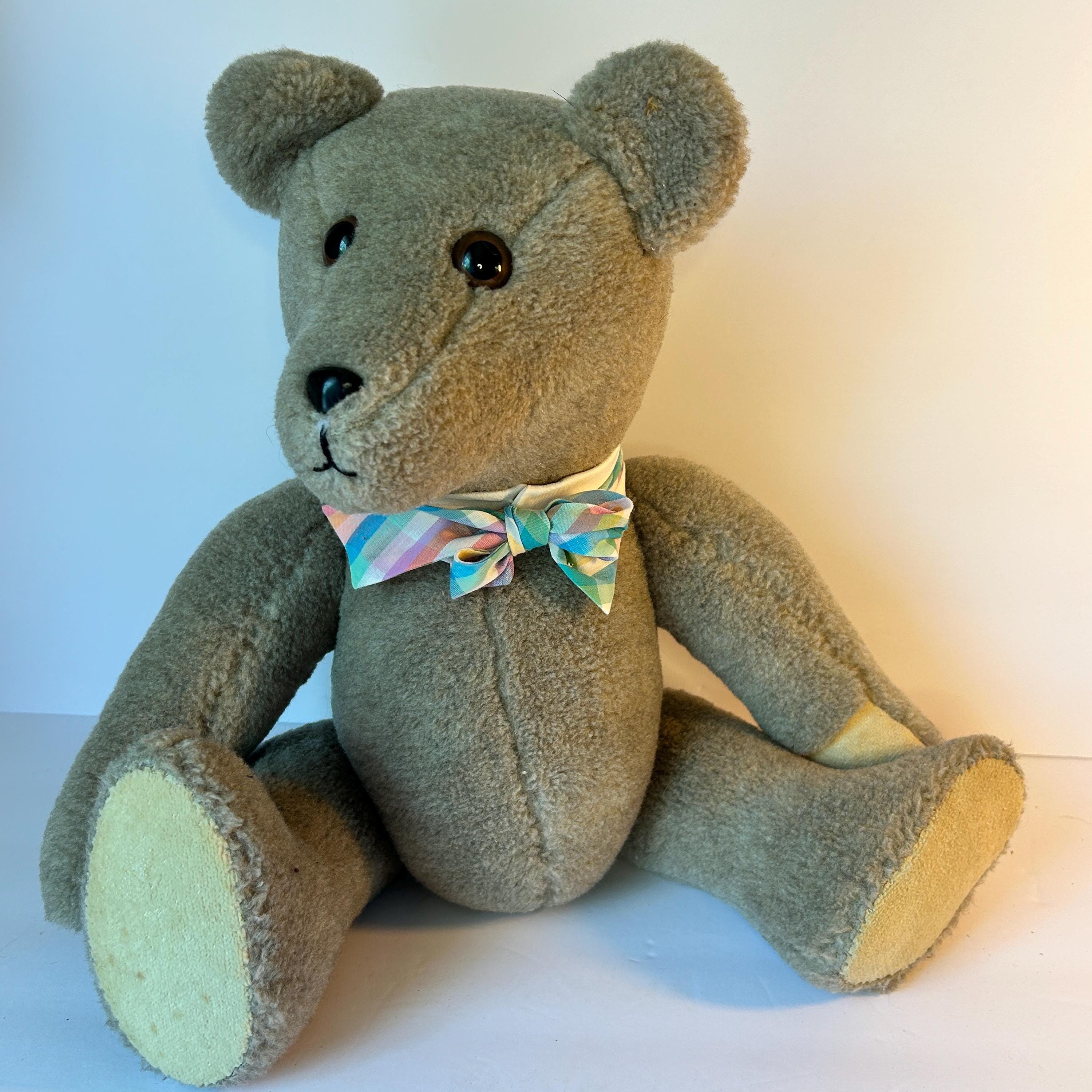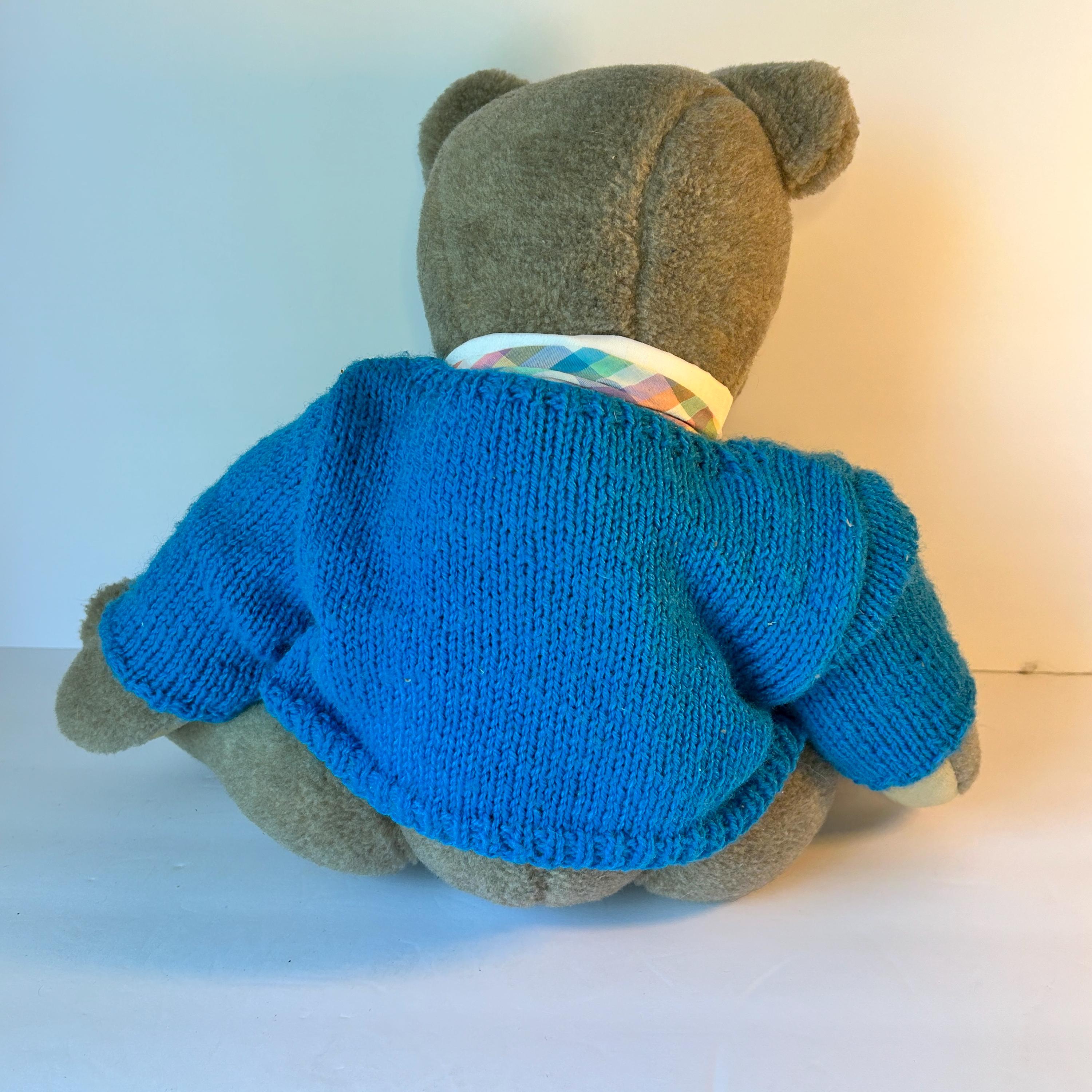 This sweet teddy bear was handmade by Grace Mootz and is in excellent condition. He wears a hand-knitted blue sweater and a white collar with plaid bowtie. So much time must have gone into making this sweet bear. He needs a loving home. Standing, he measures 17" tall and weighs just under two pounds.