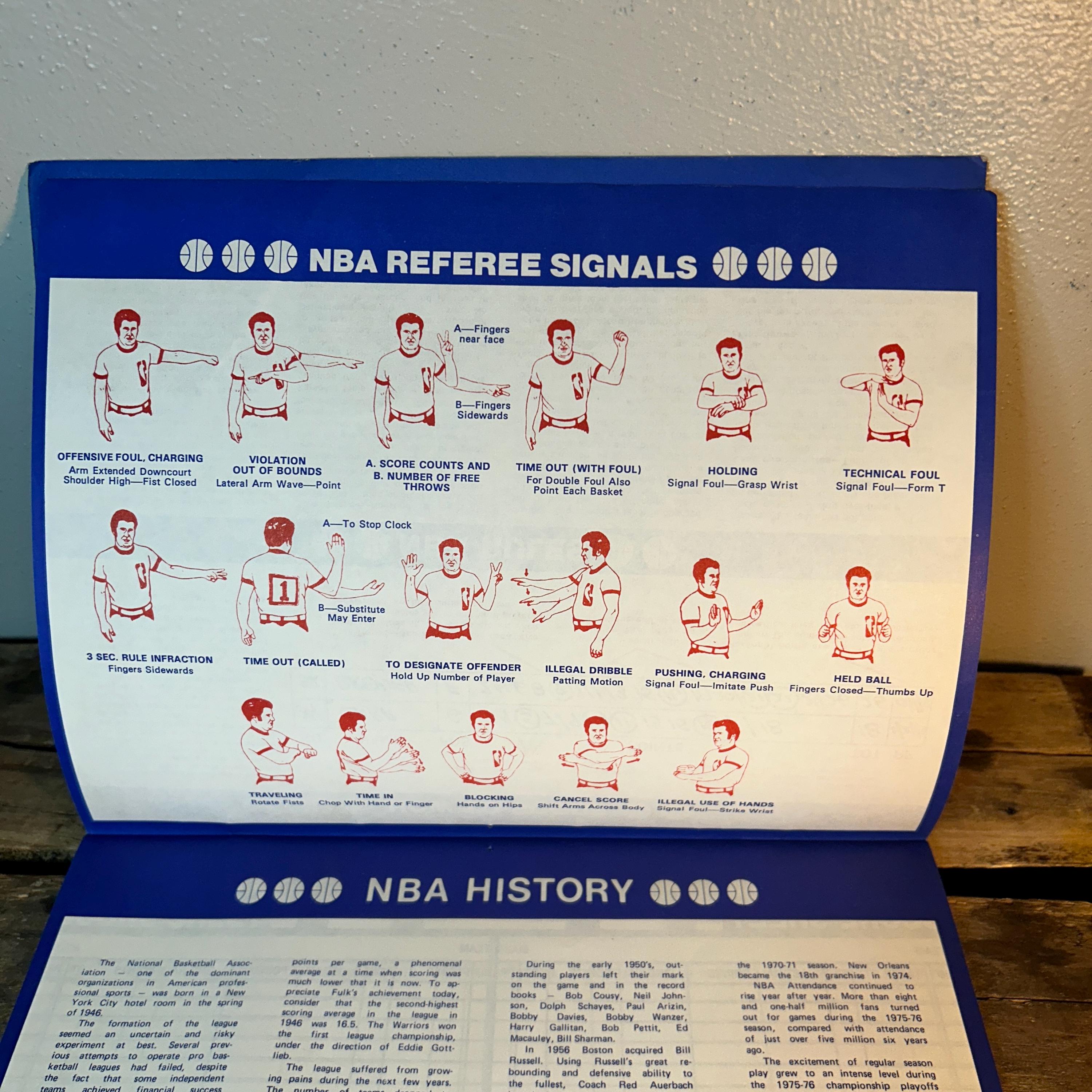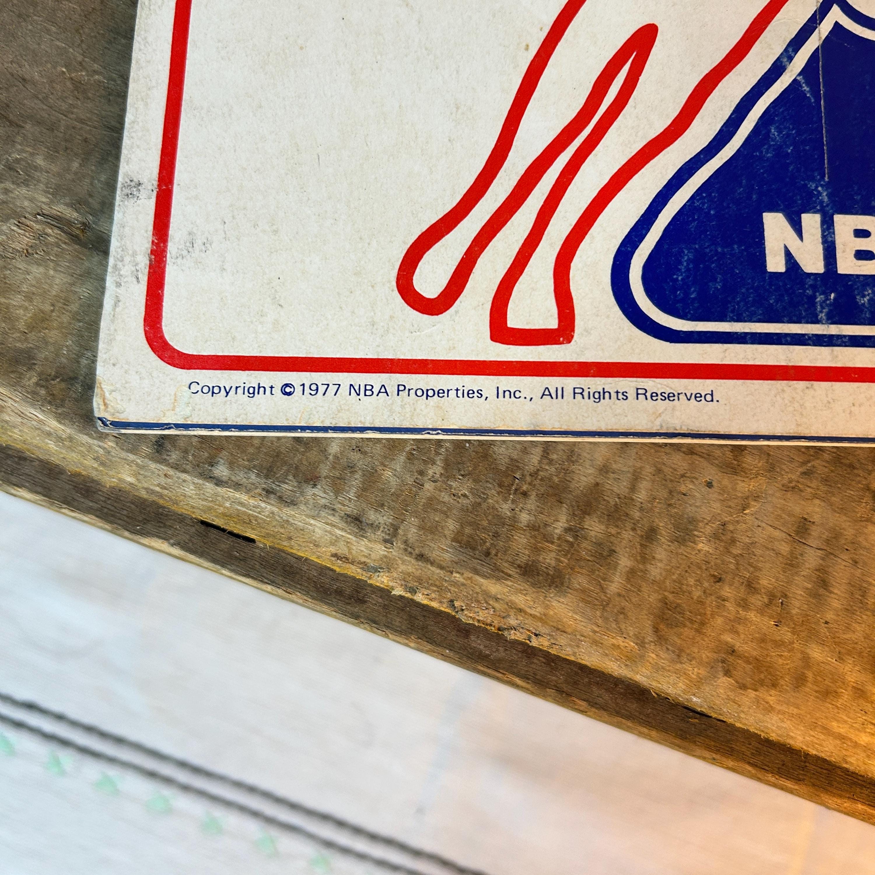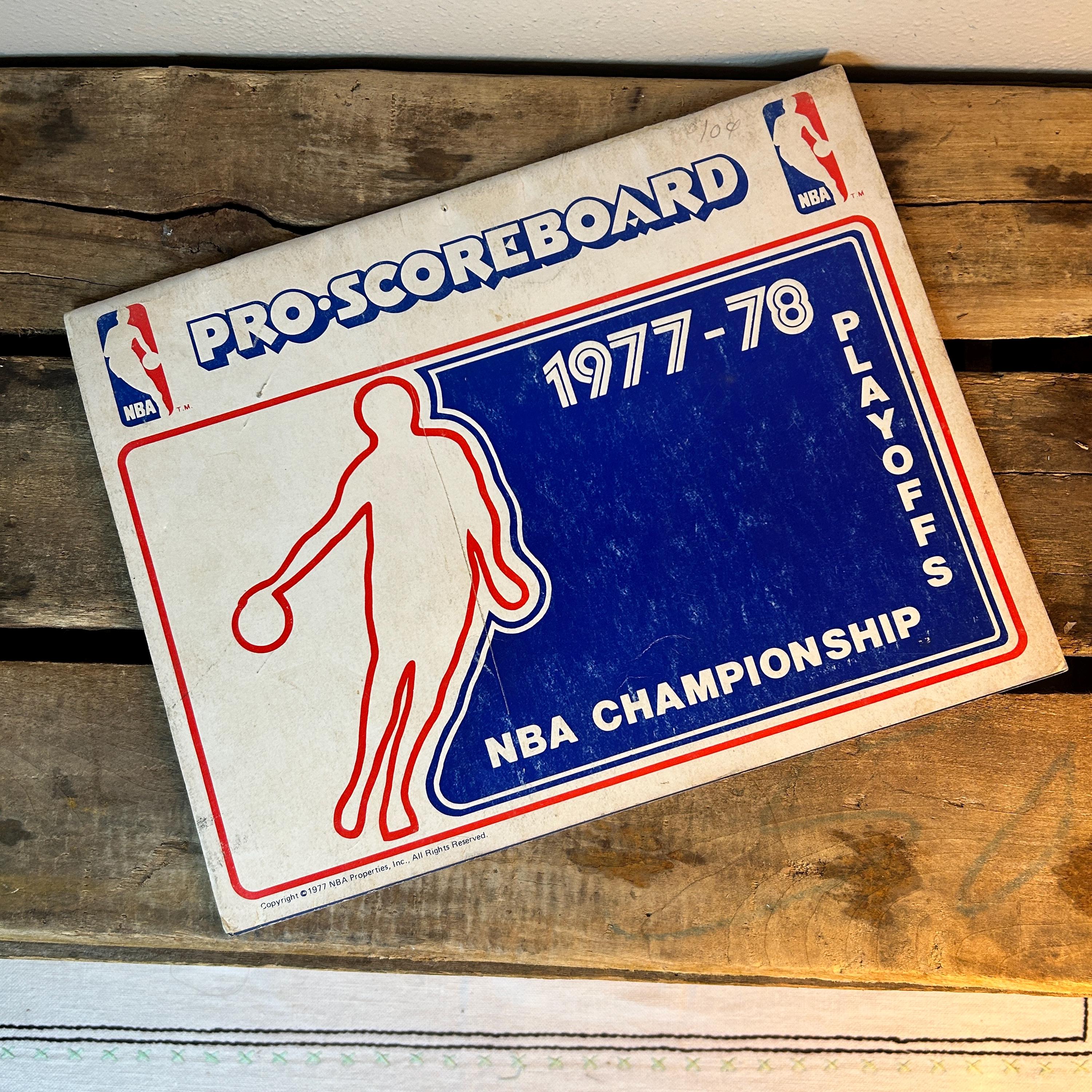 Vintage "Pro-Scoreboard" NBA scorebook from the 1977-78 season, focusing on the playoffs and NBA Championship. The cover features a red, white, and blue design with the NBA logo and a silhouette of a basketball player. A collectible item for basketball fans and sports memorabilia enthusiasts. The scorebook was copyrighted in 1977 by NBA Properties, Inc.
