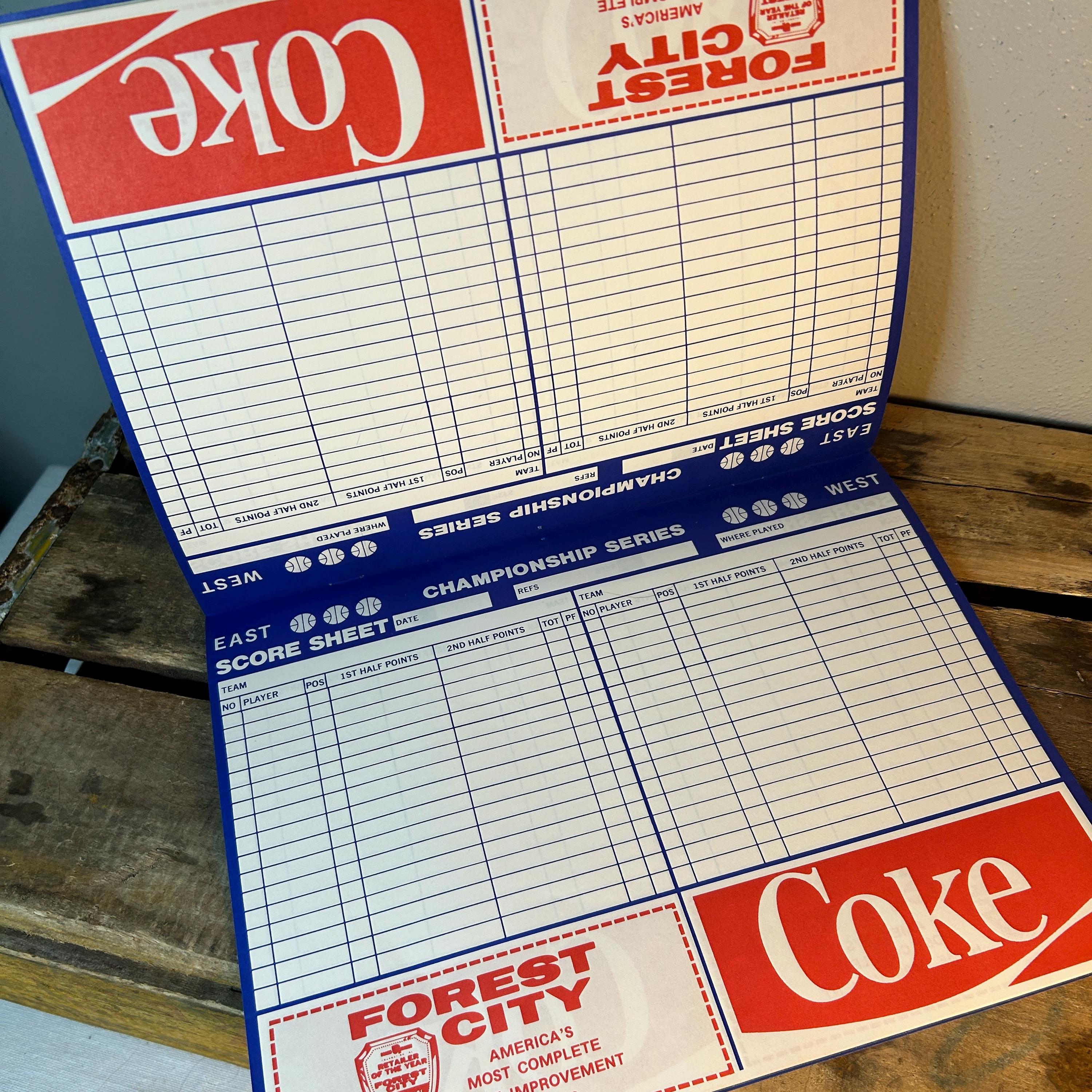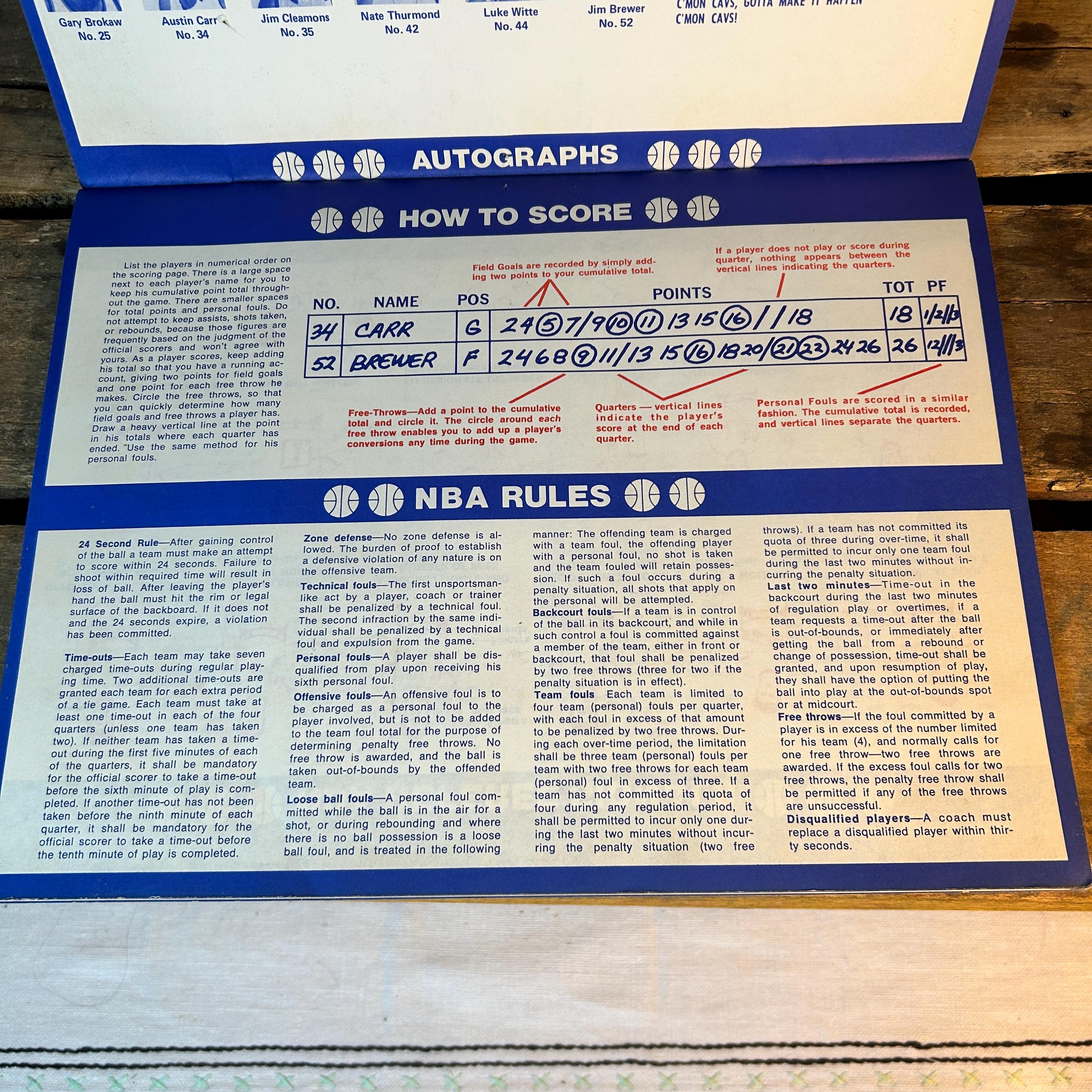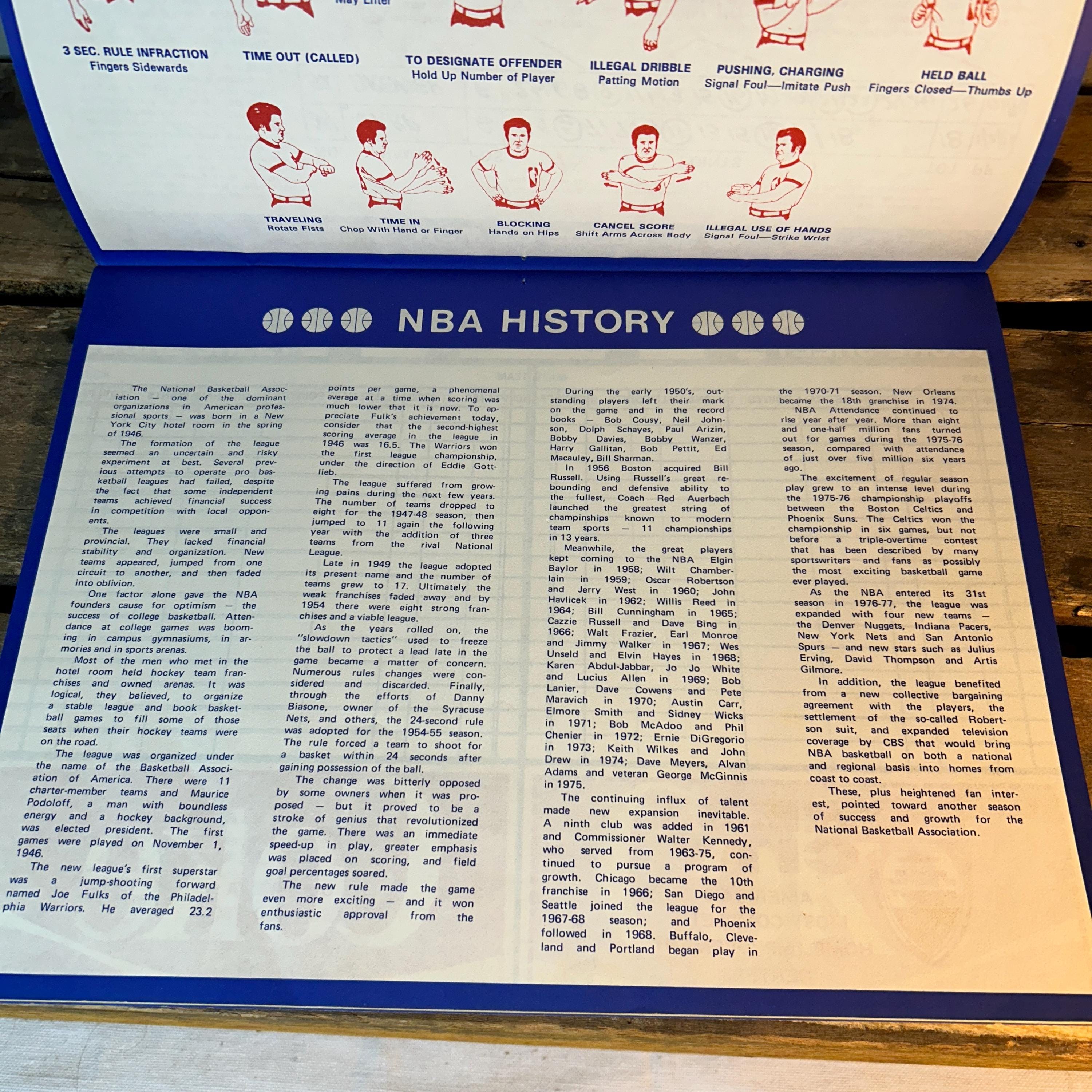 Vintage "Pro-Scoreboard" NBA scorebook from the 1977-78 season, focusing on the playoffs and NBA Championship. The cover features a red, white, and blue design with the NBA logo and a silhouette of a basketball player. A collectible item for basketball fans and sports memorabilia enthusiasts. The scorebook was copyrighted in 1977 by NBA Properties, Inc.
