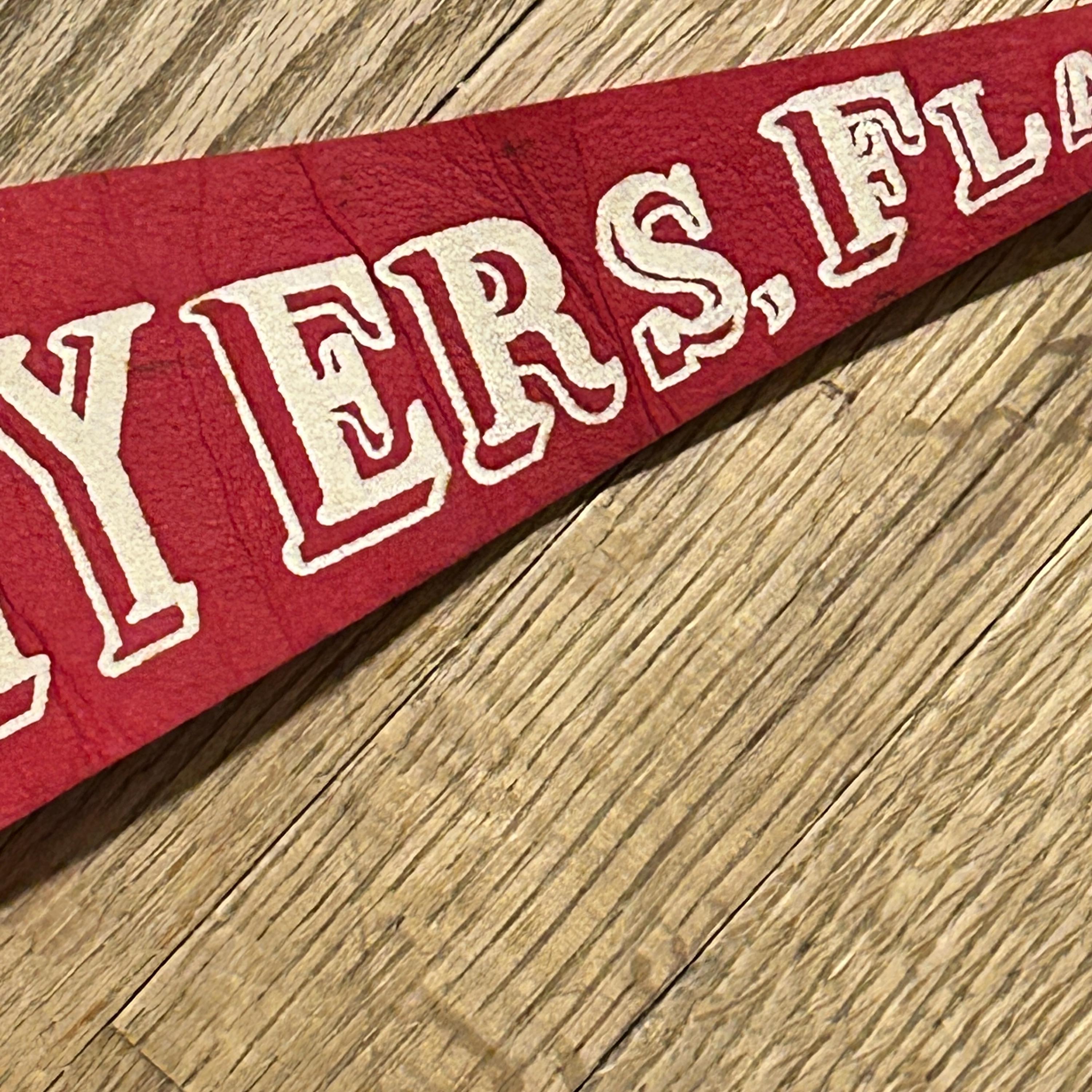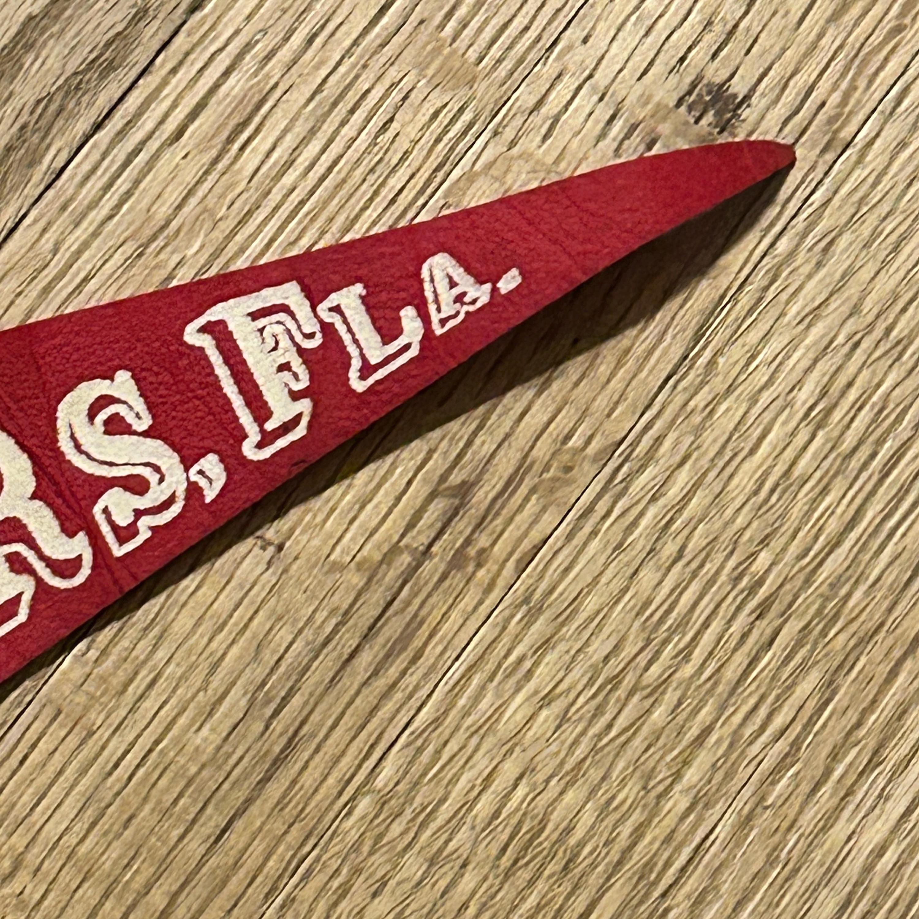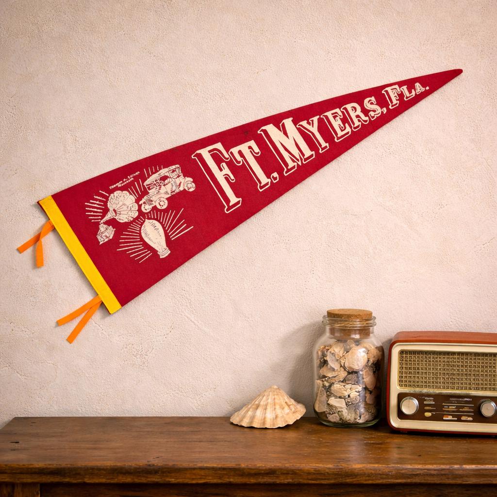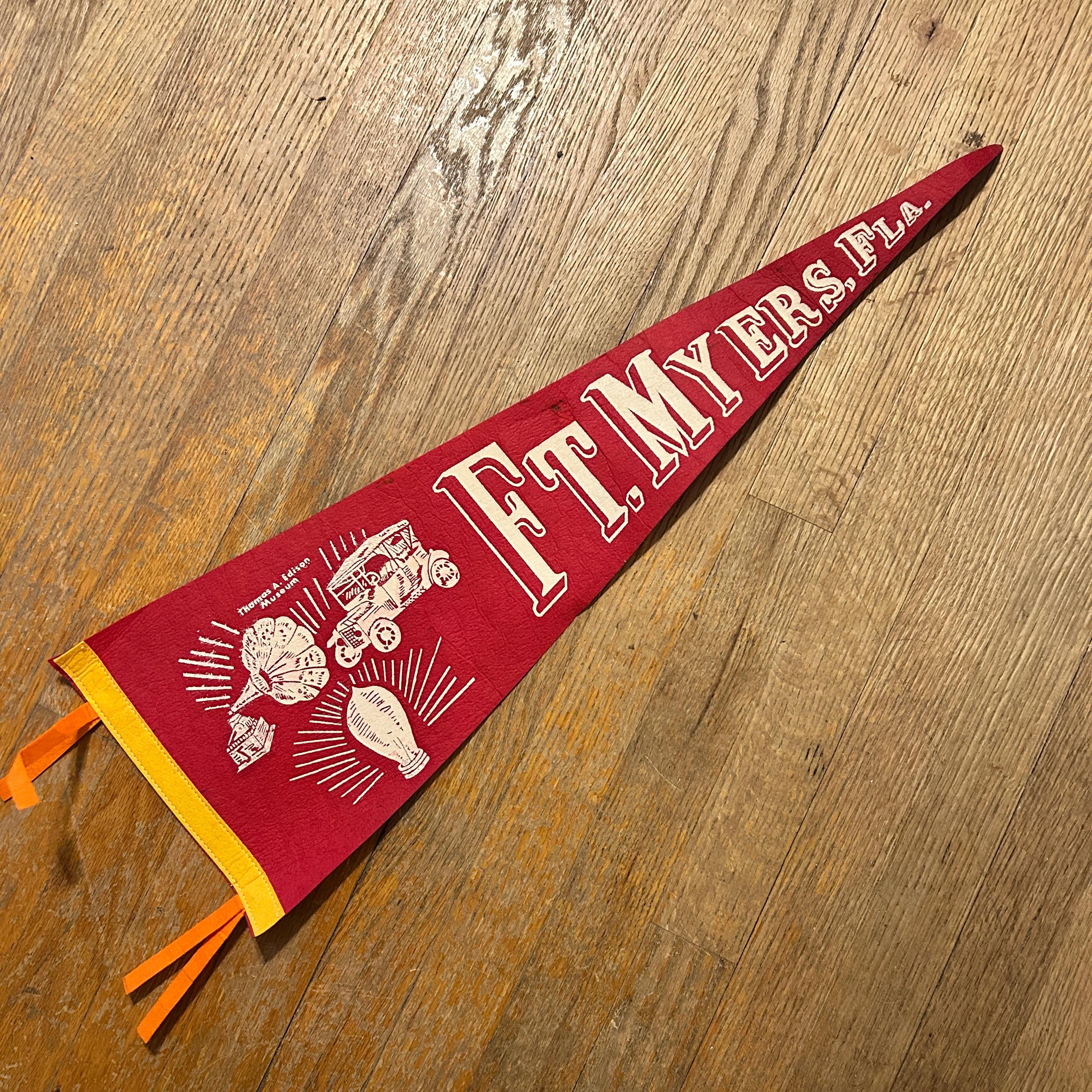 Wool felt pennant featuring a picture of landmarks, attractions, and historical references next to FT. MYERS, FLA., a souvenir of Fort Myers. Shown are the phonograph, antique car, lightbulb and i has THOMAS A. EDISON MUSEUM at the top. The base color of the pennant is dark red. The pennant has a yellow end strip that is still bright with orange tassels. Felt is soft and flexible. The pennant measures 26 1/2 inches long by 8 1/2 inches high at the widest end. EXCELLENT CONDITION! No tears or cracking. There is one small spot above the T. See all photos as they are part of the description.