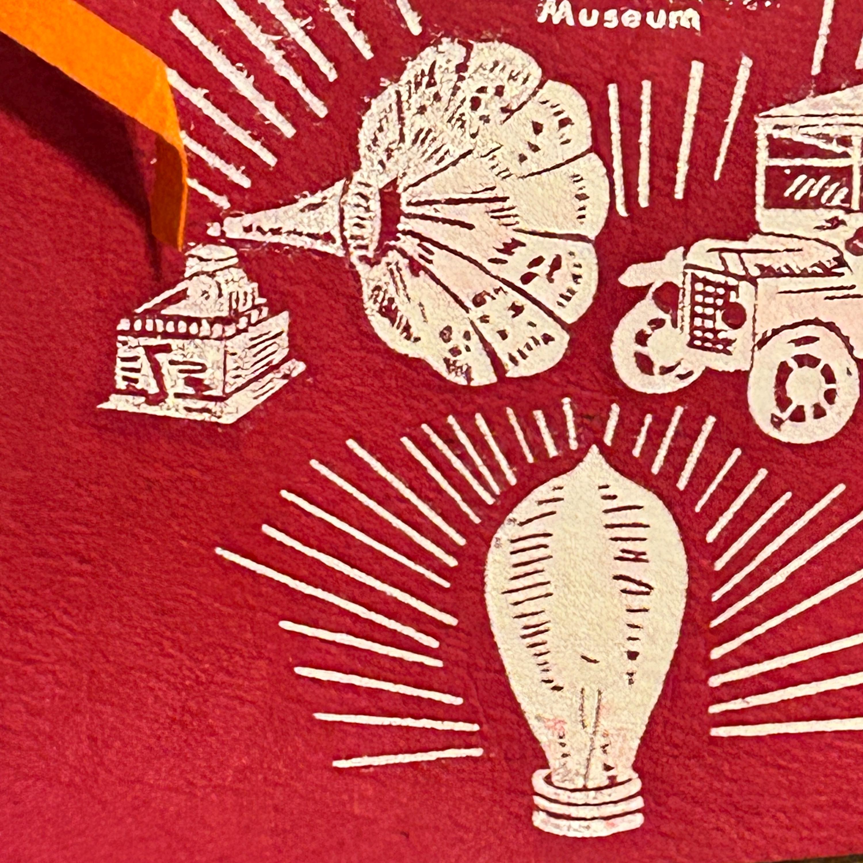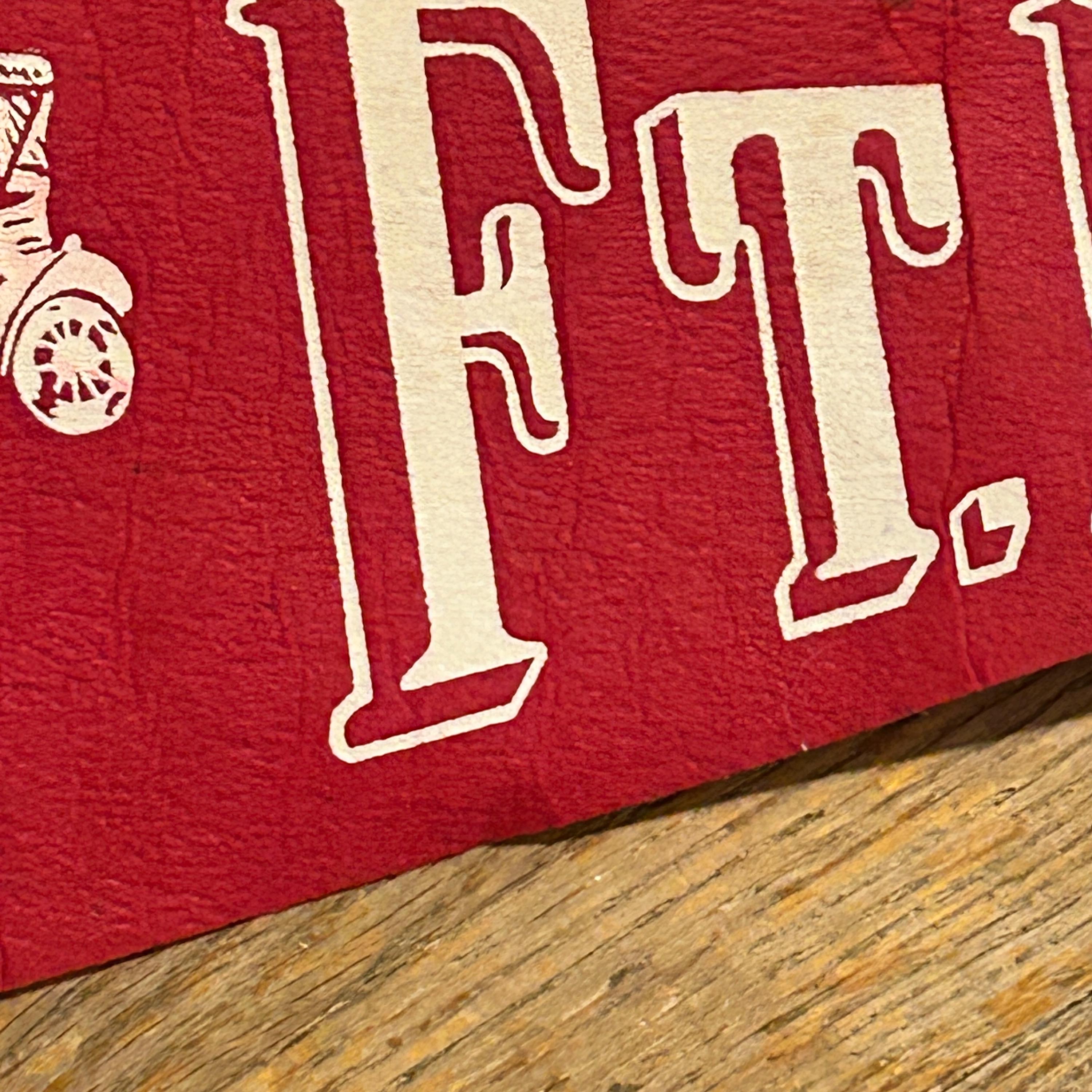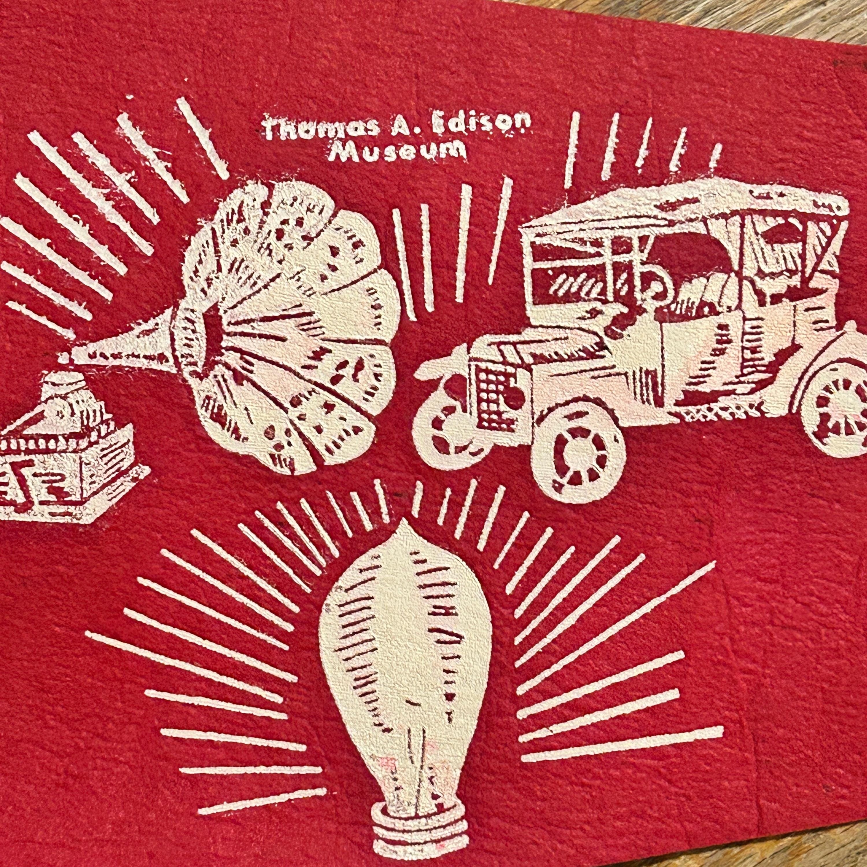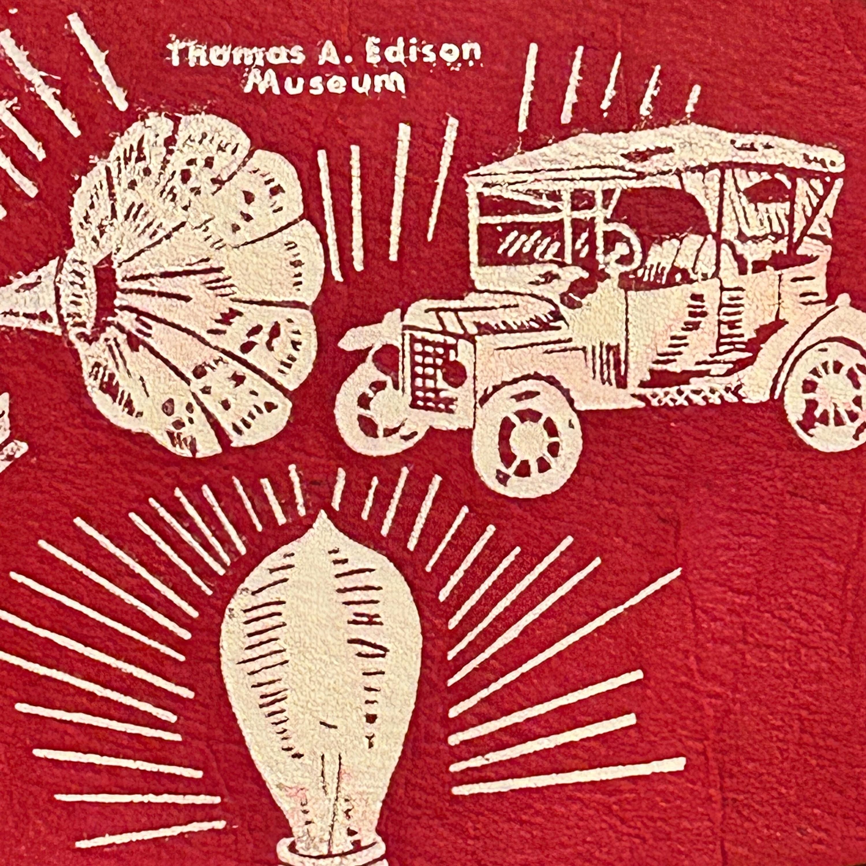 Wool felt pennant featuring a picture of landmarks, attractions, and historical references next to FT. MYERS, FLA., a souvenir of Fort Myers. Shown are the phonograph, antique car, lightbulb and i has THOMAS A. EDISON MUSEUM at the top. The base color of the pennant is dark red. The pennant has a yellow end strip that is still bright with orange tassels. Felt is soft and flexible. The pennant measures 26 1/2 inches long by 8 1/2 inches high at the widest end. EXCELLENT CONDITION! No tears or cracking. There is one small spot above the T. See all photos as they are part of the description.