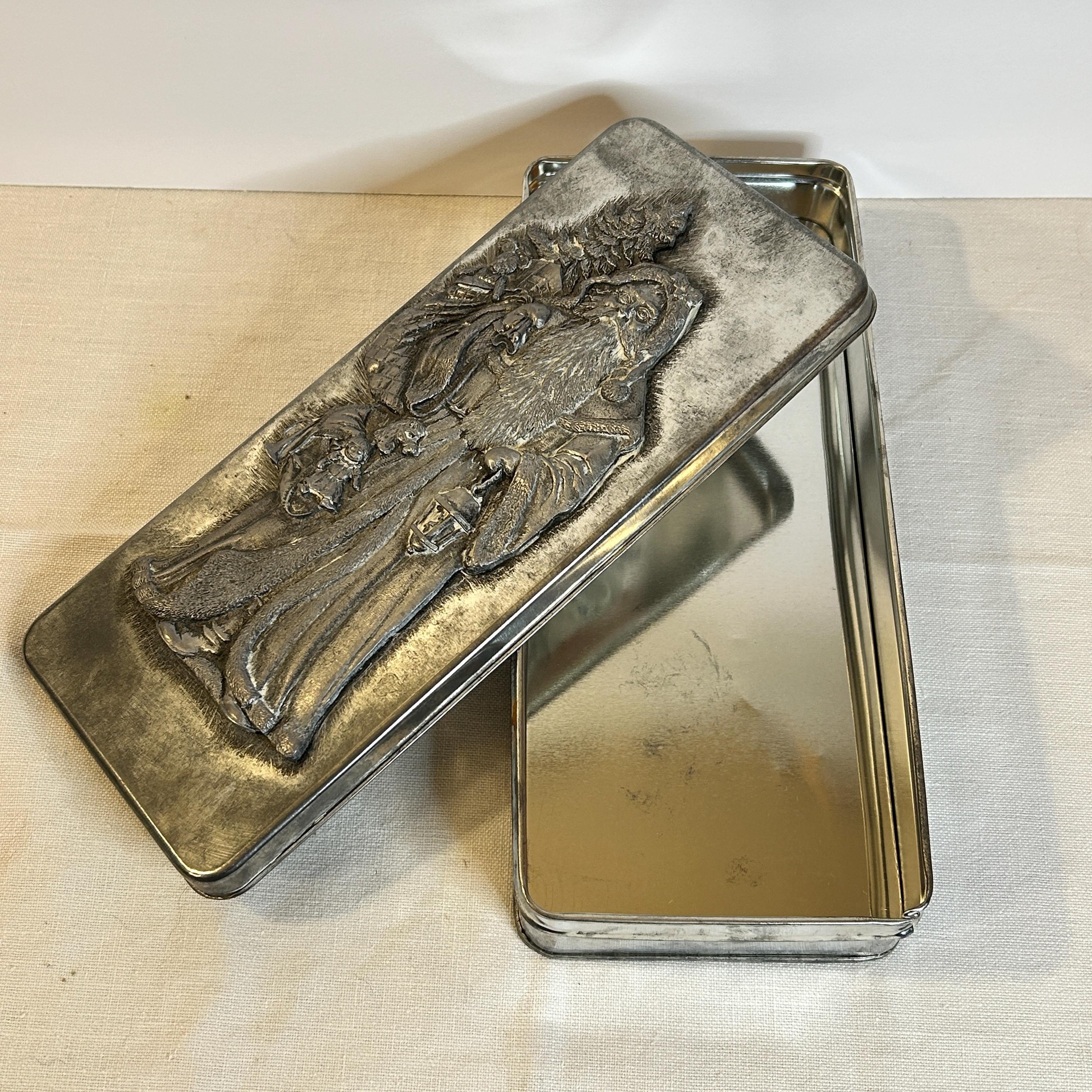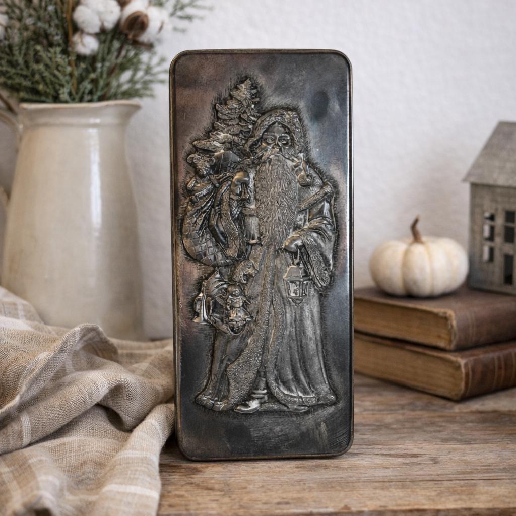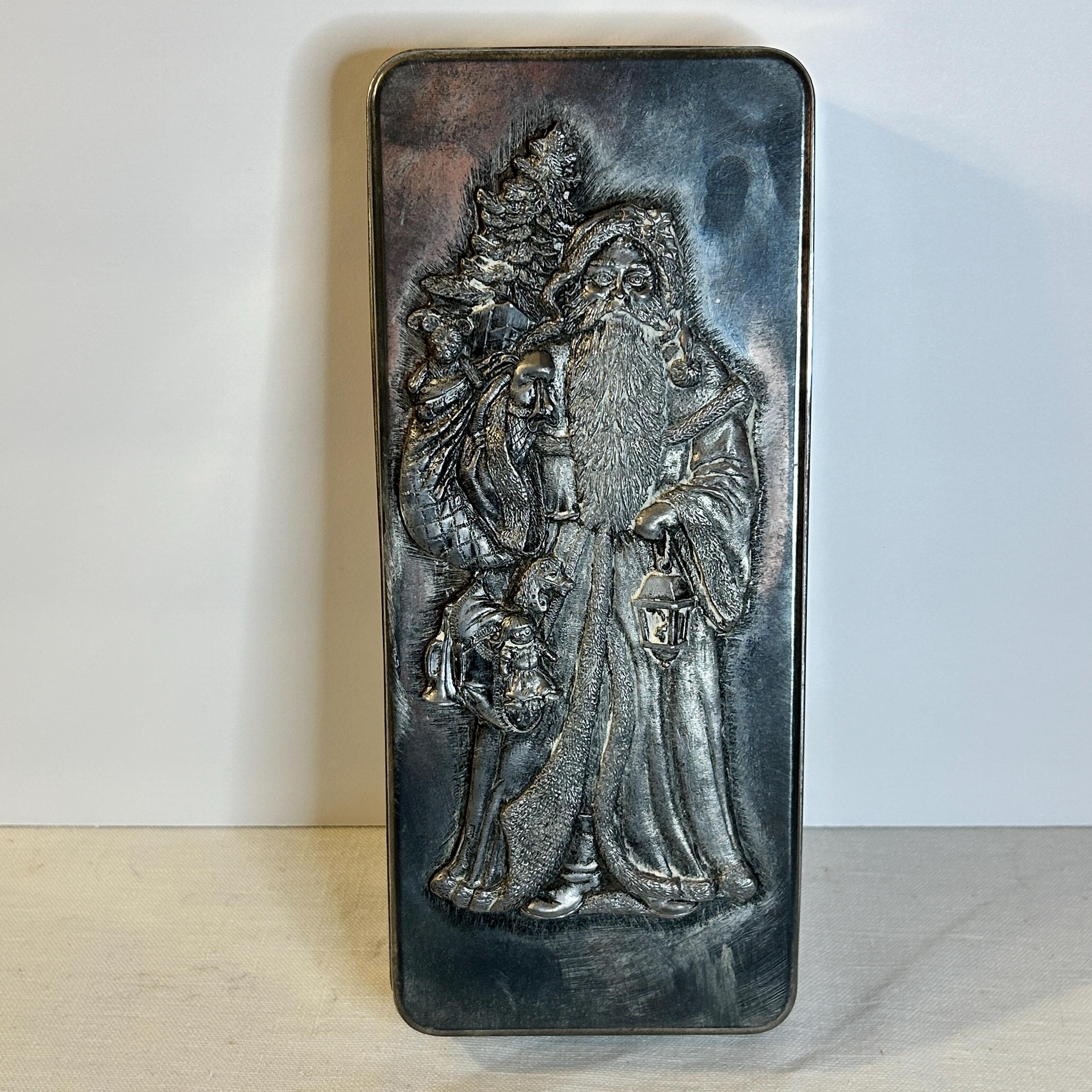 This vintage rectangle Metzke pewter holiday Santa Tin is remarkable.