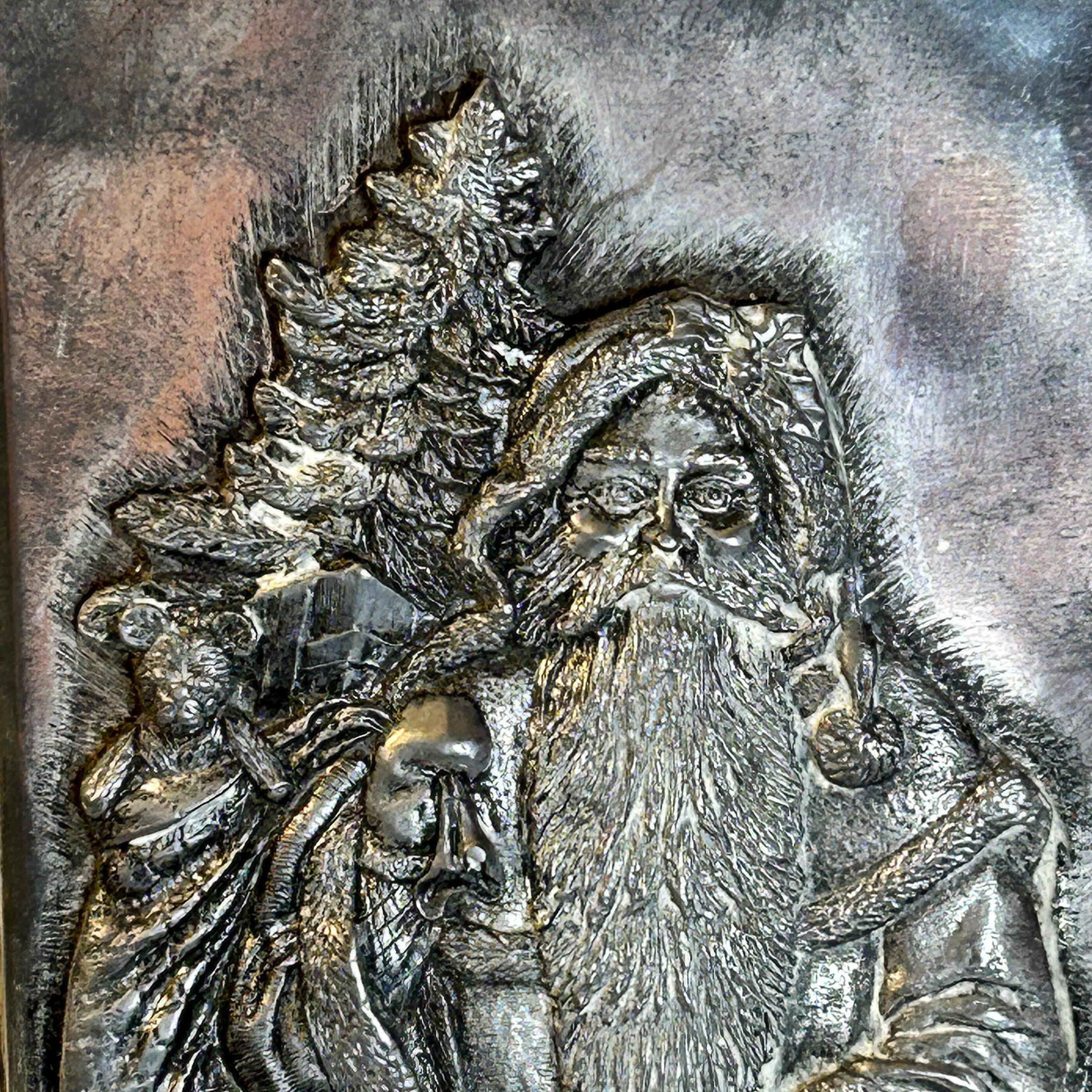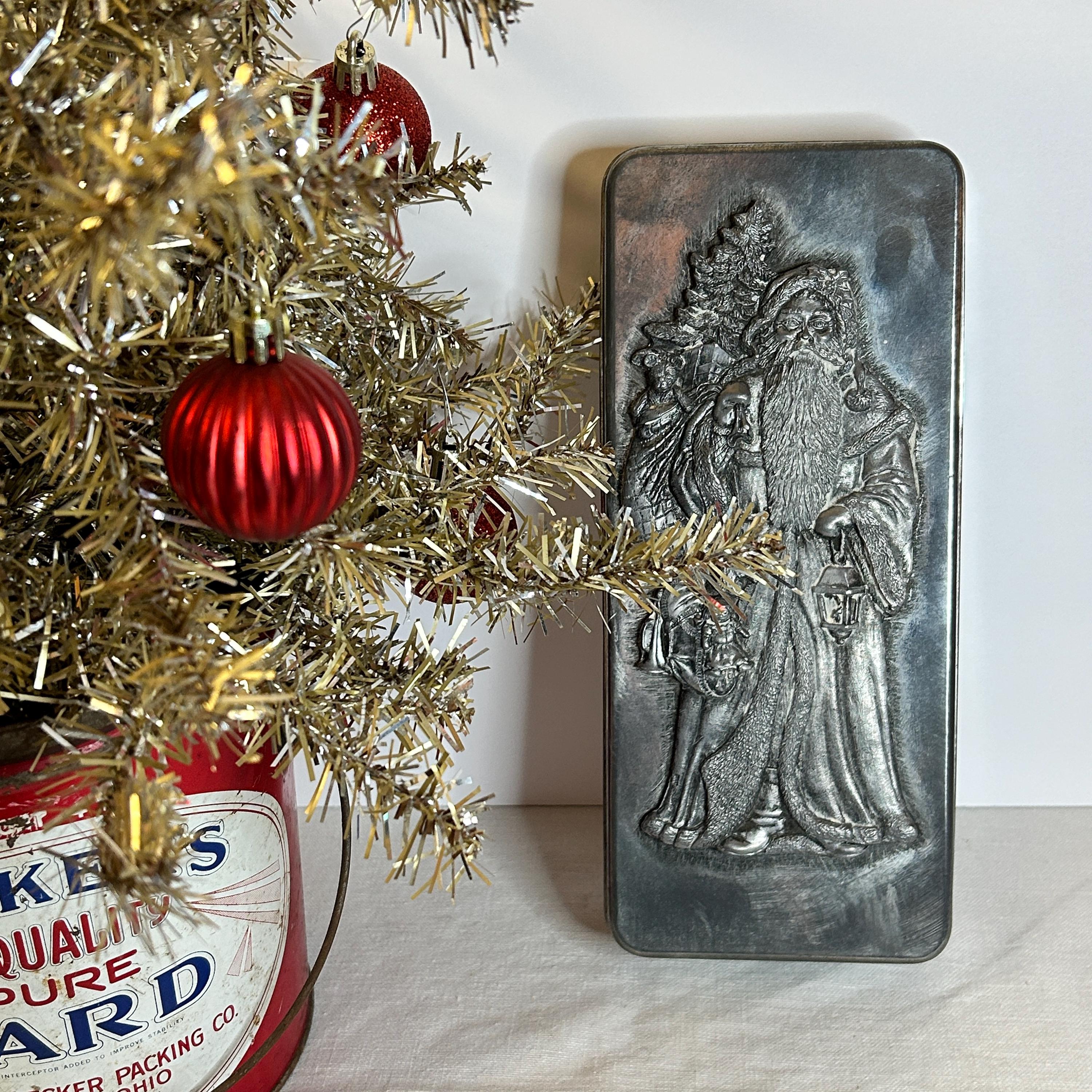 Vintage Metzke pewter tin featuring Santa Claus. While a specific production date for this particular piece isn't available, Metzke has been in operation since 1978. Pewter items, like this one, were commonly produced from tin alloyed with lead, and sometimes copper, with older pieces having a higher lead content which causes them to tarnish faster and have a darker, silver-gray oxidation. The design of Santa Claus as depicted on the tin is reminiscent of illustrations from the 19th century, particularly those by Thomas Nast, who popularized the red-suited Santa in his Harper's Weekly cartoons starting in 1862.