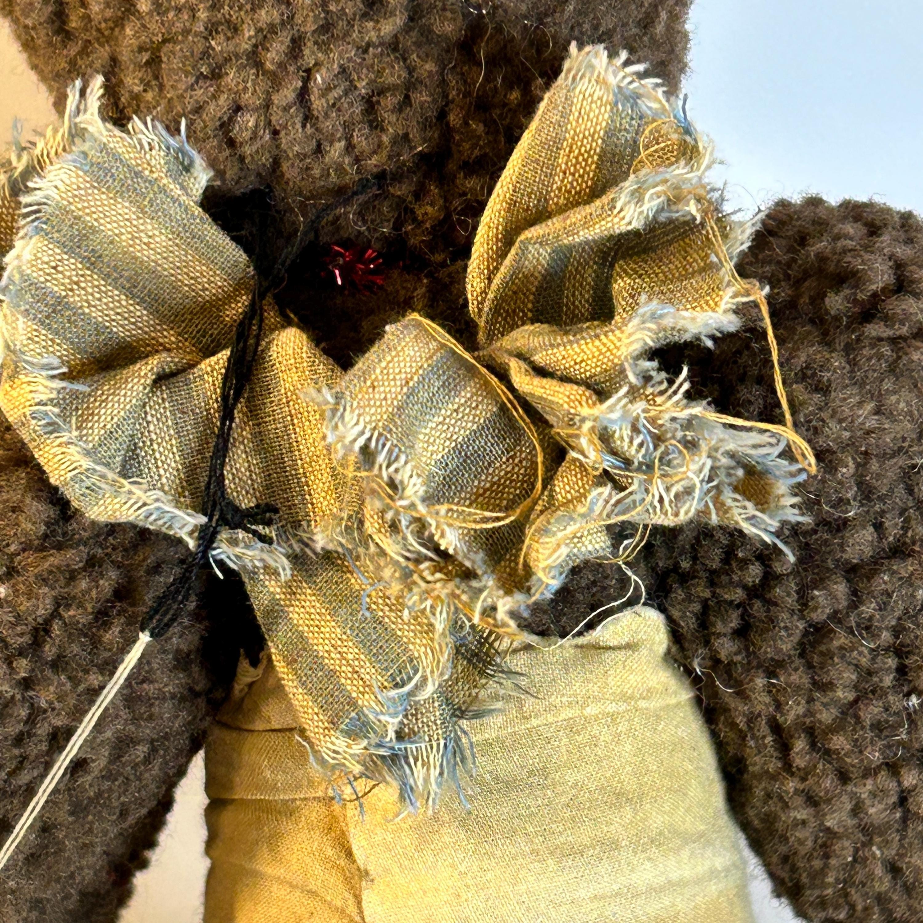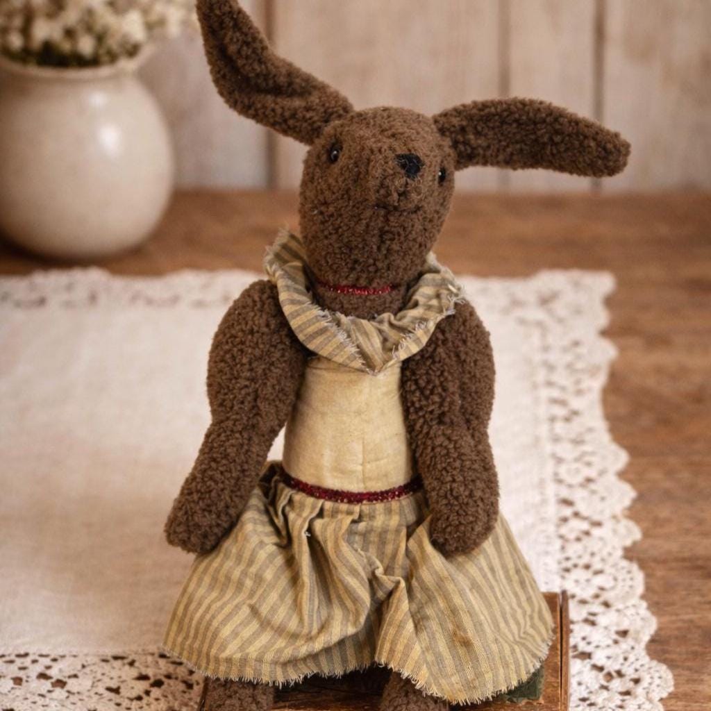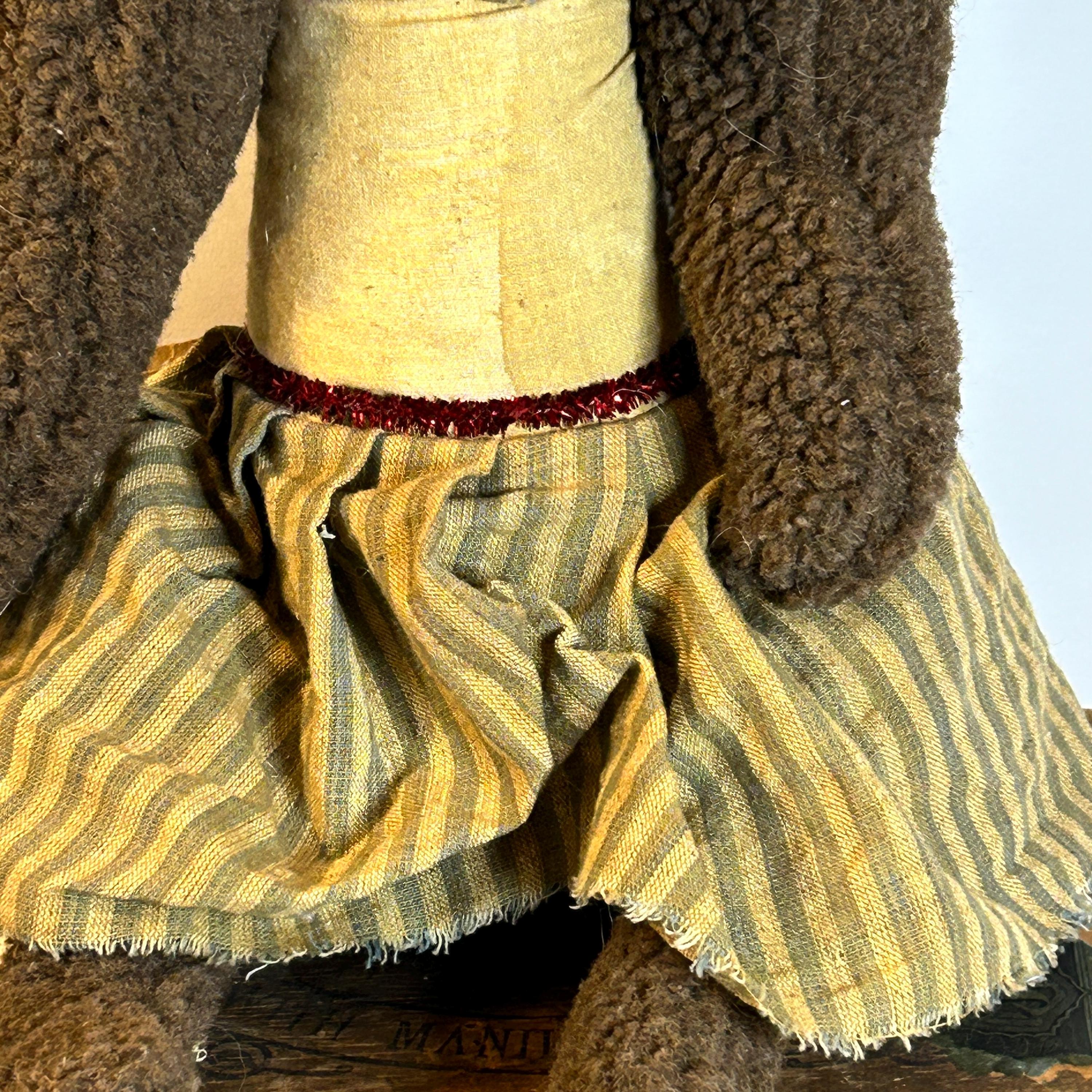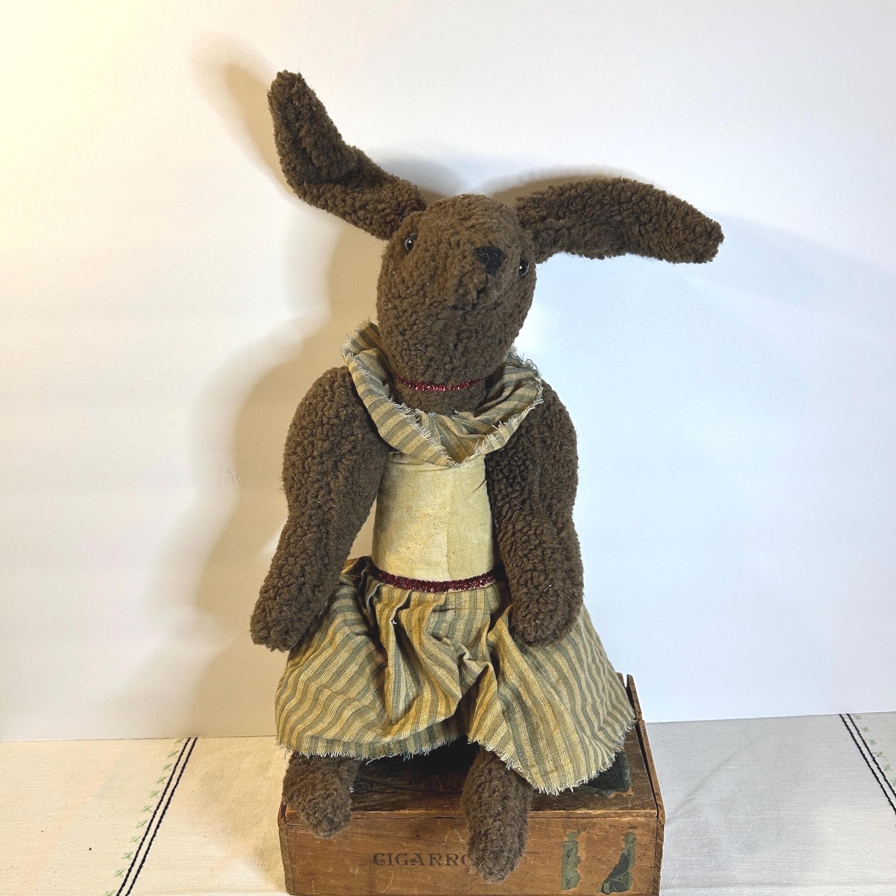 The rabbit is dressed in a tan and striped fabric skirt and a matching scarf or collar, adding to its primitive, country-style charm.