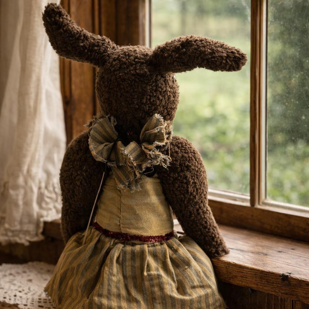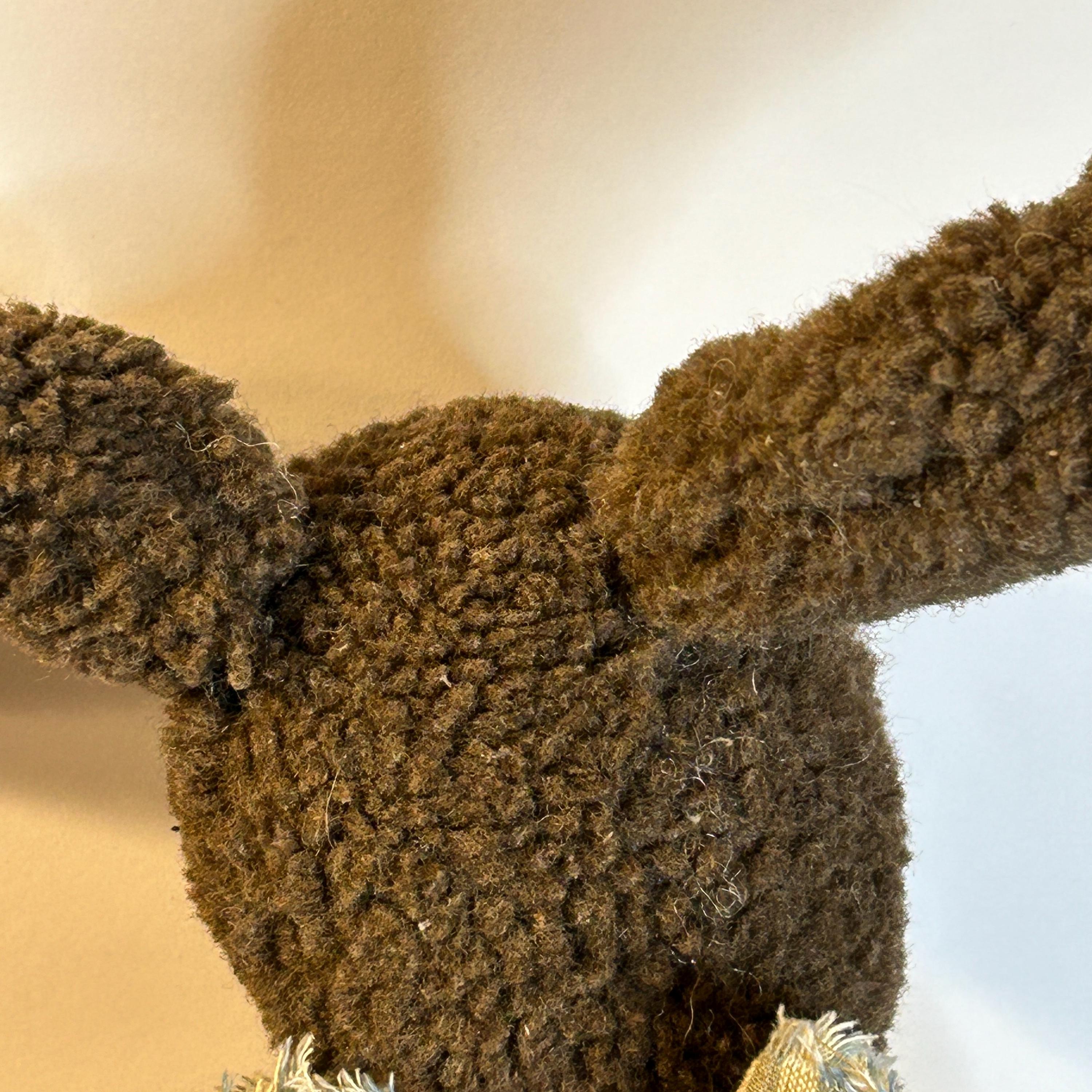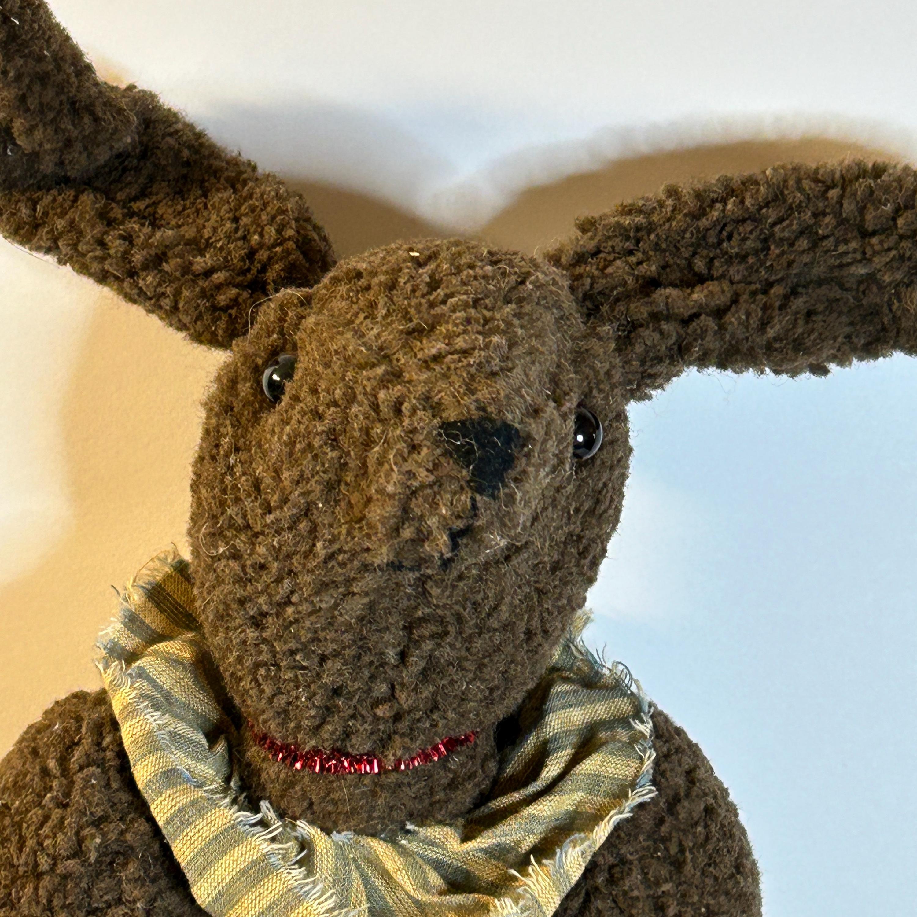 The rabbit is made of a brown, textured fabric, giving it a slightly worn or vintage look. It has long ears, a simple stitched face, and a fabric body.