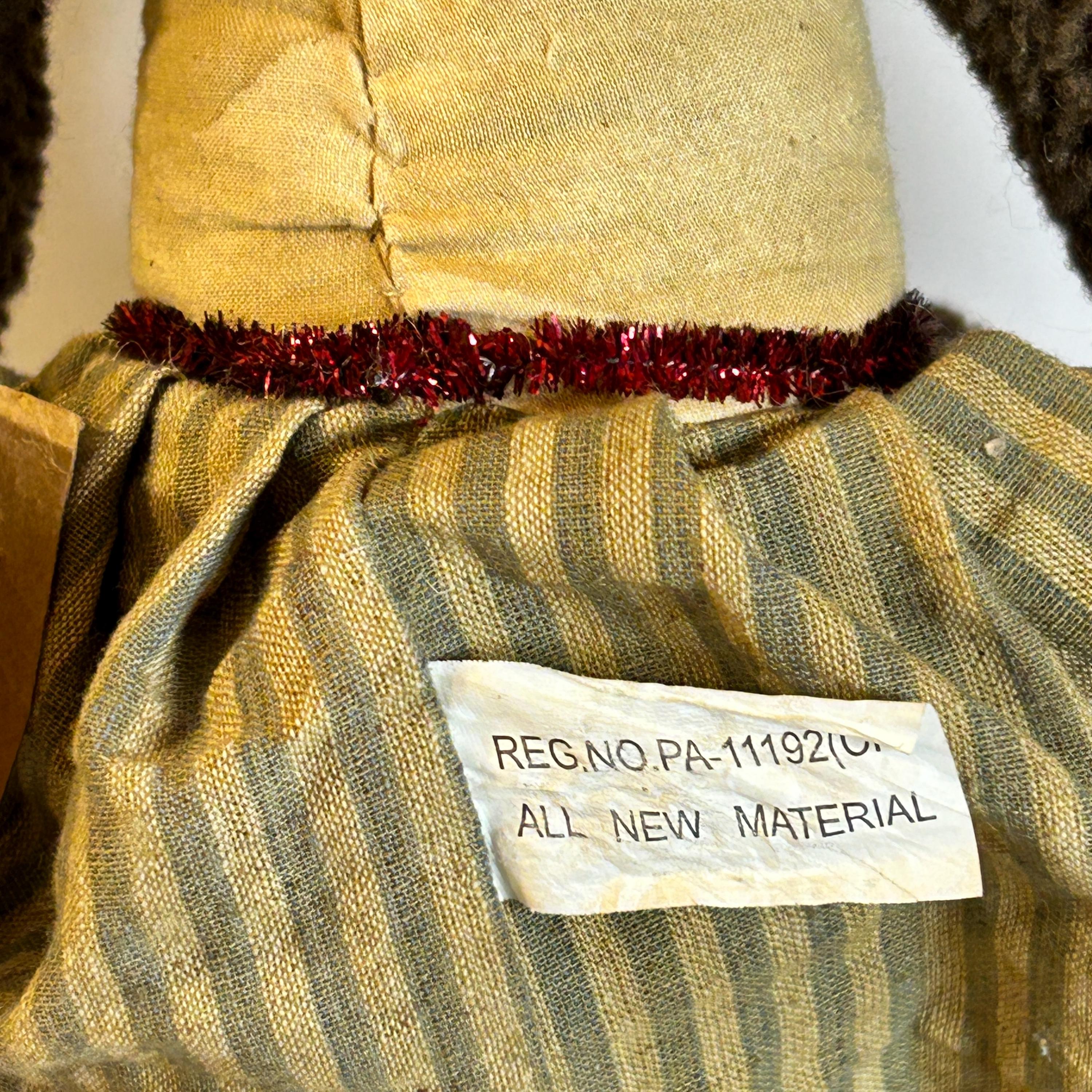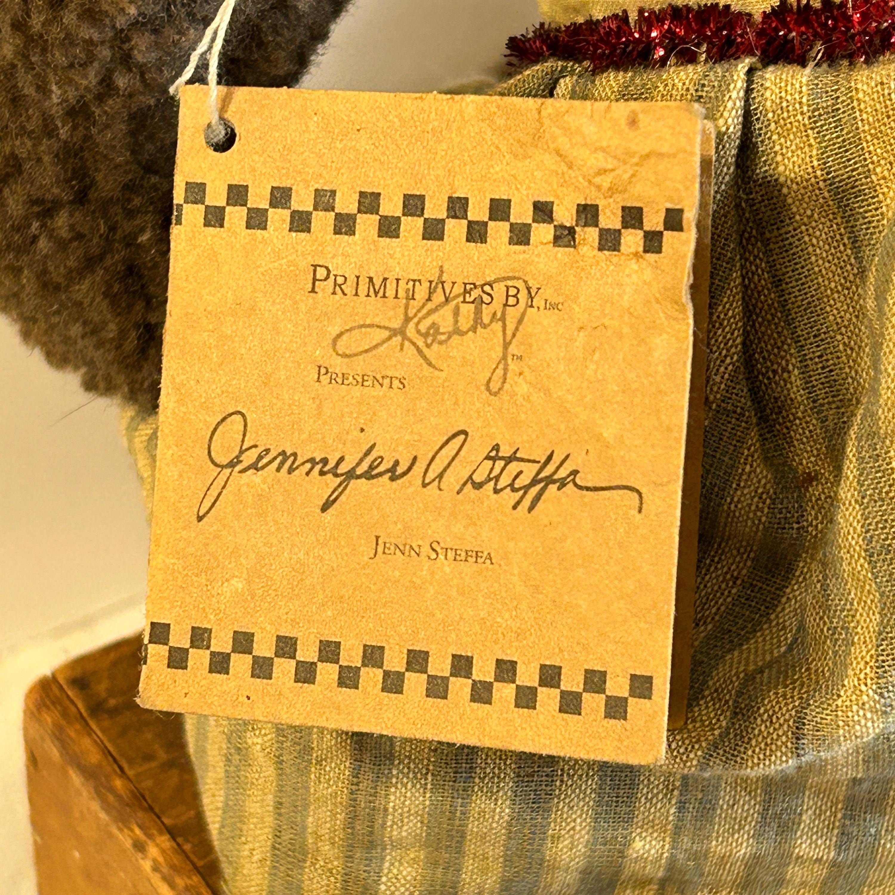 "Primitives by Kathy" is known for creating home décor and accessories with a rustic, often vintage-inspired design. This doll aligns with their style, which often includes fabric-based figures with a handmade or folksy appearance.