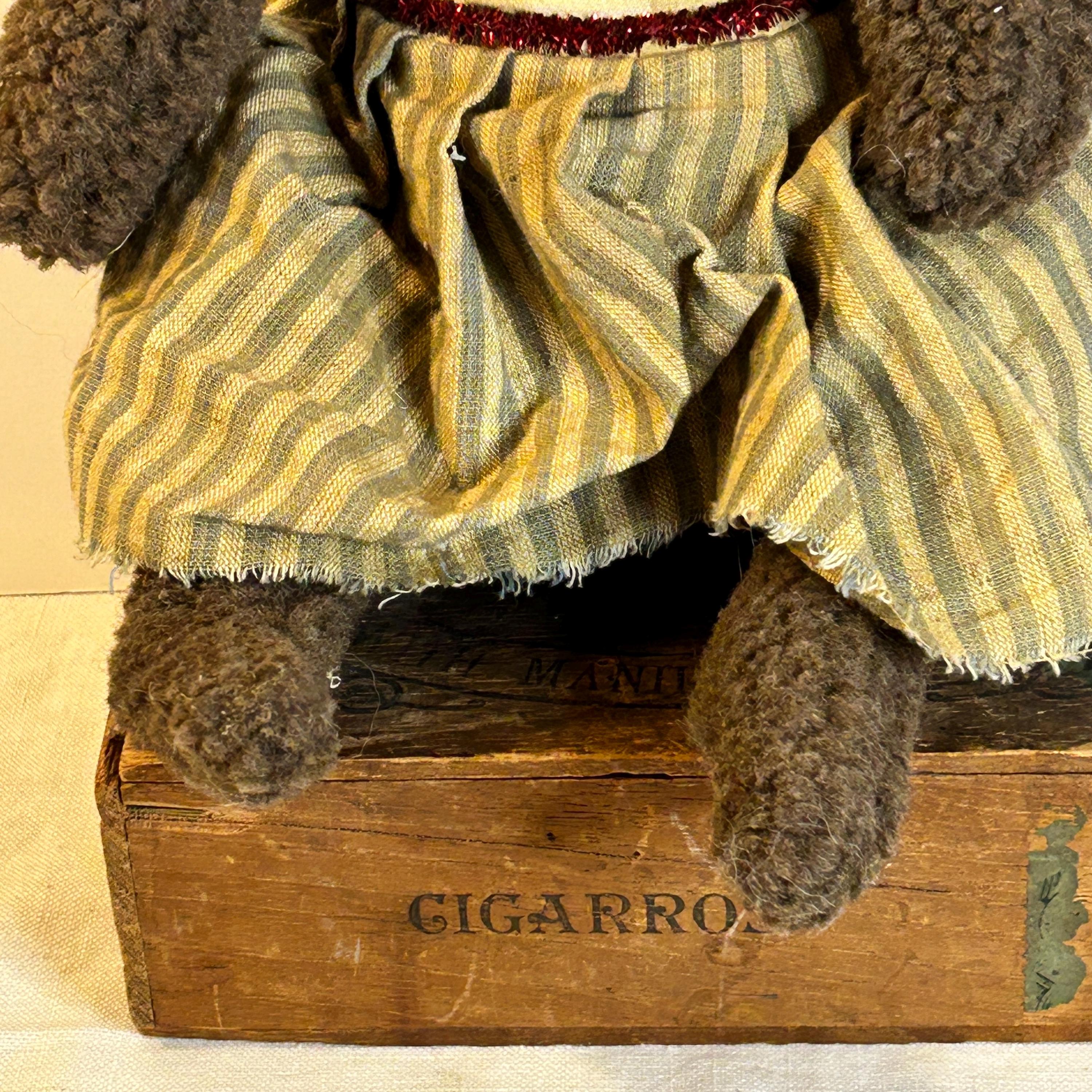 The doll is sitting on a wooden box, which seems to be an old cigar box, further emphasizing the rustic theme. The background is plain, highlighting the doll as the main subject.