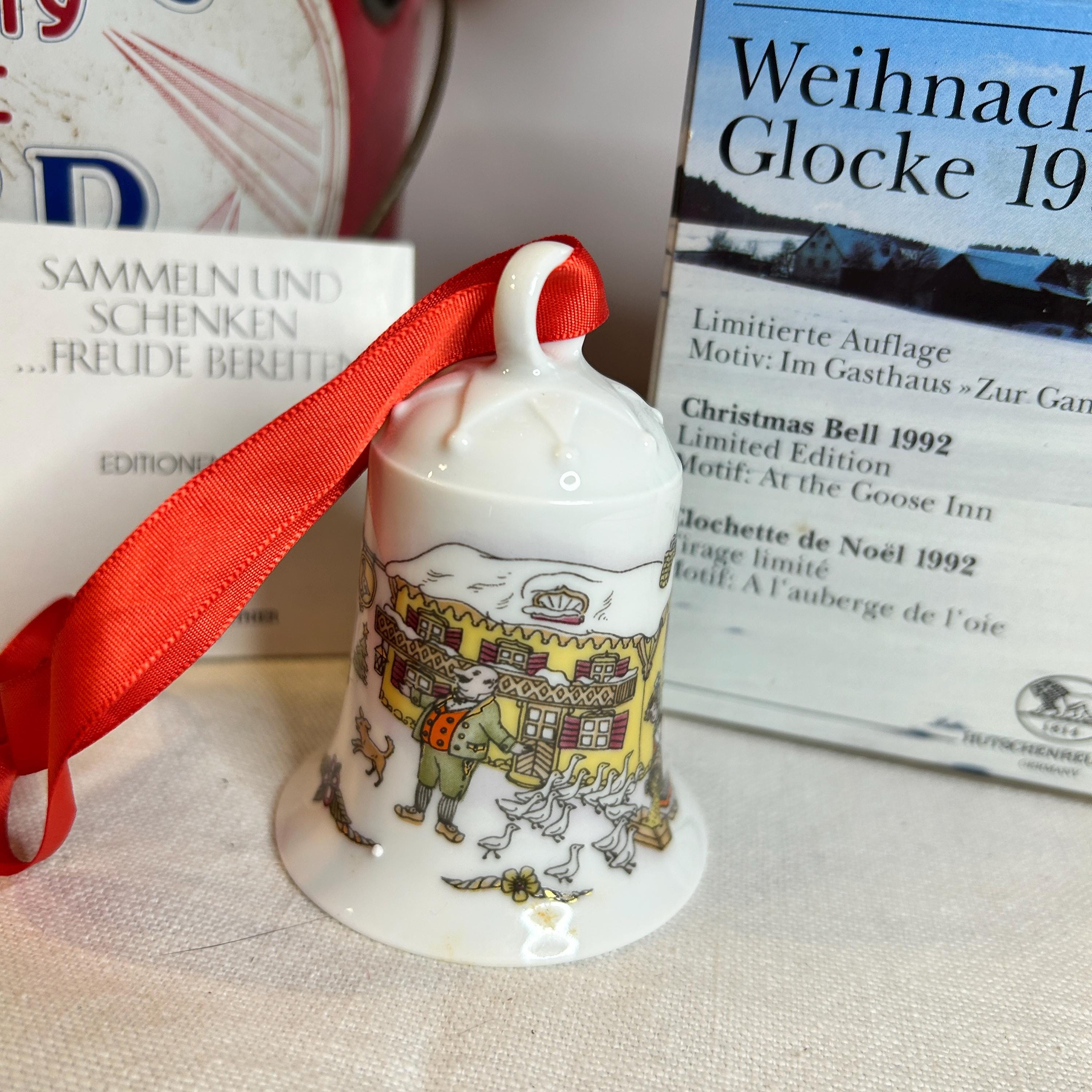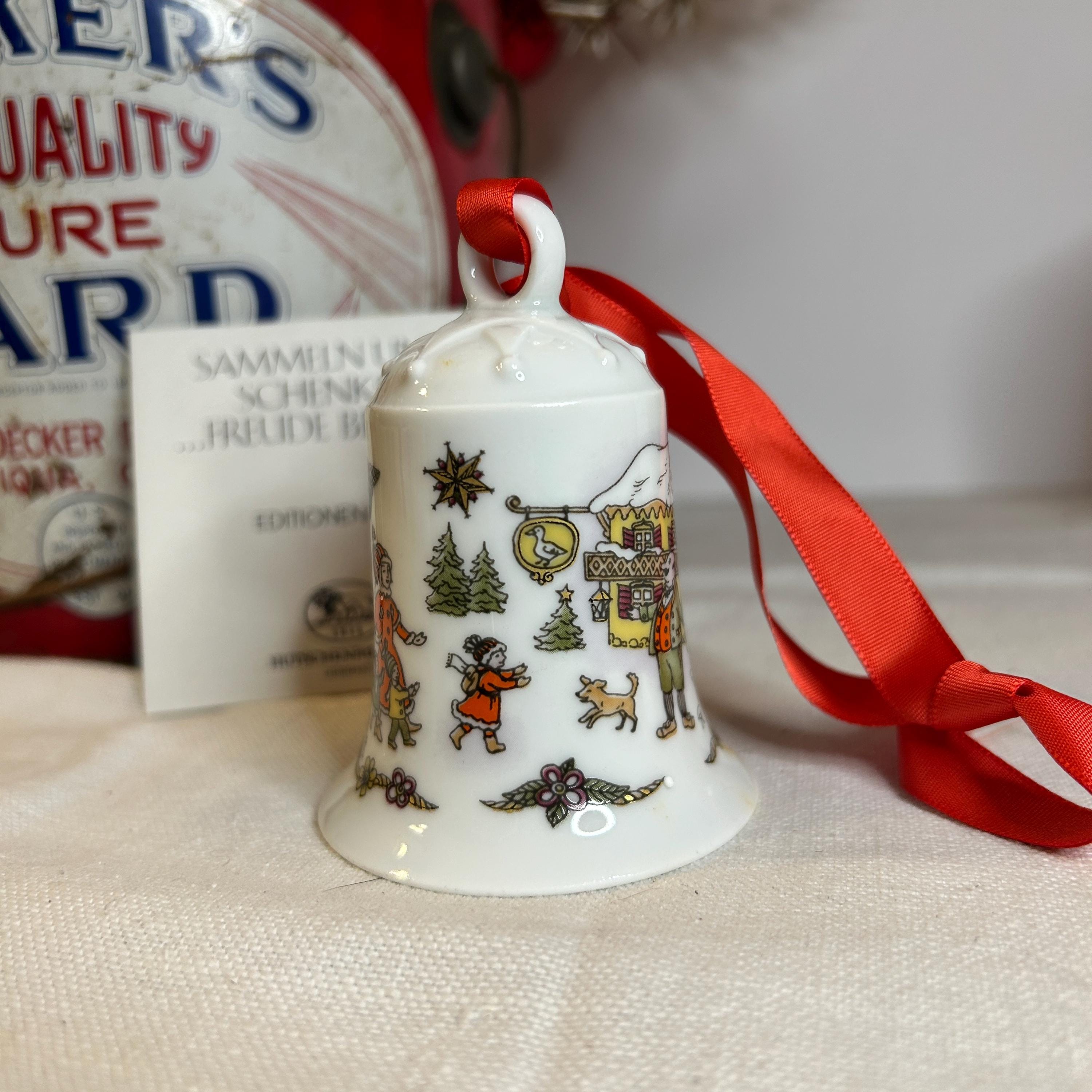 This is a fine bone china Weihnachts-Glocke 1992 Porcelain Christmas Bell. It was manufactured by Hutschenreuther in Germany. It is is 2.9″ H x 2.2″ W. The bell is a limited edition and was released for Christmas 1992. The designer was Ole Winther and his signature is on the bell. The colors are bright & colorful with a special gold etching. The bell is in like new condition in the original box.