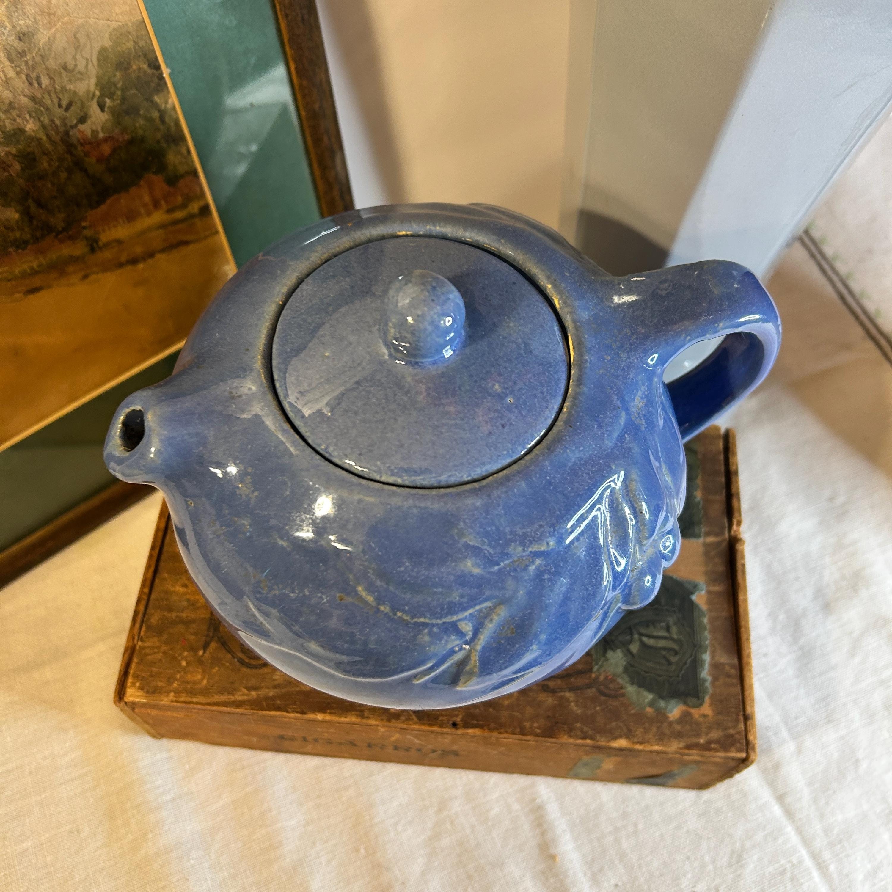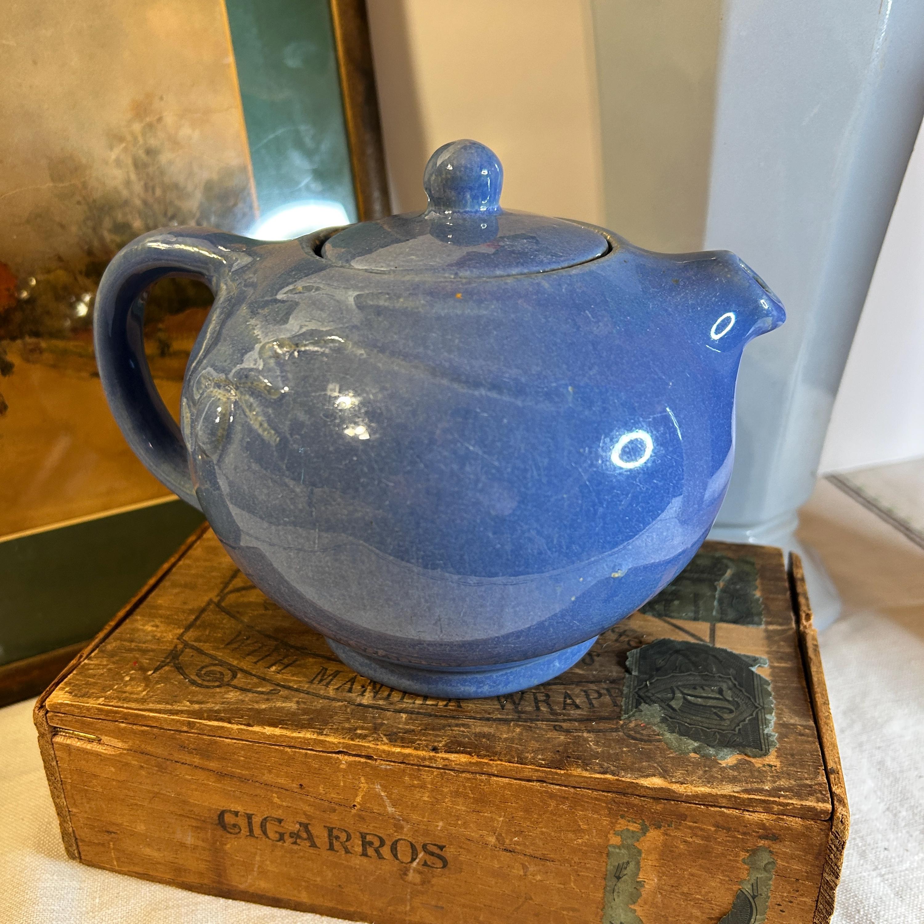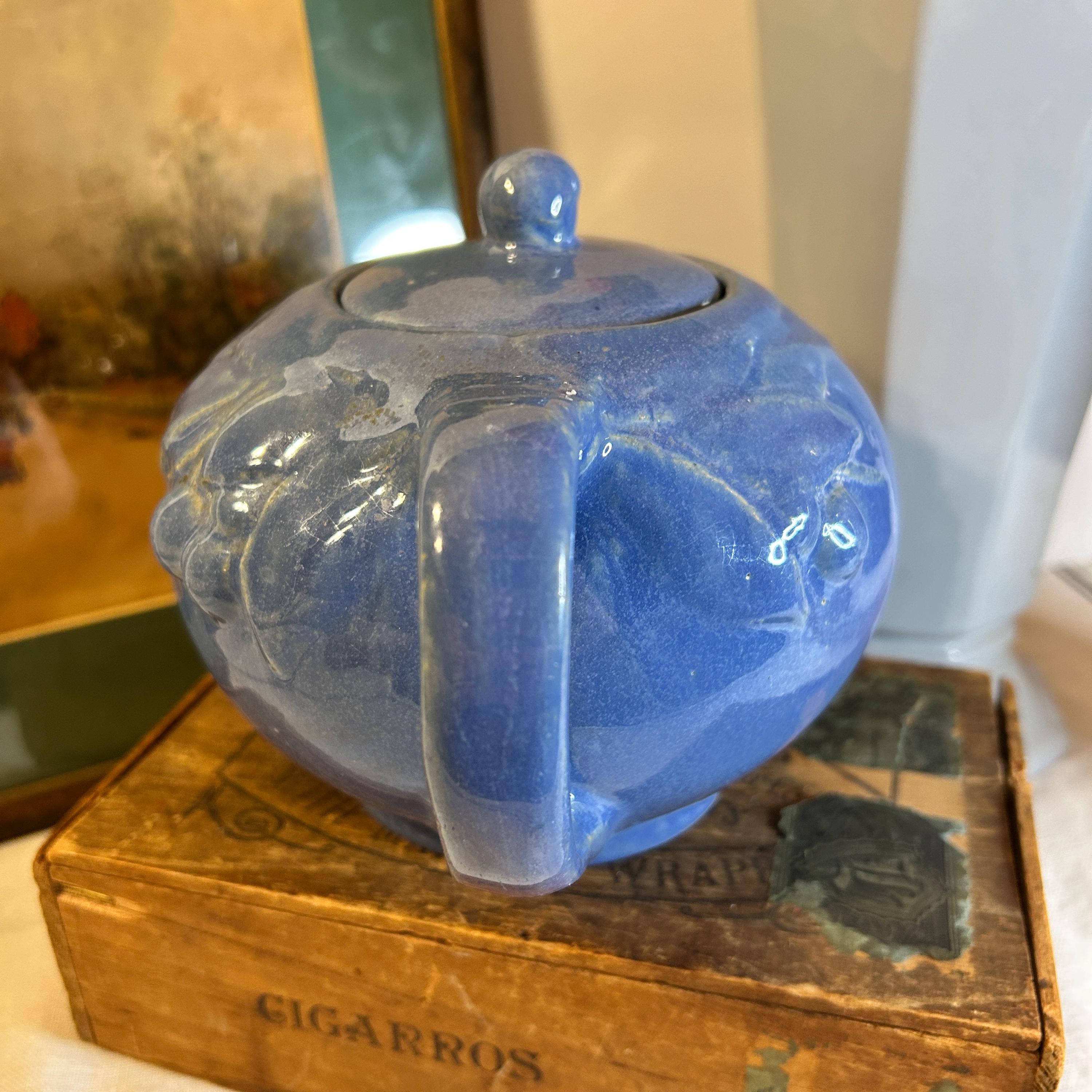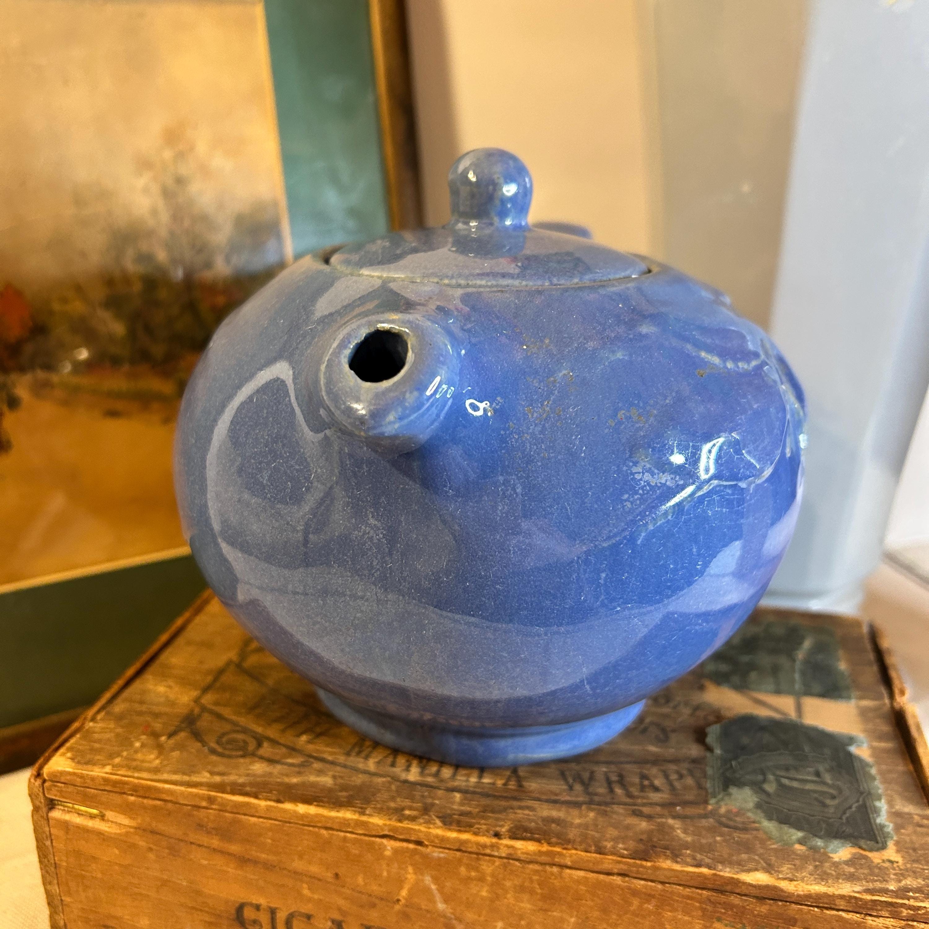 A lovely old blue glaze crock pottery small teapot. I am not sure who made this as it is not signed and the style is unique to many of the large pottery companies, therefore I could not attribute it to any in particular. It may be an old McCoy, but I am not sure of that. It has a very short spout and is small. It is stoneware with a blue glaze. It measures about 5" tall and 5" wide not including the spout and handle. 7" from spout to handle. The lid is sturdy and sits deep into the top hole. It is in great condition without any cracks or chips or crazing. A wonderful old piece.
