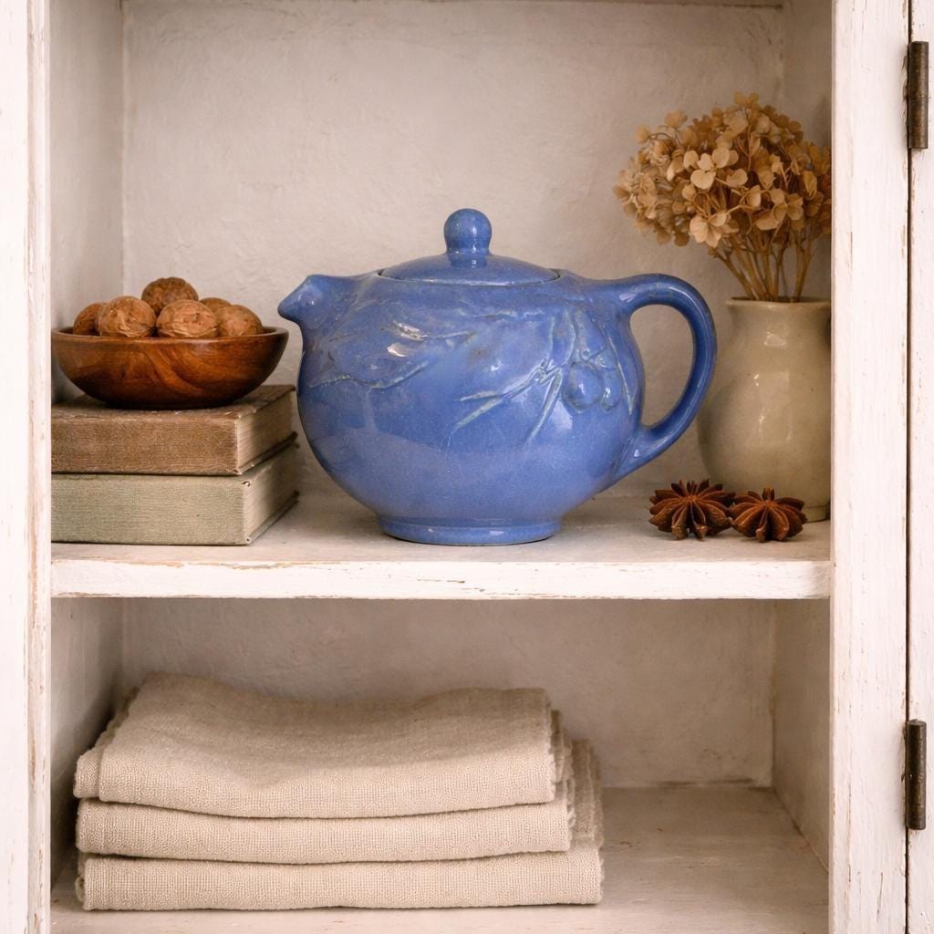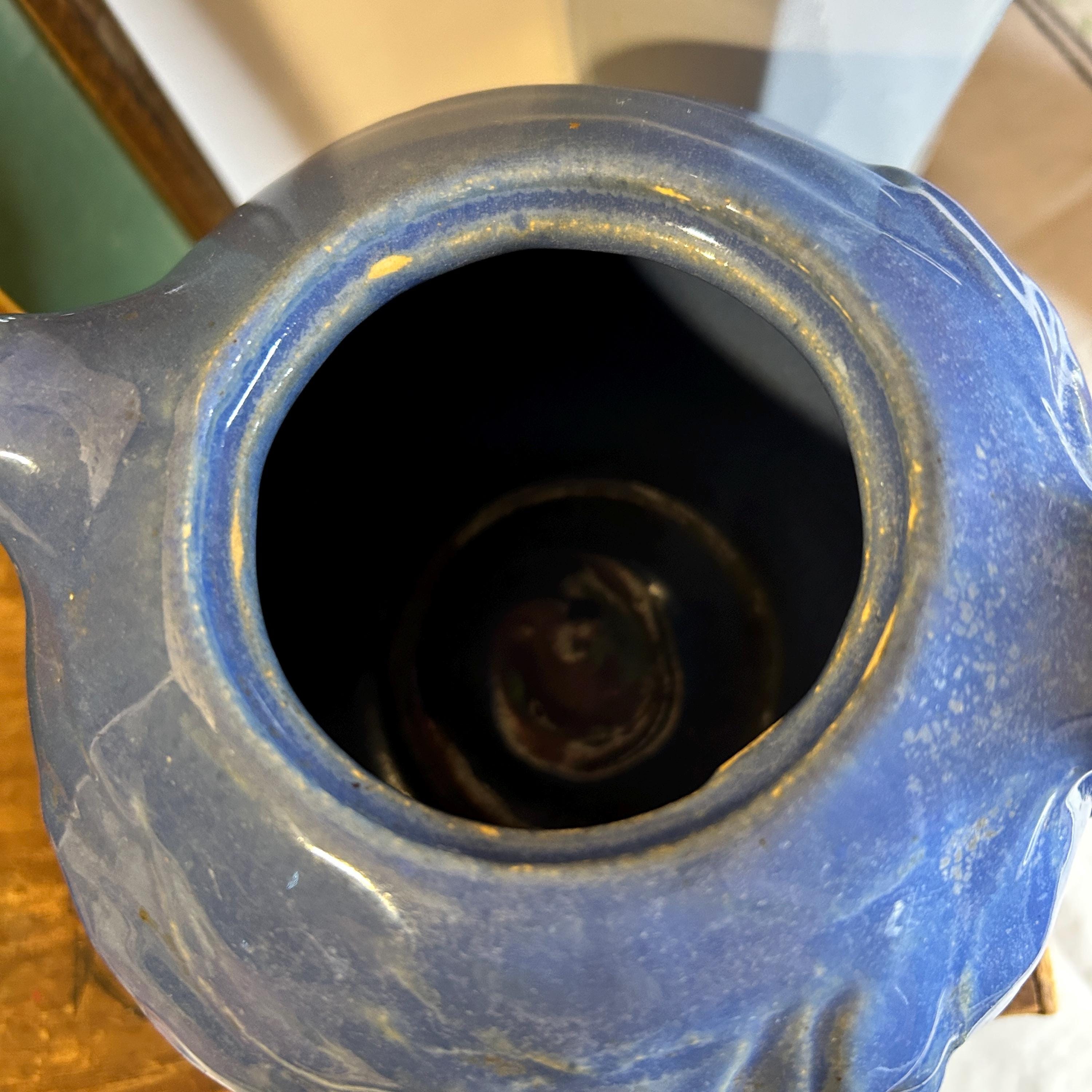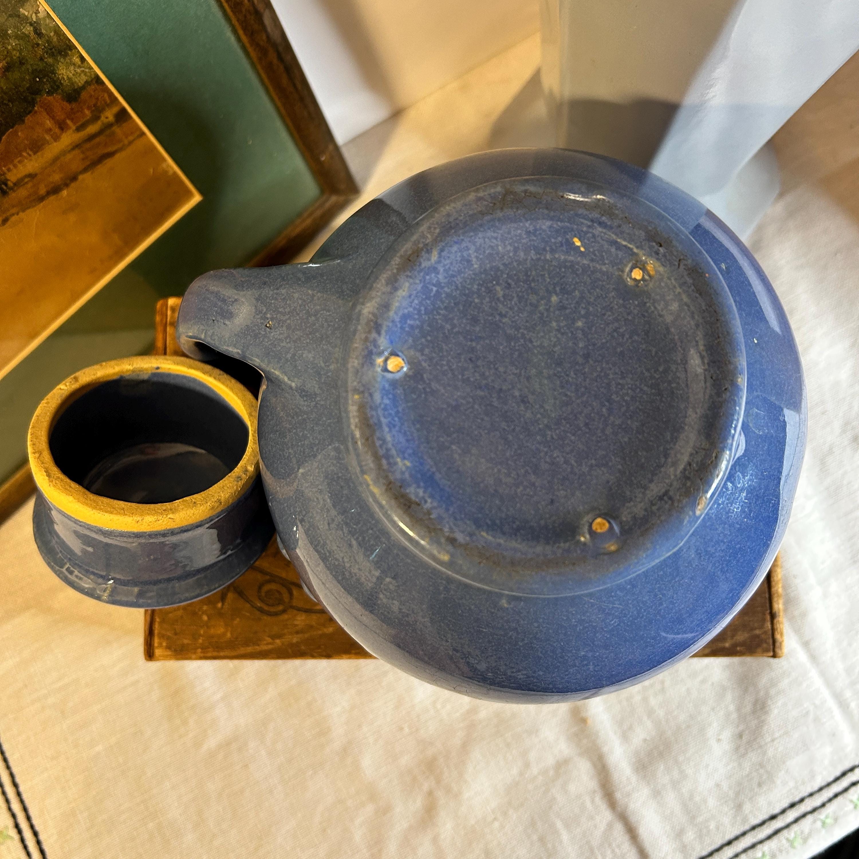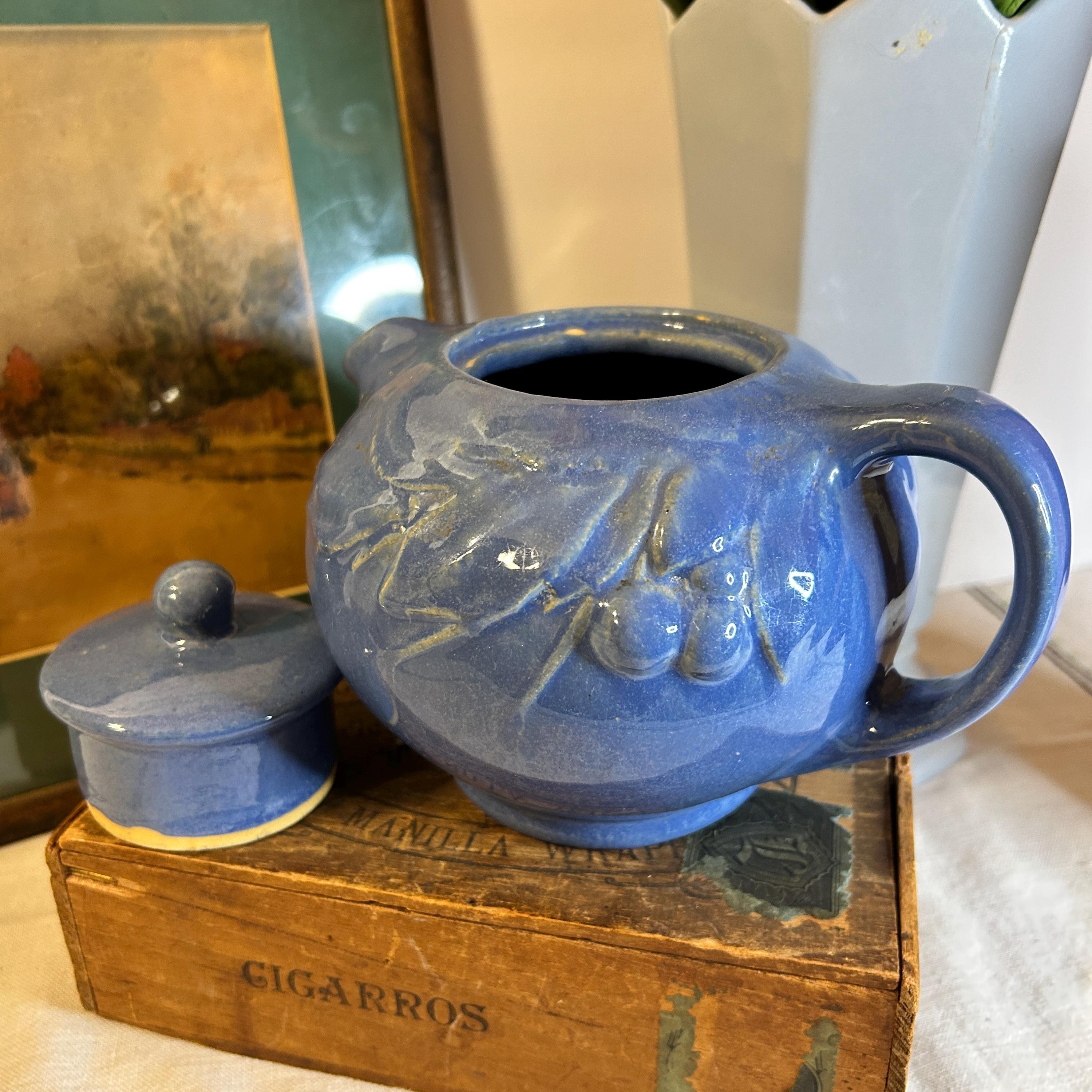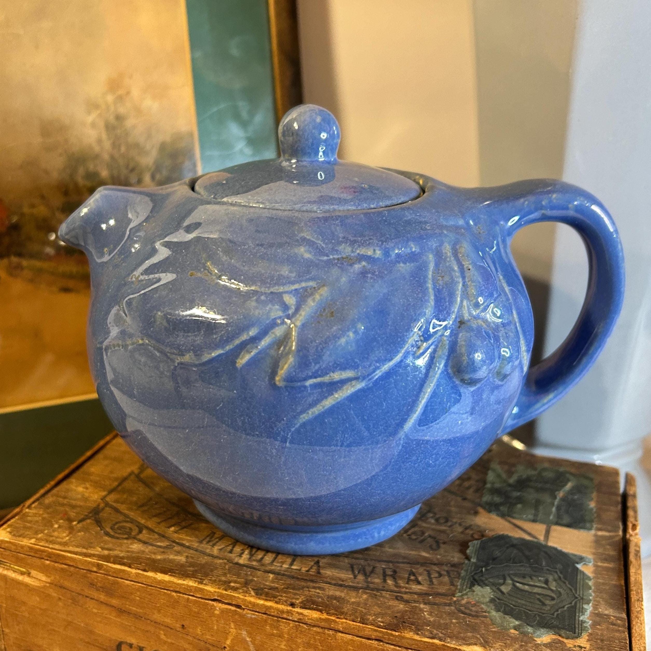 A lovely old blue glaze crock pottery small teapot. I am not sure who made this as it is not signed and the style is unique to many of the large pottery companies, therefore I could not attribute it to any in particular. It may be an old McCoy, but I am not sure of that. It has a very short spout and is small. It is stoneware with a blue glaze. It measures about 5" tall and 5" wide not including the spout and handle. 7" from spout to handle. The lid is sturdy and sits deep into the top hole. It is in great condition without any cracks or chips or crazing. A wonderful old piece.