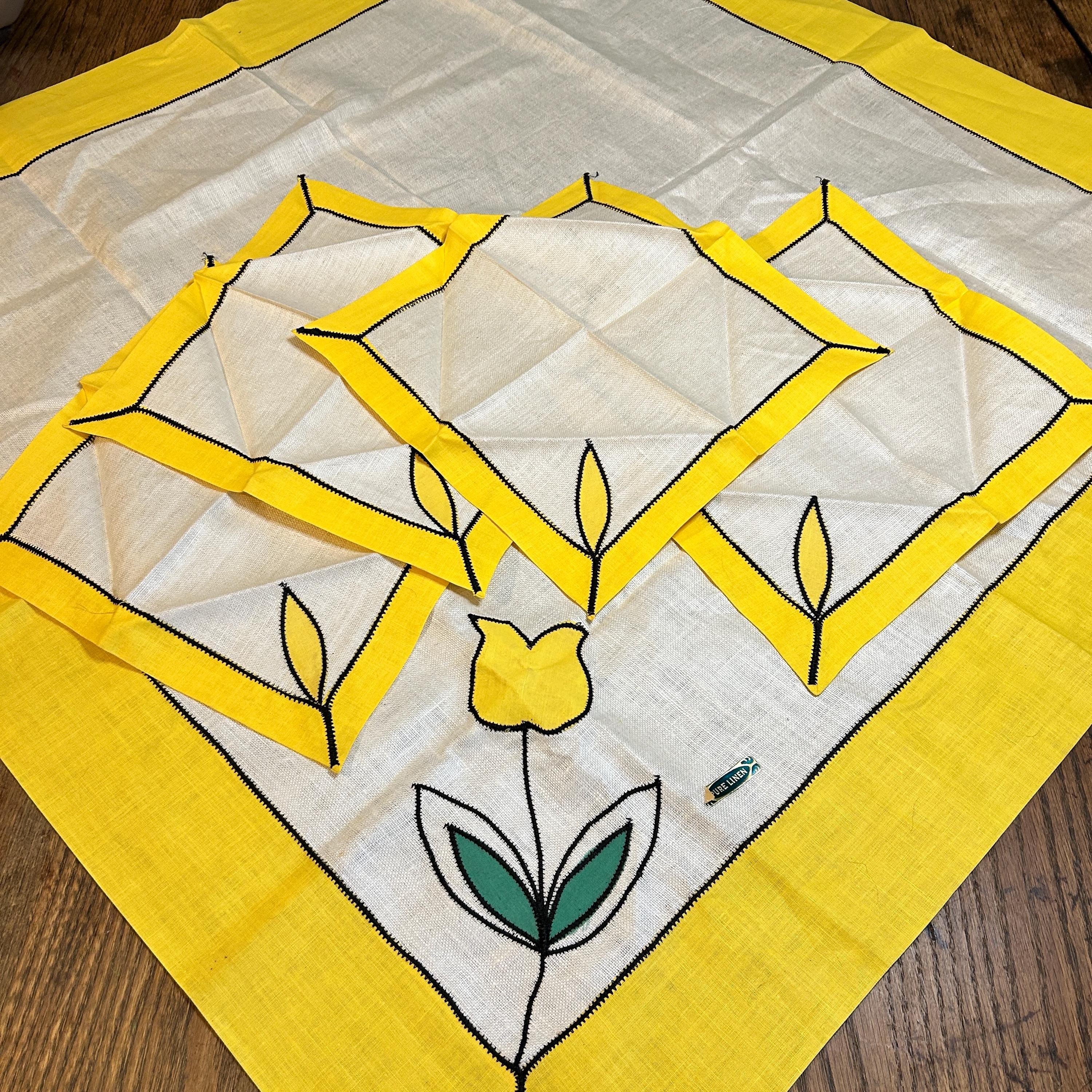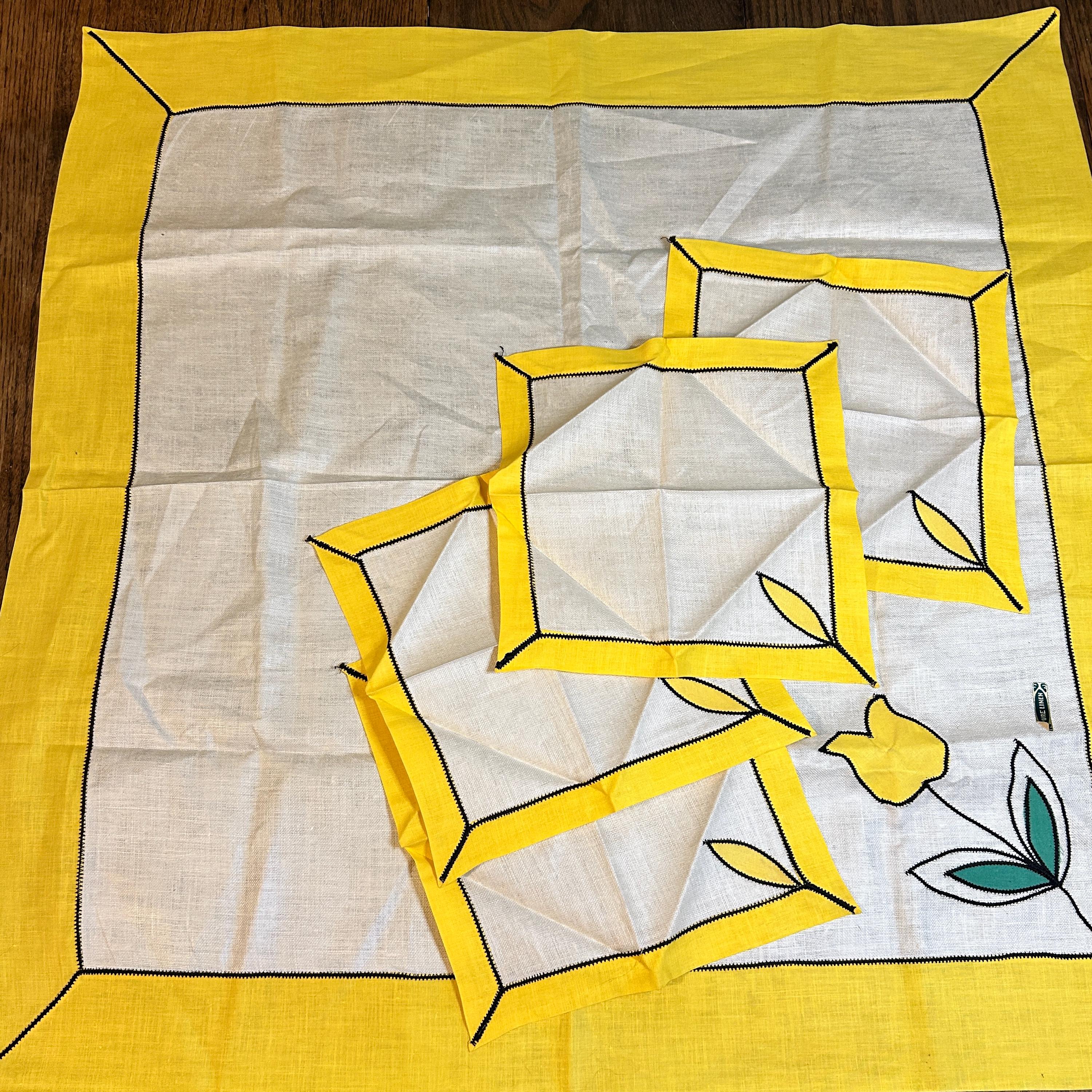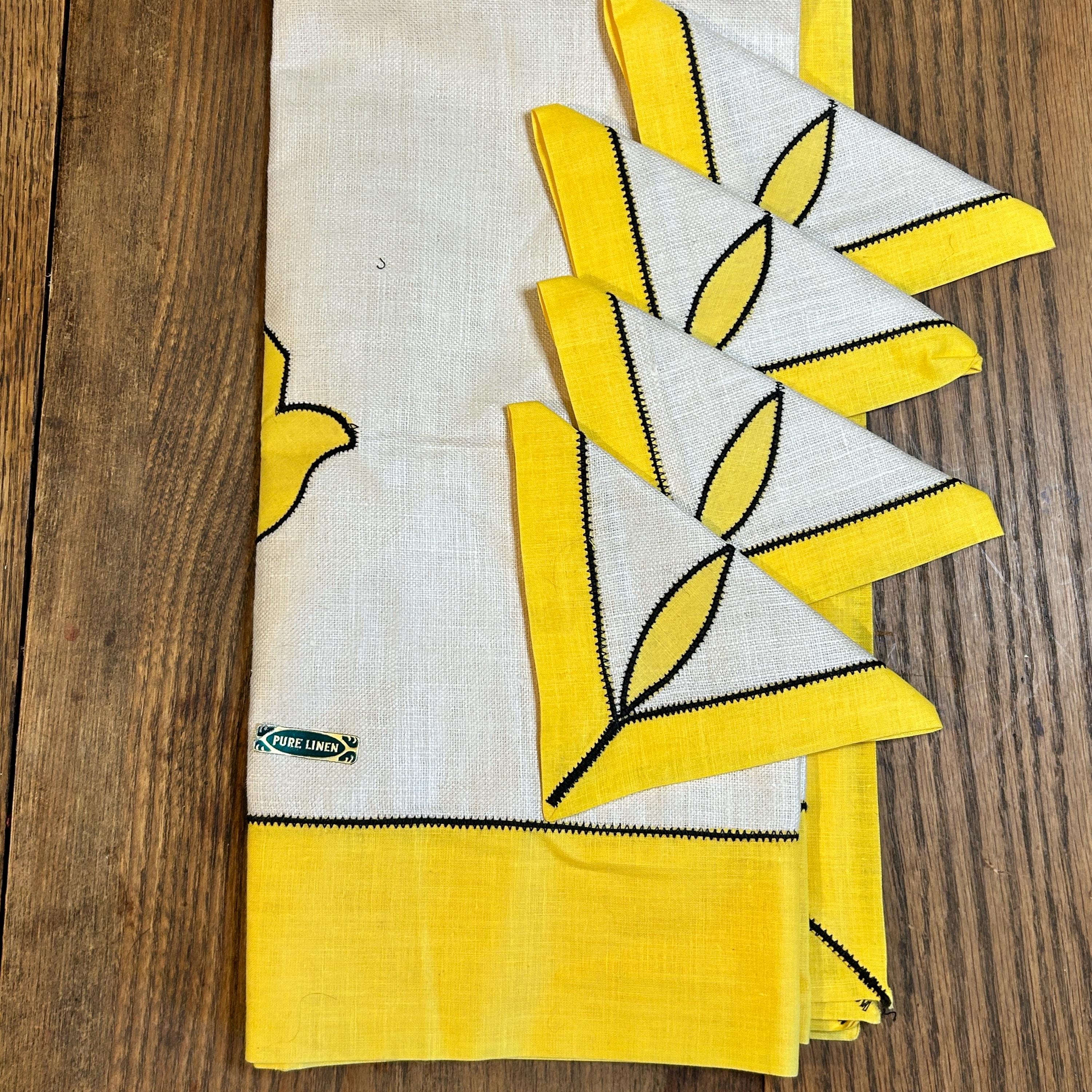 They have bright yellow around the edges of both the tablecloth and the napkins.