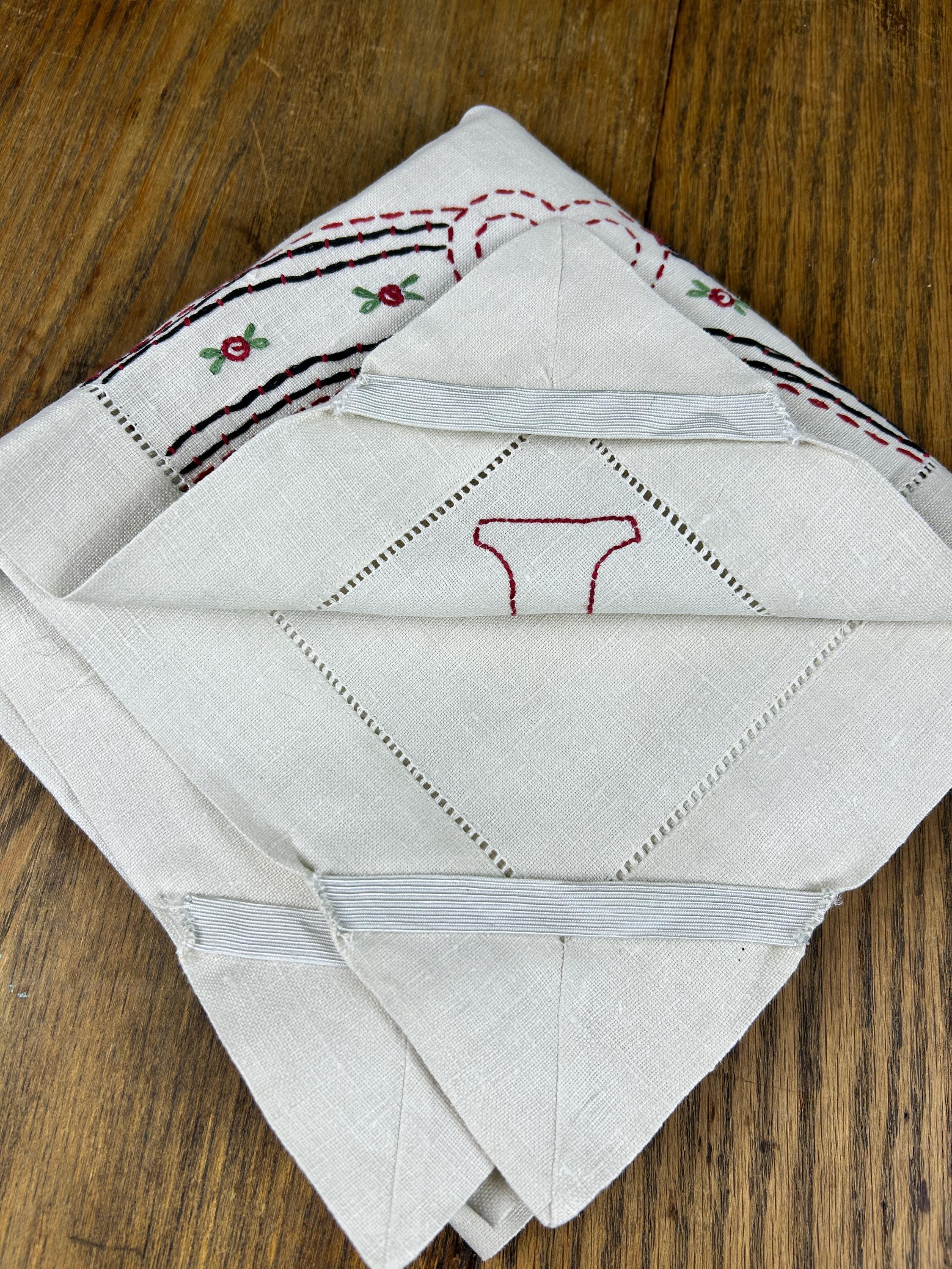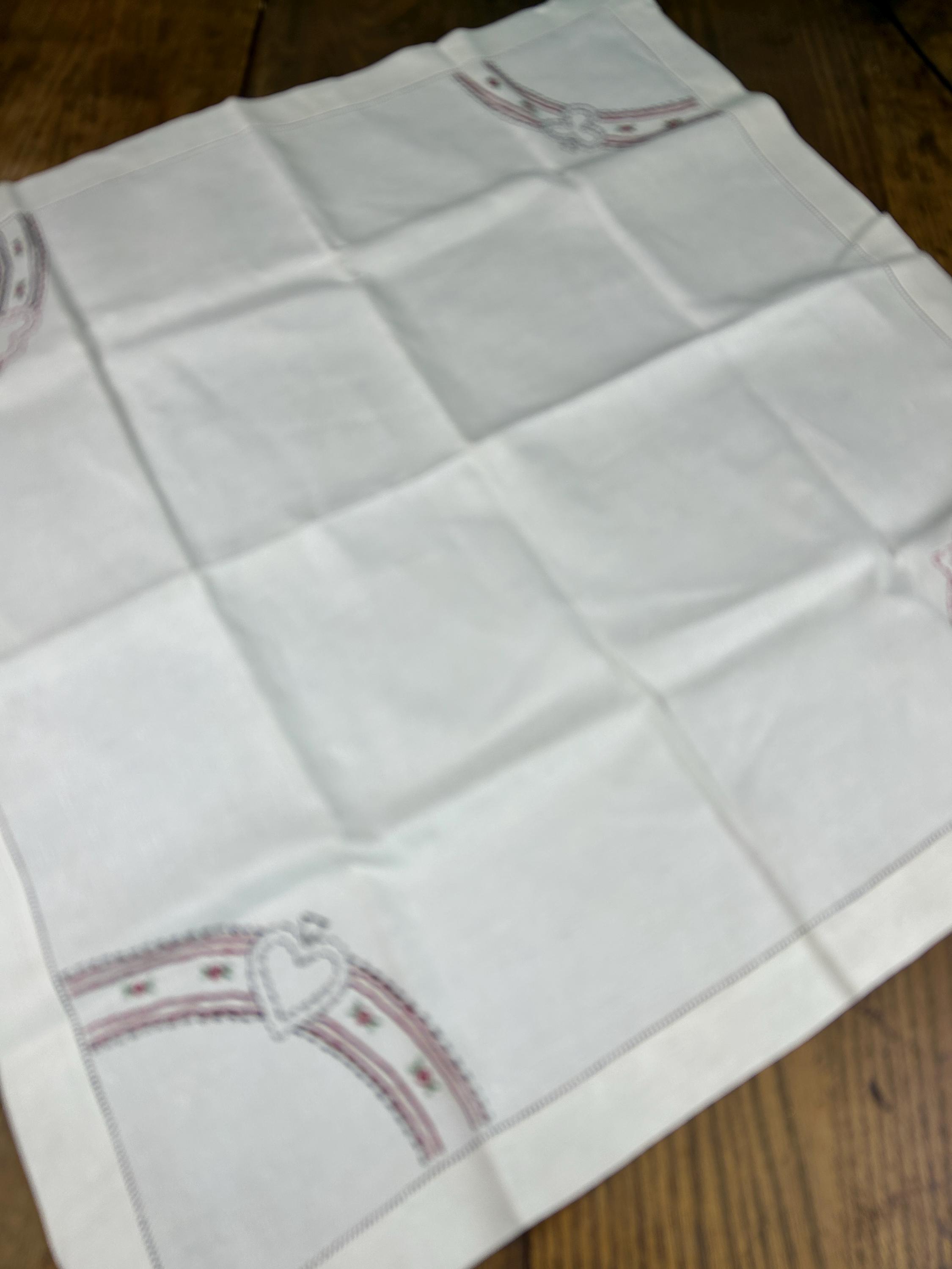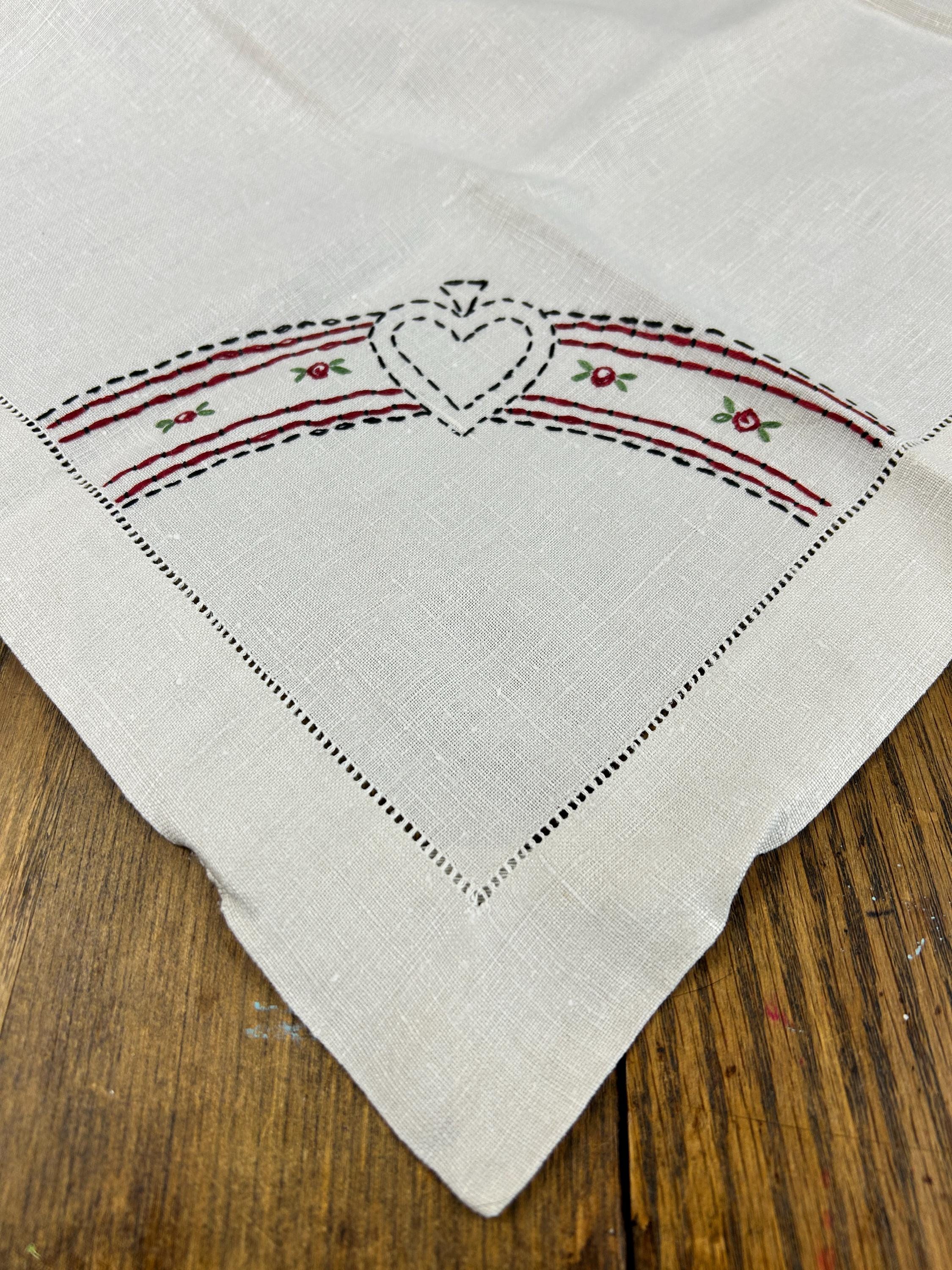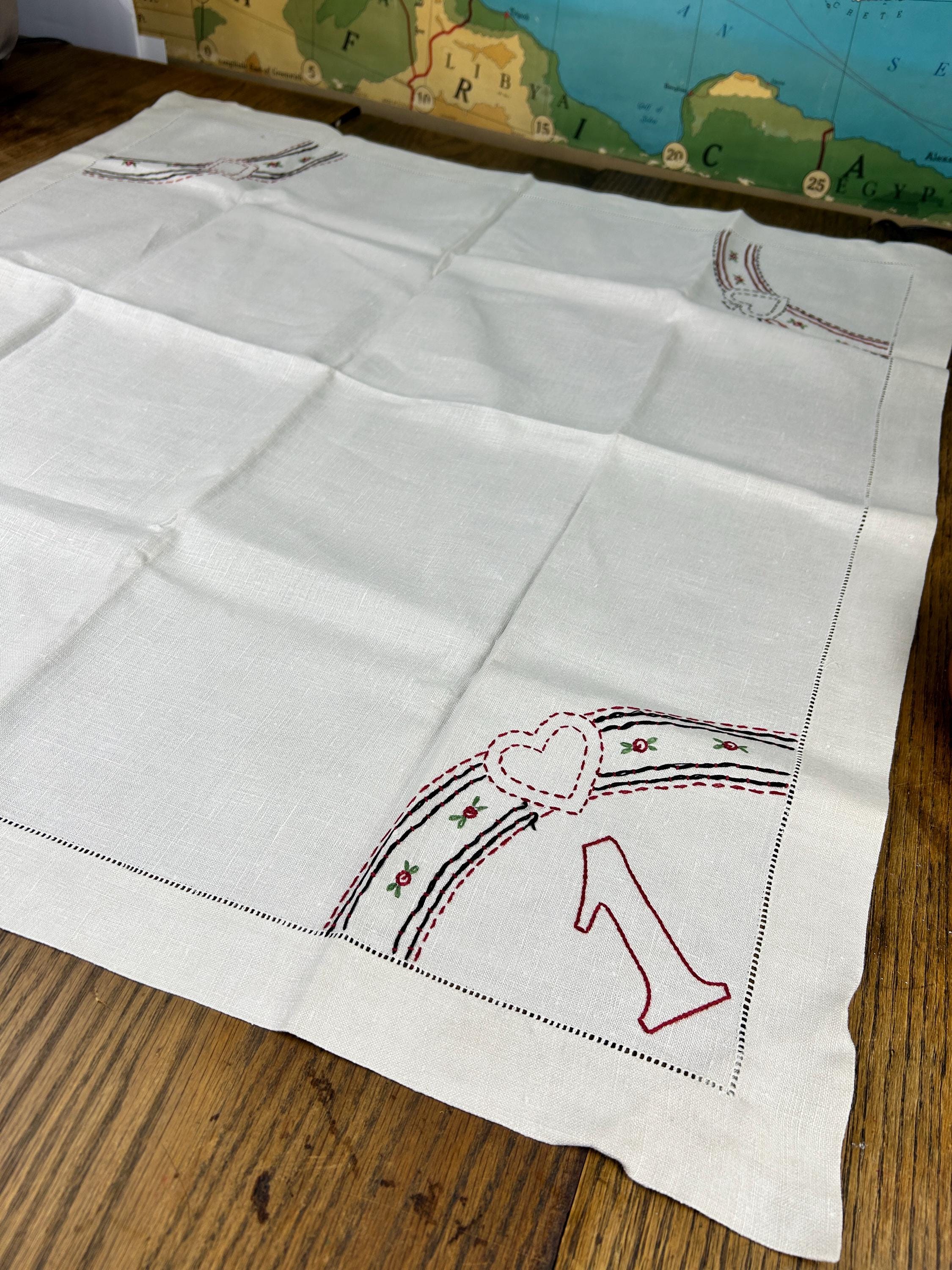 Bust out the card table and lay this beauty on top and have a vintage card club night! This is a beautifully hand-stitched and embroidered linen tablecloth that measures approximately 30" x 31". The underside of each corner has an elastic strap to keep it firmly attached to your card table. One corner has the number 1 embroidered with a heart above it. The other three corners feature the club, the spade, and the diamond.