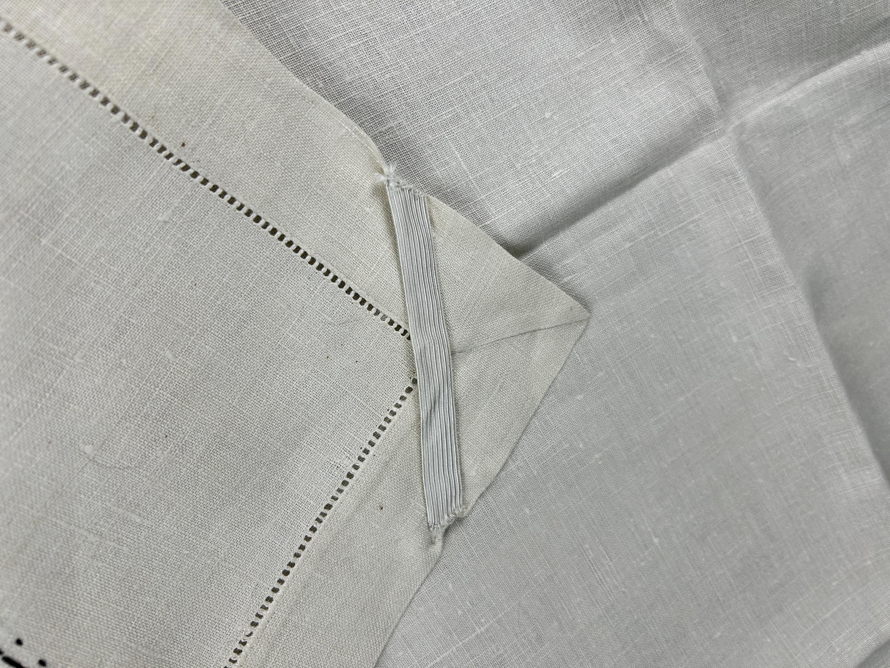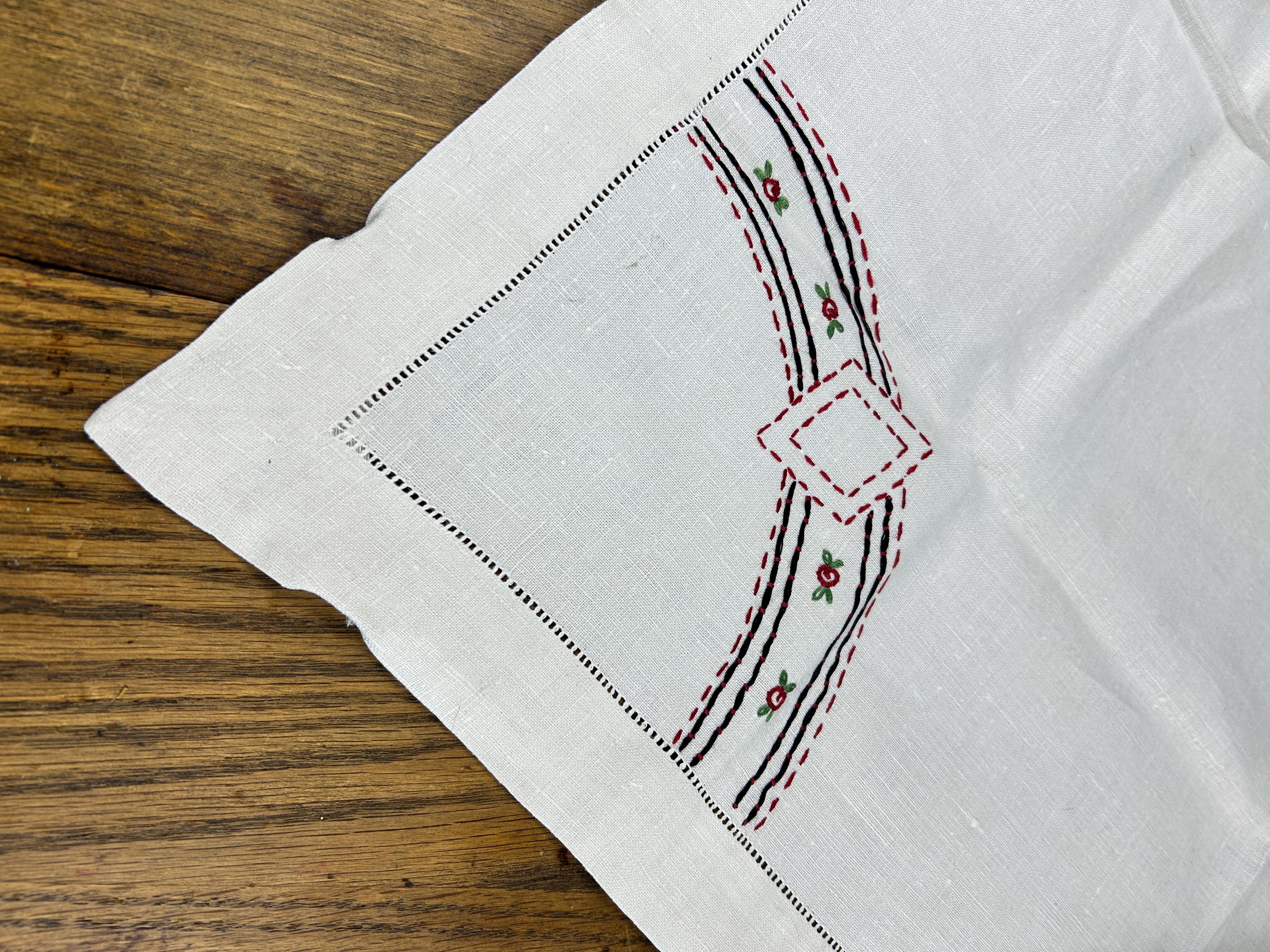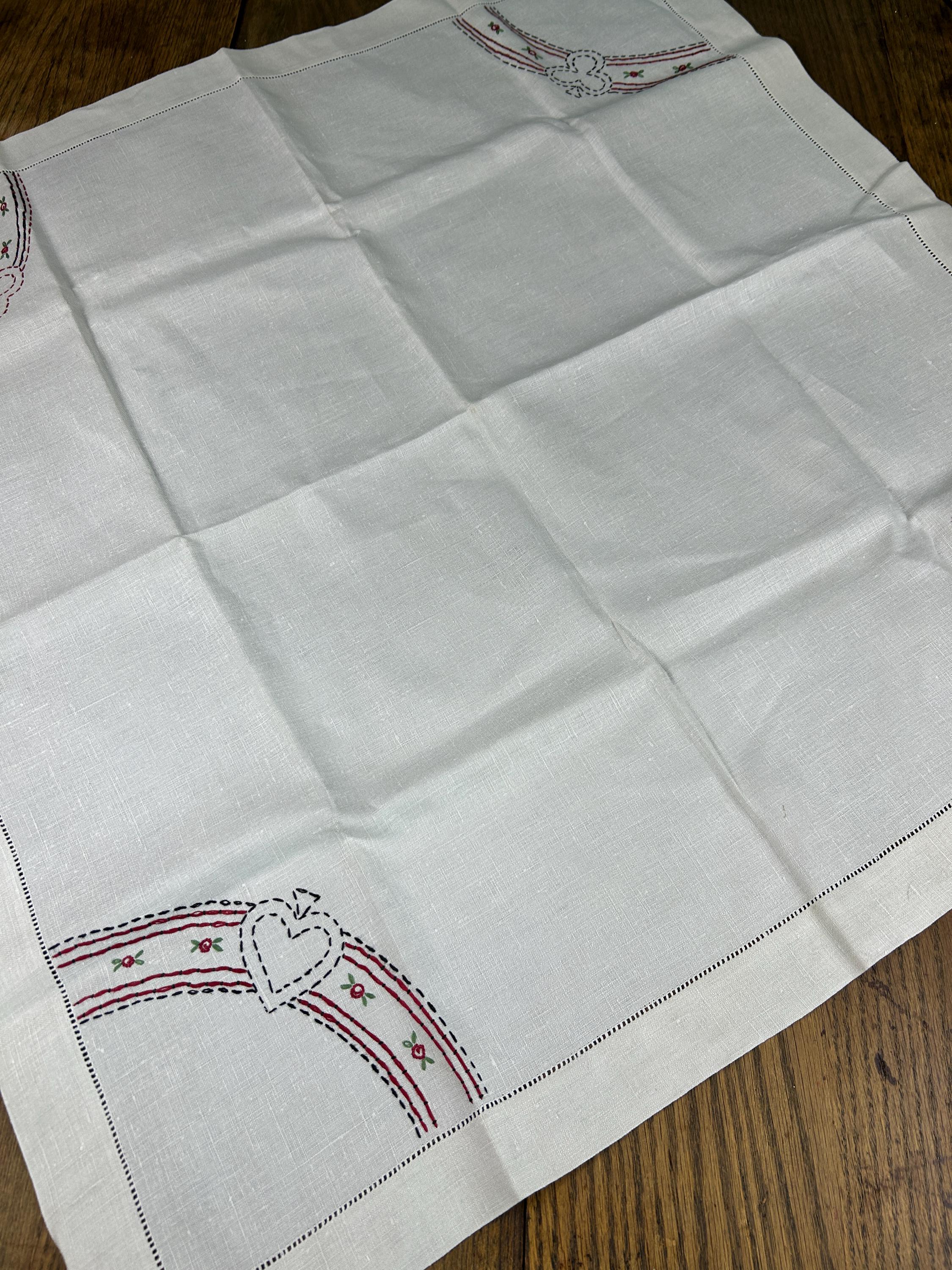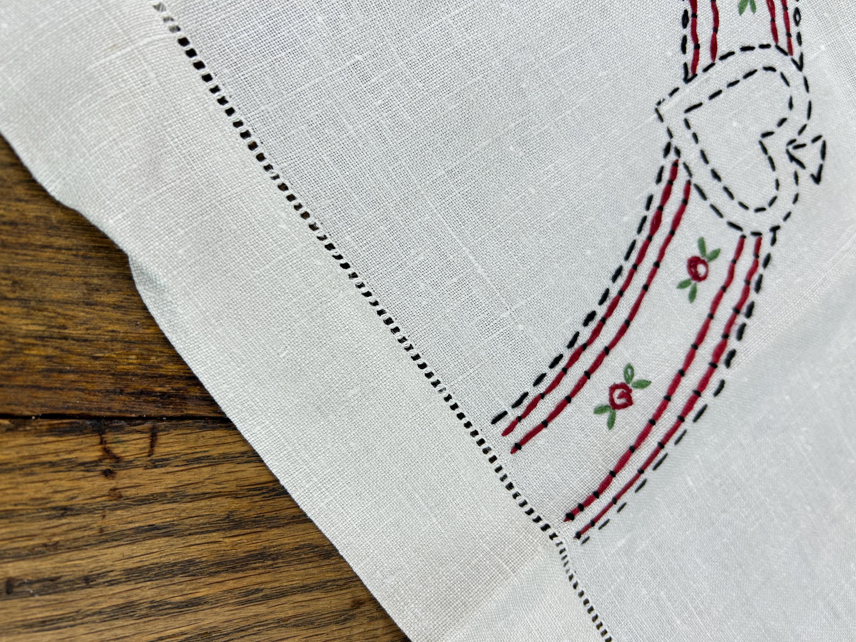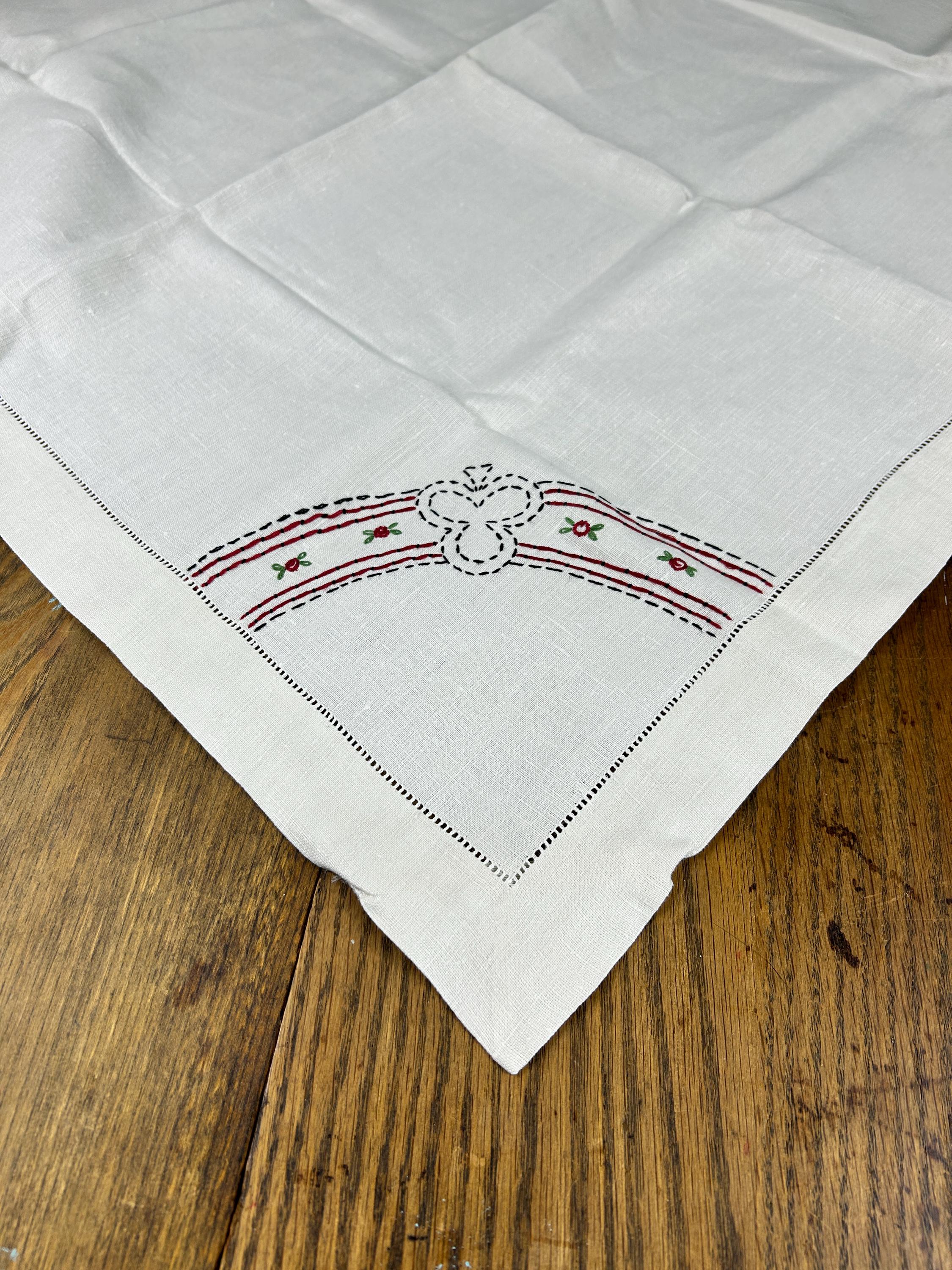 Bust out the card table and lay this beauty on top and have a vintage card club night! This is a beautifully hand-stitched and embroidered linen tablecloth that measures approximately 30" x 31". The underside of each corner has an elastic strap to keep it firmly attached to your card table. One corner has the number 1 embroidered with a heart above it. The other three corners feature the club, the spade, and the diamond.
