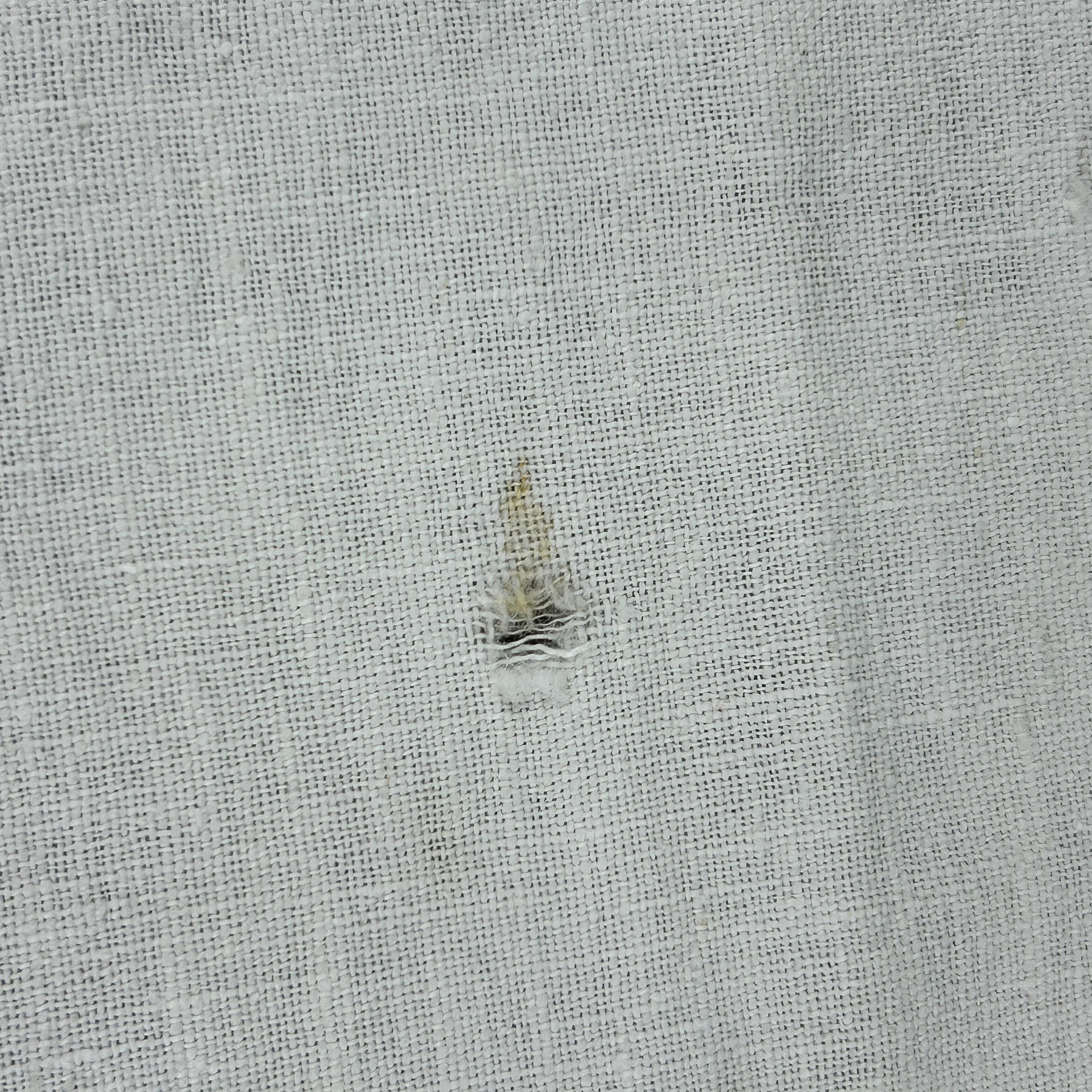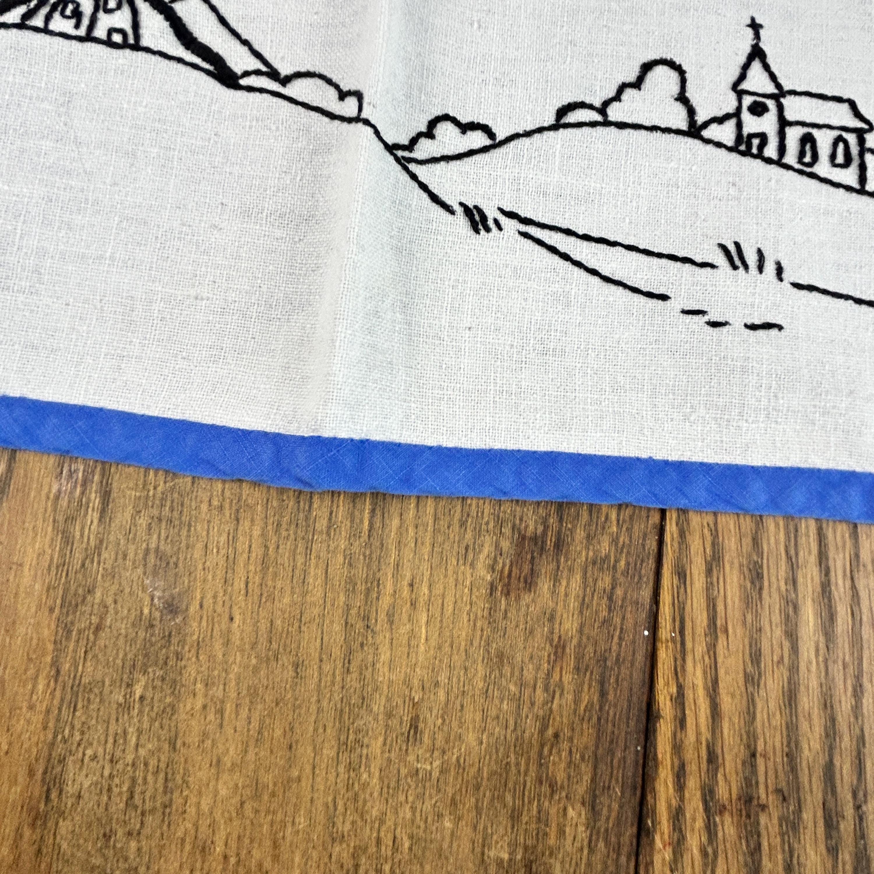 Very minor stains and one minor tear in the linen (see all photos). Otherwise, in excellent condition. The back of the table cover shows the immaculate embroidery on this piece as well. The cover is finished with blue bias tape around the edges.