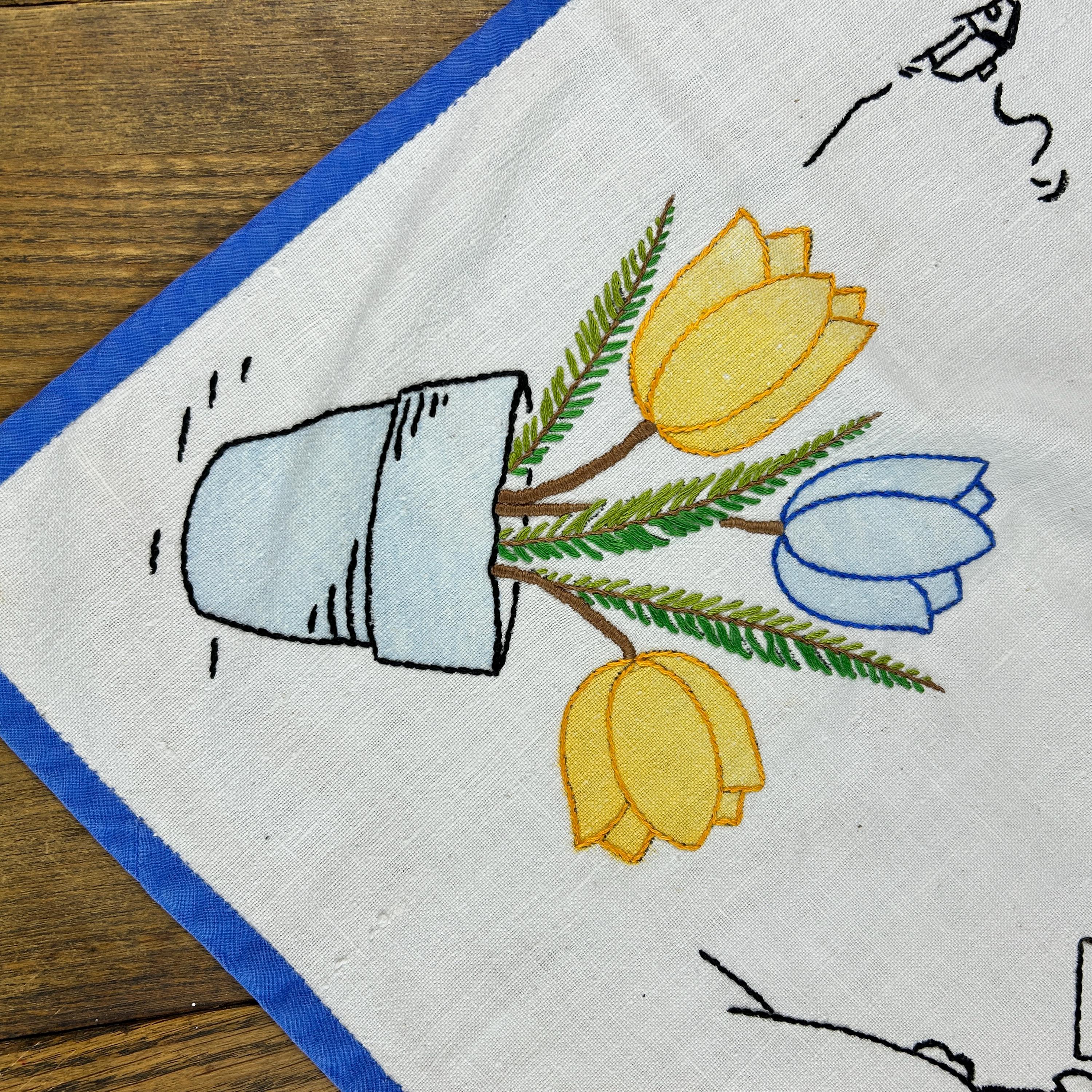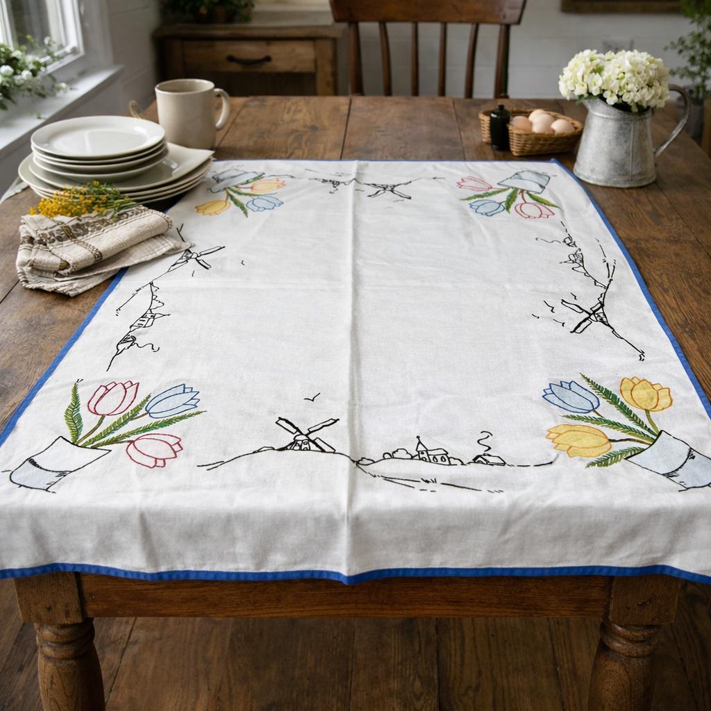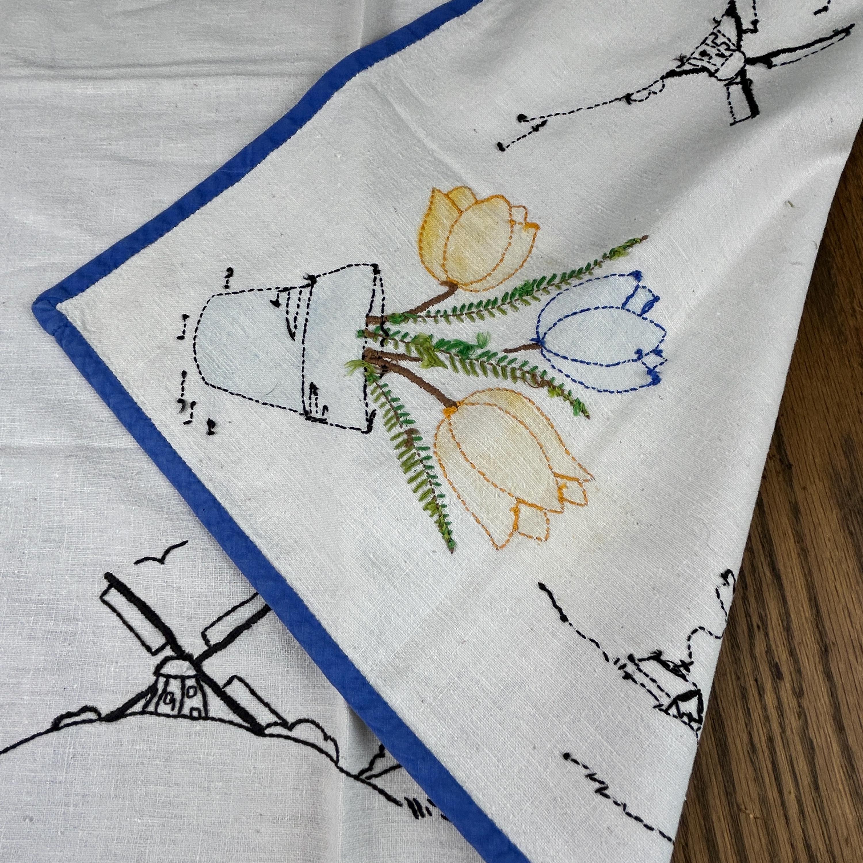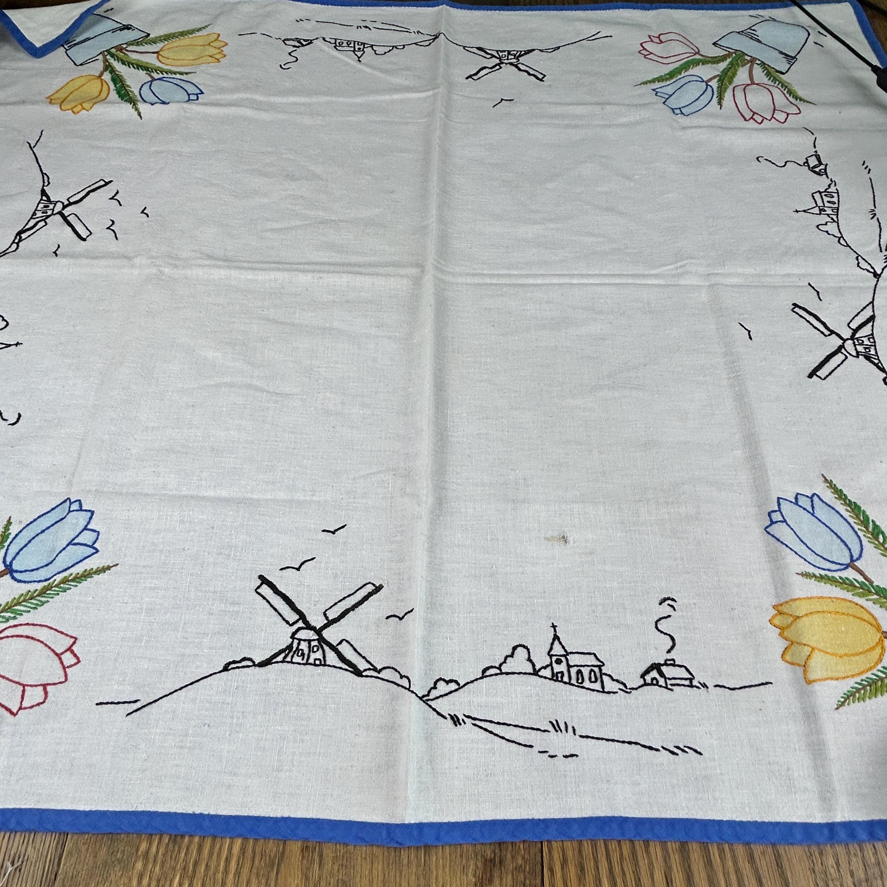 This beautifully embroidered linen table cover features tulips in each corner and windmills with church scenery embroidered on each side.