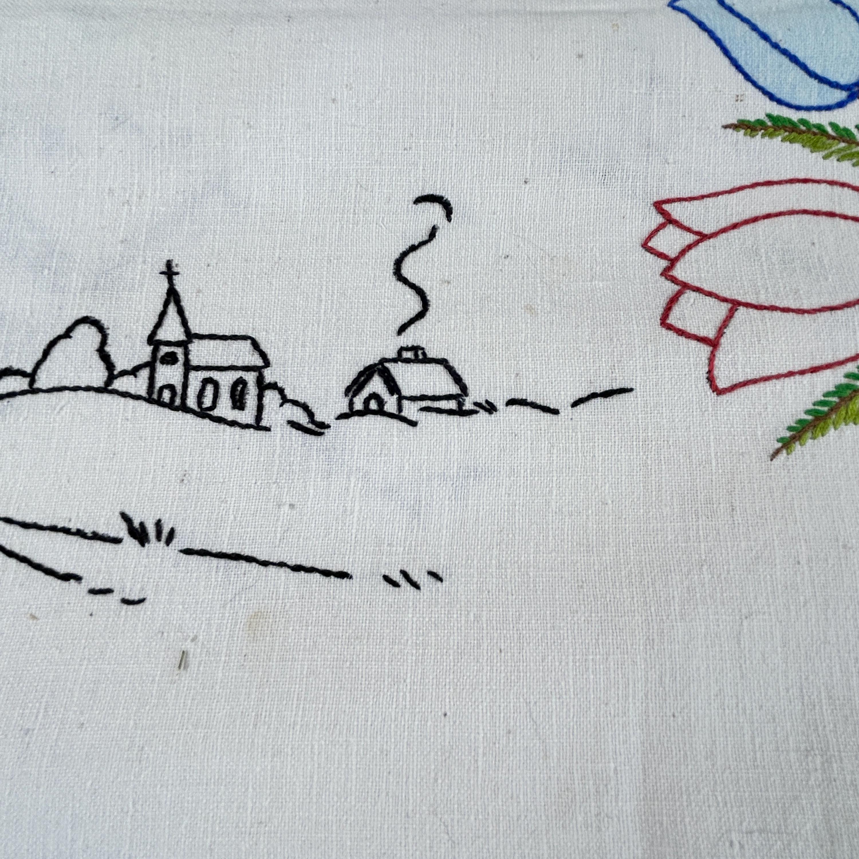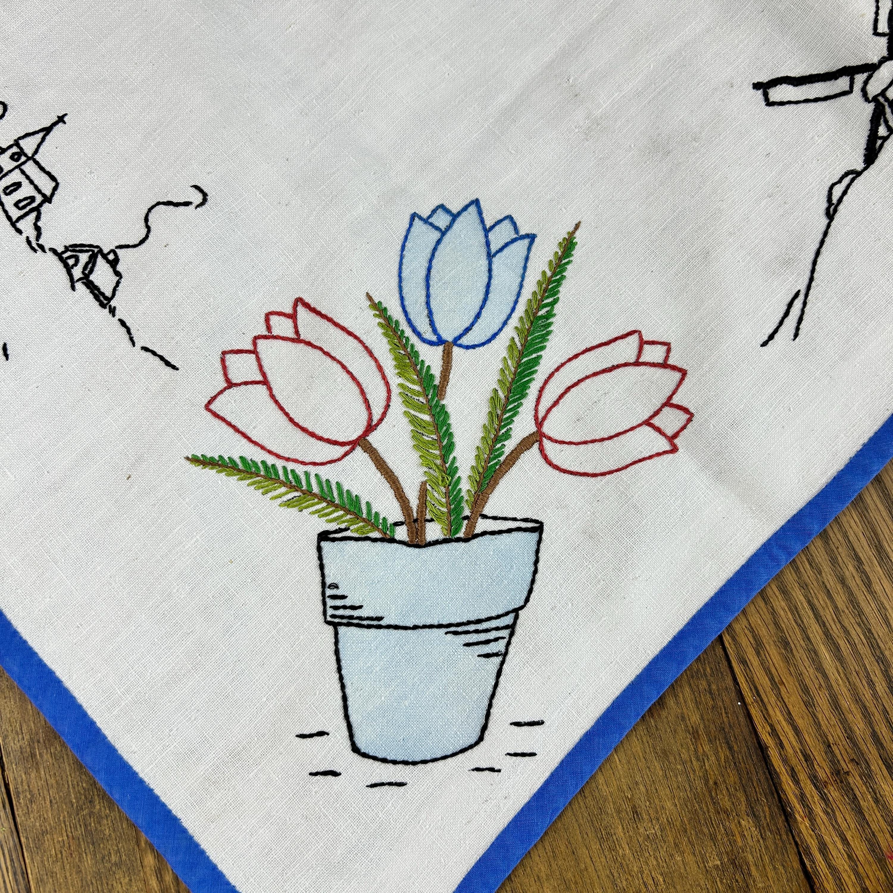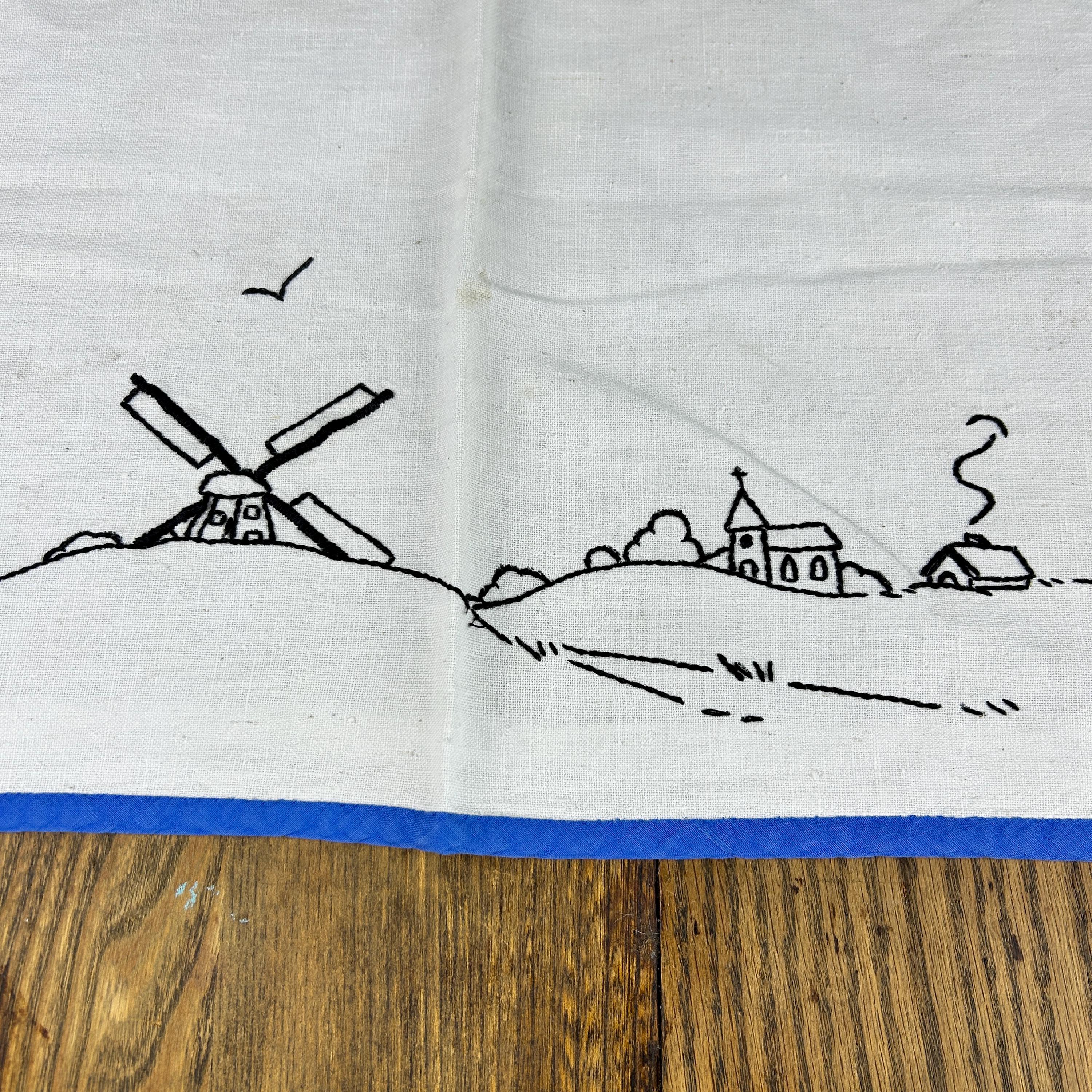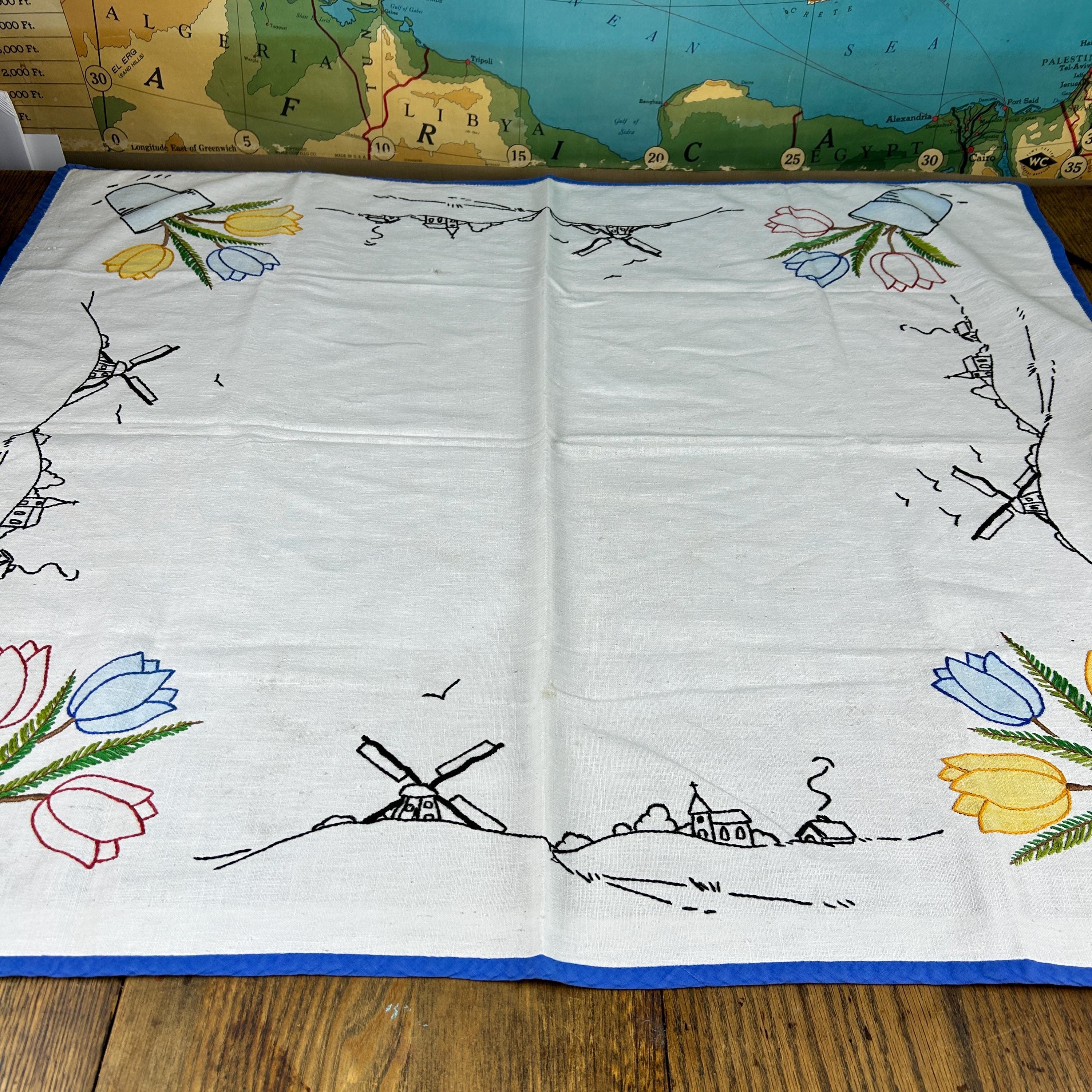 This beautifully embroidered linen table cover features tulips in each corner and windmills with church scenery embroidered on each side.