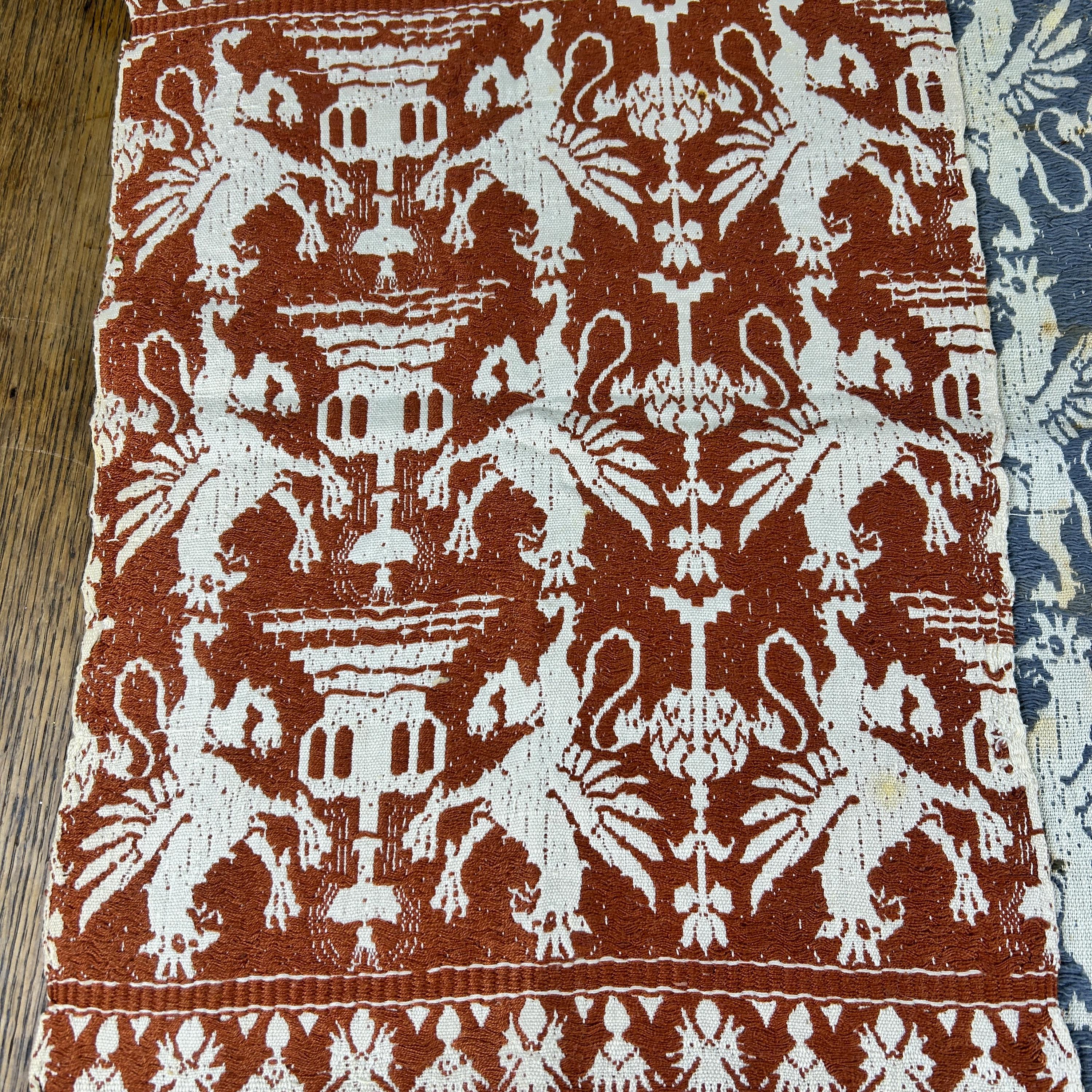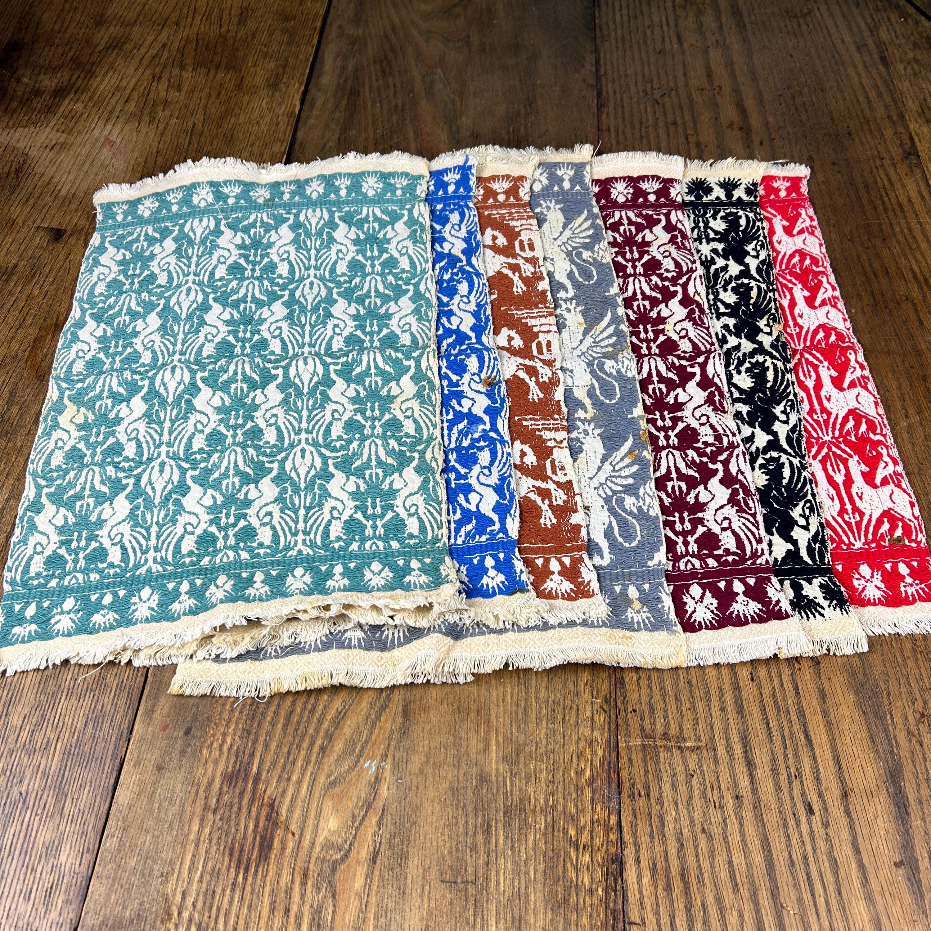 These textiles are very very rare, handwoven overshot sample from Europe.~ each has the most wonderful pattern! Each side is gorgeous!! It dates from the 1800's but I can't pinpoint the decade ~Most likely as a way for the weaver to show the patterns that she / he were capable of weaving, the customer could then place the order for the full size blanket. This textile is worthy of any museum in the world, it's a European treasure. I was offered collection of these lovely textiles and there are 7 in this set.