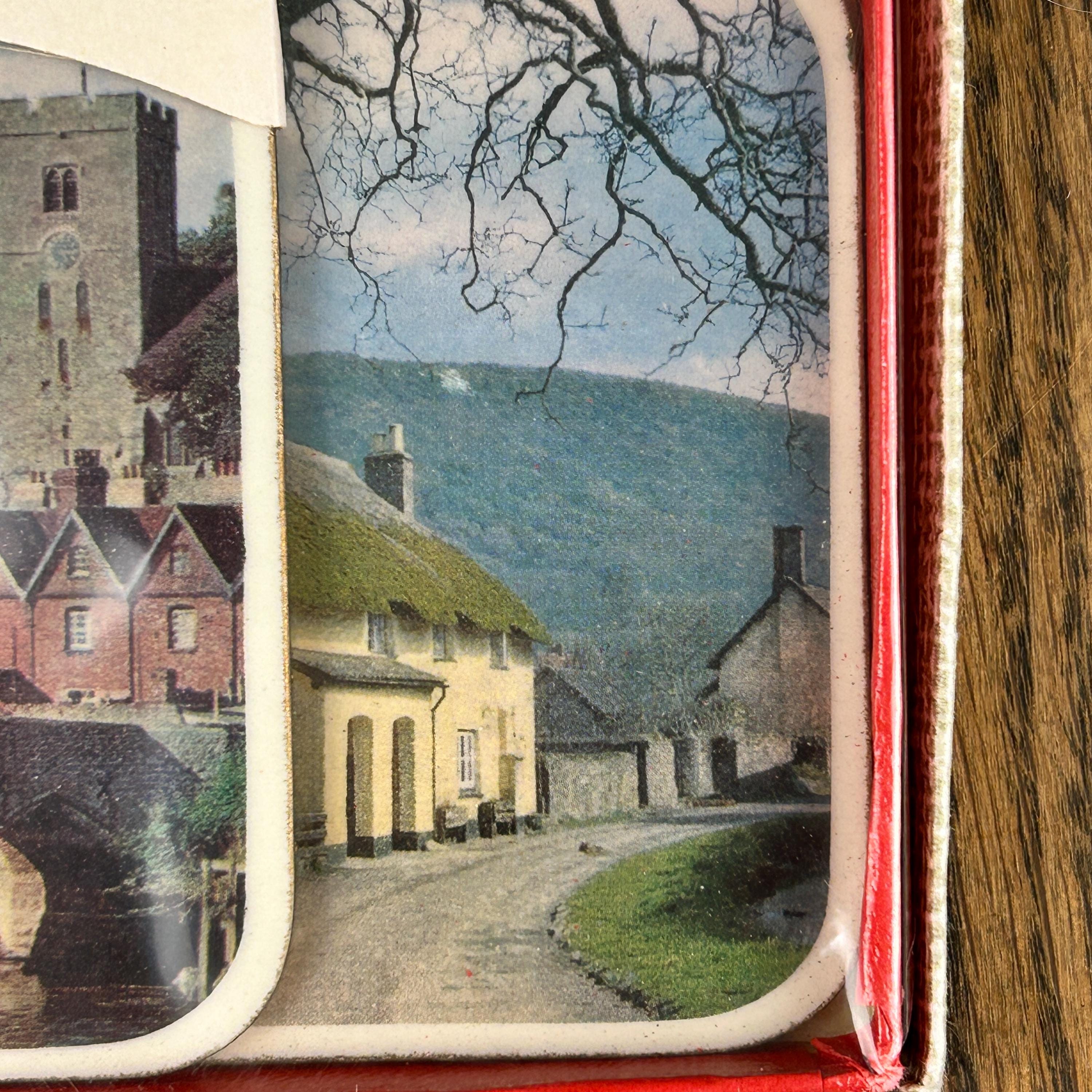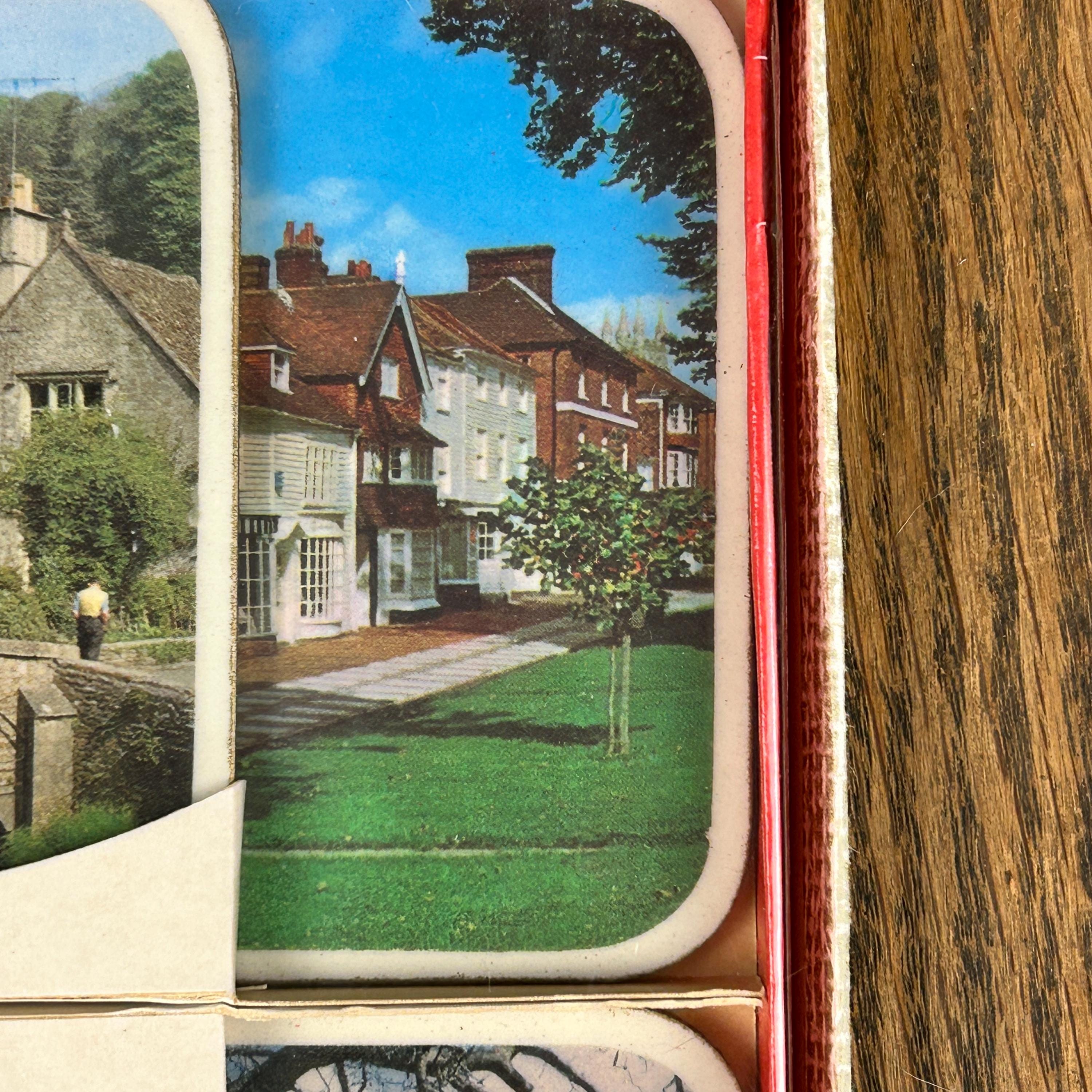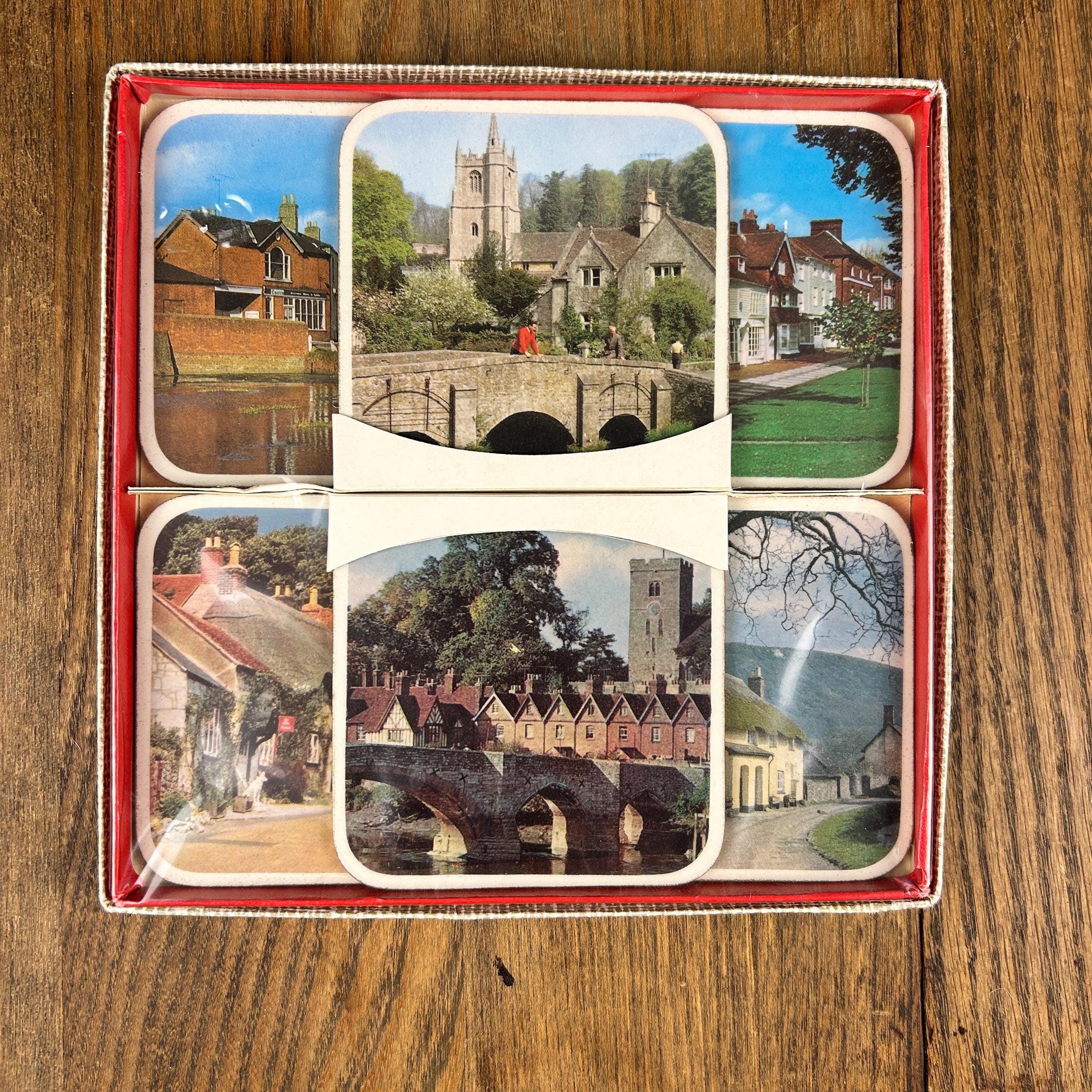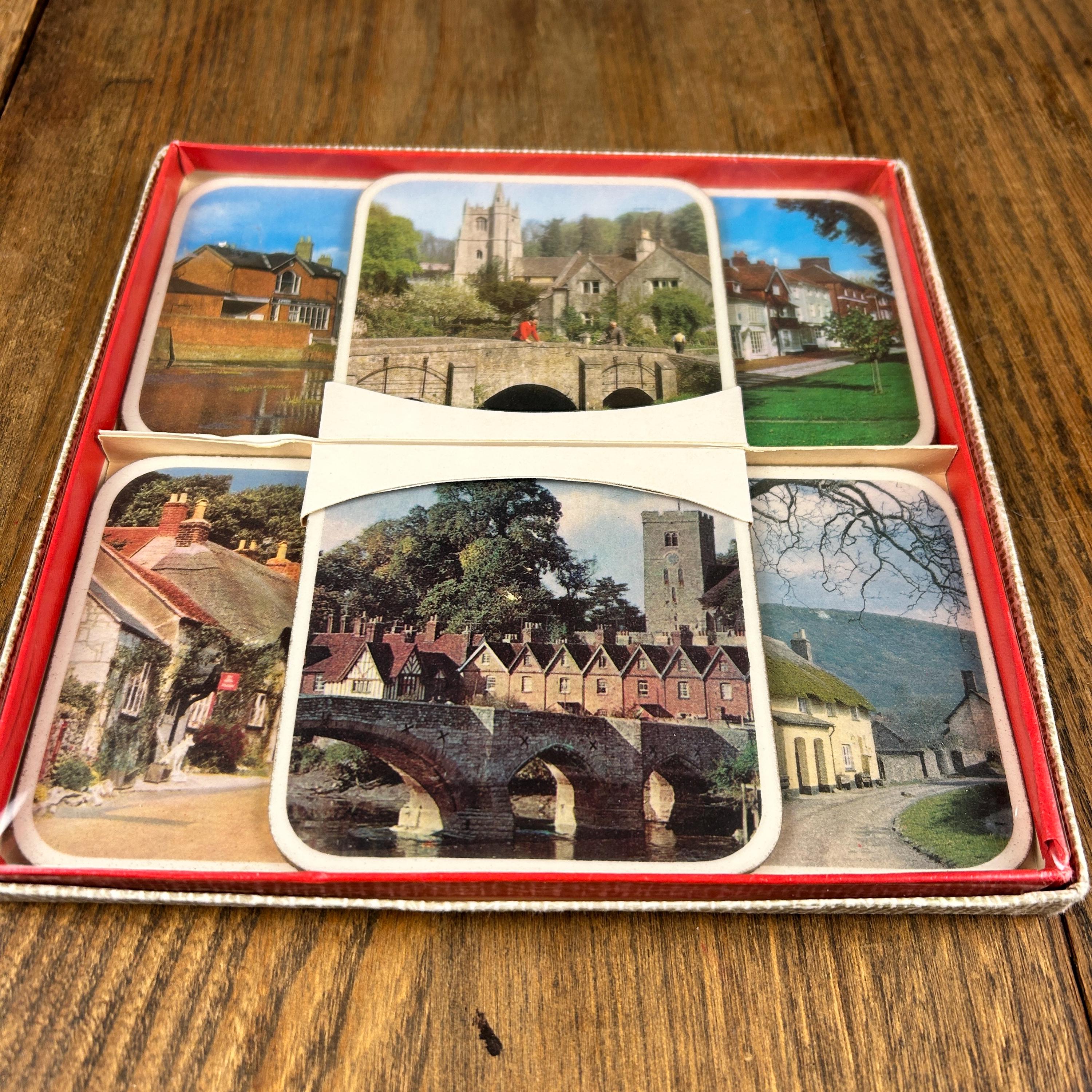Set of six Pimpernel brand coasters featuring scenes of English villages. These coasters are part of the "English Villages" collection and are made with a cork backing and a laminated top featuring photographs of different villages in England.
