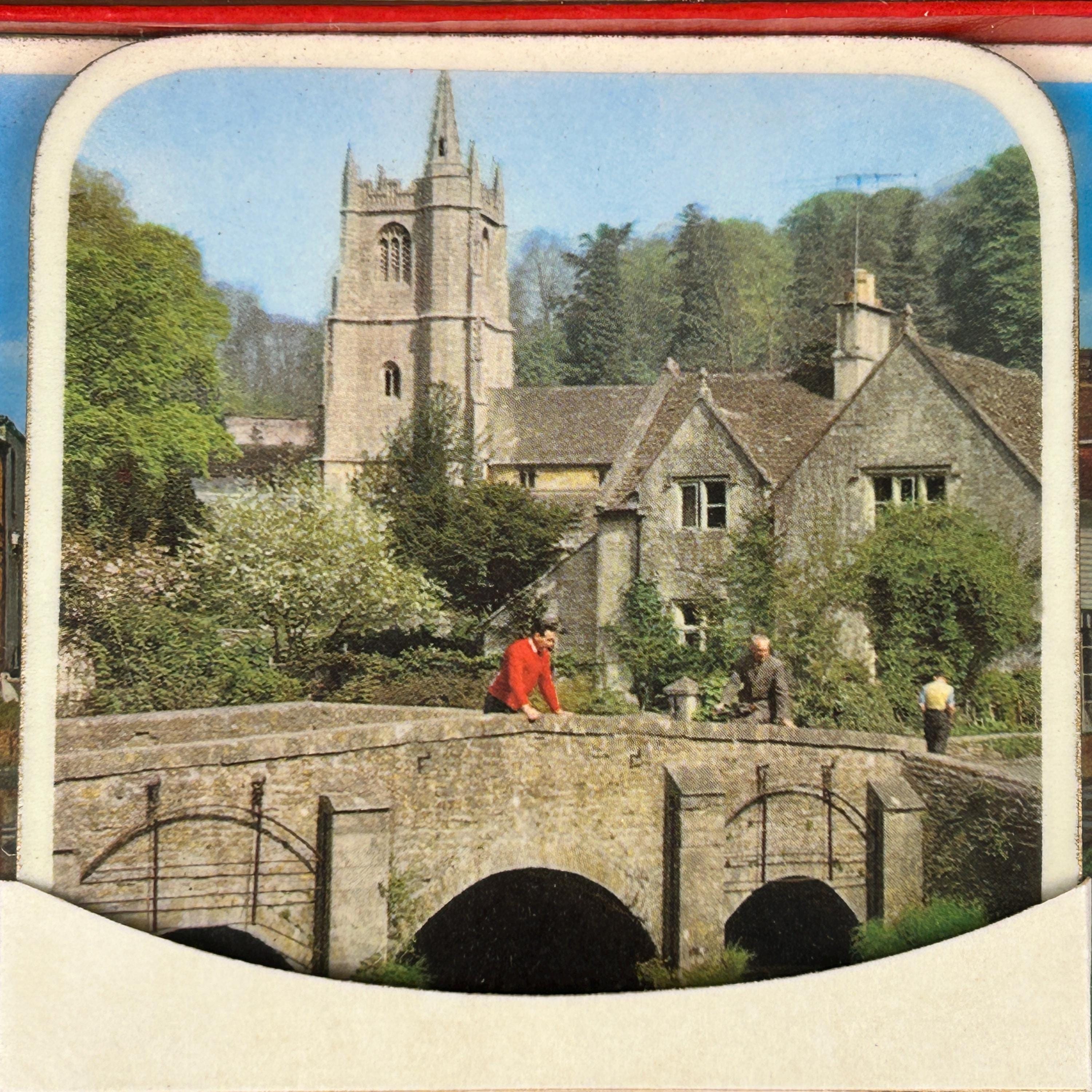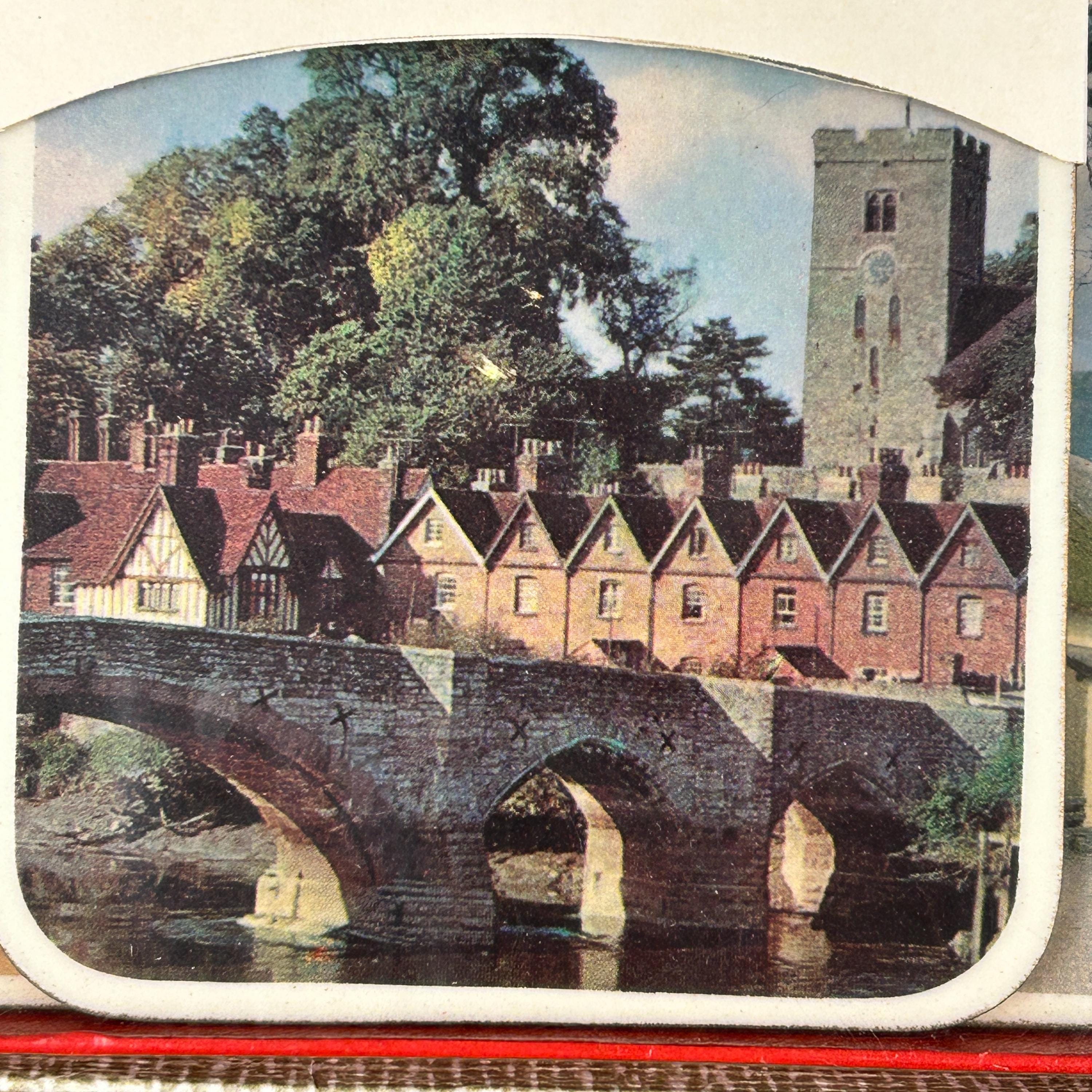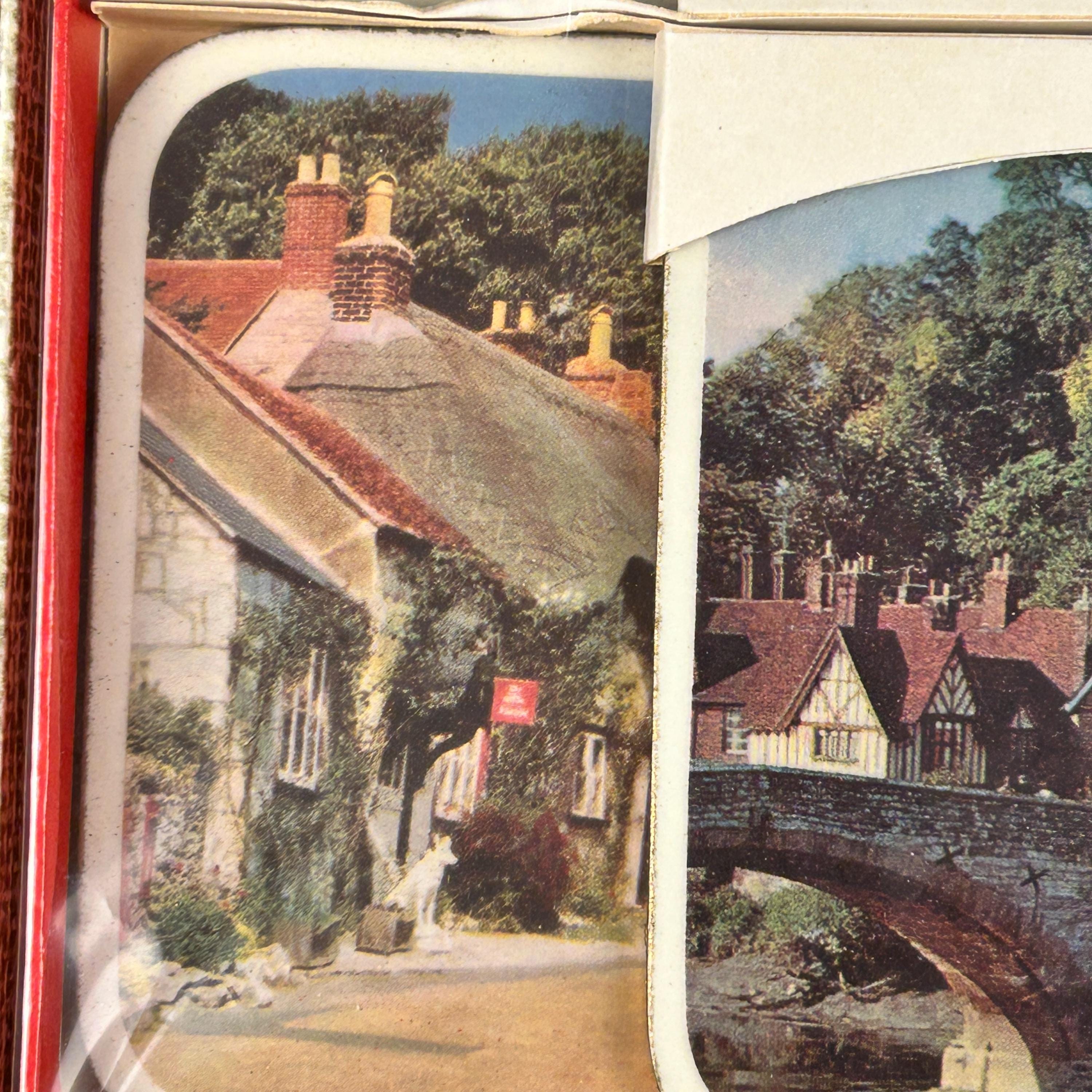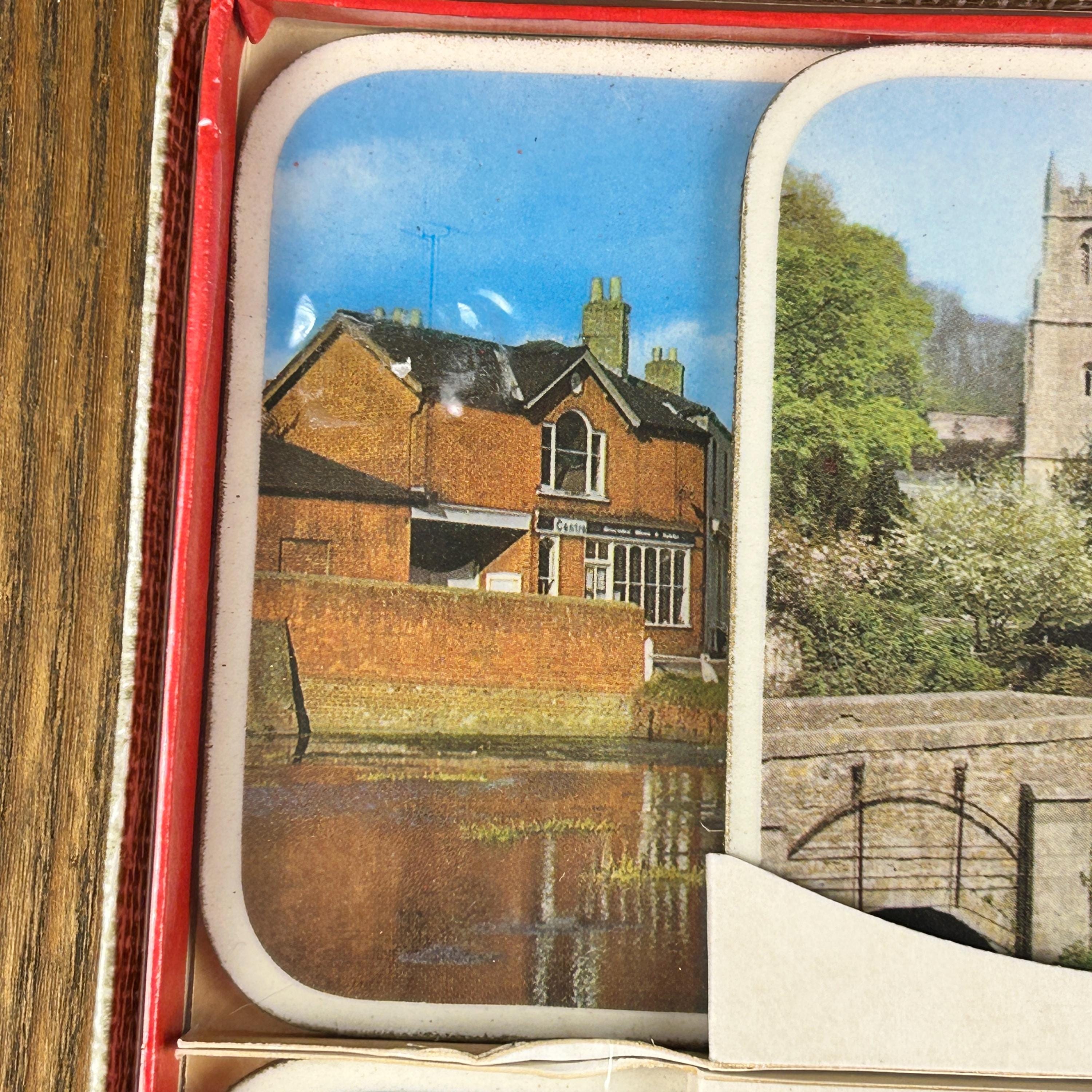 Set of six Pimpernel brand coasters featuring scenes of English villages. These coasters are part of the "English Villages" collection and are made with a cork backing and a laminated top featuring photographs of different villages in England.