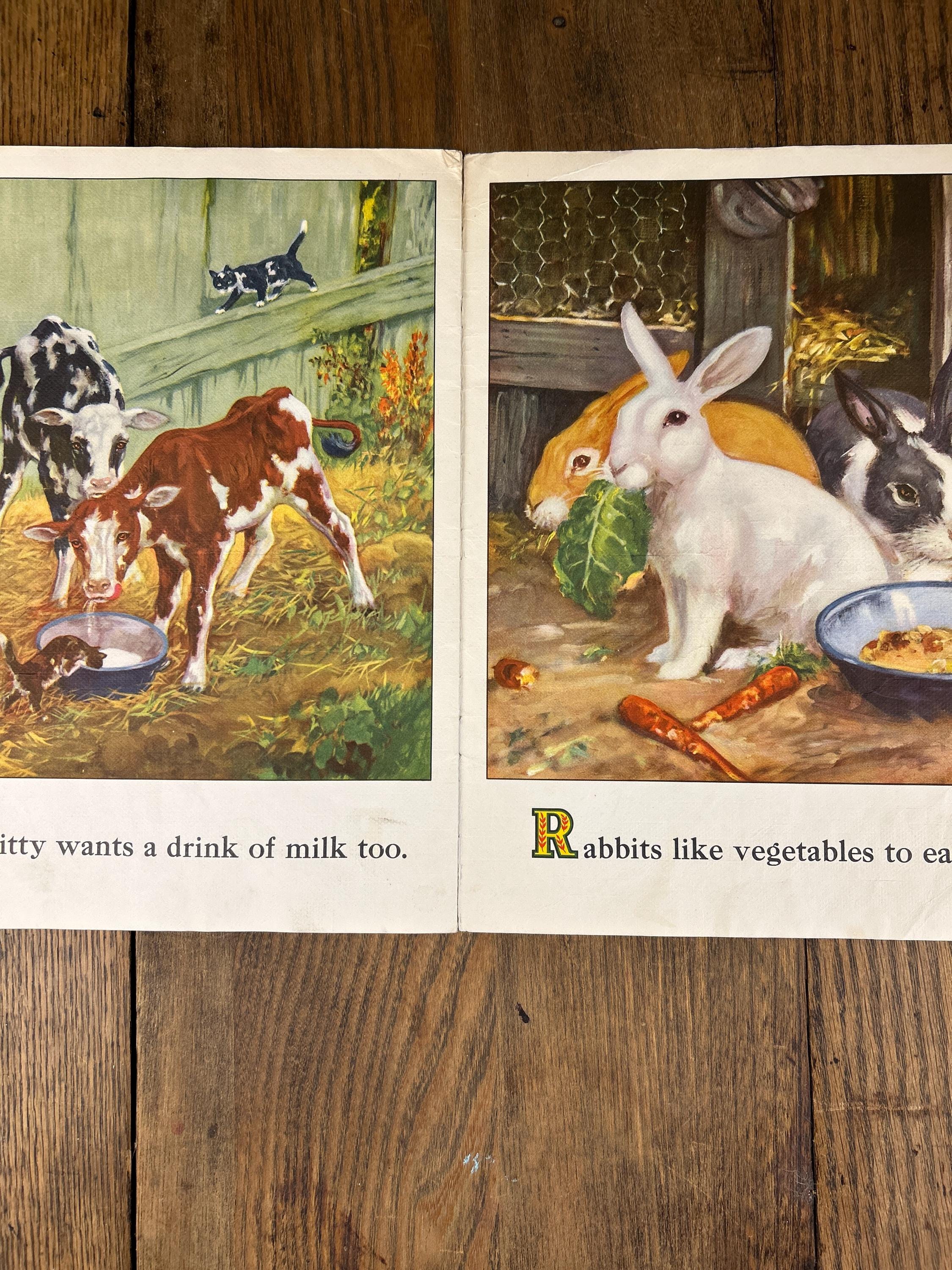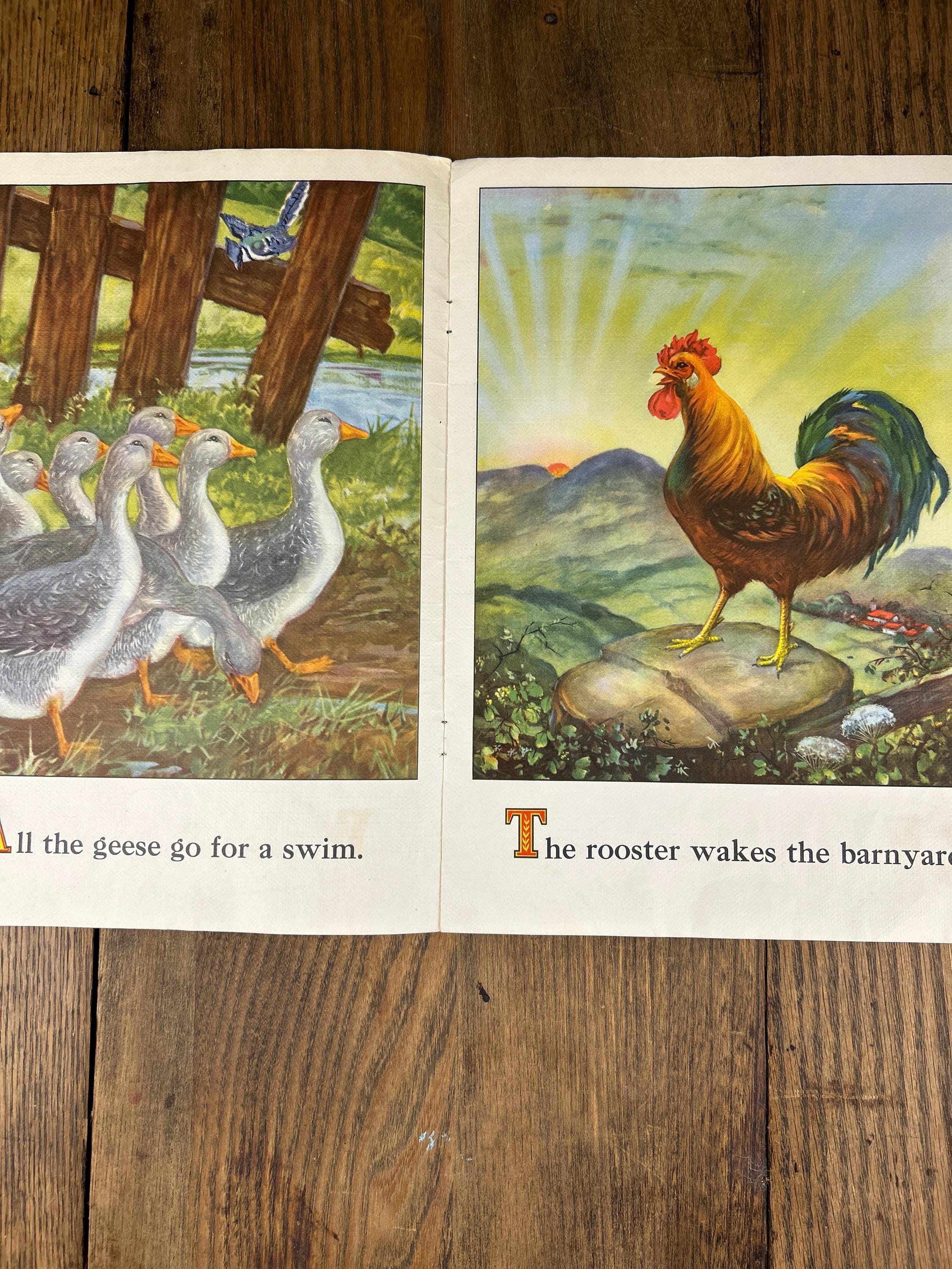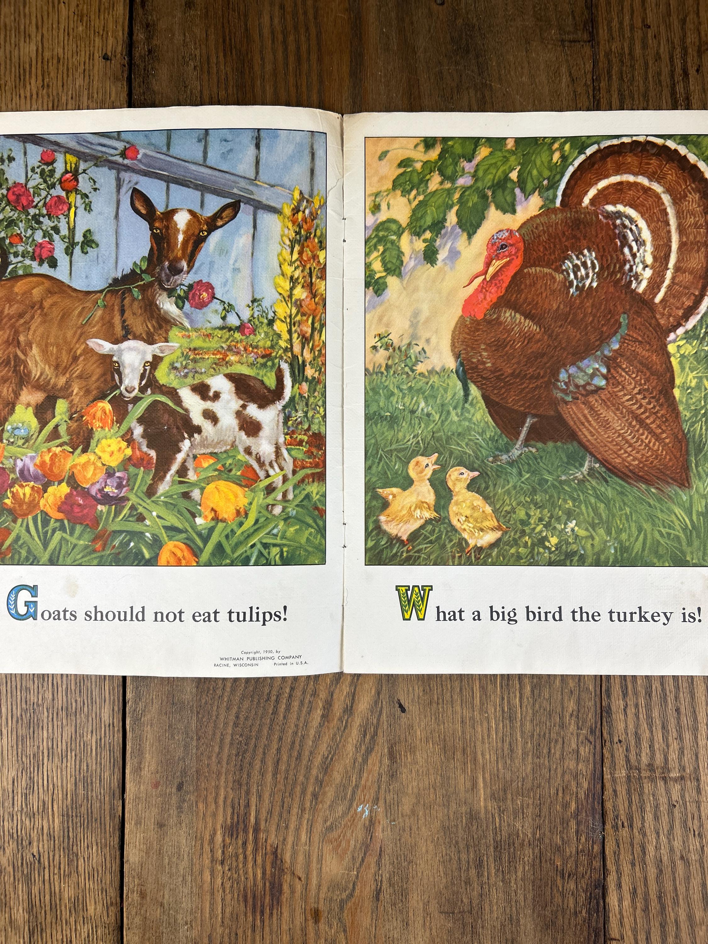 This is such a beautiful children's book. Beautifully illustrated of farm animals and the farmer. Features cows, turkeys, goats, rooster, geese, horse, pig, kittens, dogs, sheep, rabbits, chickens, and more!