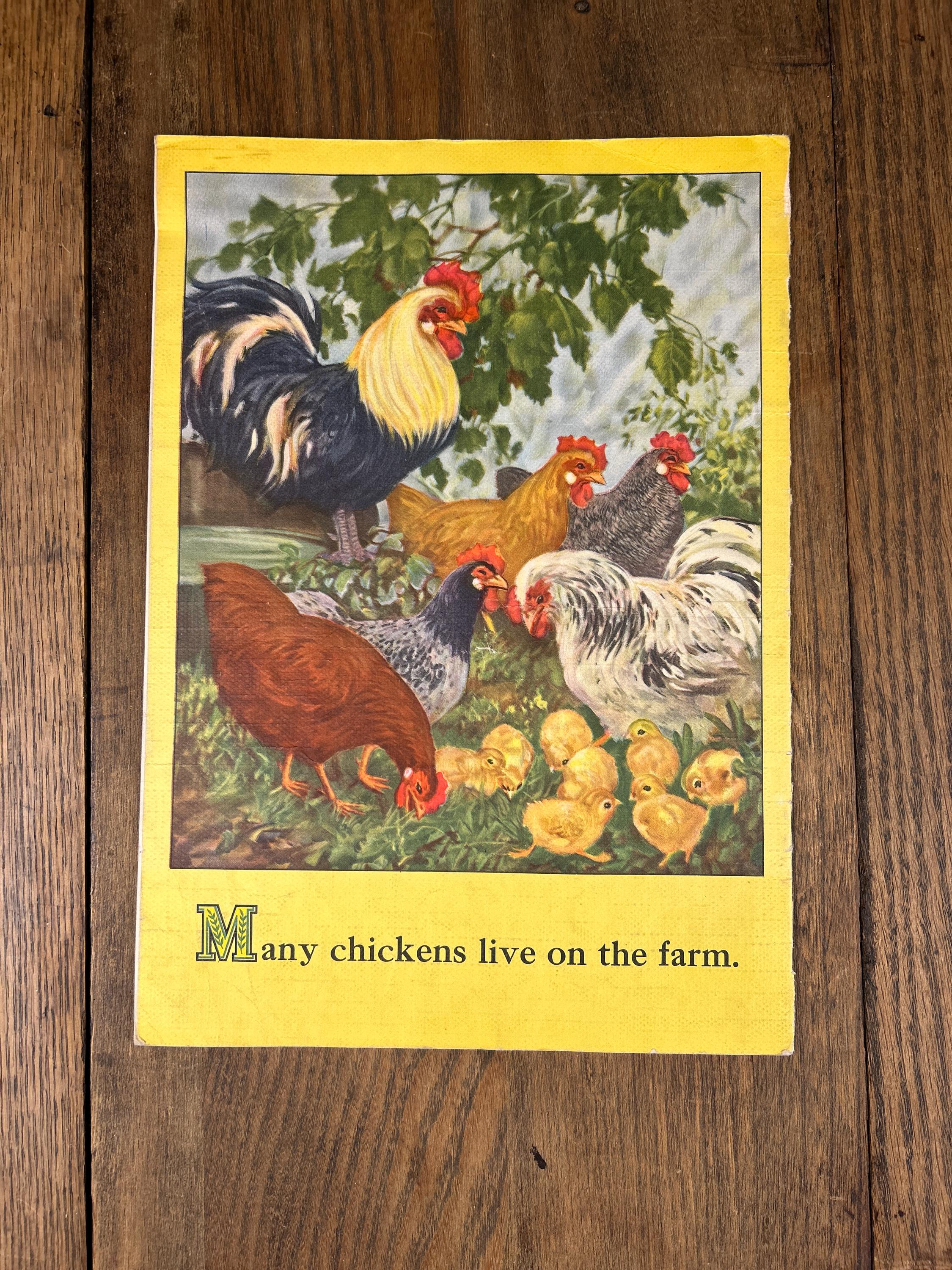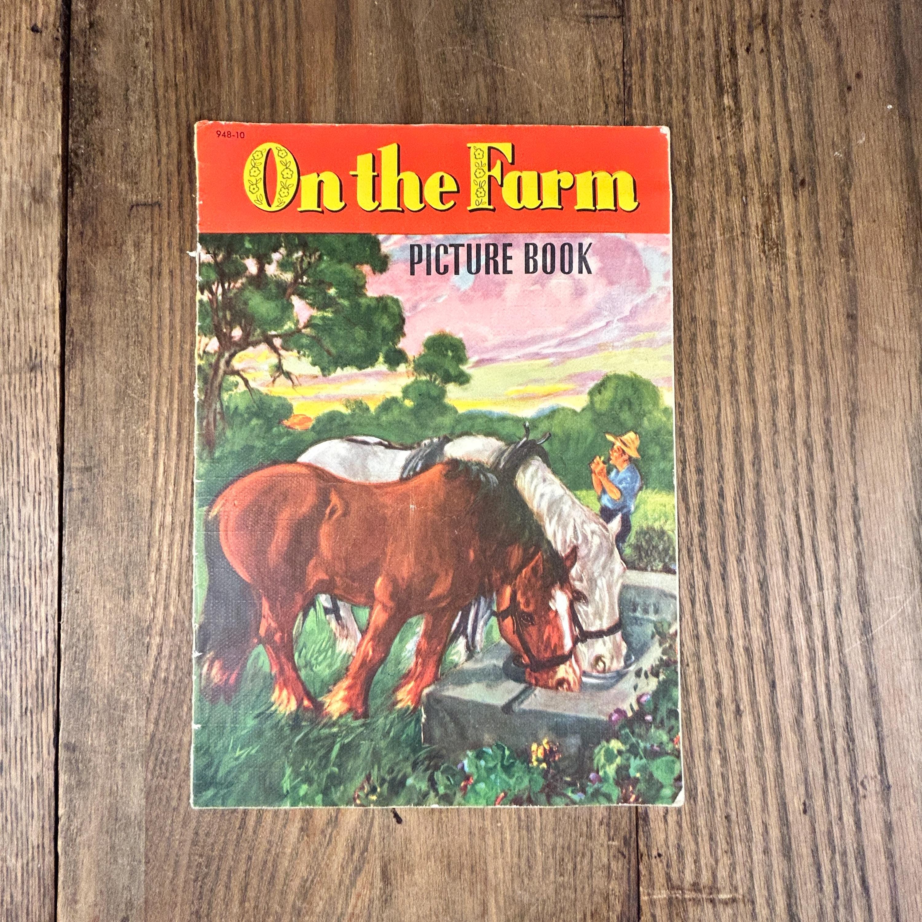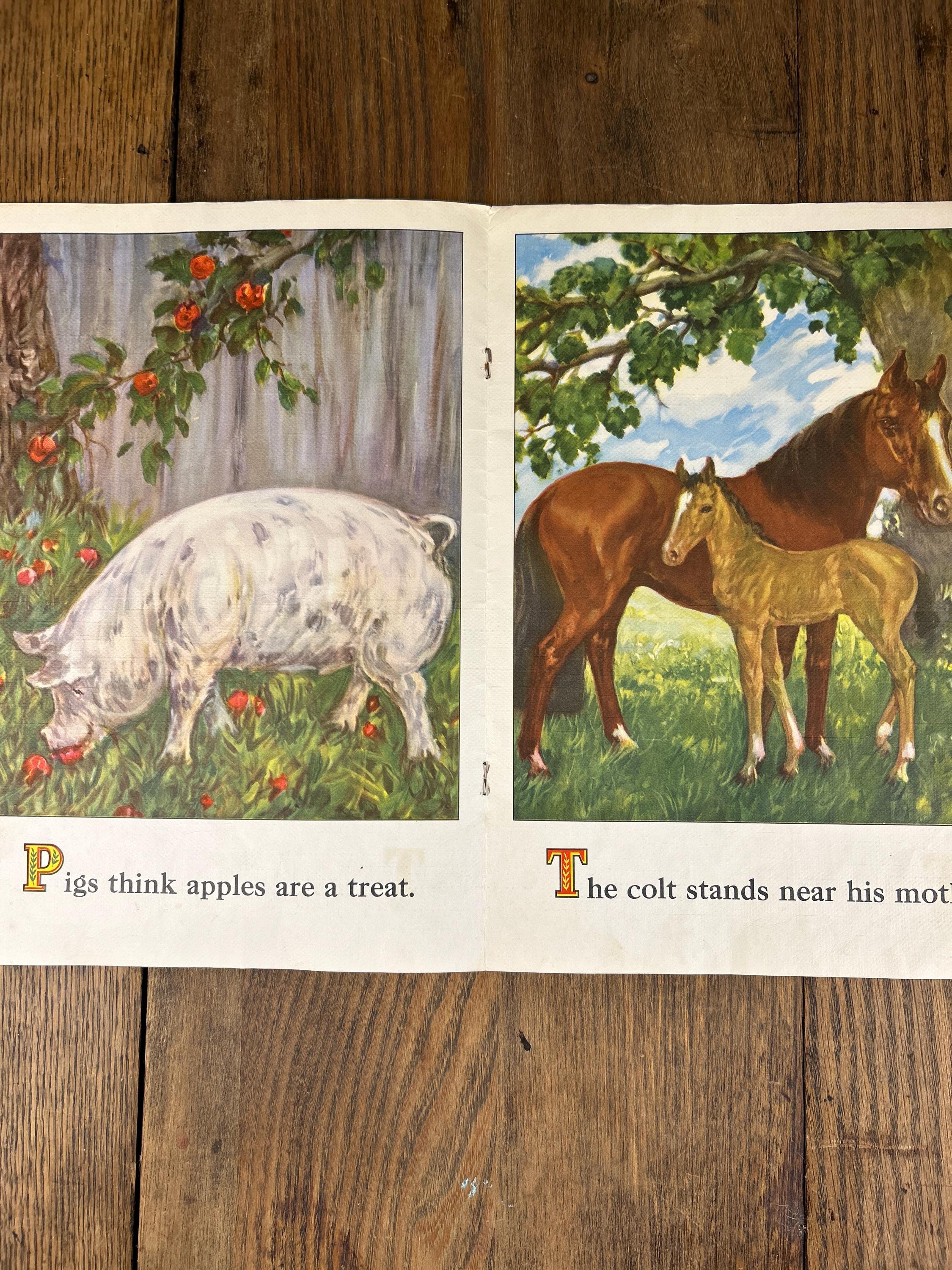 This is such a beautiful children's book. Beautifully illustrated of farm animals and the farmer. Features cows, turkeys, goats, rooster, geese, horse, pig, kittens, dogs, sheep, rabbits, chickens, and more!