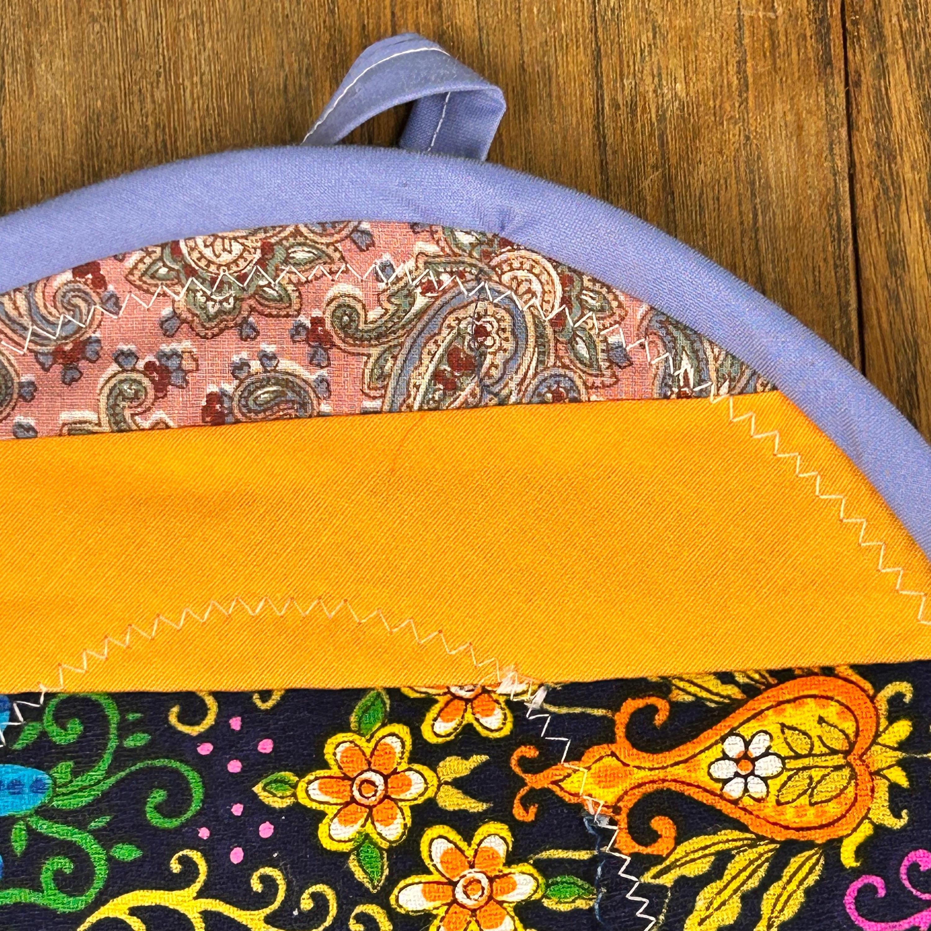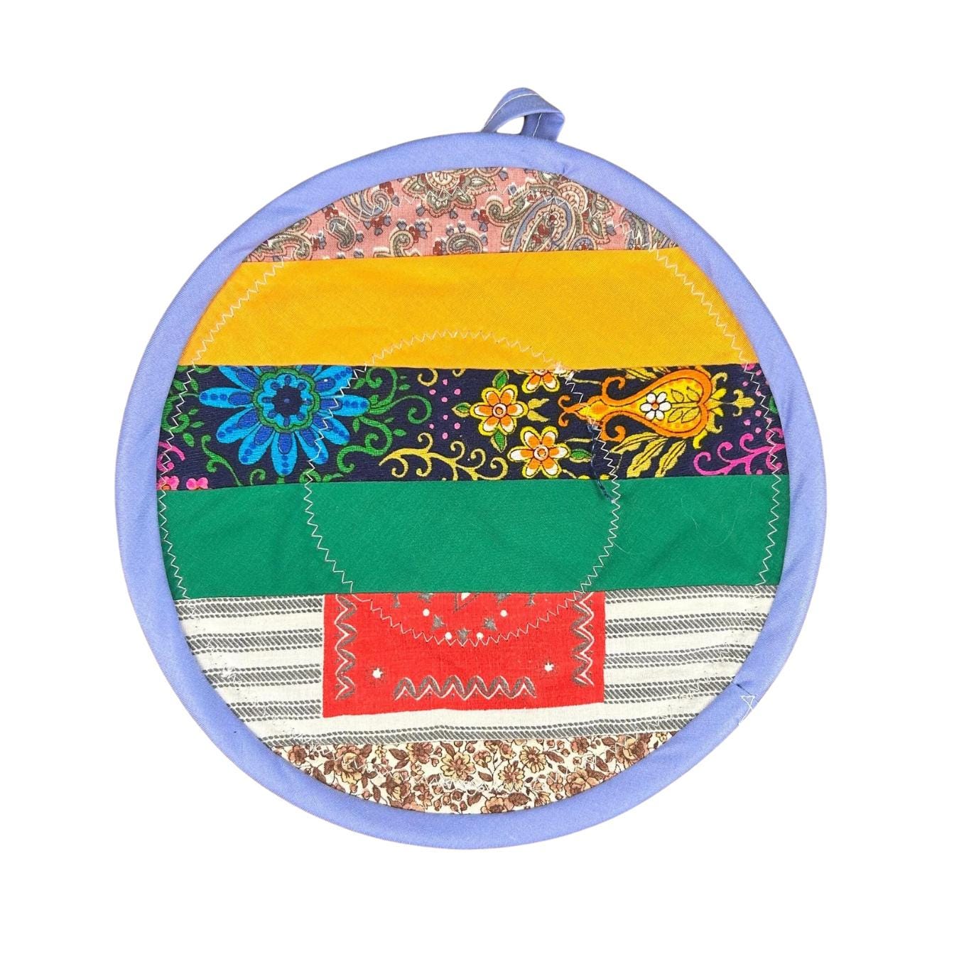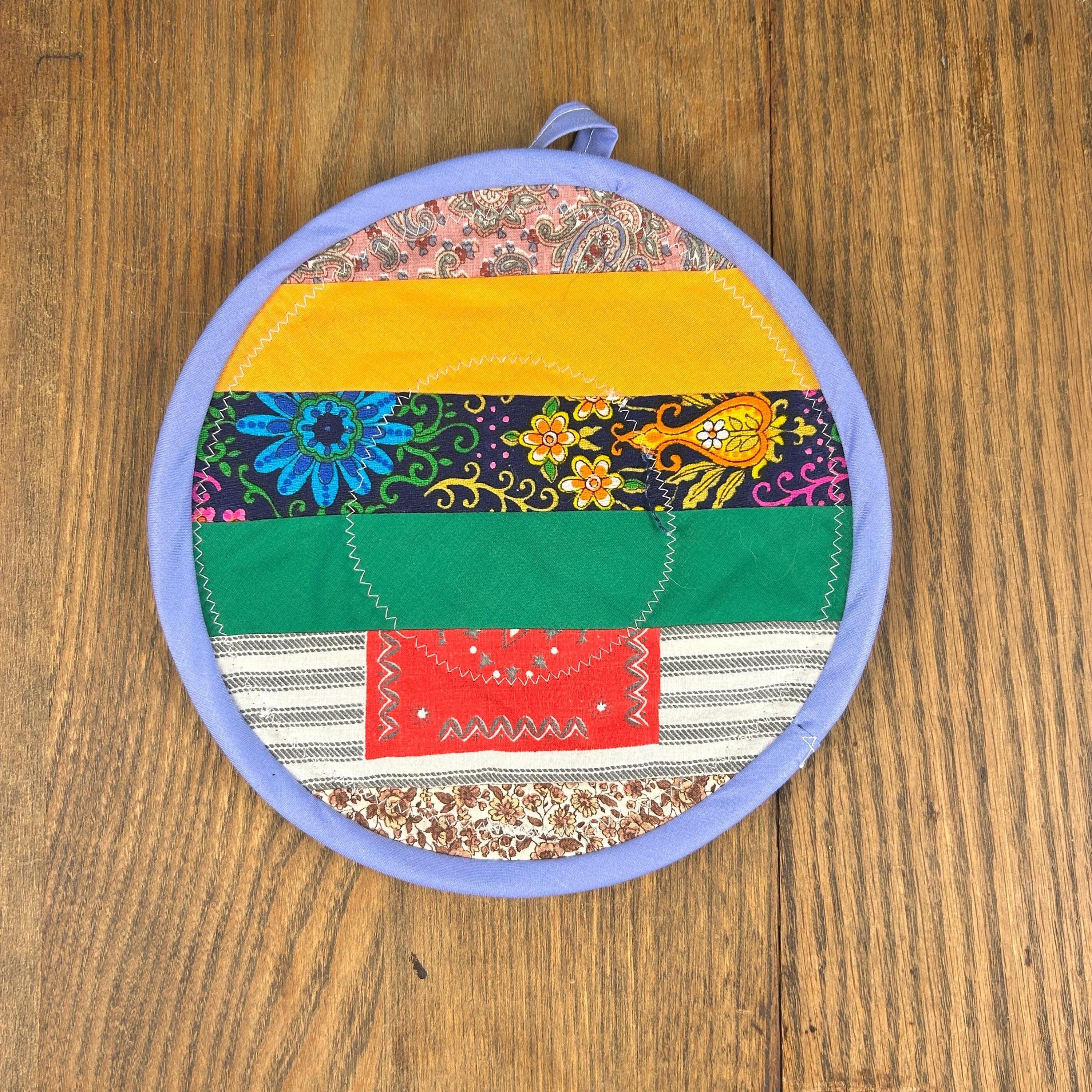 Wonderfully handmade quilted potholder and hot pad. Various vintage fabrics with greens, reds, white, yellows and more. Edged in blue fabric with fabric loop at top. Backed in soft denim fabric. VERY CLEAN. Probably never used.