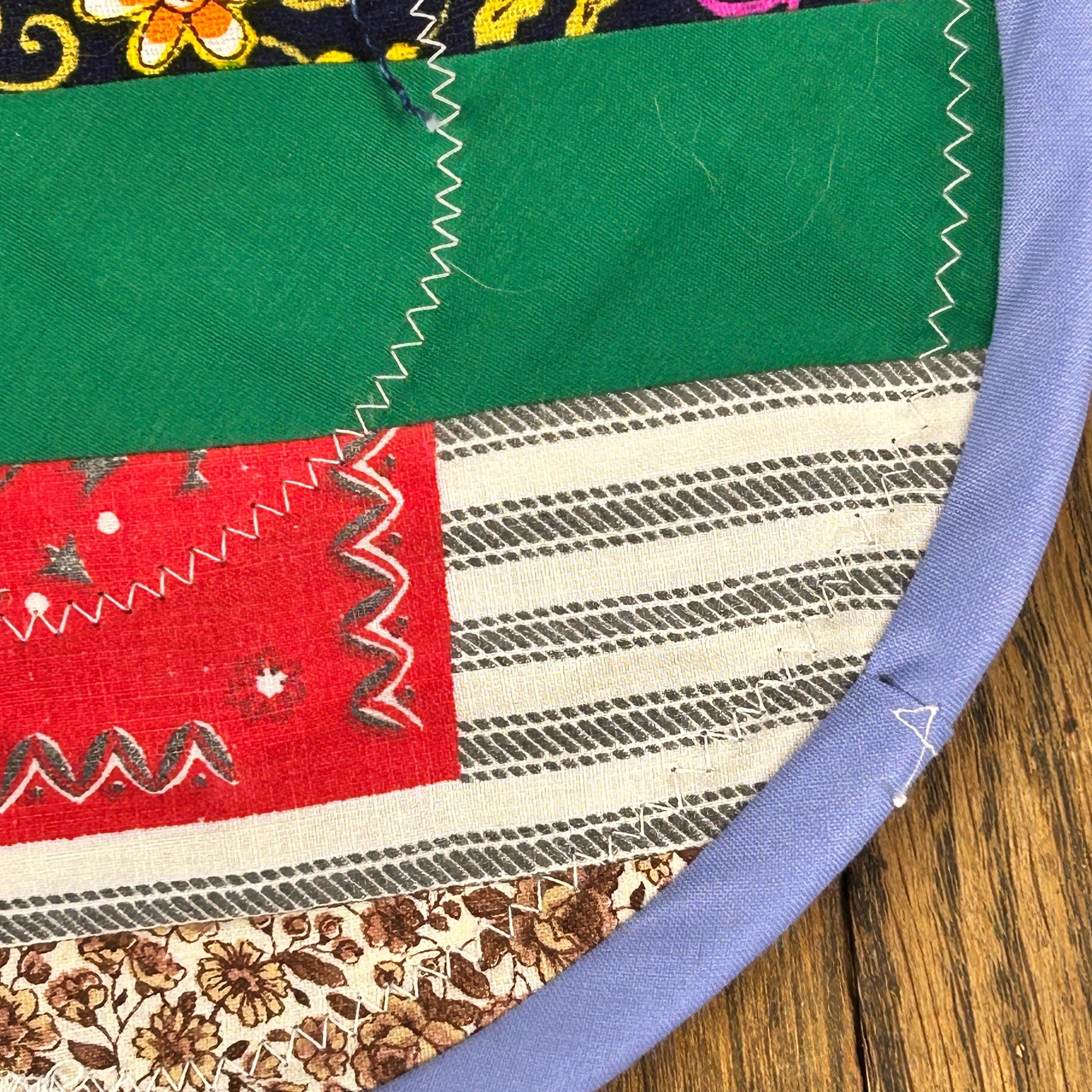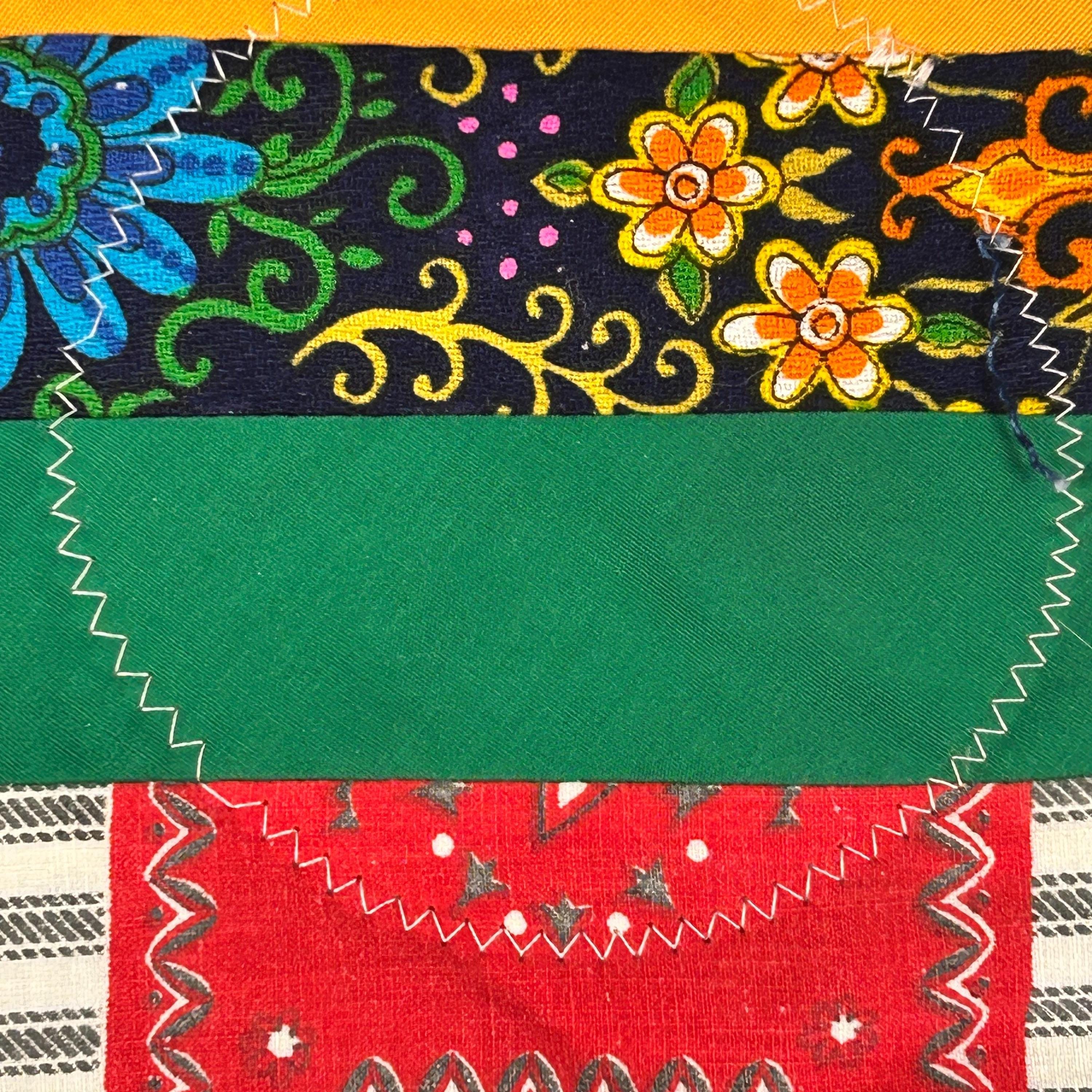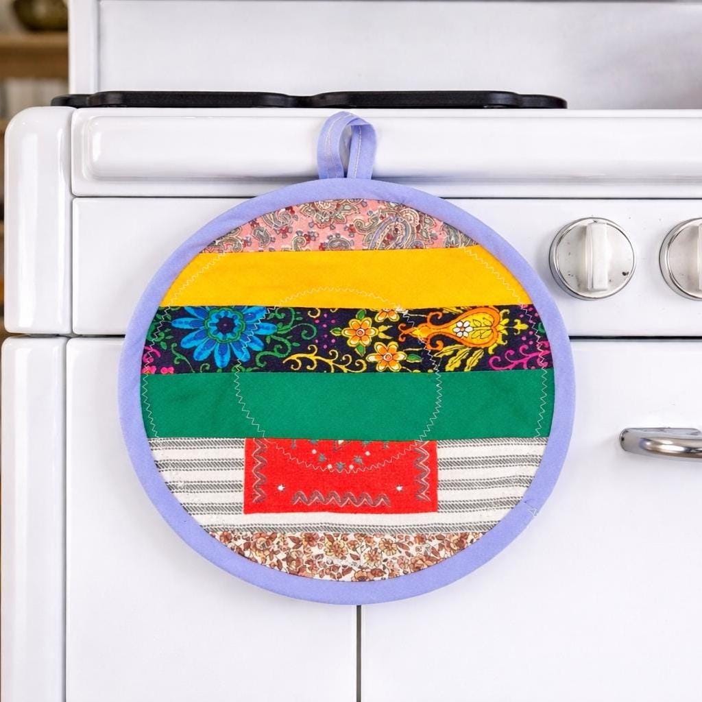 Wonderfully handmade quilted potholder and hot pad. Various vintage fabrics with greens, reds, white, yellows and more. Edged in blue fabric with fabric loop at top. Backed in soft denim fabric. VERY CLEAN. Probably never used.
