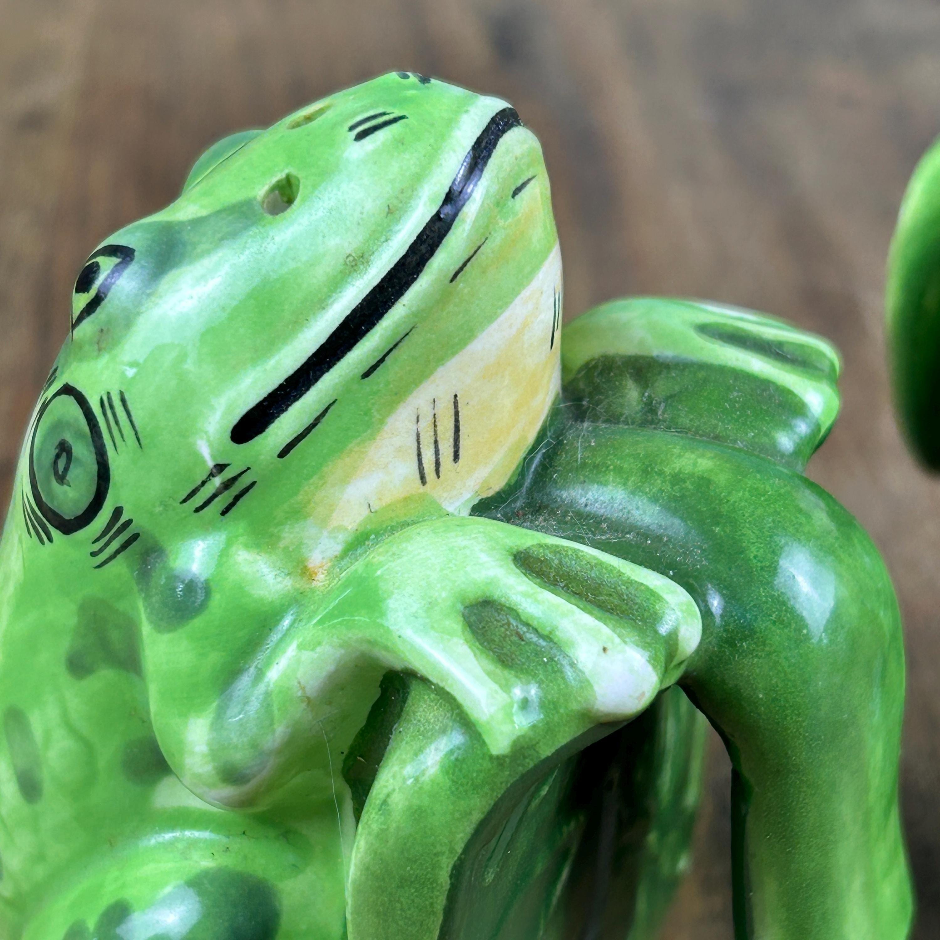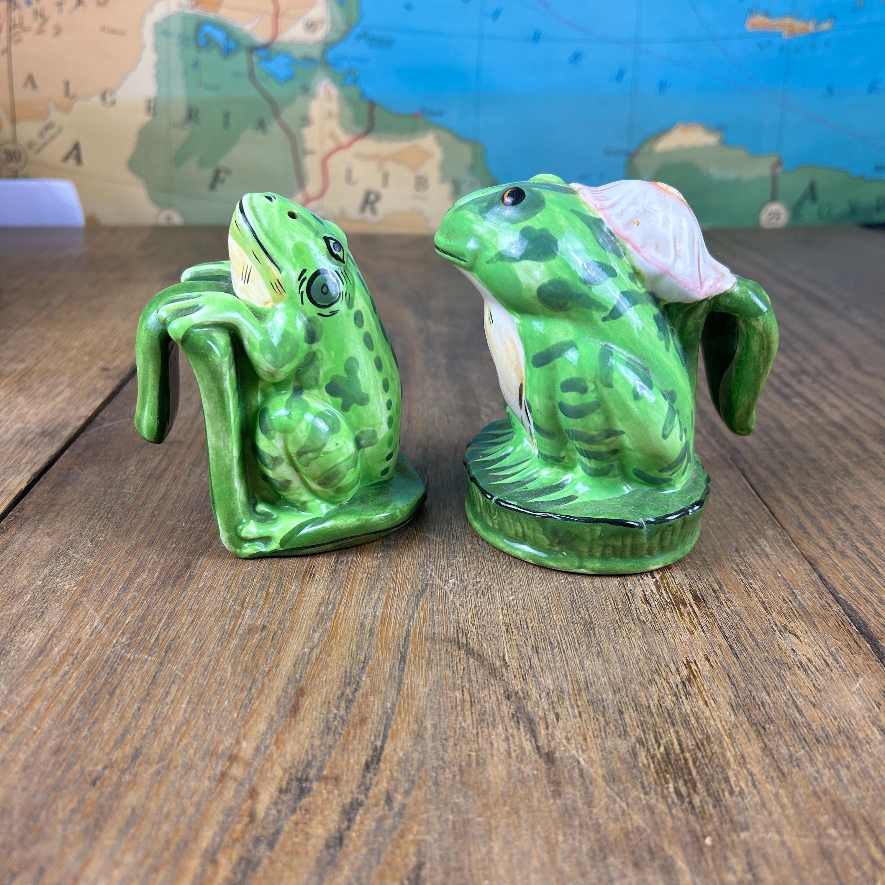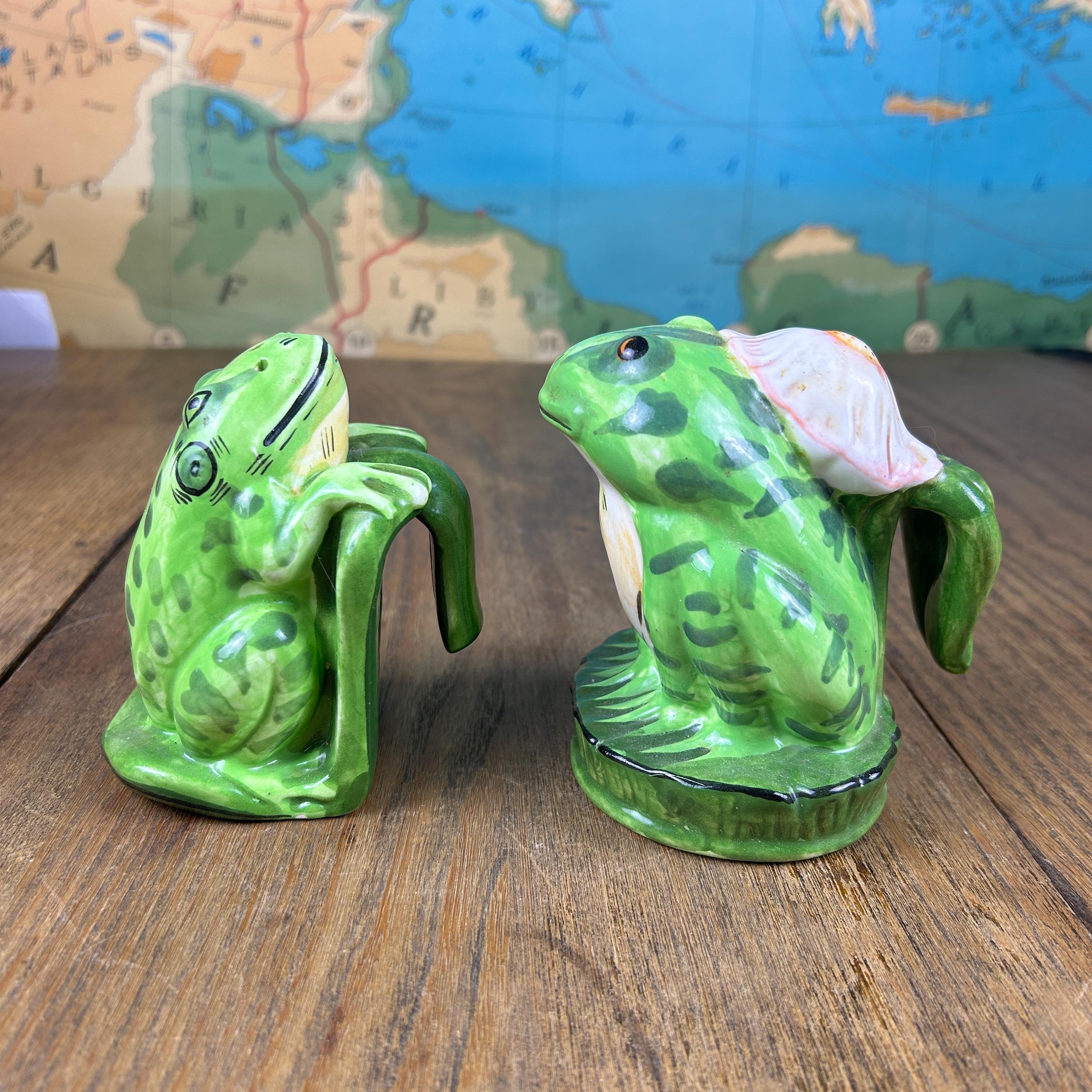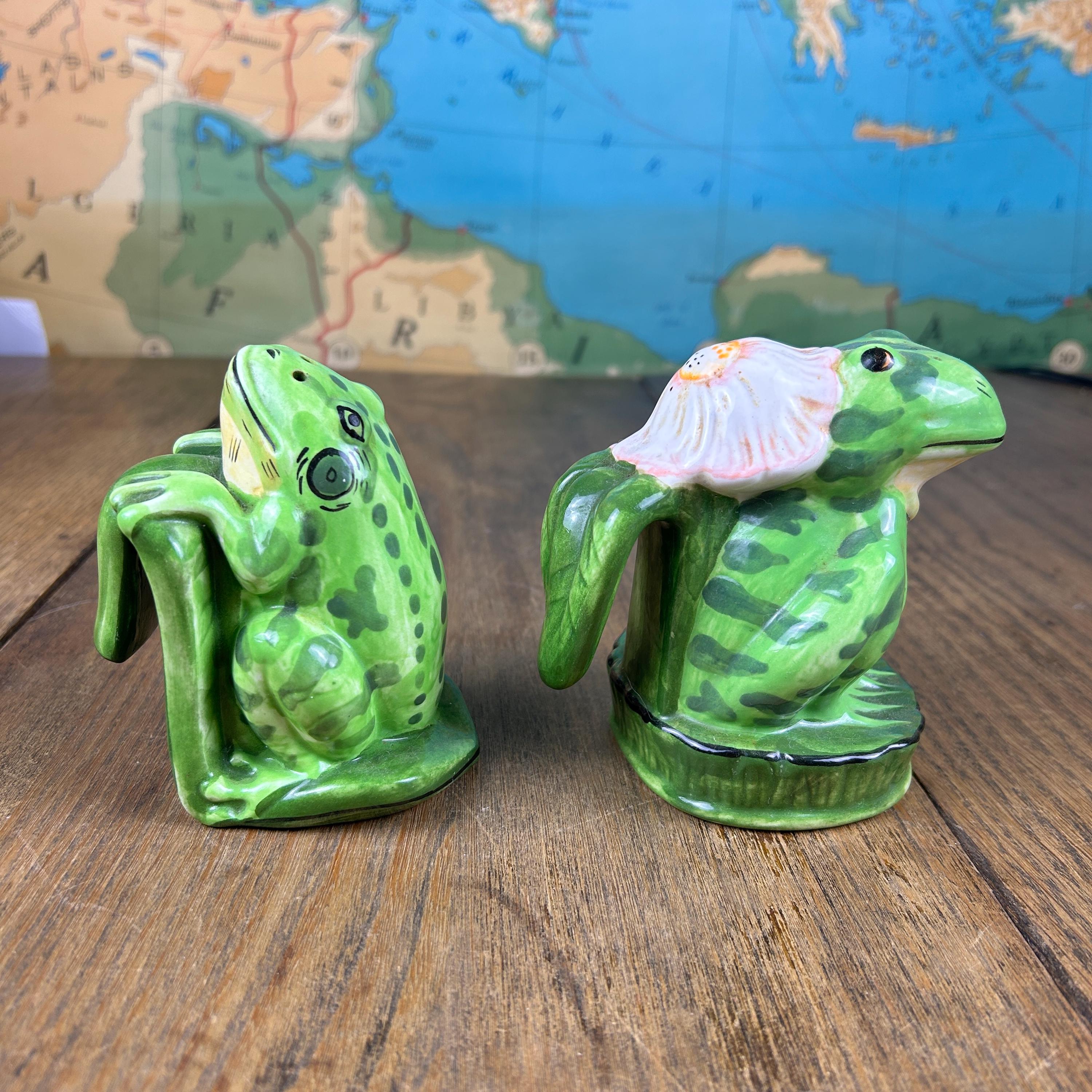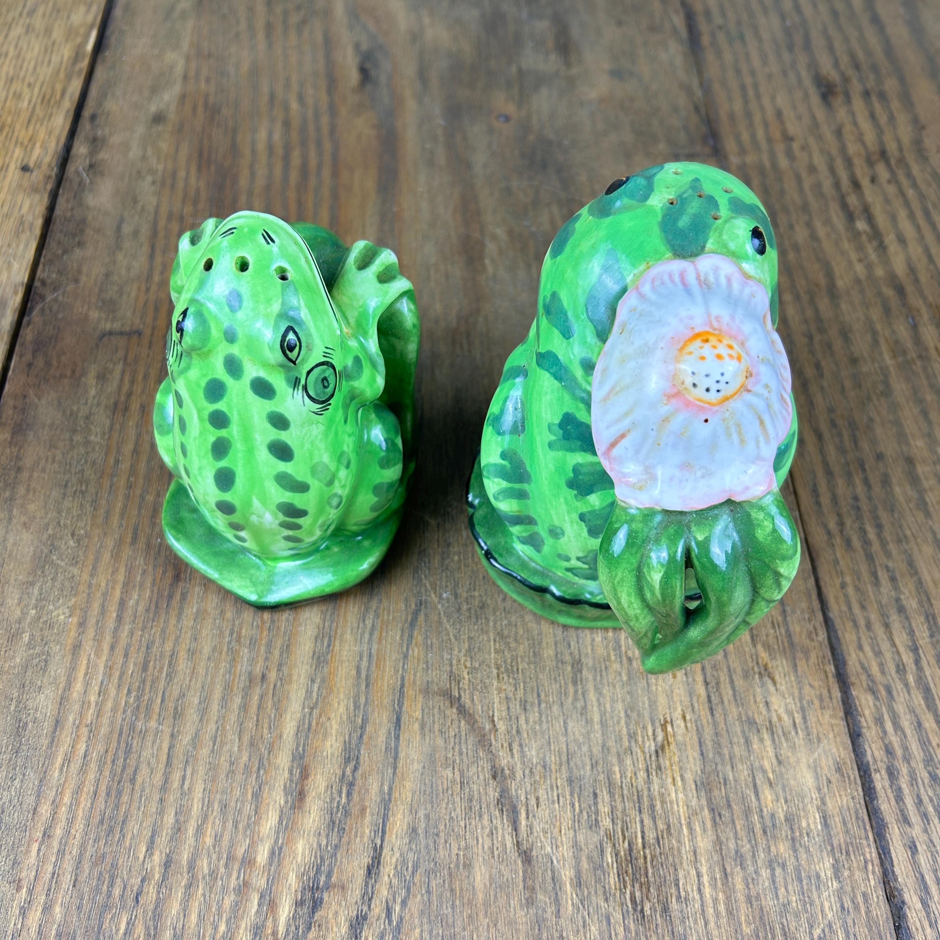 Add a touch of whimsy to your dining table with this adorable set of vintage frog salt and pepper shakers from Lilypadders Hangups. Hand-painted in 1996, these ceramic shakers feature a charming frog design with handles for easy seasoning. The set includes one pepper shaker and one salt shaker, both with stoppers to keep your spices fresh. I don't think either have had salt or pepper in them. Rubber stoppers still intact. Perfect for any occasion, these shakers are ideal for animal lovers and collectors alike. The green color and frog shape make them a great addition to any cottage-style kitchen.