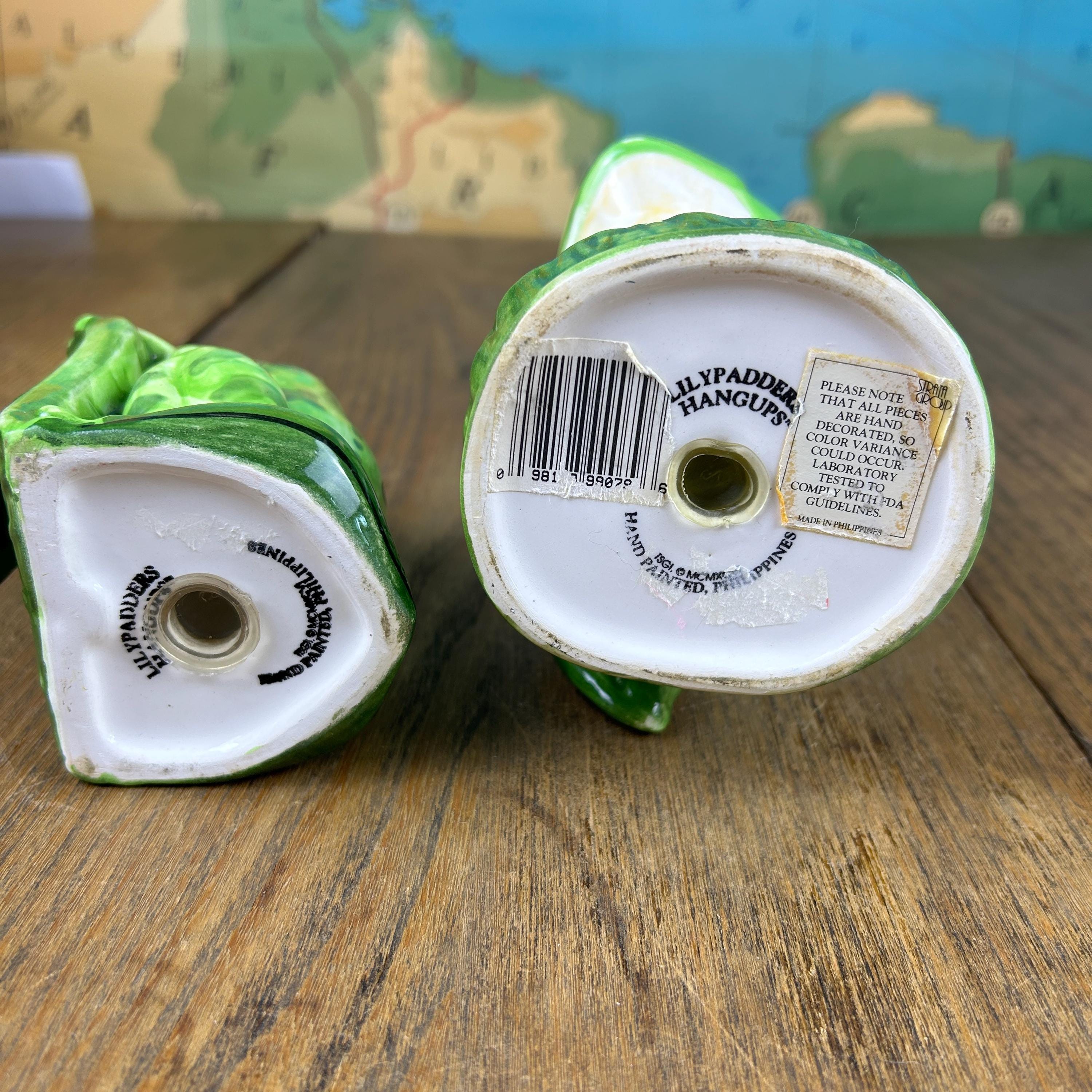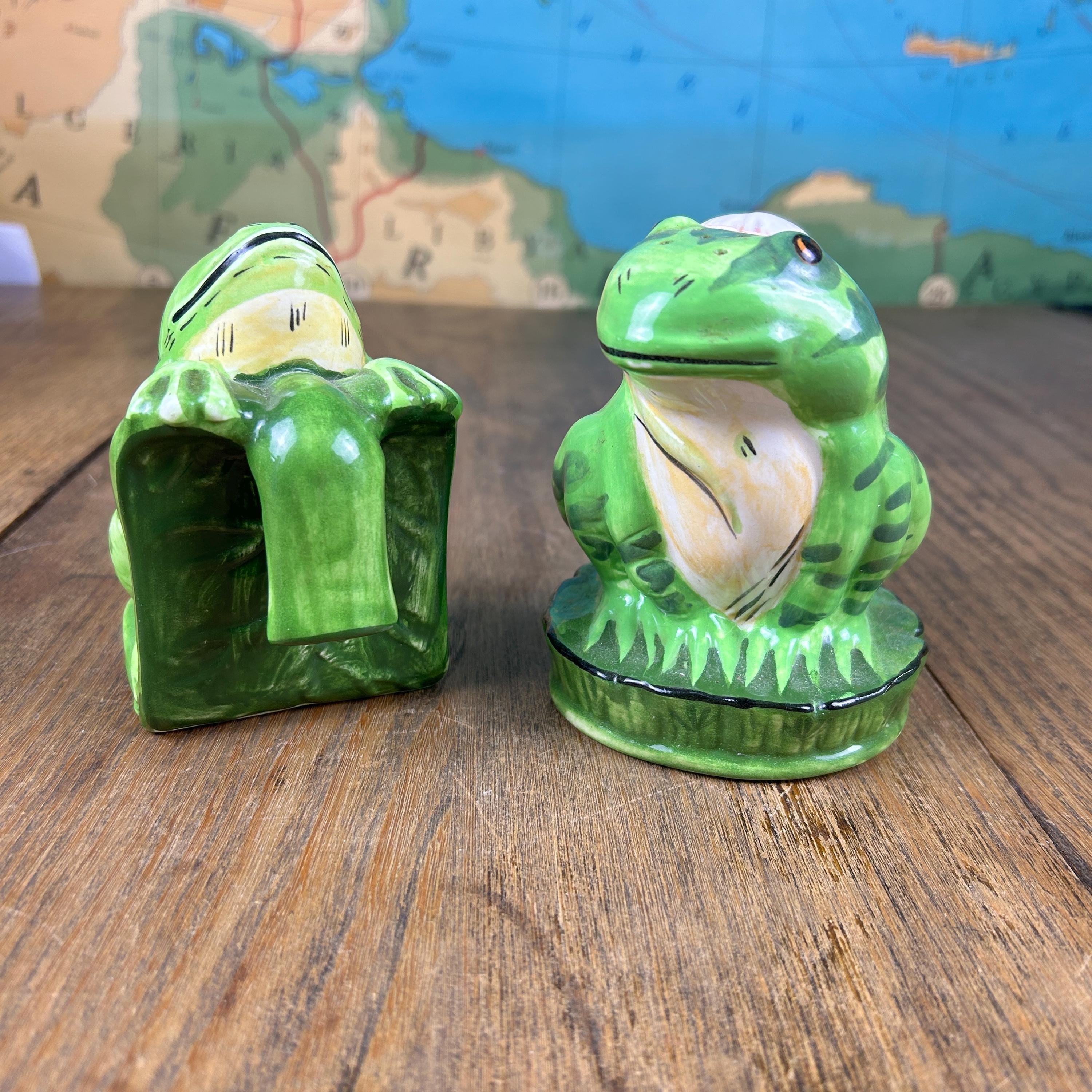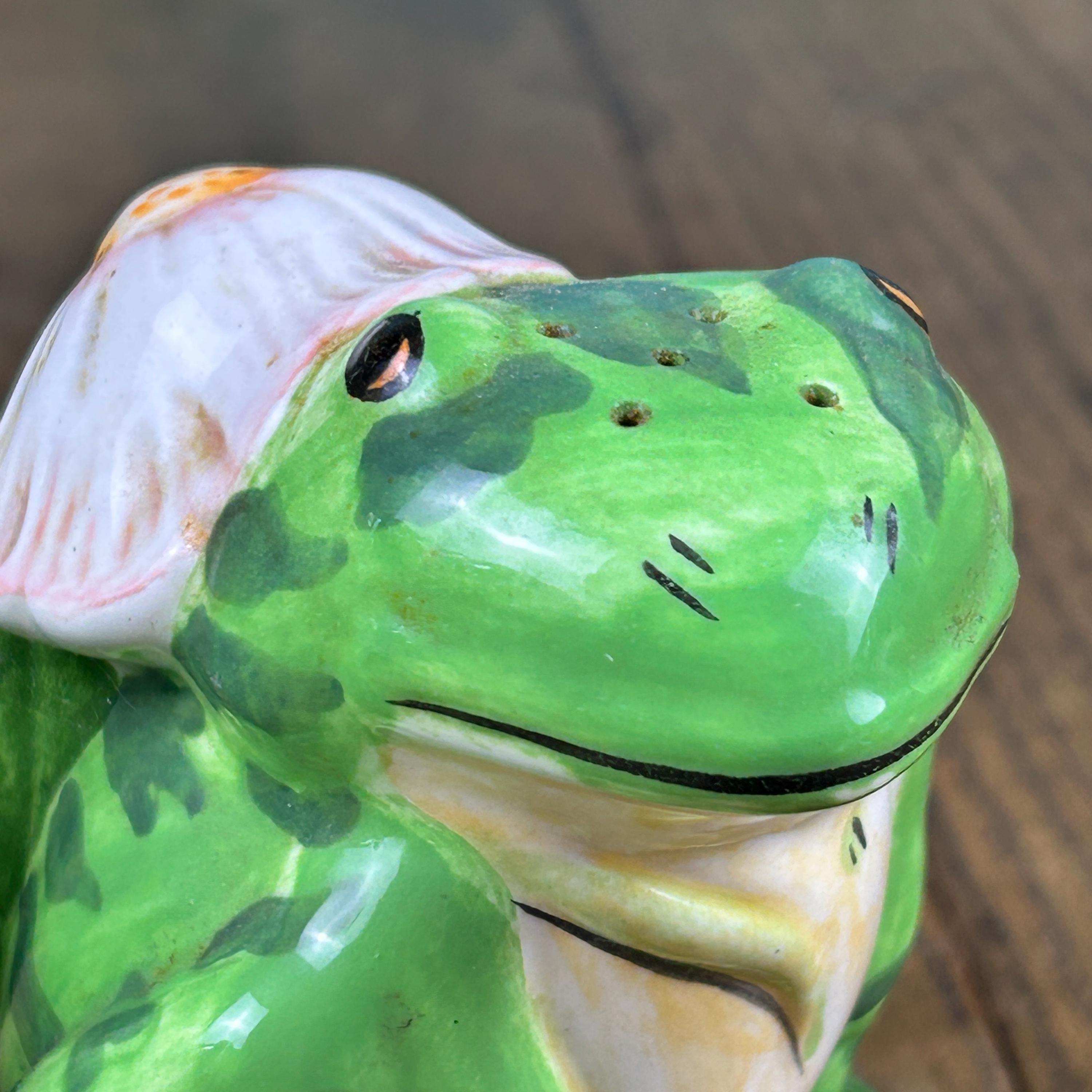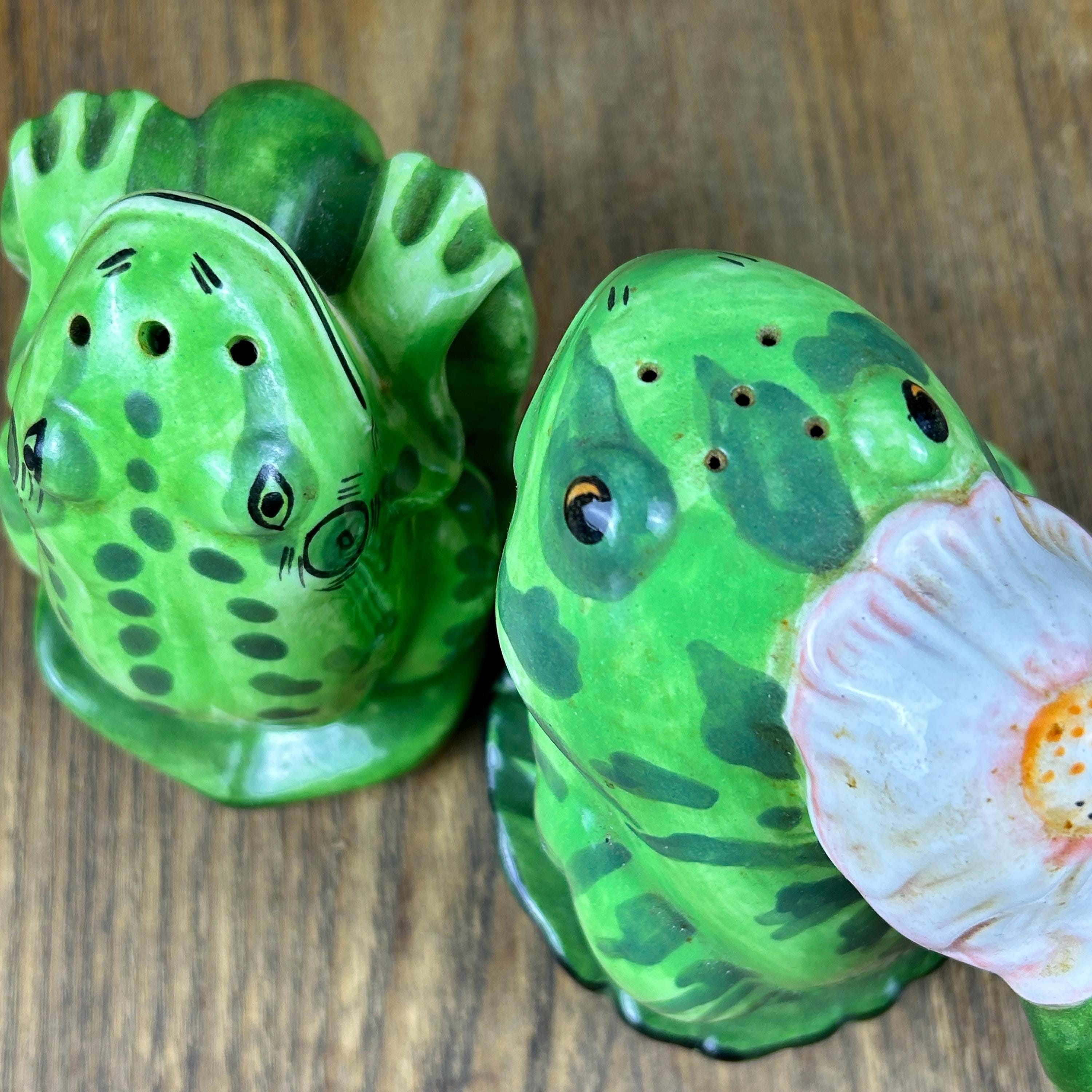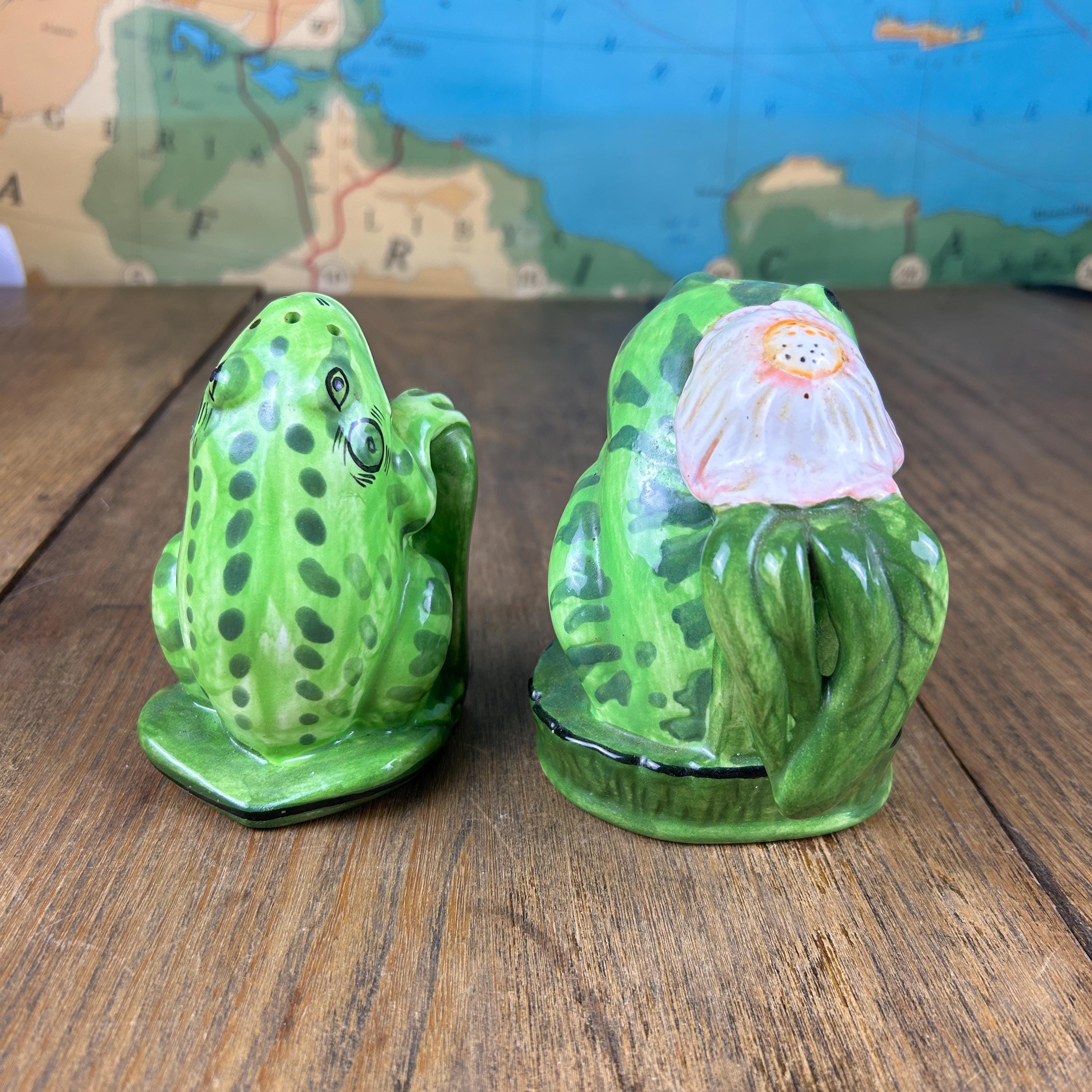 Add a touch of whimsy to your dining table with this adorable set of vintage frog salt and pepper shakers from Lilypadders Hangups. Hand-painted in 1996, these ceramic shakers feature a charming frog design with handles for easy seasoning. The set includes one pepper shaker and one salt shaker, both with stoppers to keep your spices fresh. I don't think either have had salt or pepper in them. Rubber stoppers still intact. Perfect for any occasion, these shakers are ideal for animal lovers and collectors alike. The green color and frog shape make them a great addition to any cottage-style kitchen.