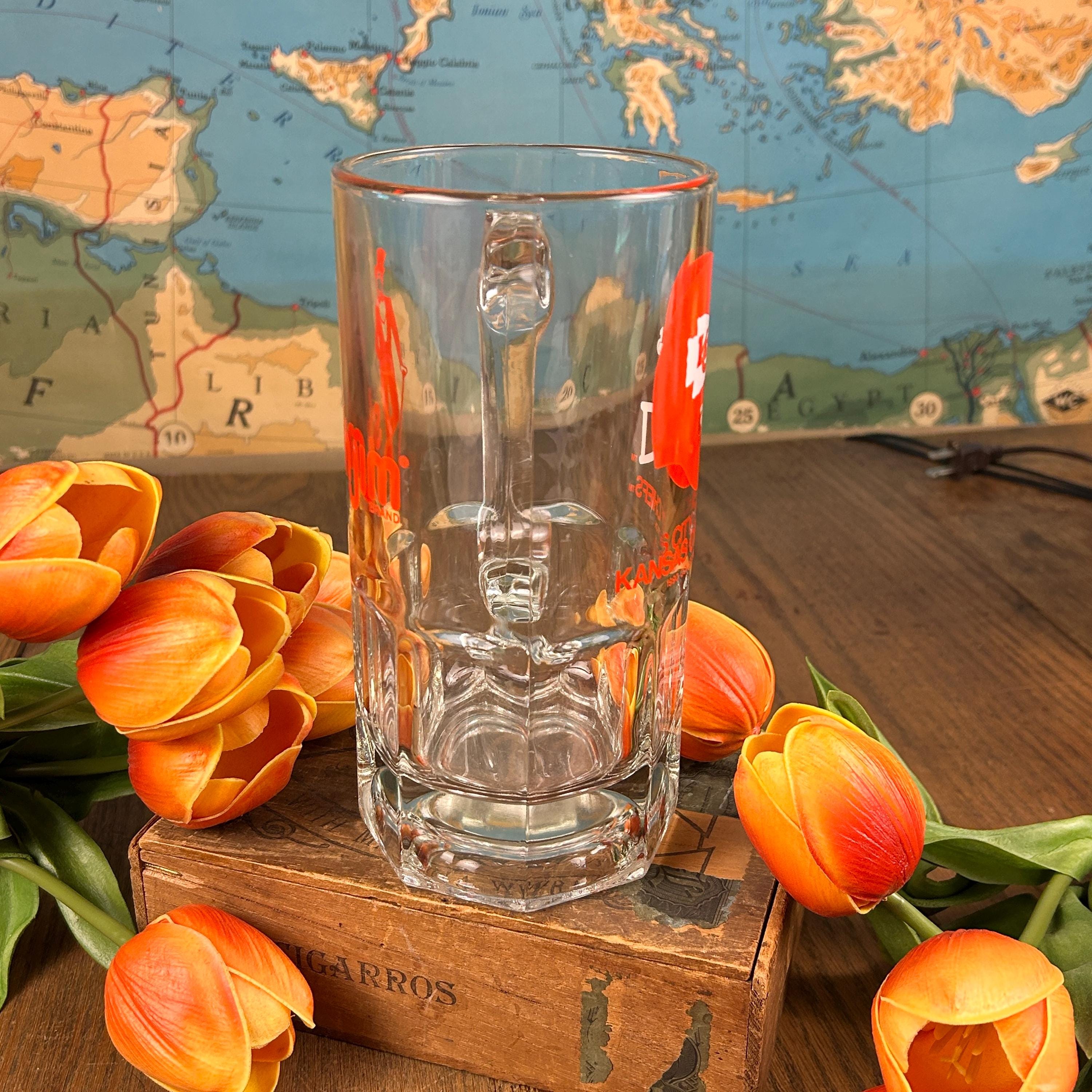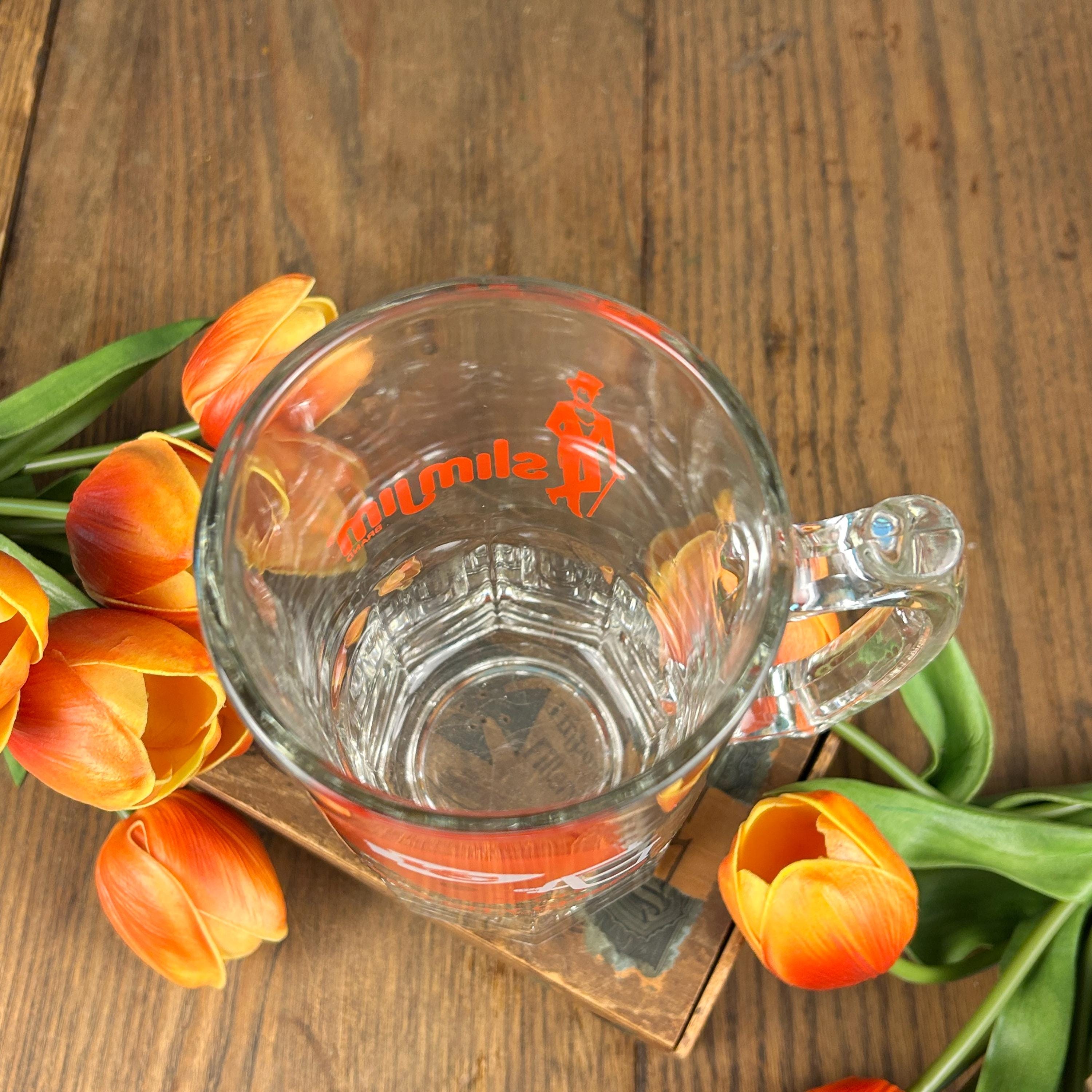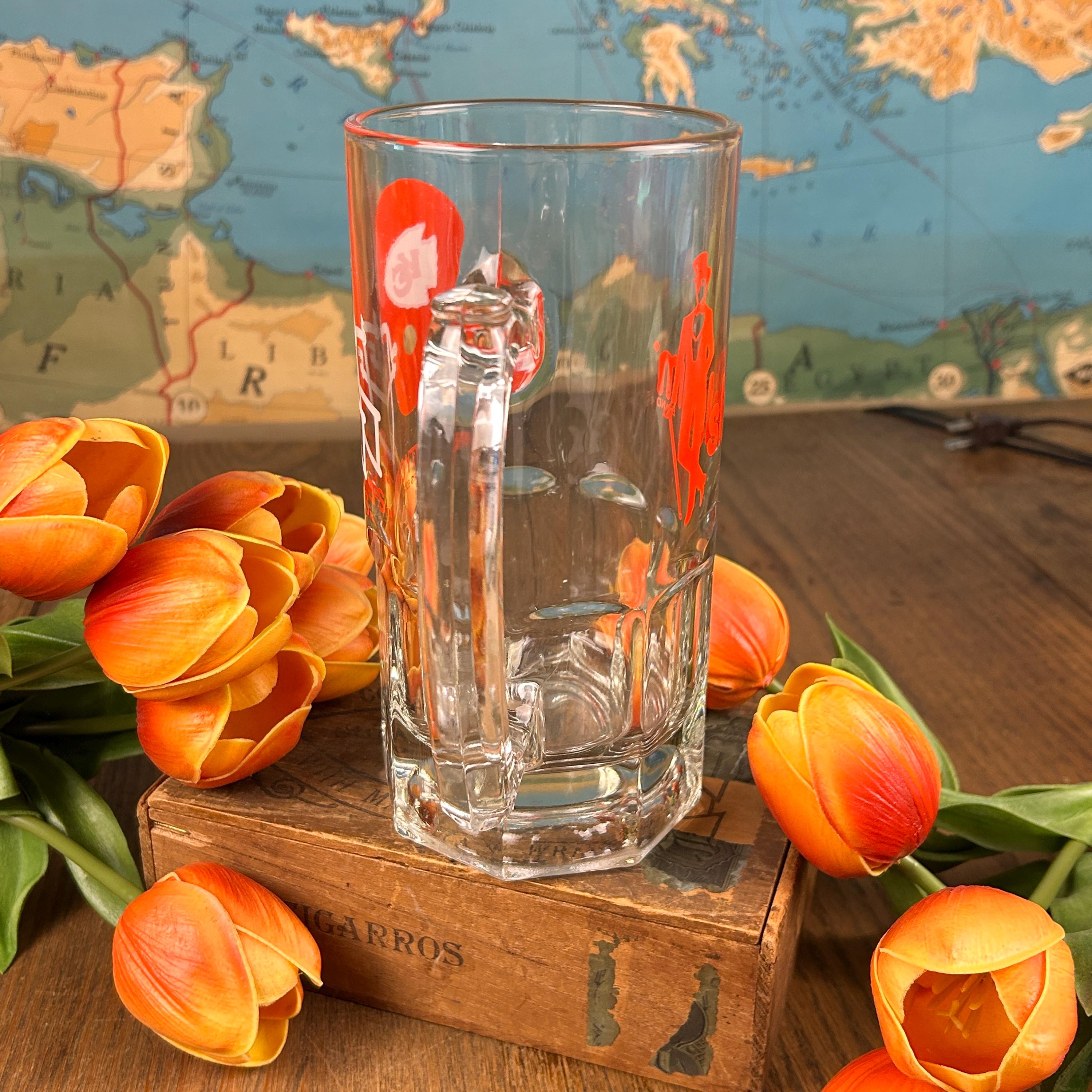 Measures 8" tall x 3 3/4" at the mouth. Measures 6" from edge of glass to edge of handle.