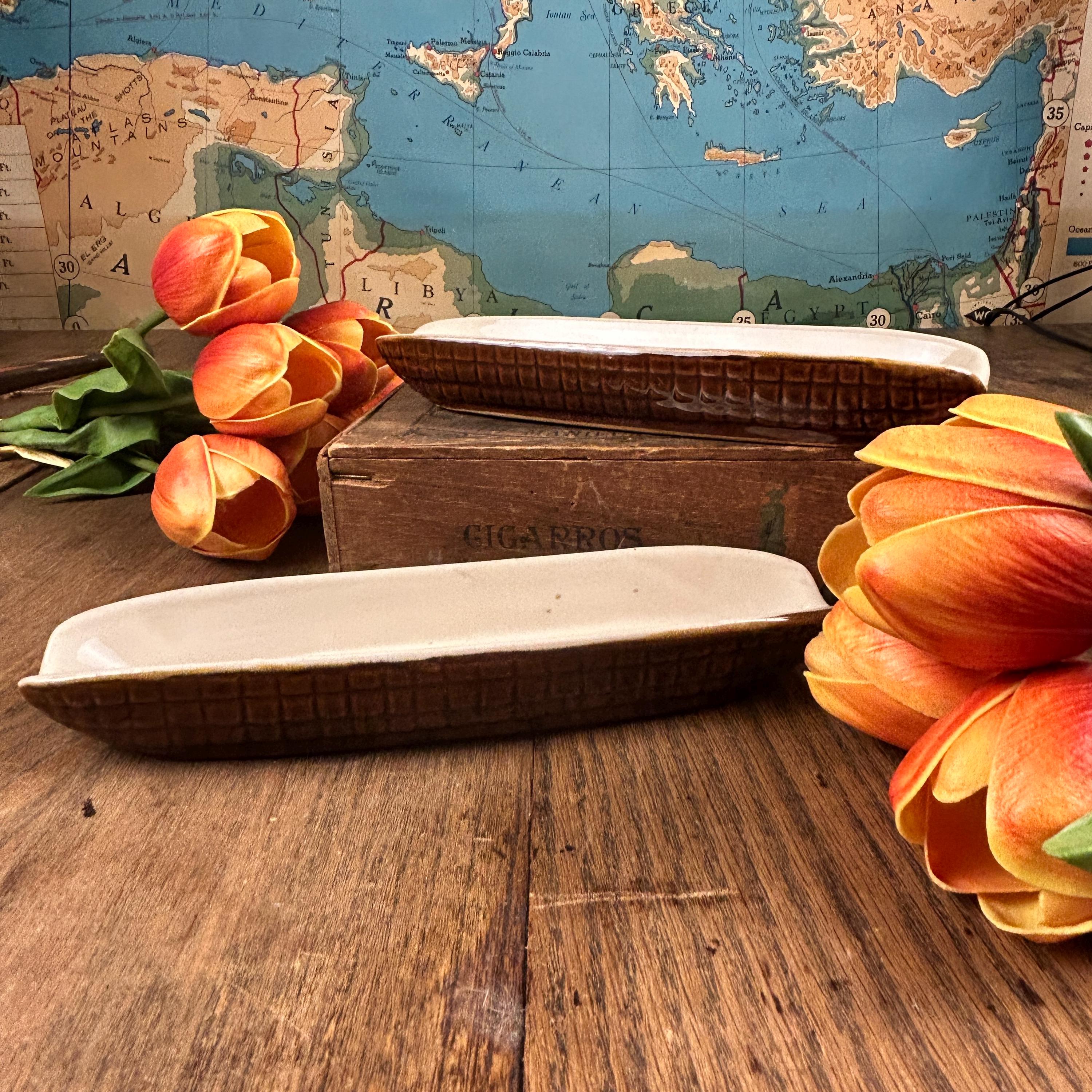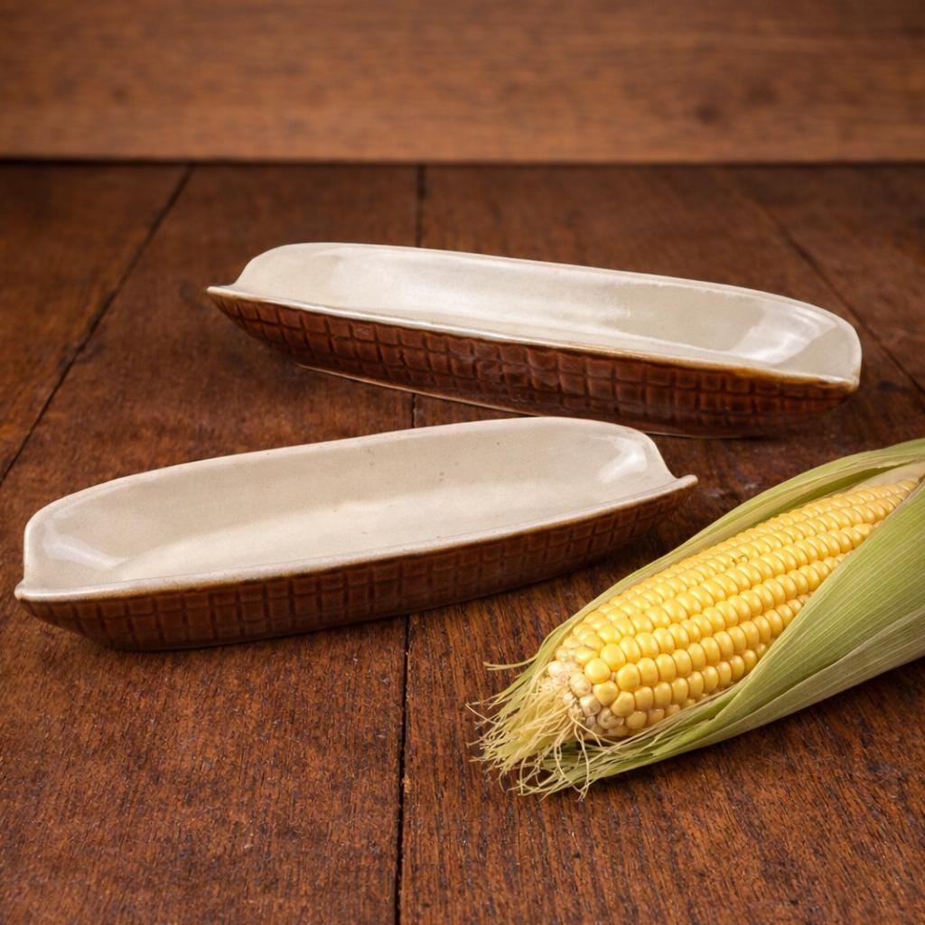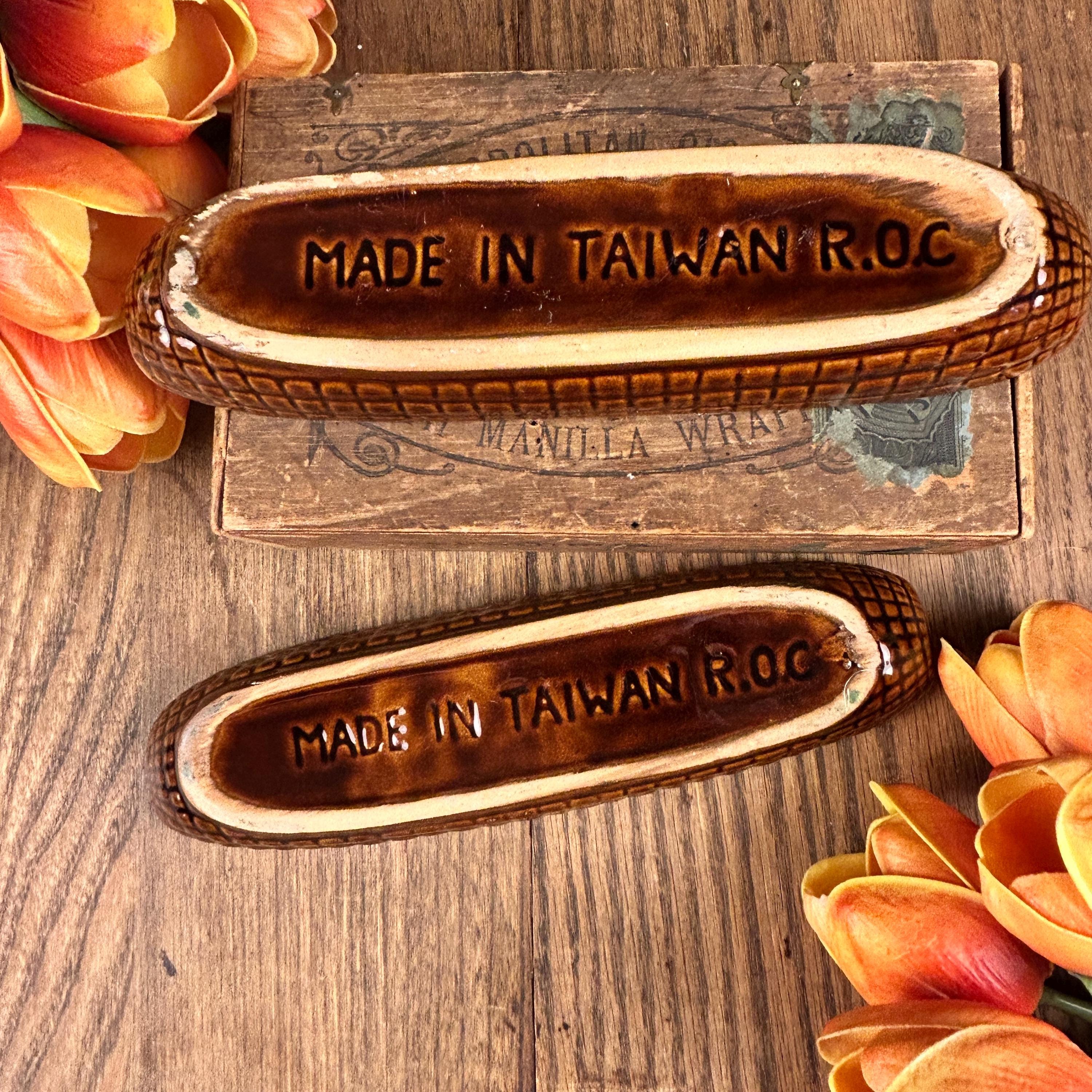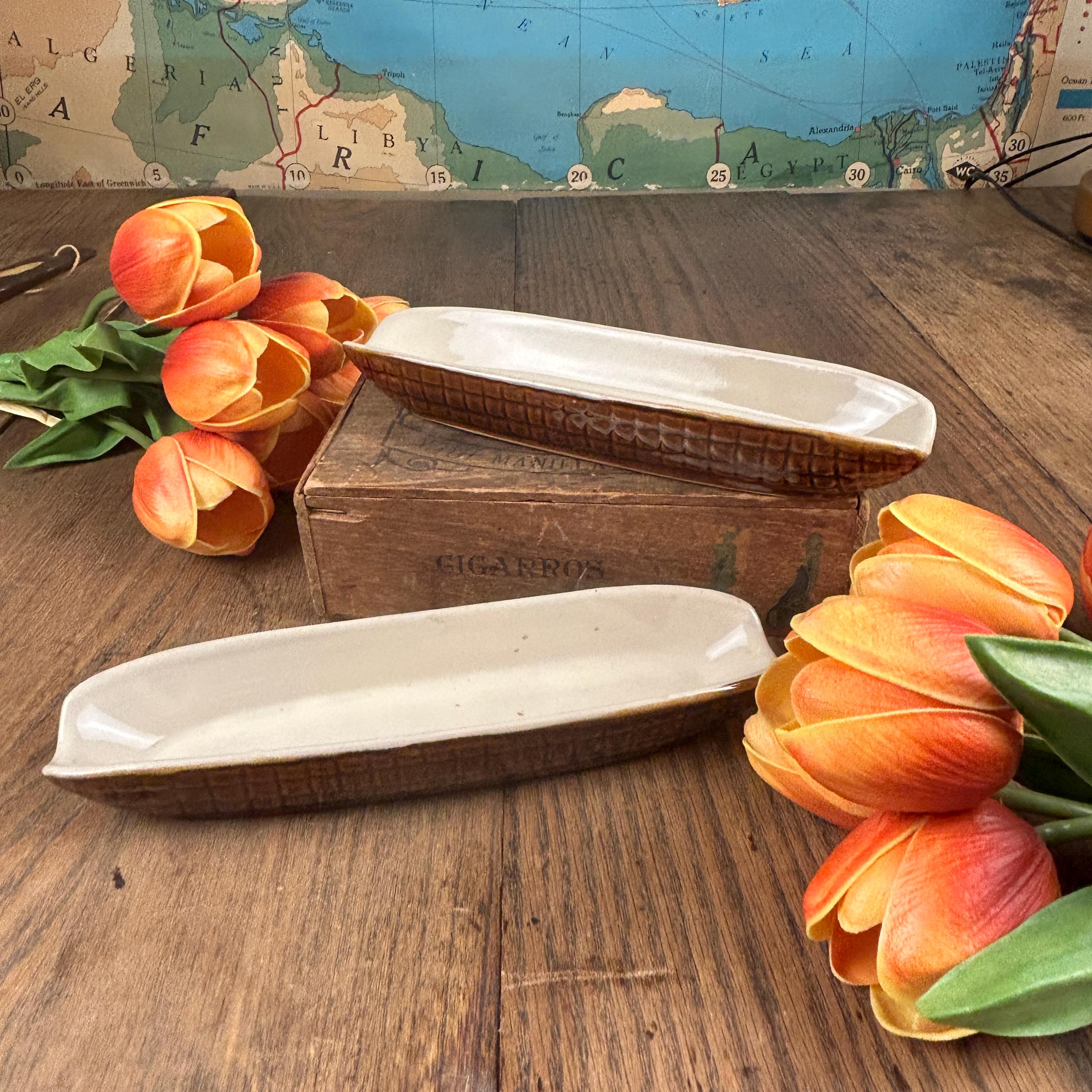 Set of 2 cute vintage corn on the cob shaped dishes to hold your corn. These are brown outside and a cream color on the inside. This is a perfect dish for not letting your corn roll around on your plate. These are in excellent vintage condition without any chips or cracks. These are stamped "Made in Taiwan R.O.C. (Republic of China)" on the bottom and measure approximately 8 3/4" L X 2 1/2" W.