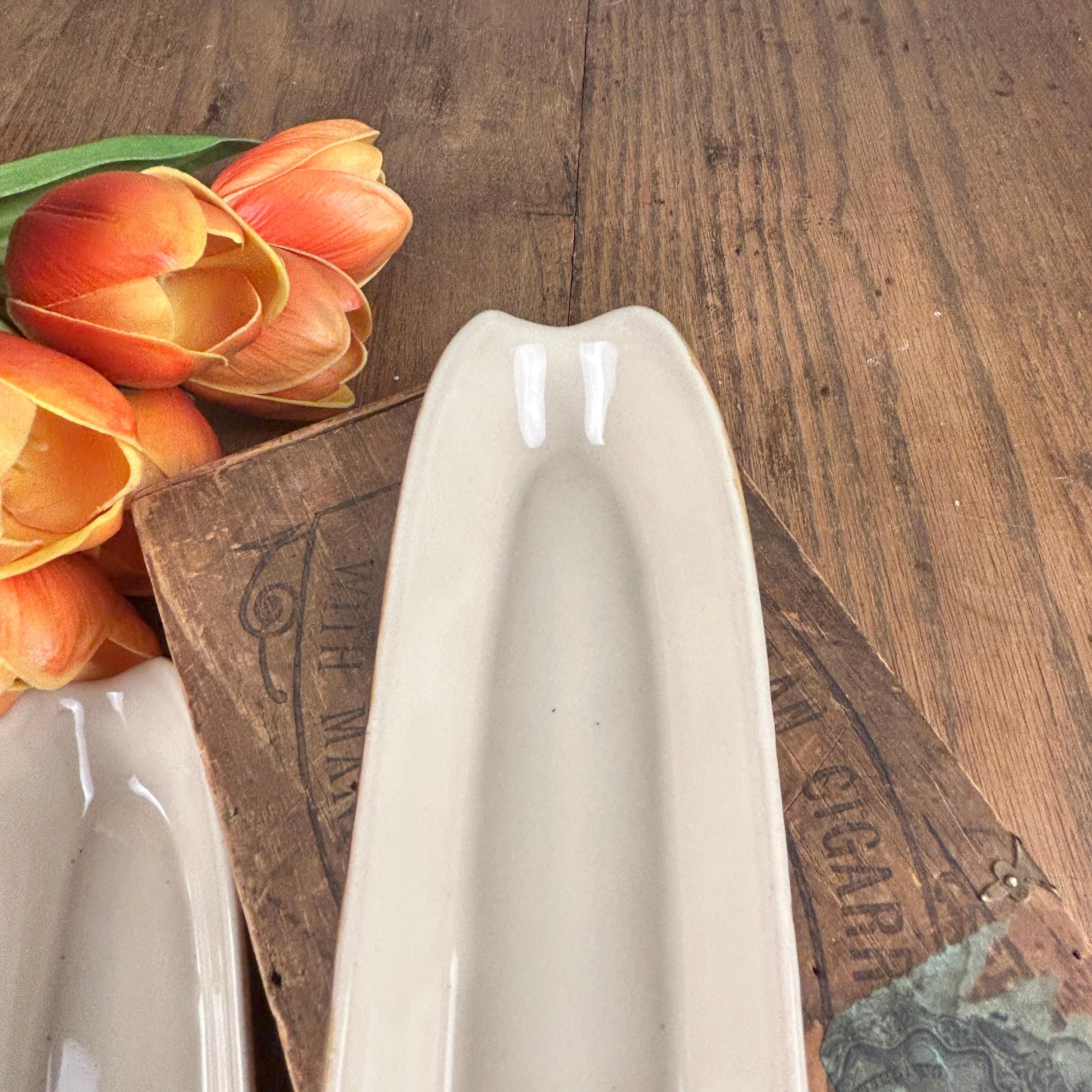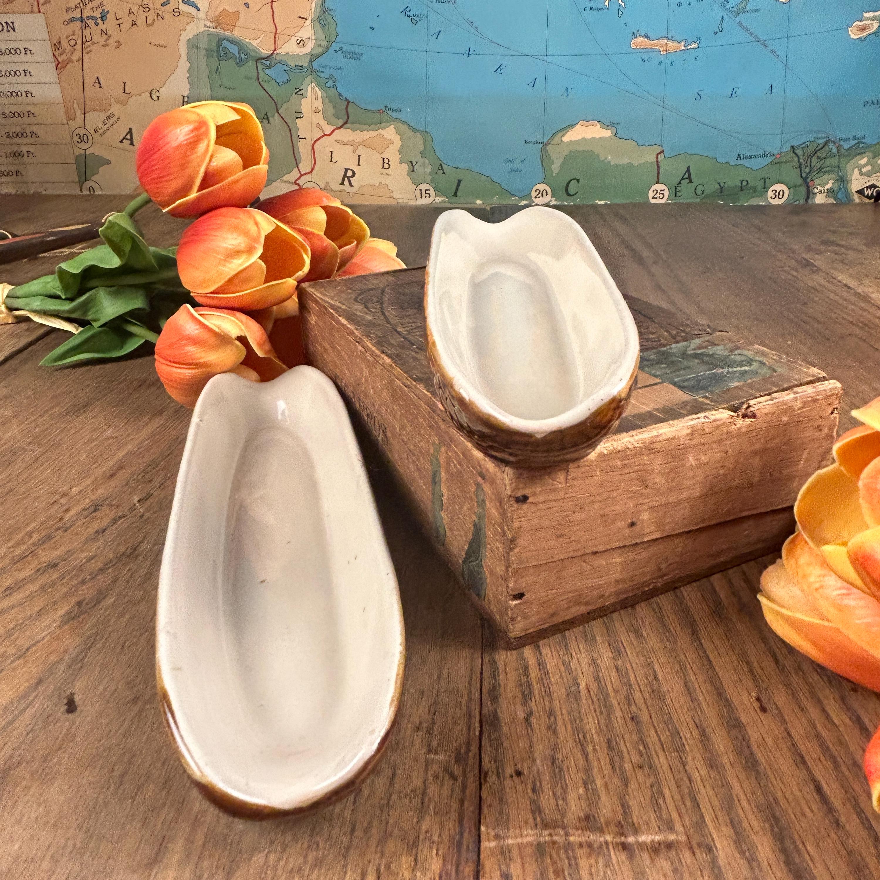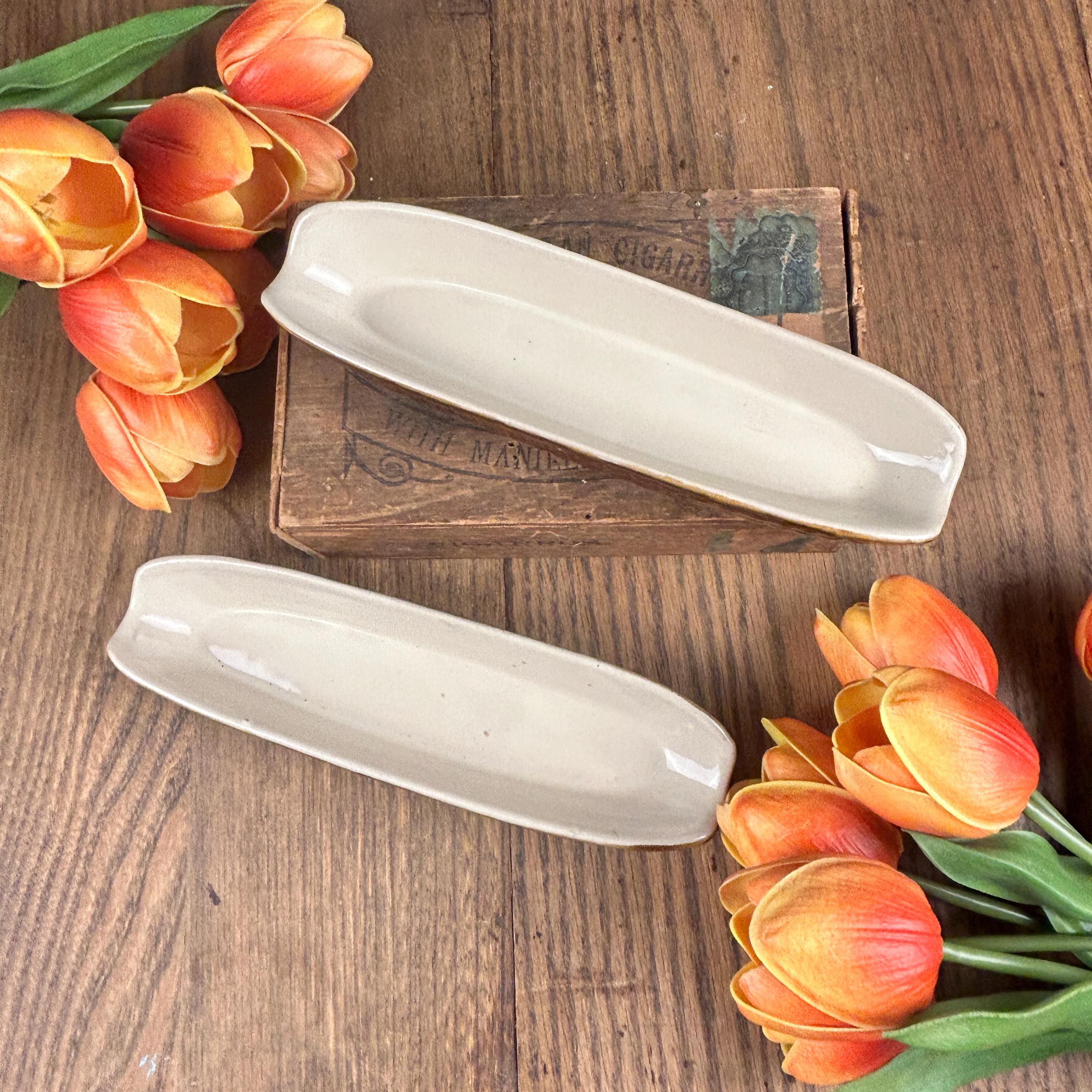 Set of 2 cute vintage corn on the cob shaped dishes to hold your corn. These are brown outside and a cream color on the inside. This is a perfect dish for not letting your corn roll around on your plate. These are in excellent vintage condition without any chips or cracks. These are stamped "Made in Taiwan R.O.C. (Republic of China)" on the bottom and measure approximately 8 3/4" L X 2 1/2" W.