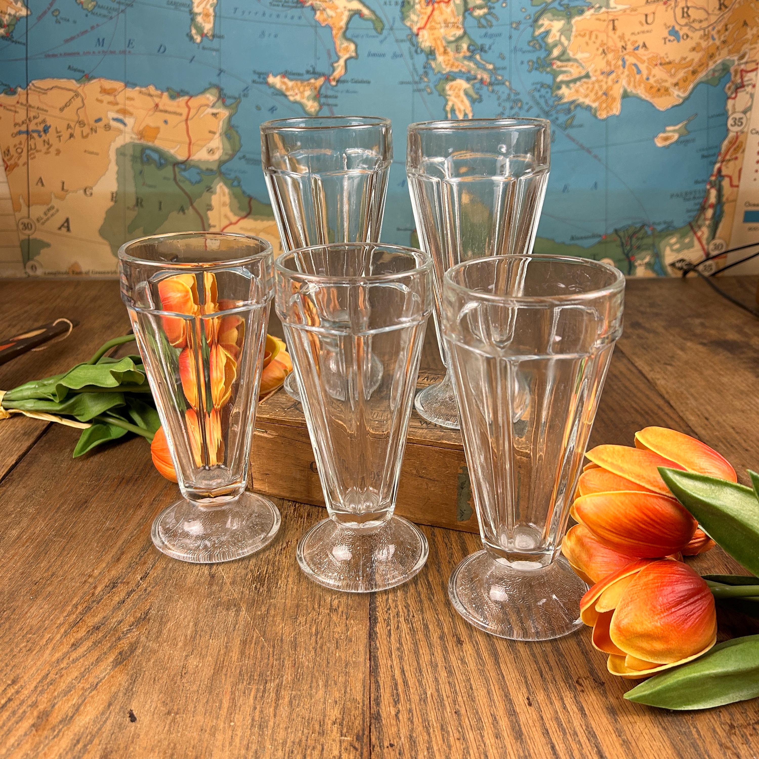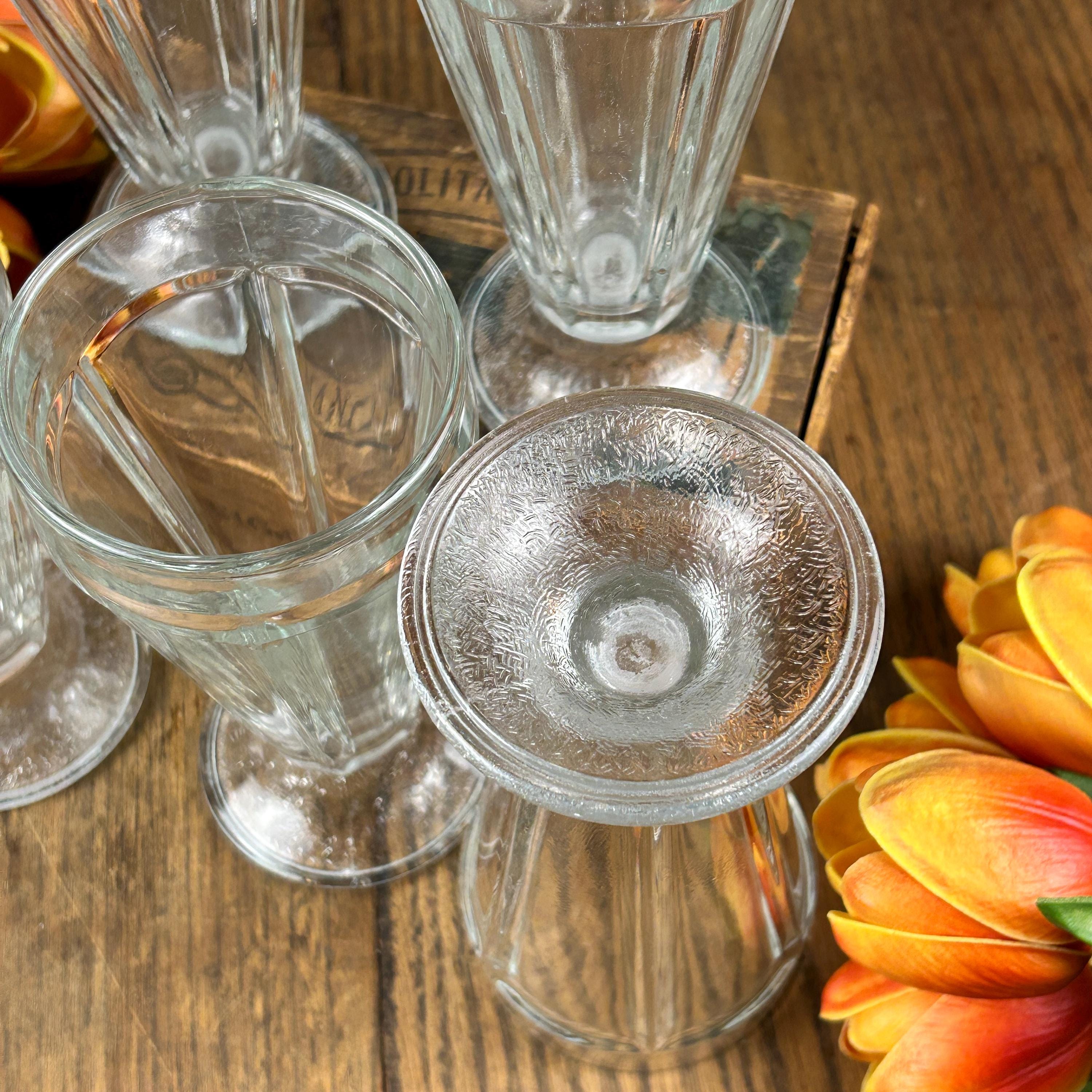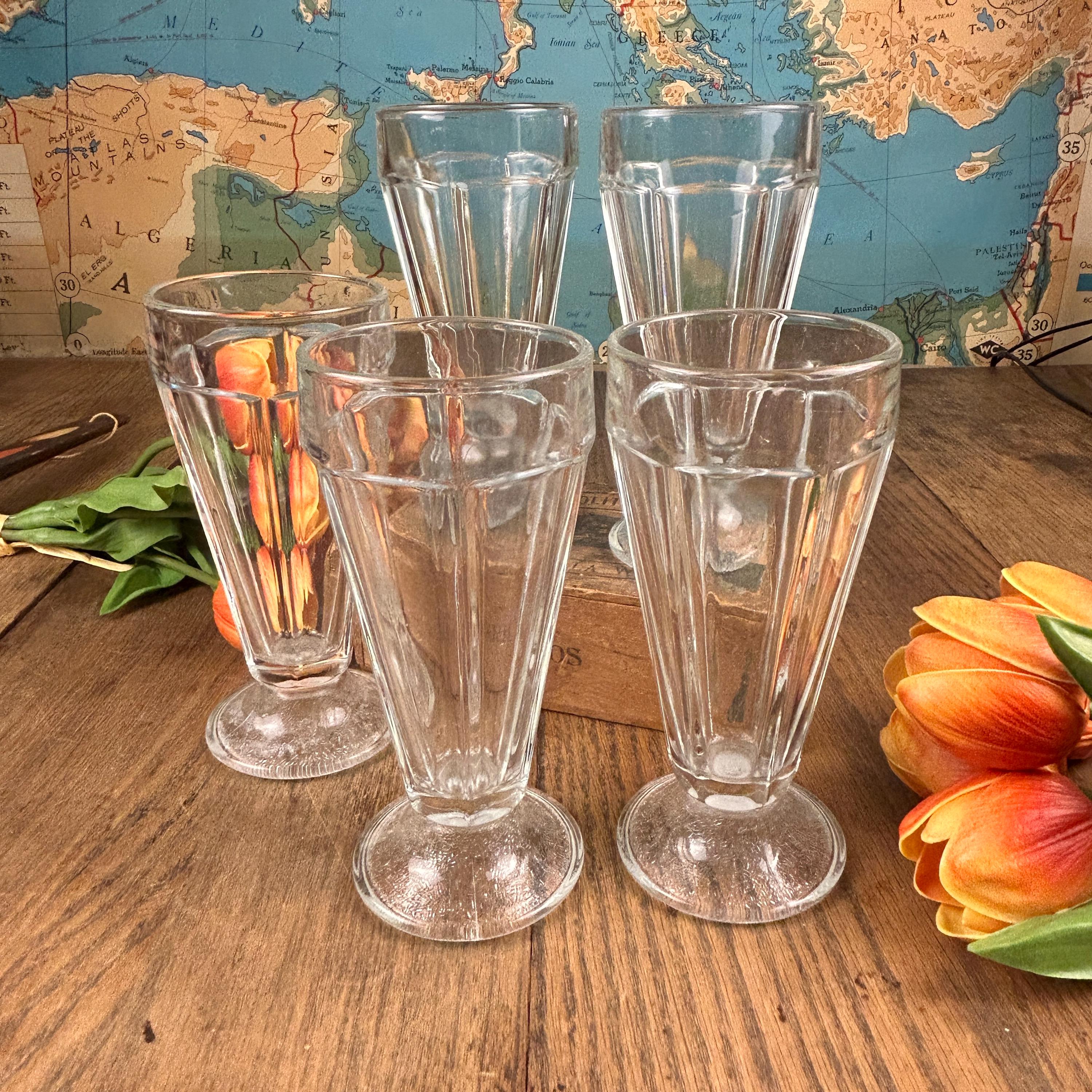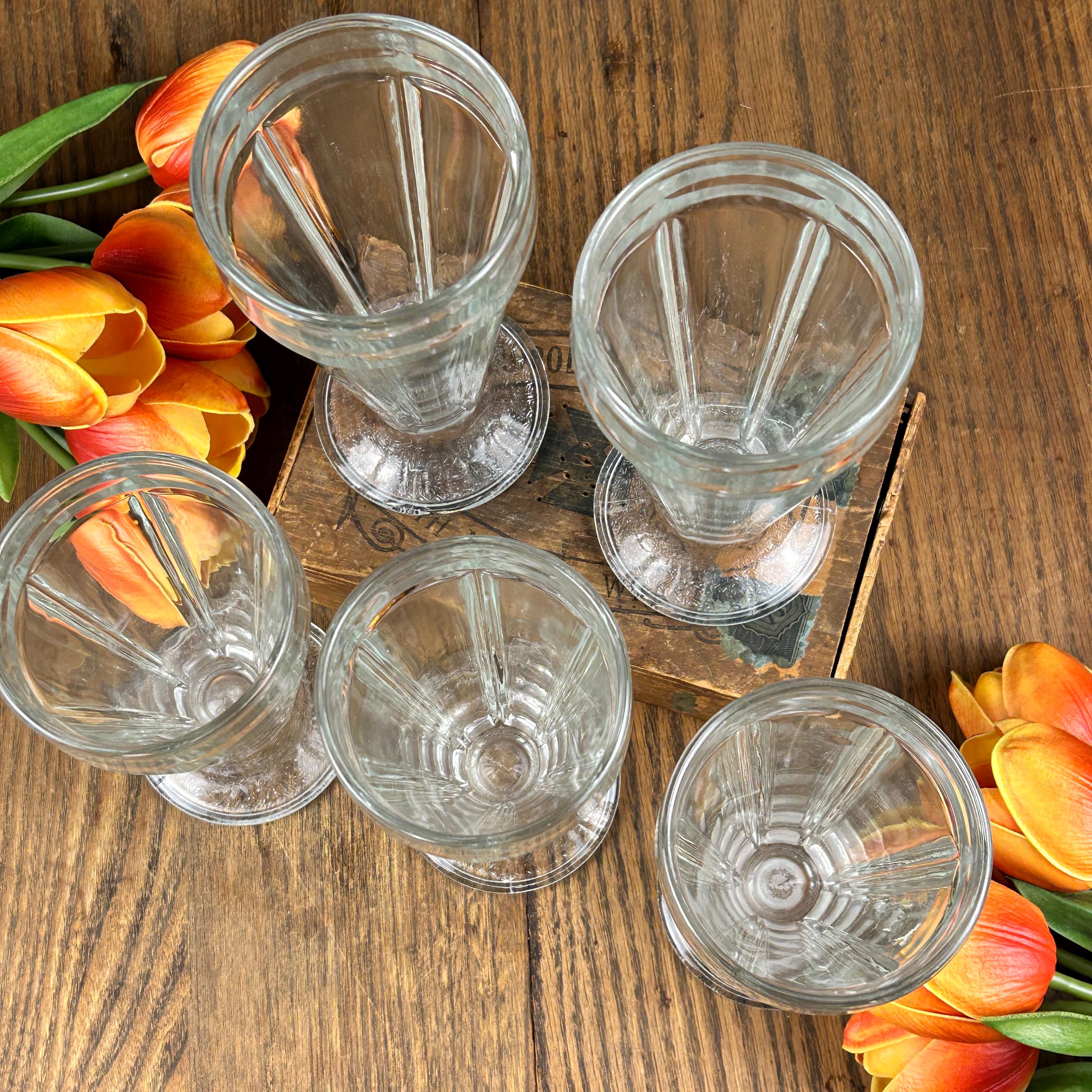 This is a rare vintage set of five soda shop milkshake glasses—the perfect addition to any midcentury modern kitchen decor.